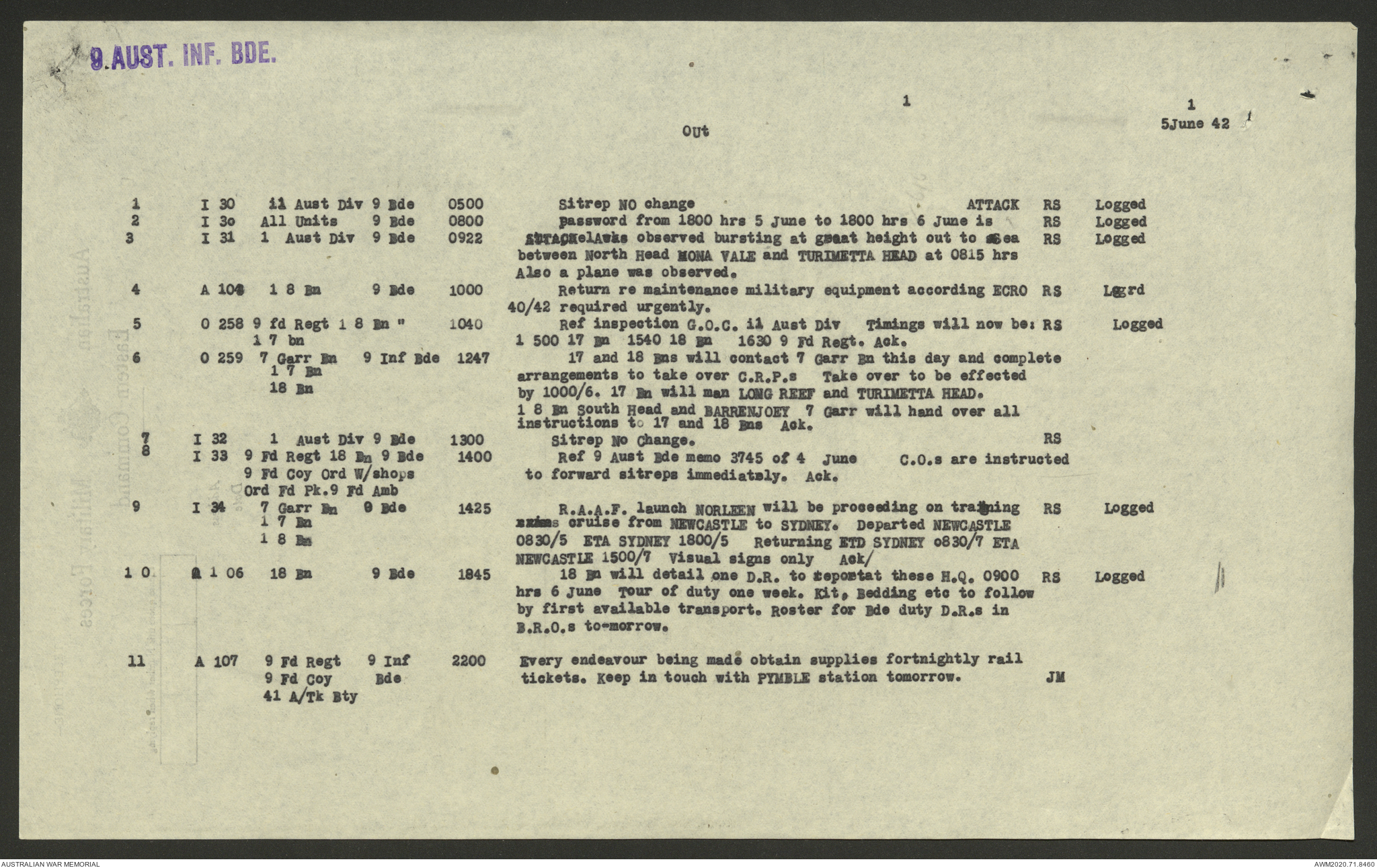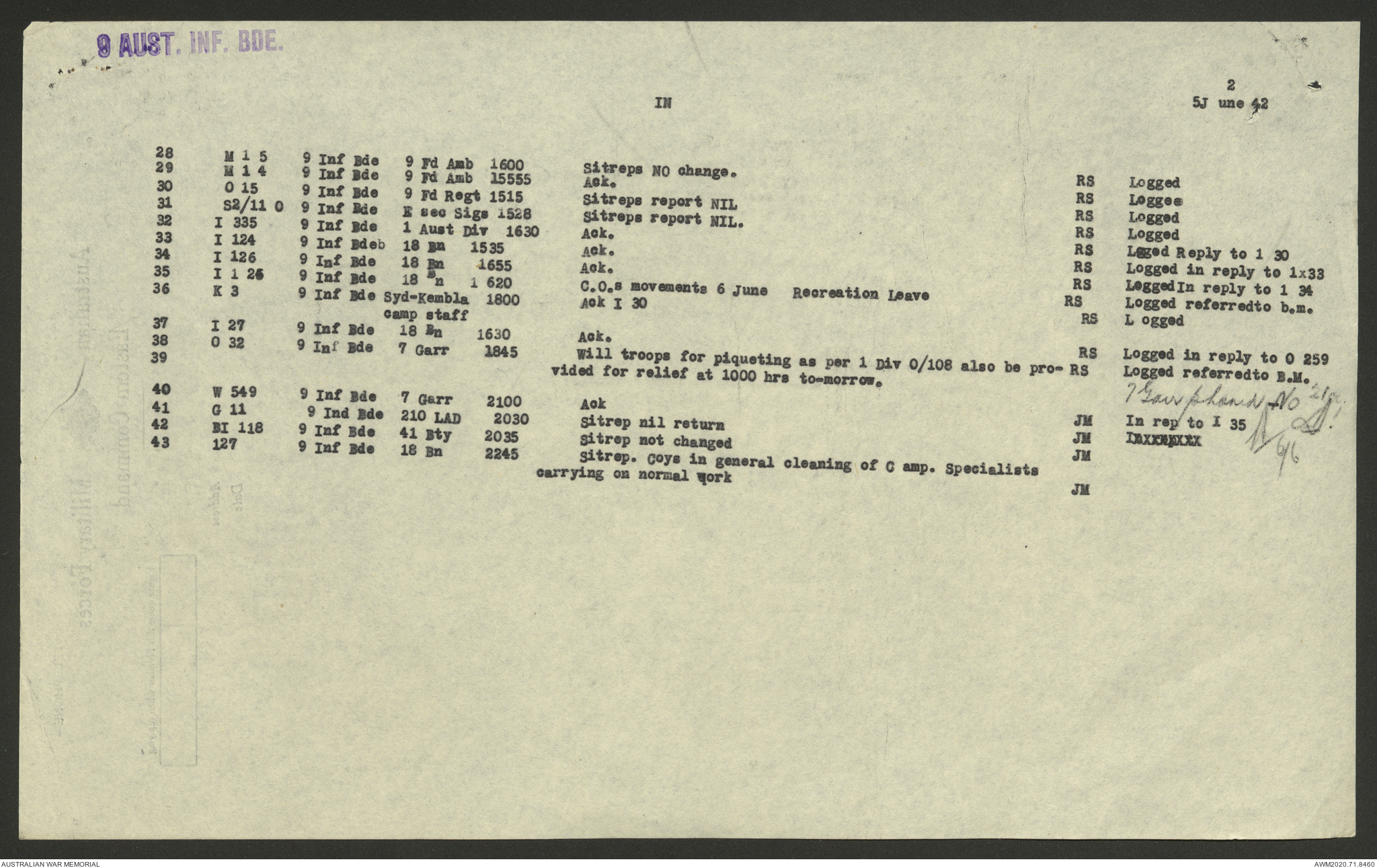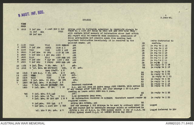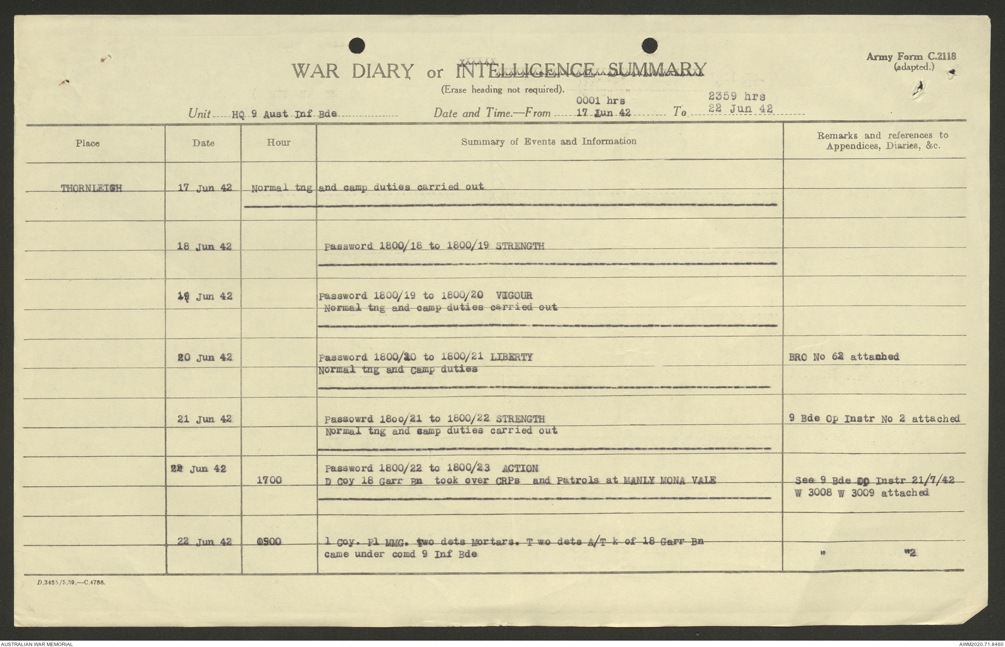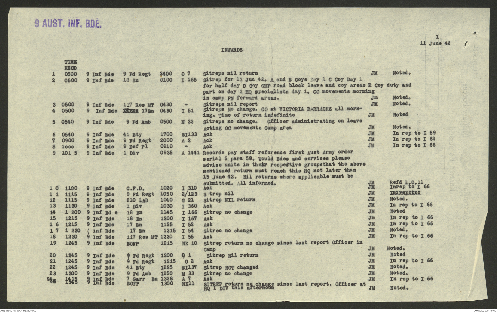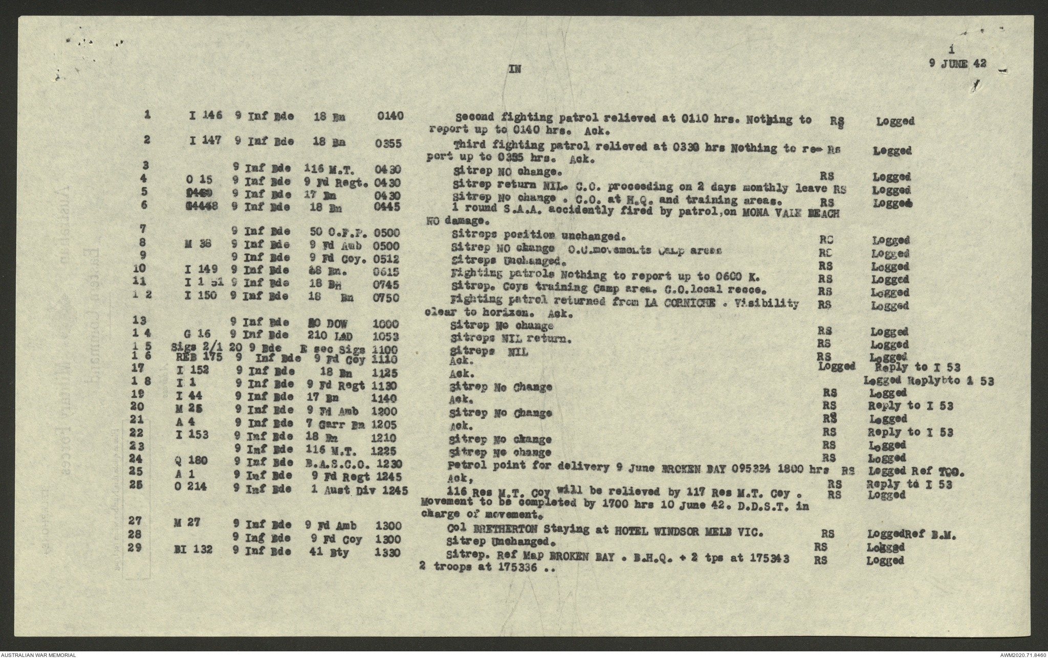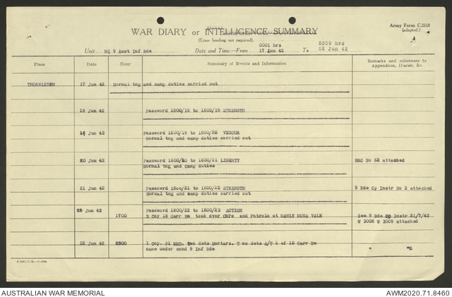 AWM52 8/2/9/6 - [Unit War Diaries, 1939-45 War] HQ 9 Australian Infantry Brigade, June 1942