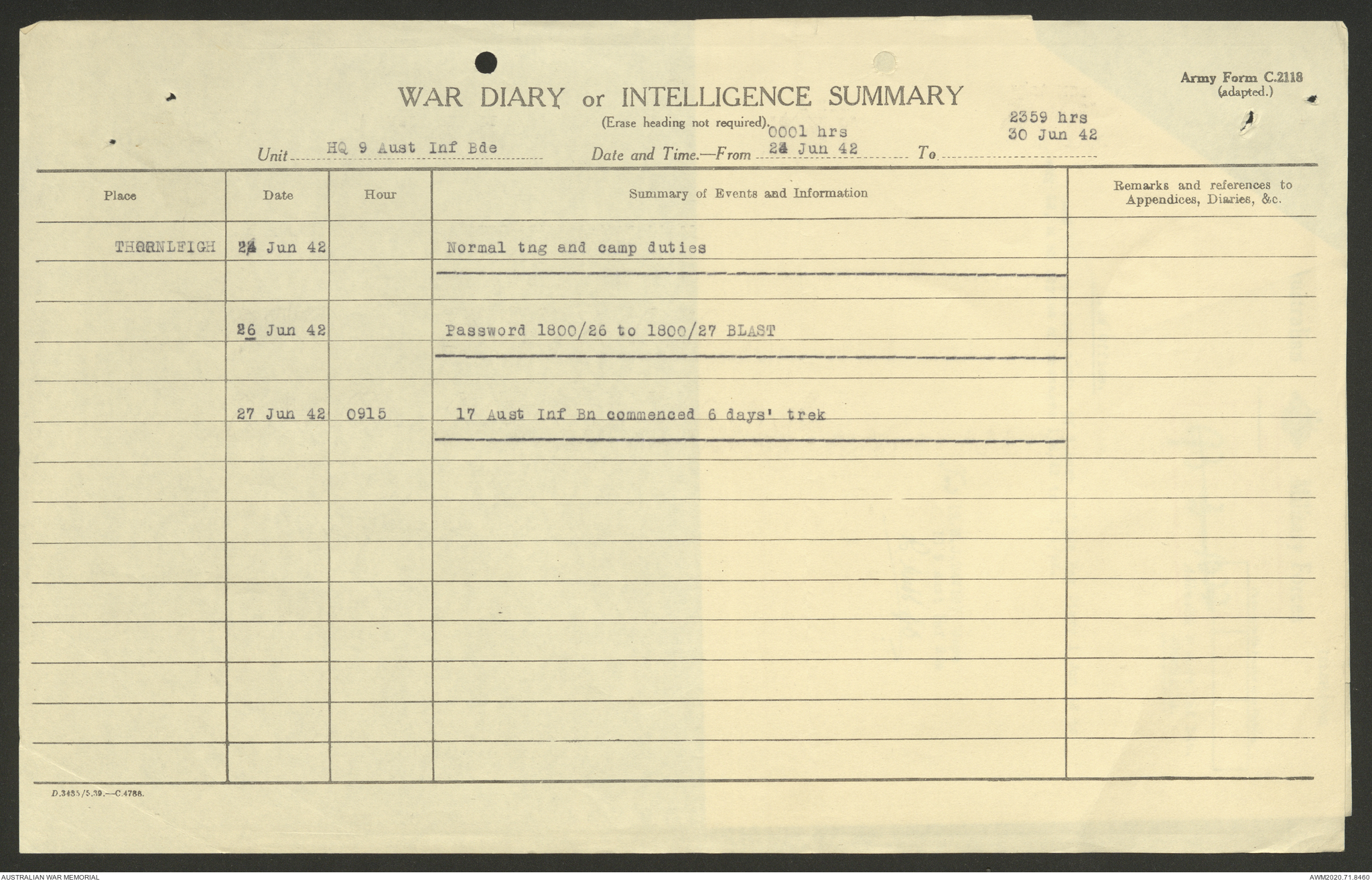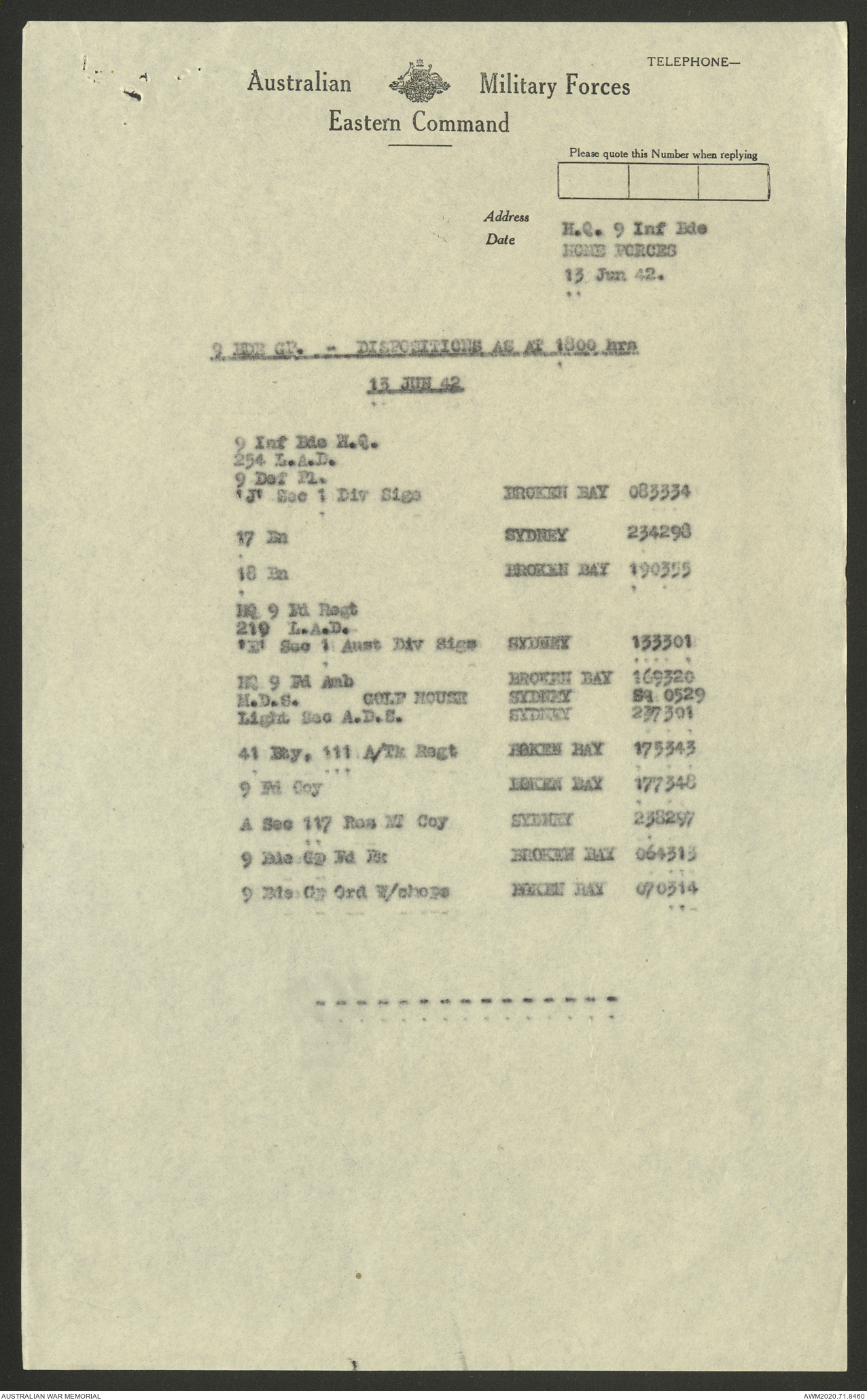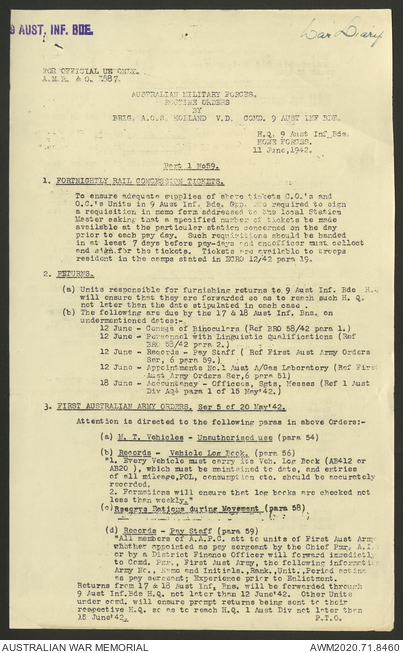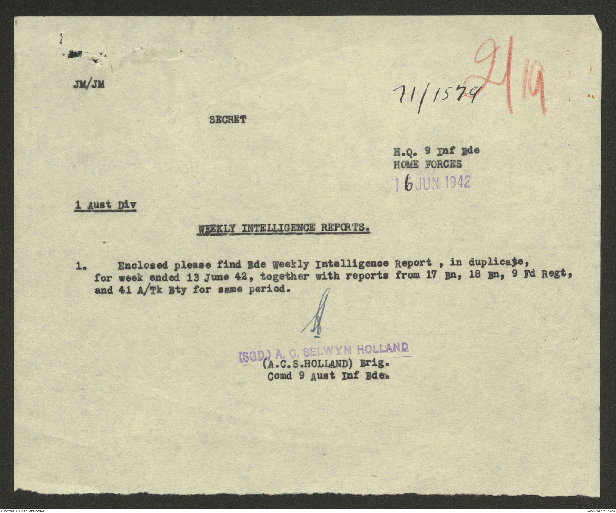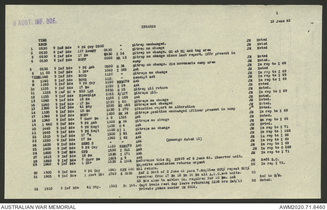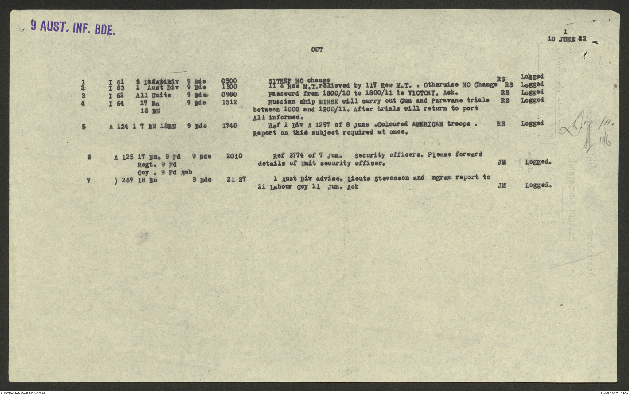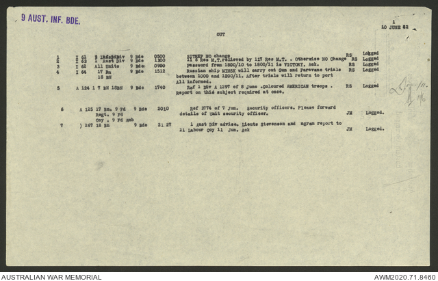AWM52 8/2/9/6 - [Unit War Diaries, 1939-45 War] HQ 9 Australian Infantry Brigade, June 1942
