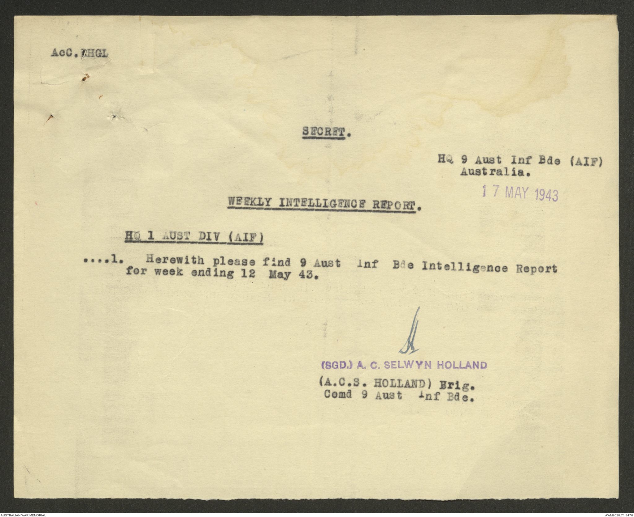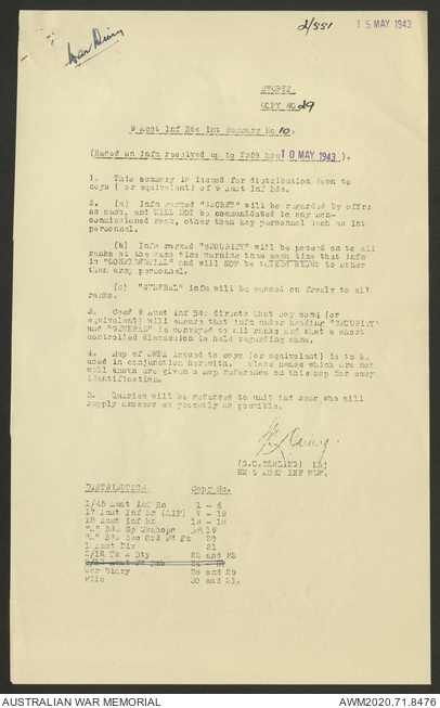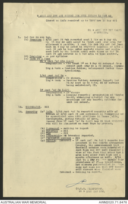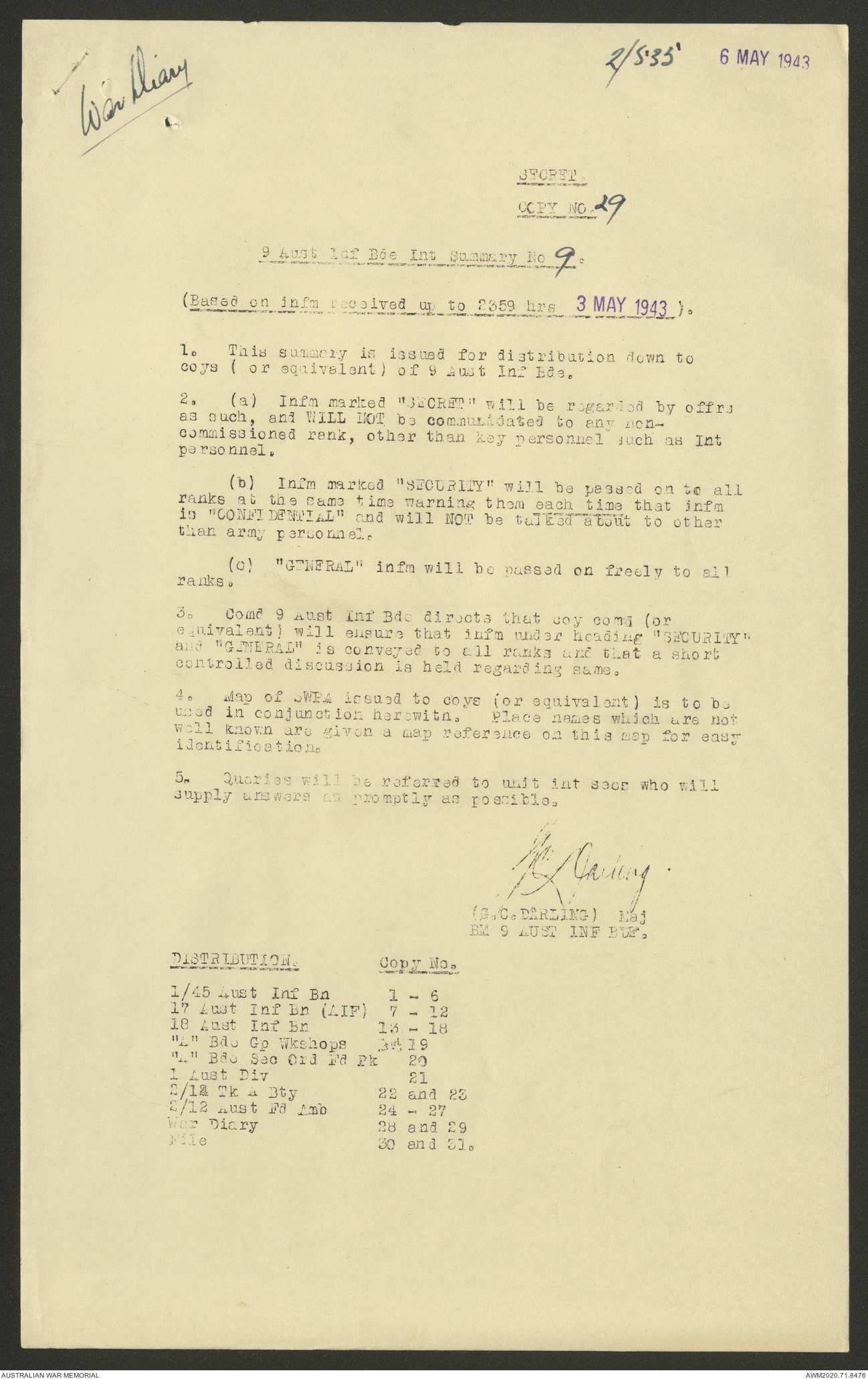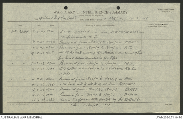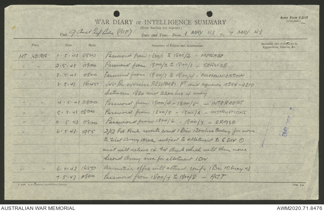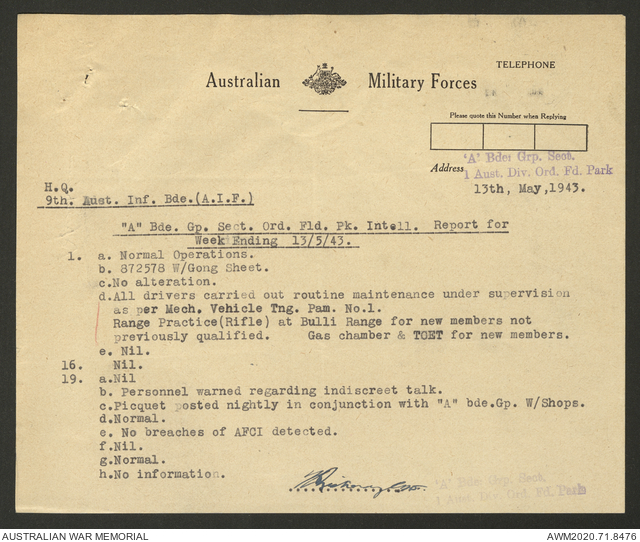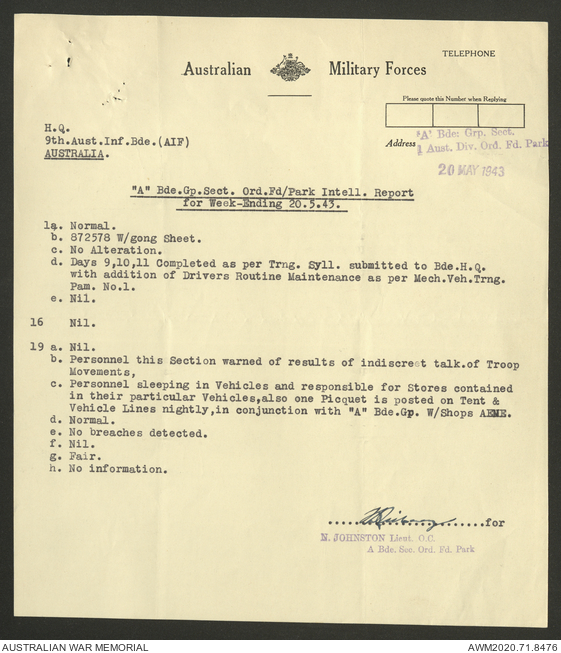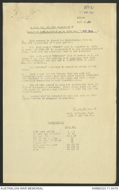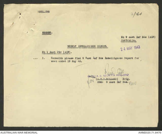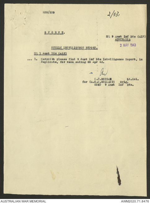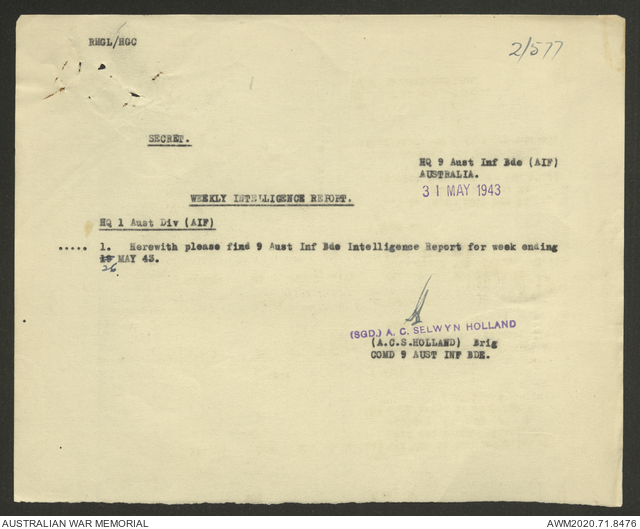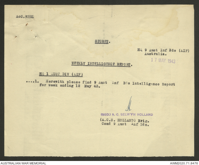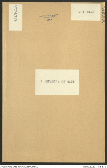 AWM52 8/2/9/22 - [Unit War Diaries, 1939-45 War] HQ 9 Australian Infantry Brigade AIF, May 1943