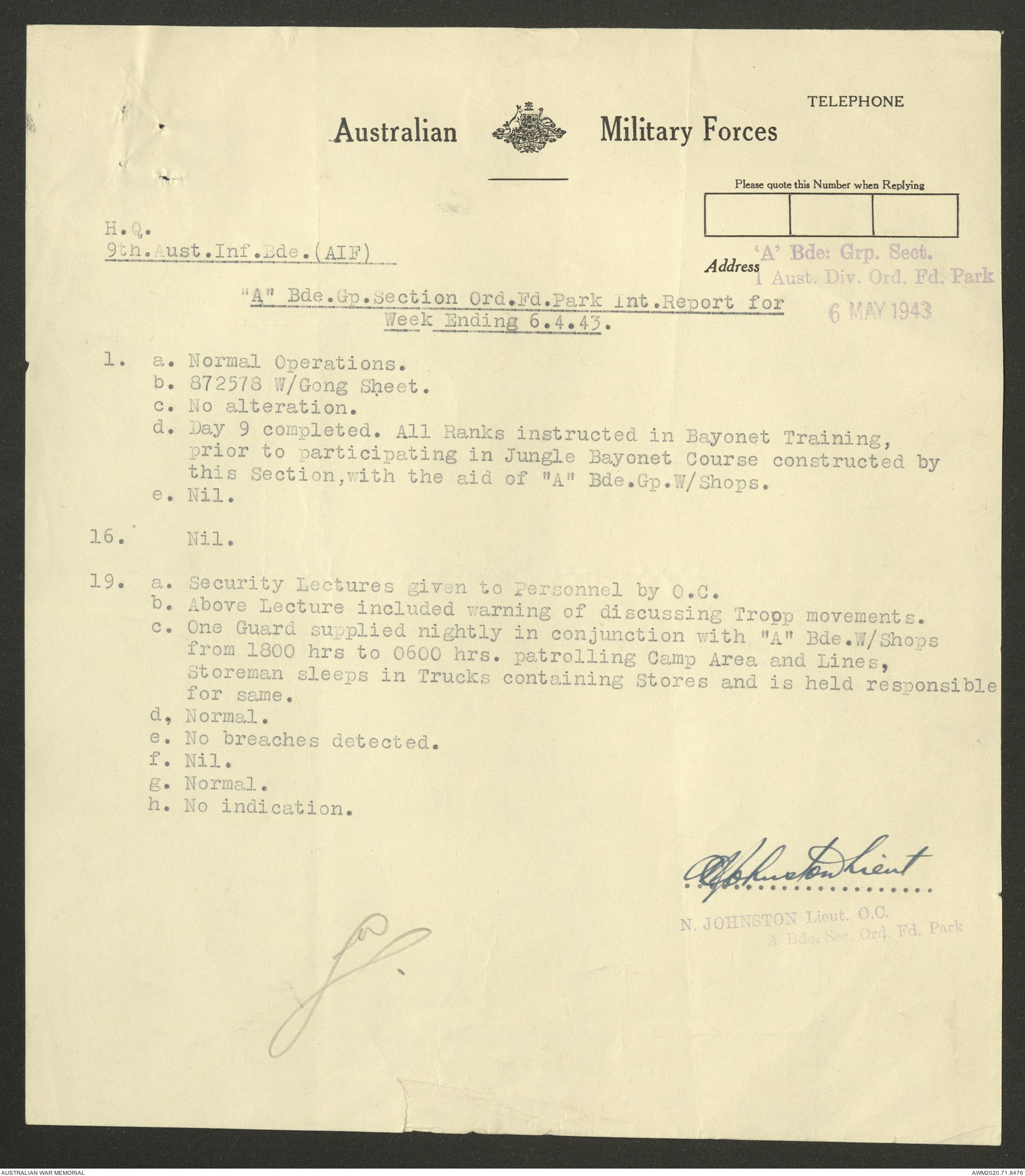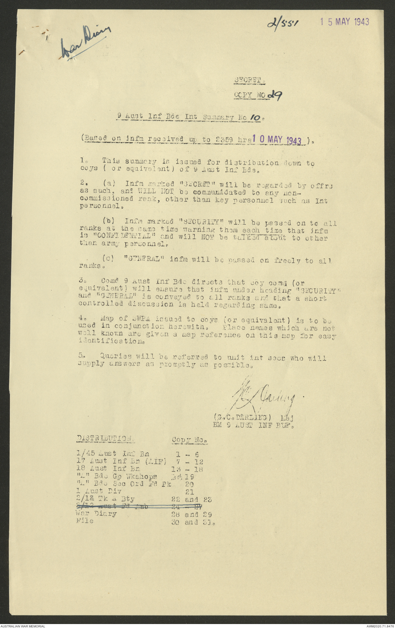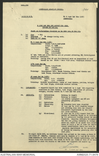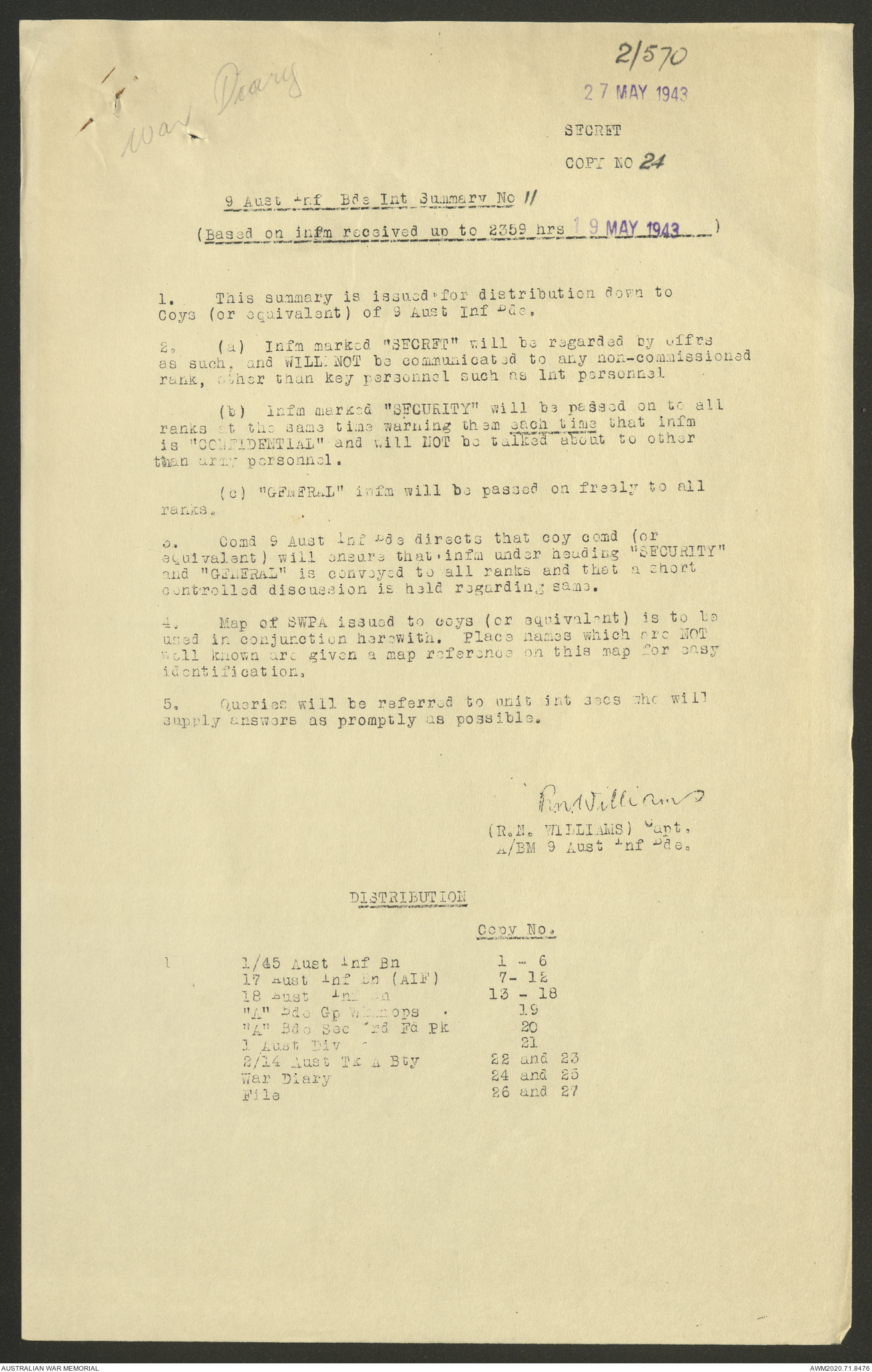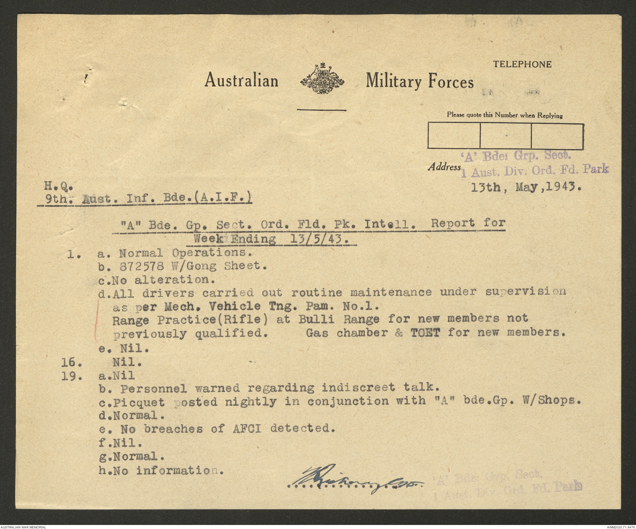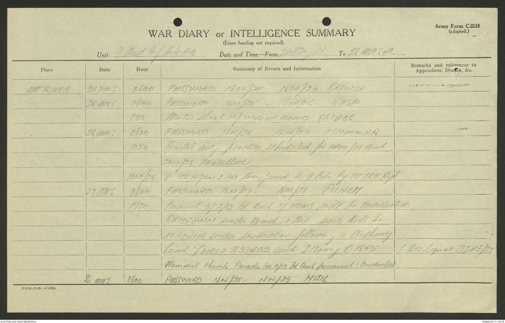 AWM52 8/2/9/22 - [Unit War Diaries, 1939-45 War] HQ 9 Australian Infantry Brigade AIF, May 1943