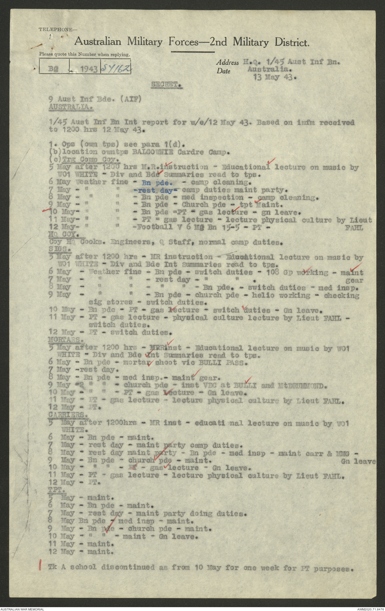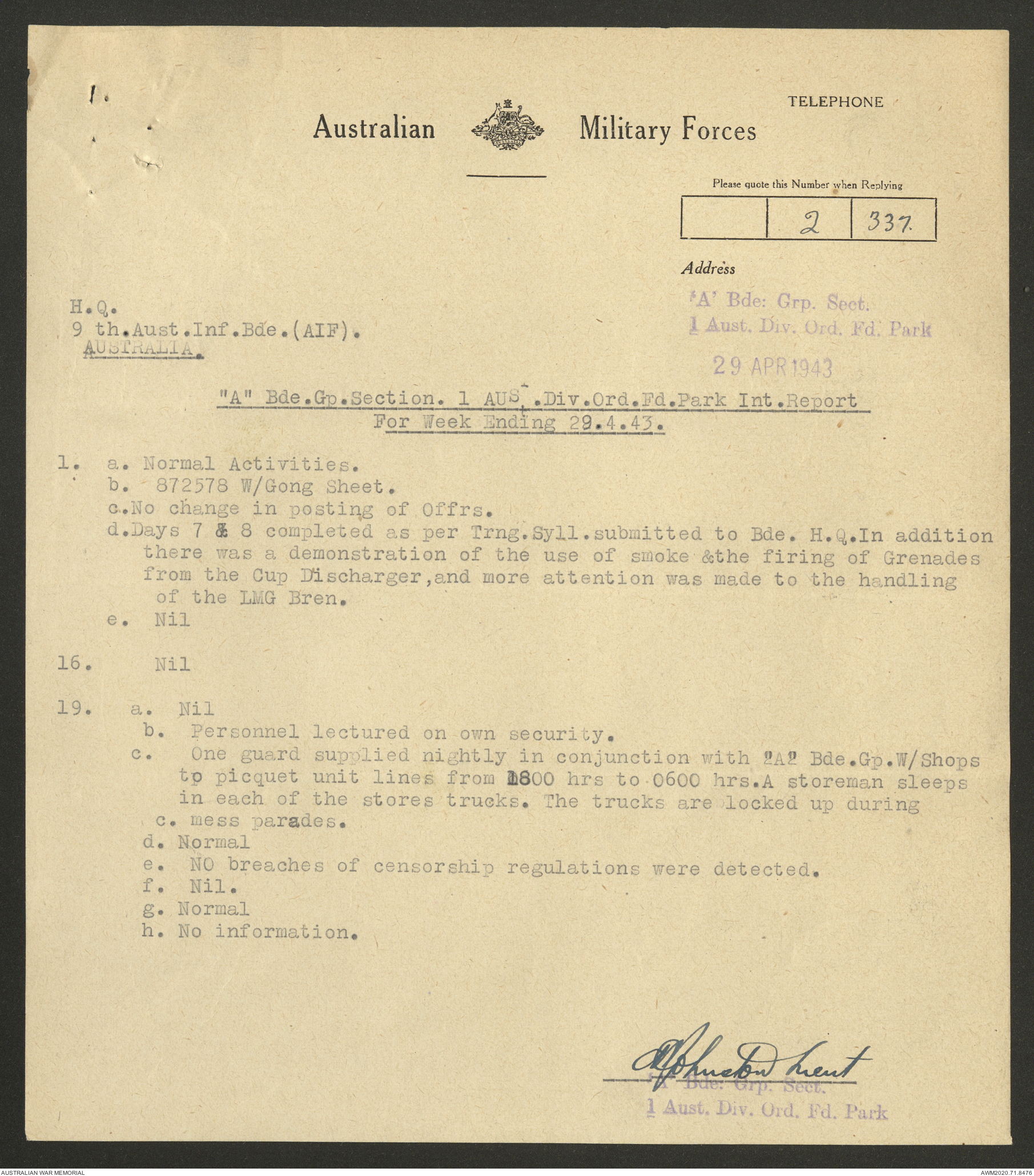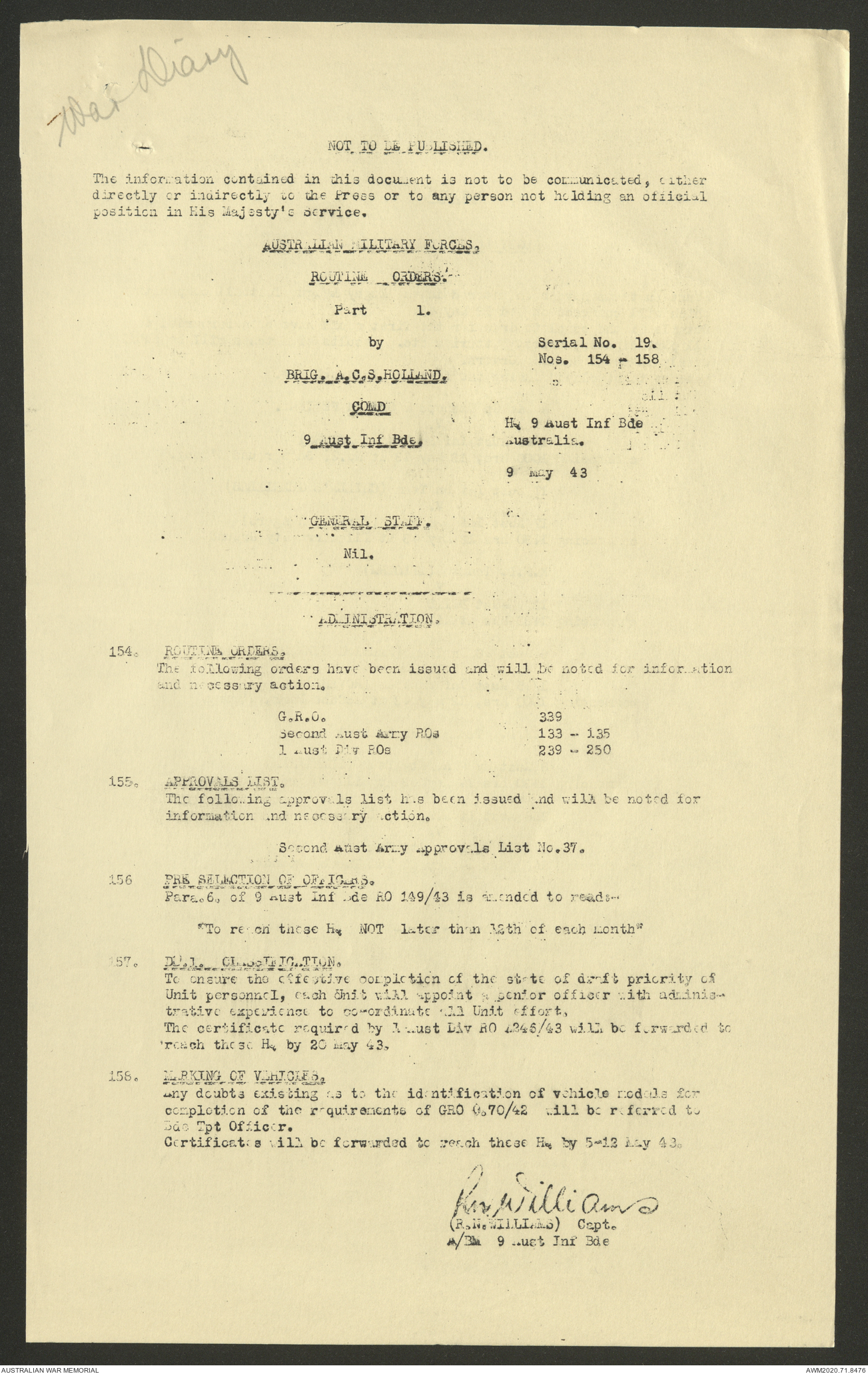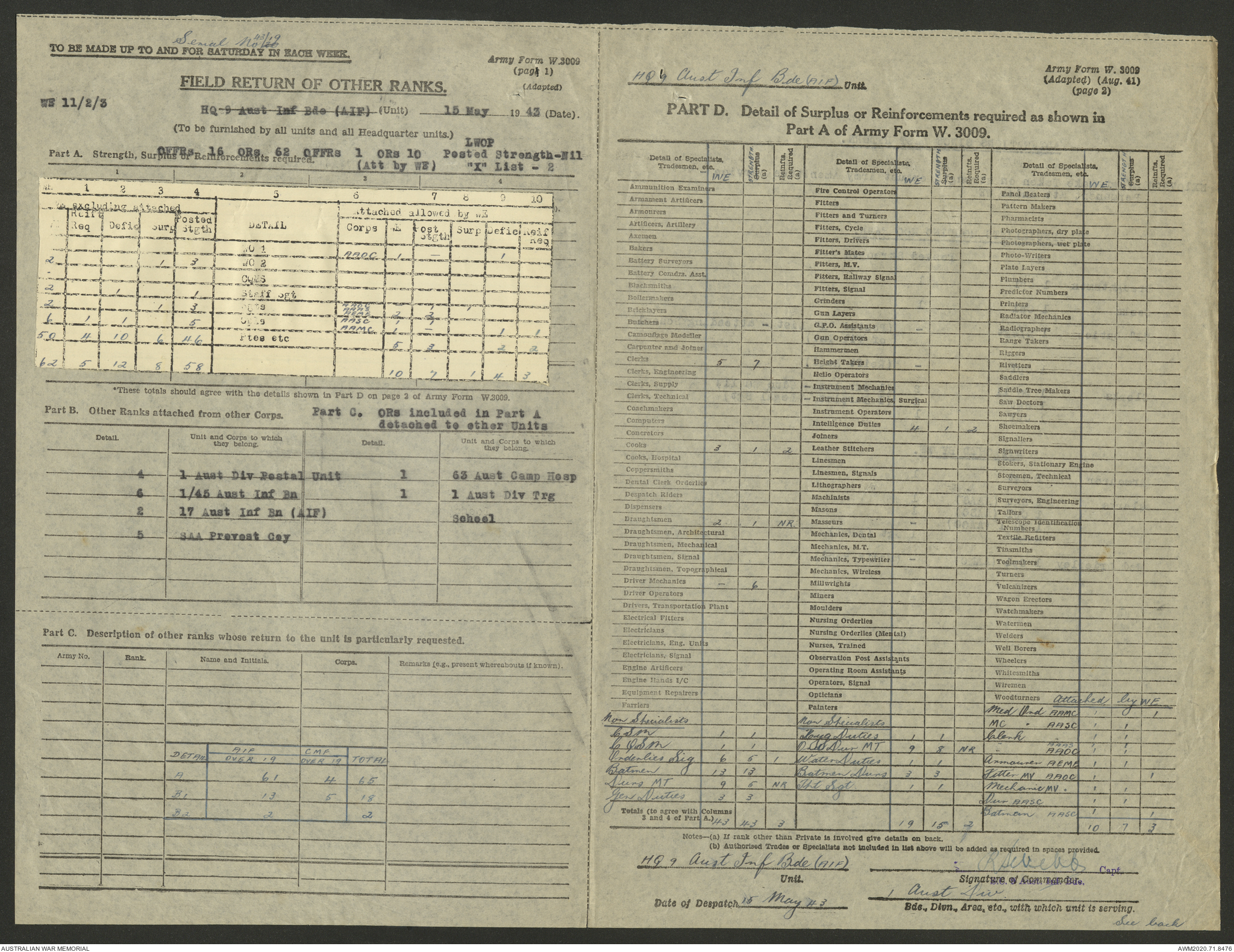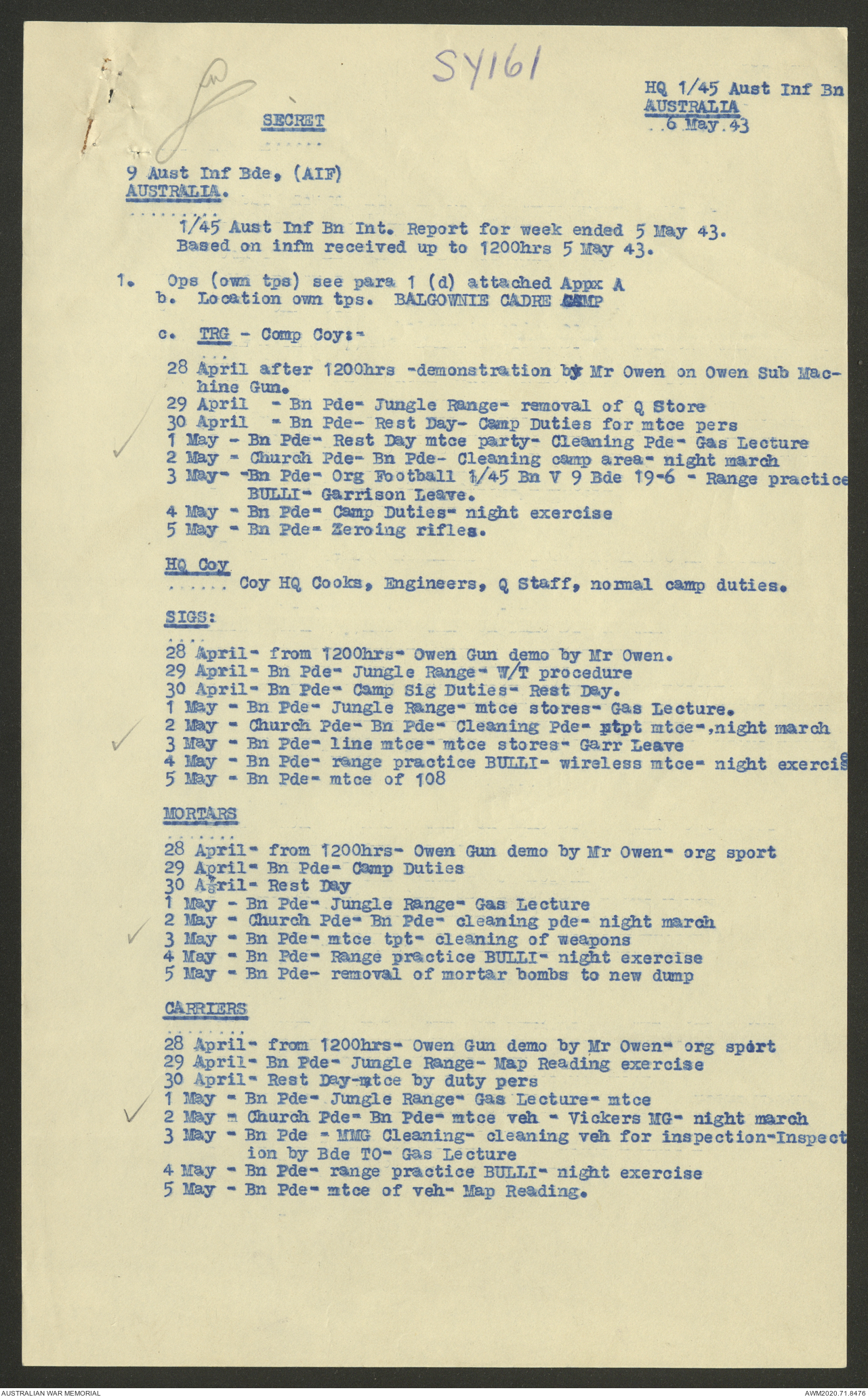 AWM52 8/2/9/22 - [Unit War Diaries, 1939-45 War] HQ 9 Australian Infantry Brigade AIF, May 1943