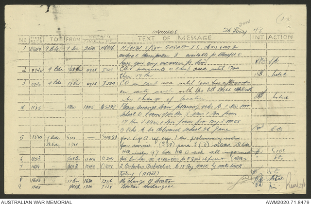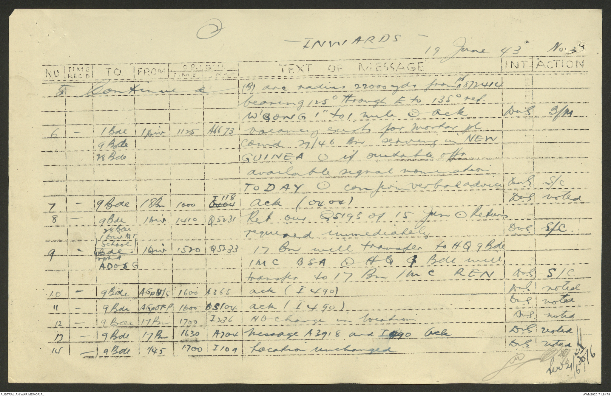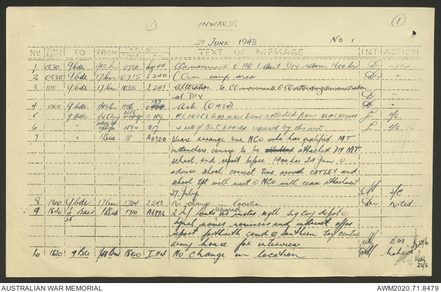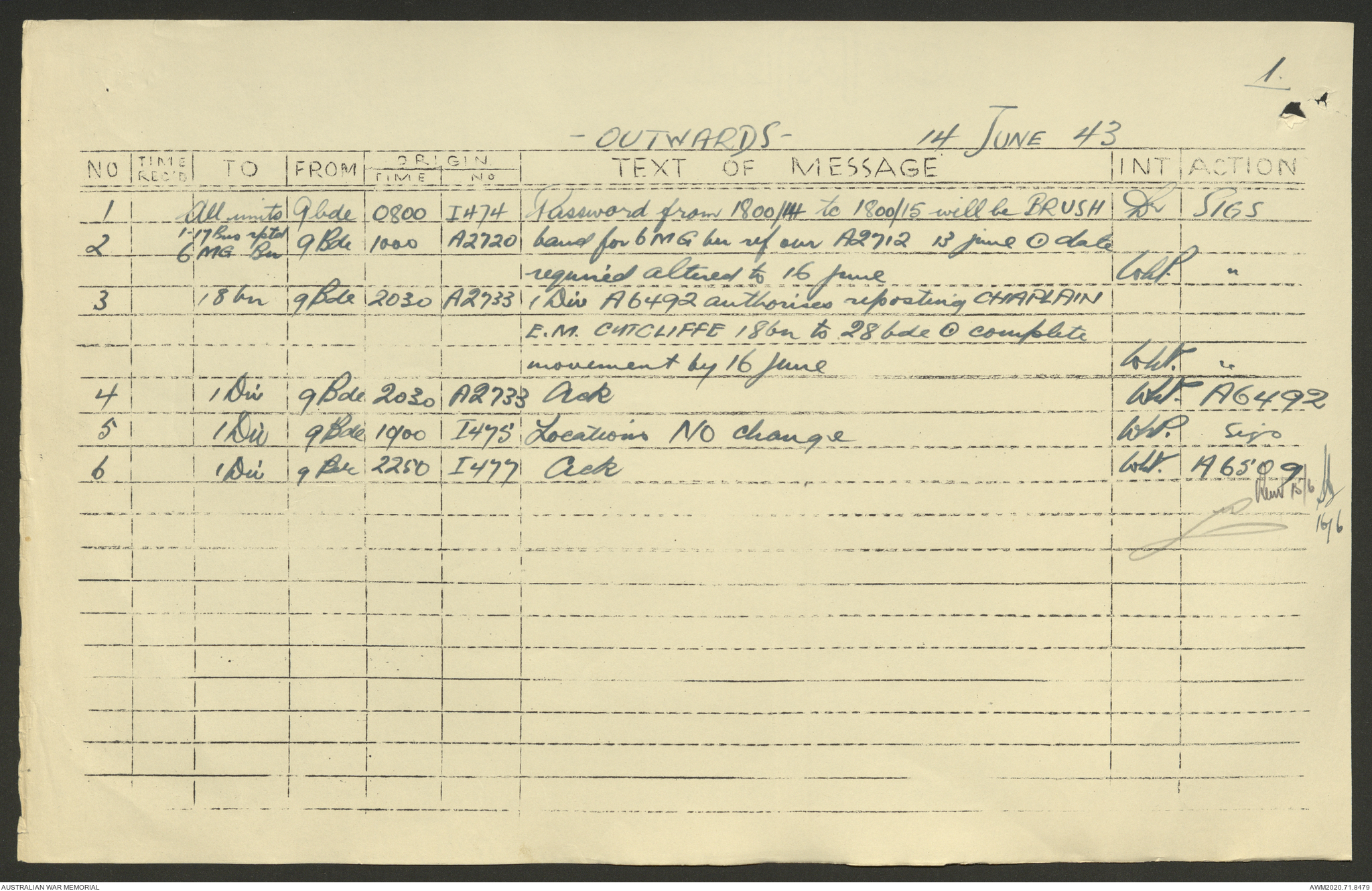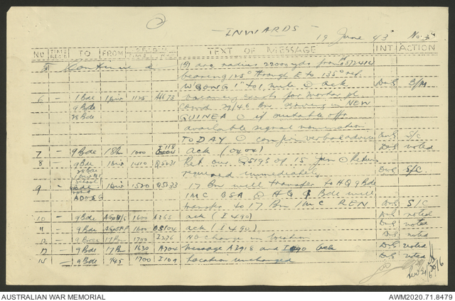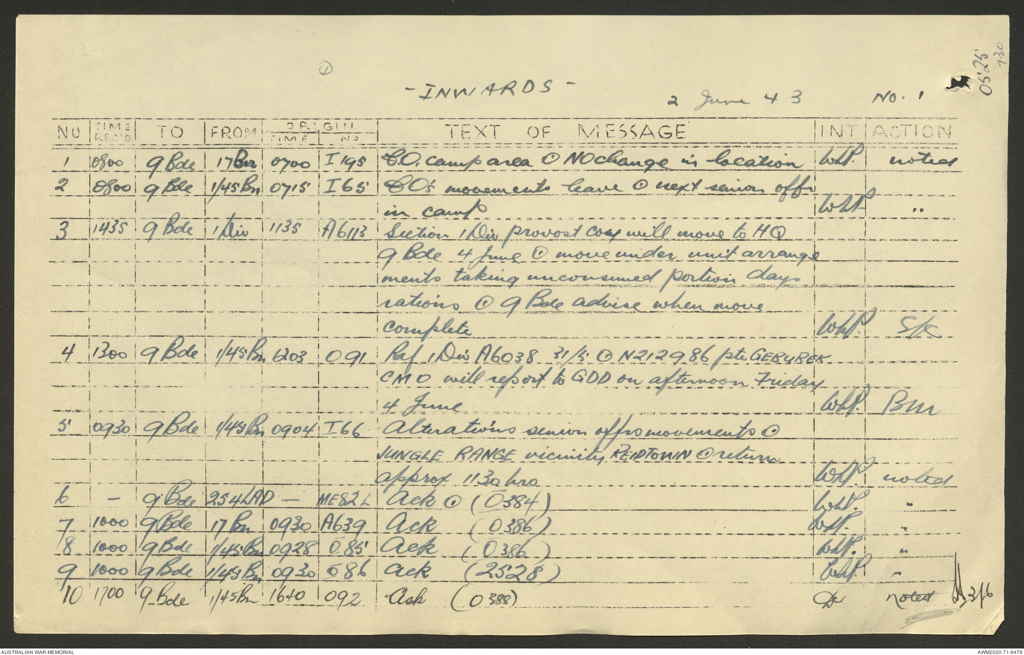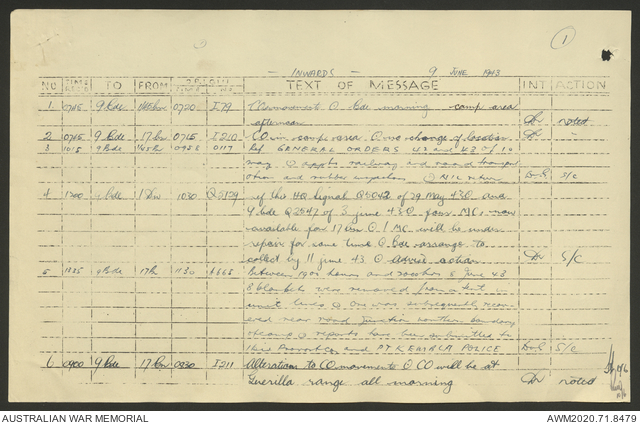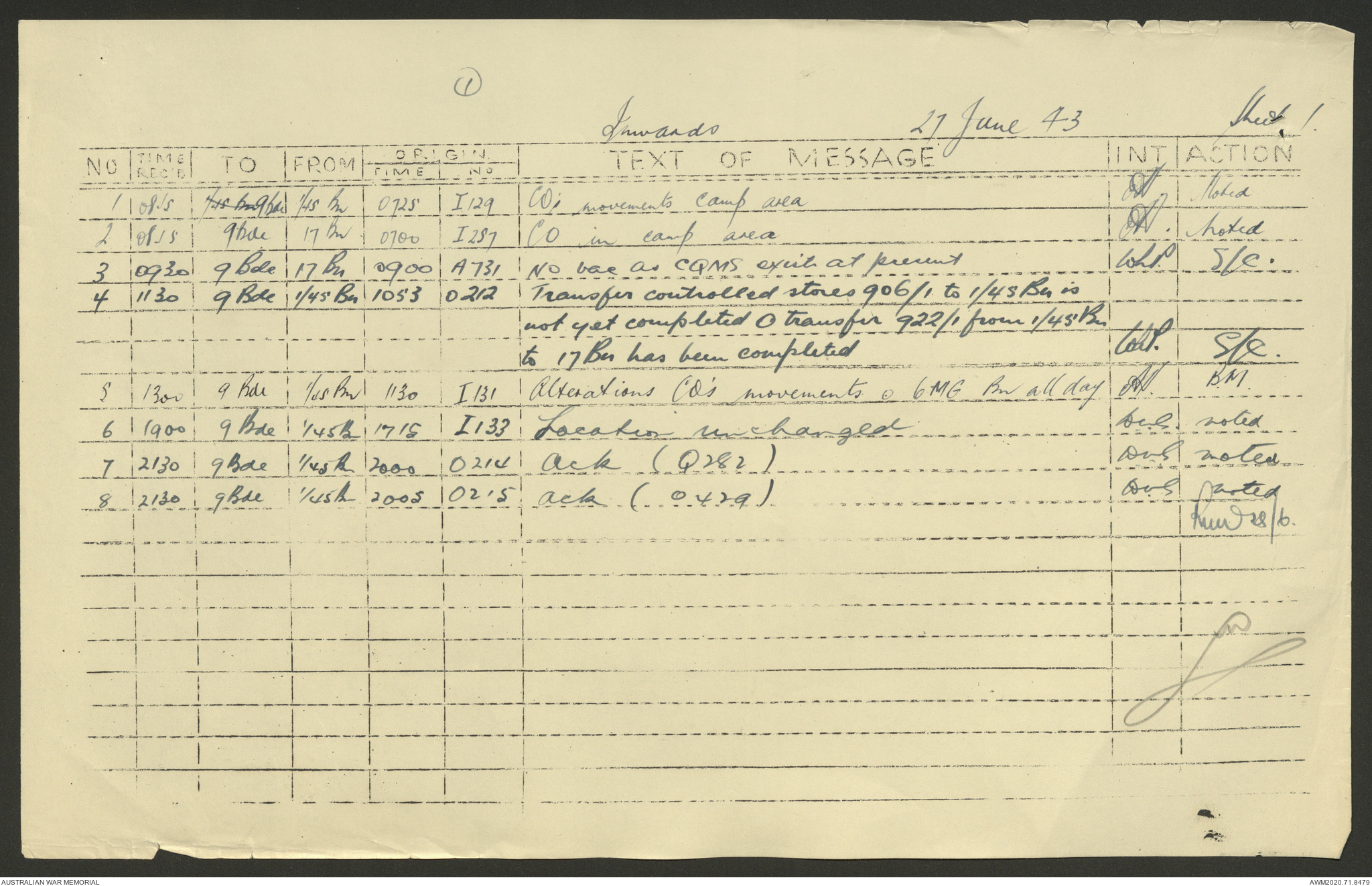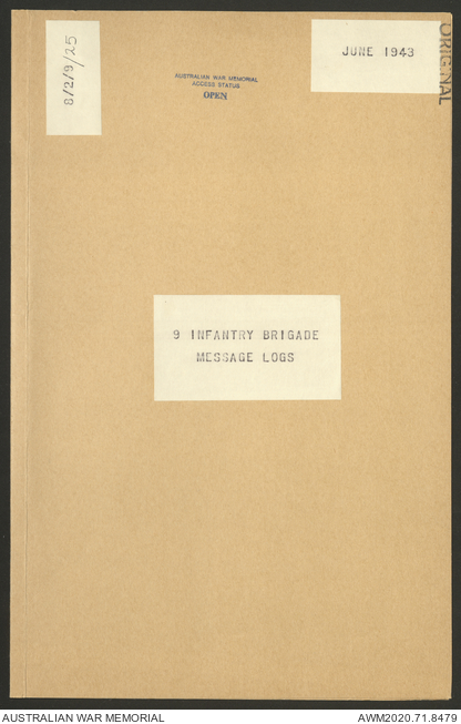 AWM52 8/2/9/25 - [Unit War Diaries, 1939-45 War] HQ 9 Australian Infantry Brigade AIF, June 1943, Message Logs