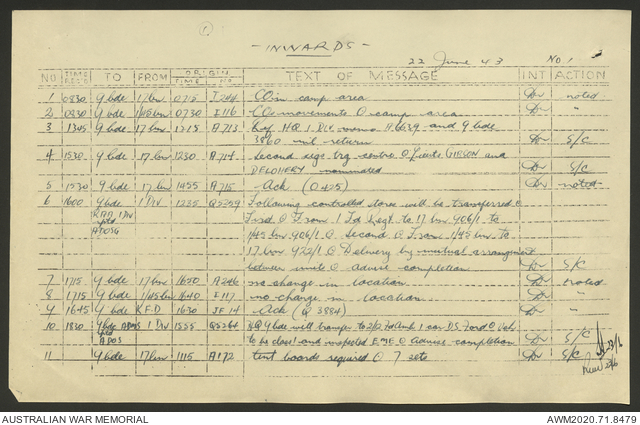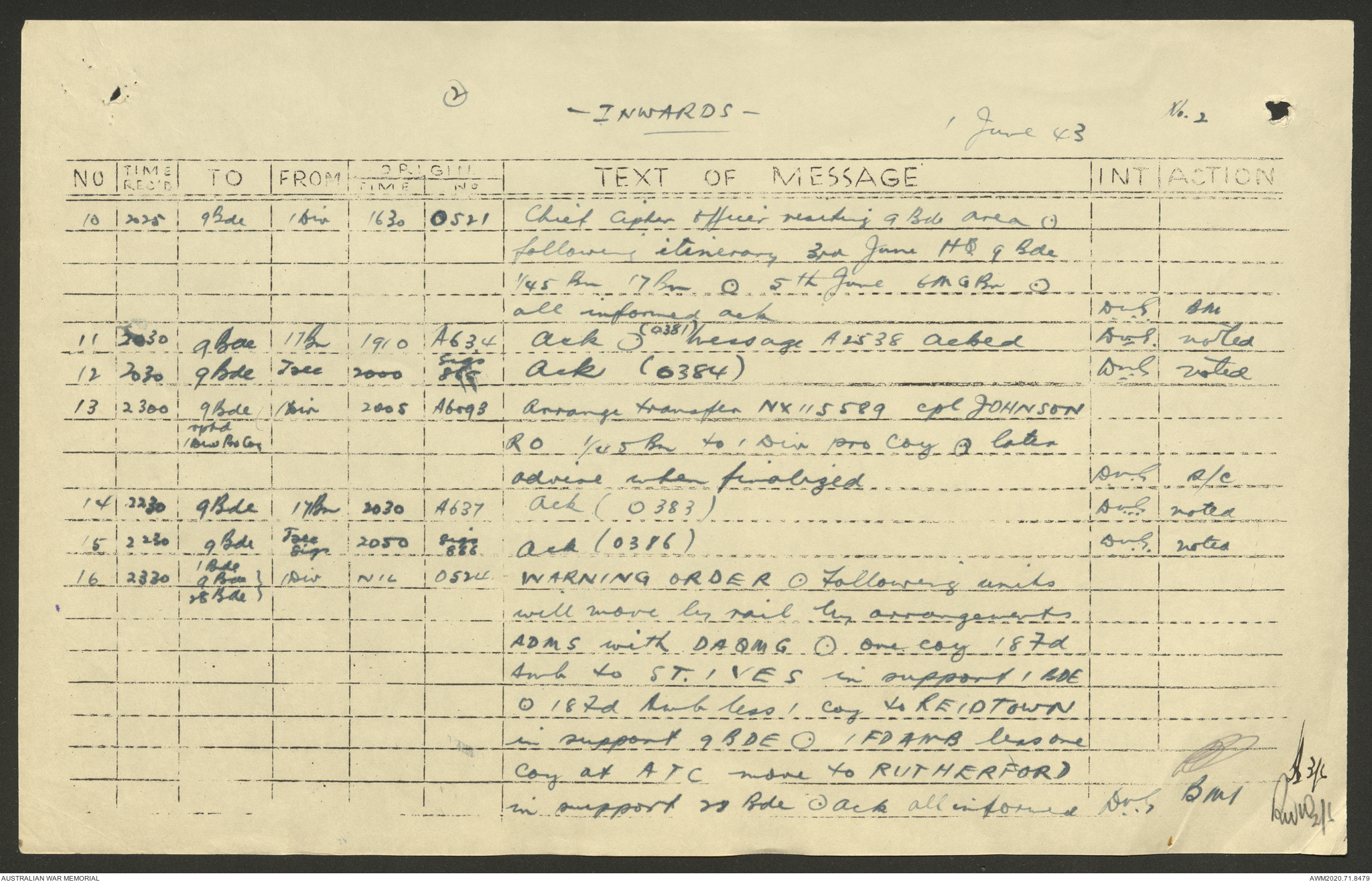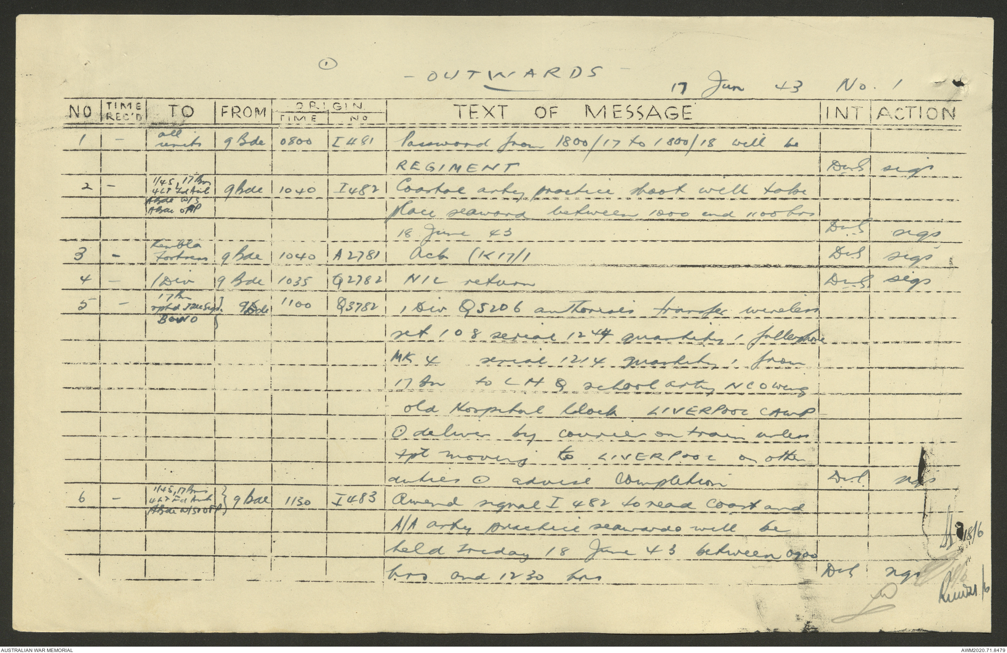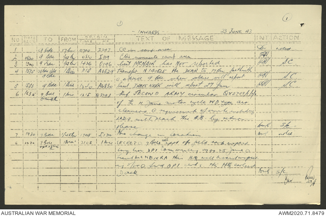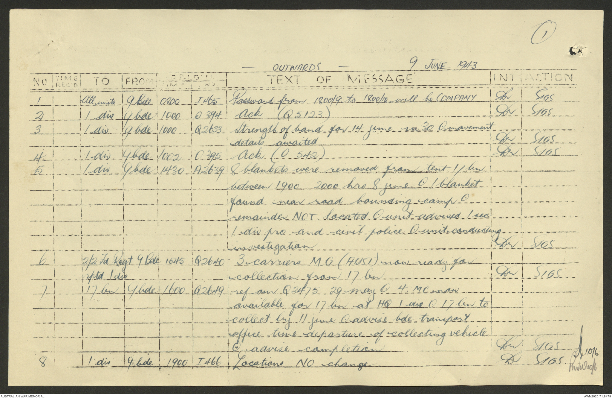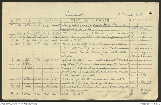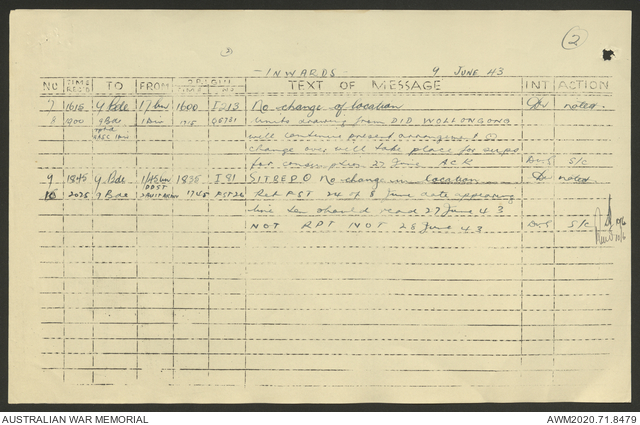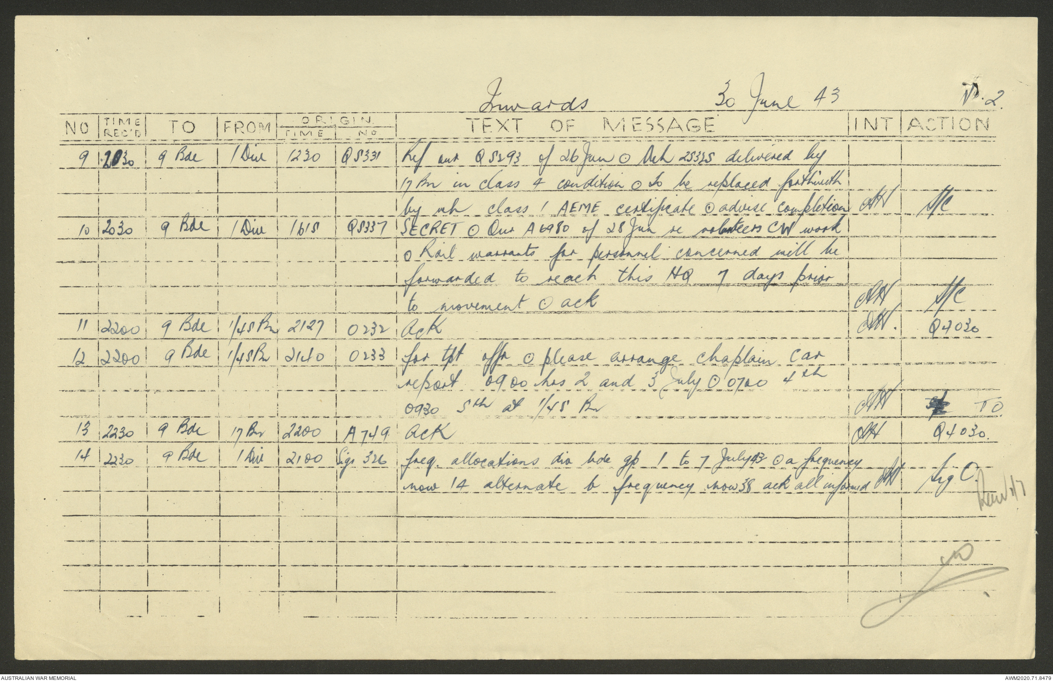 AWM52 8/2/9/25 - [Unit War Diaries, 1939-45 War] HQ 9 Australian Infantry Brigade AIF, June 1943, Message Logs