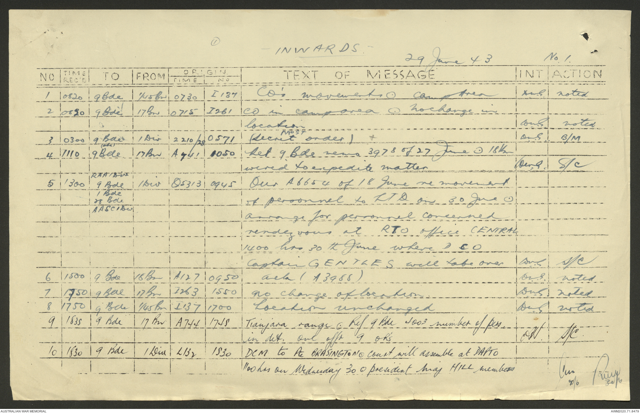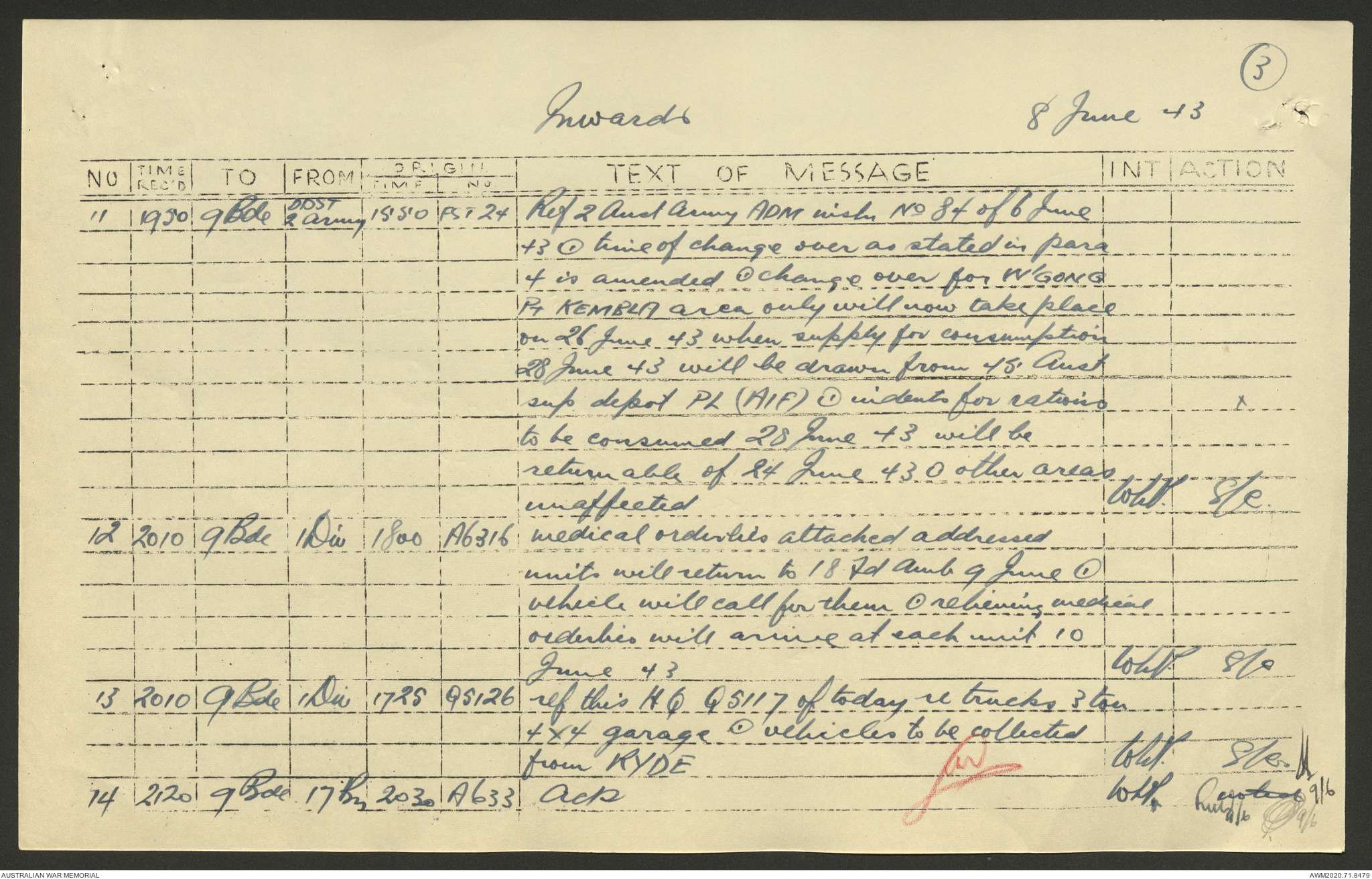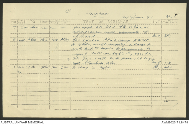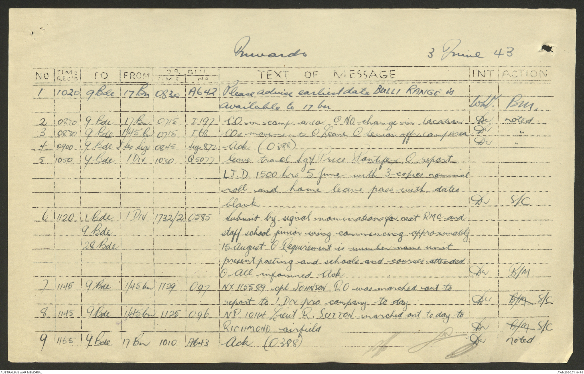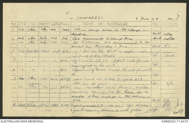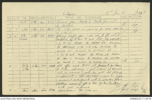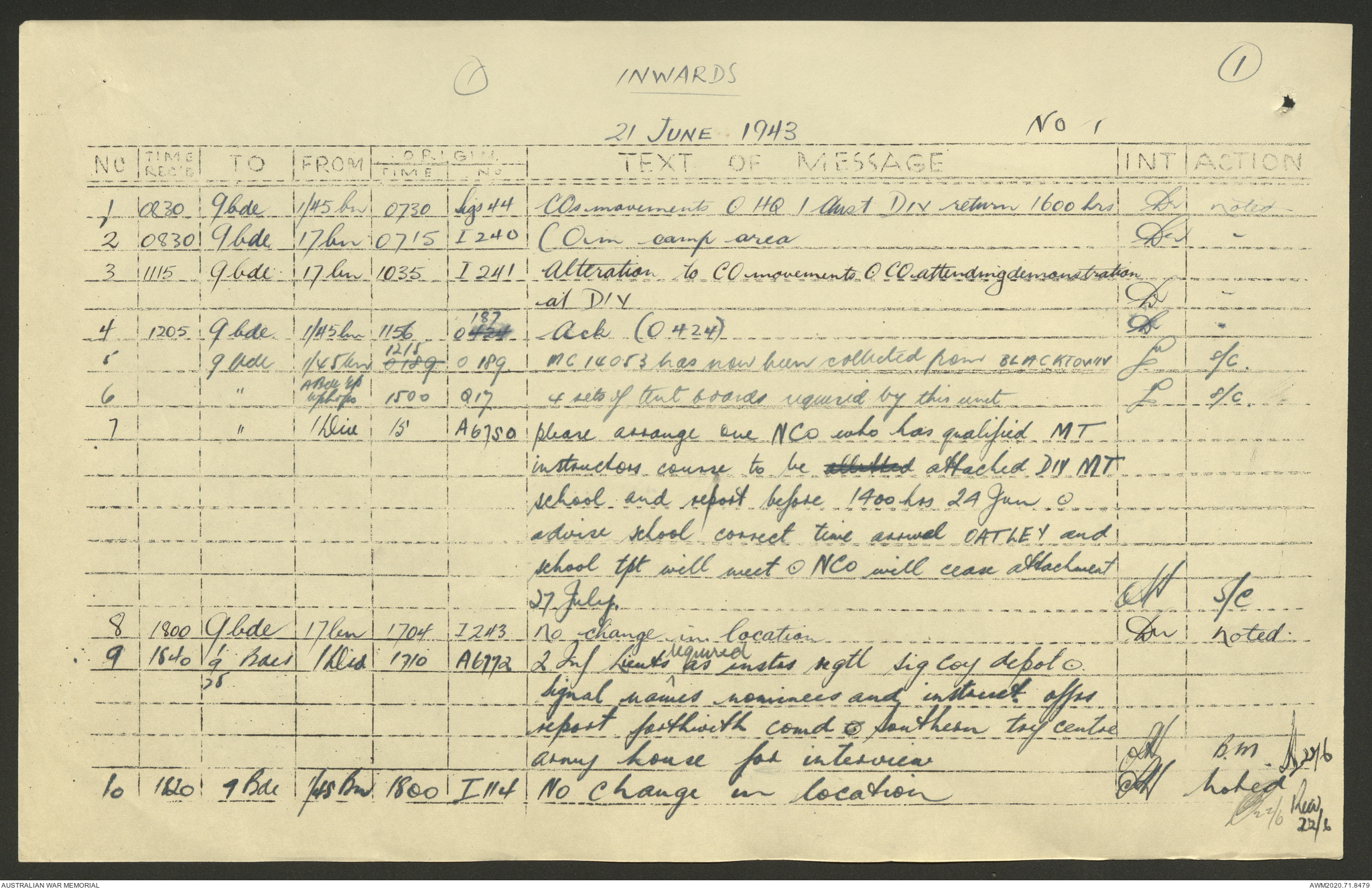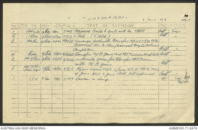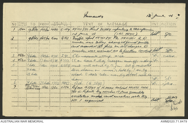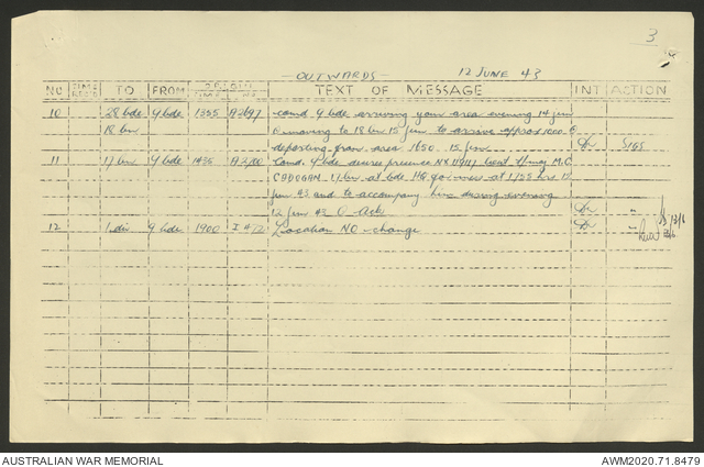 AWM52 8/2/9/25 - [Unit War Diaries, 1939-45 War] HQ 9 Australian Infantry Brigade AIF, June 1943, Message Logs