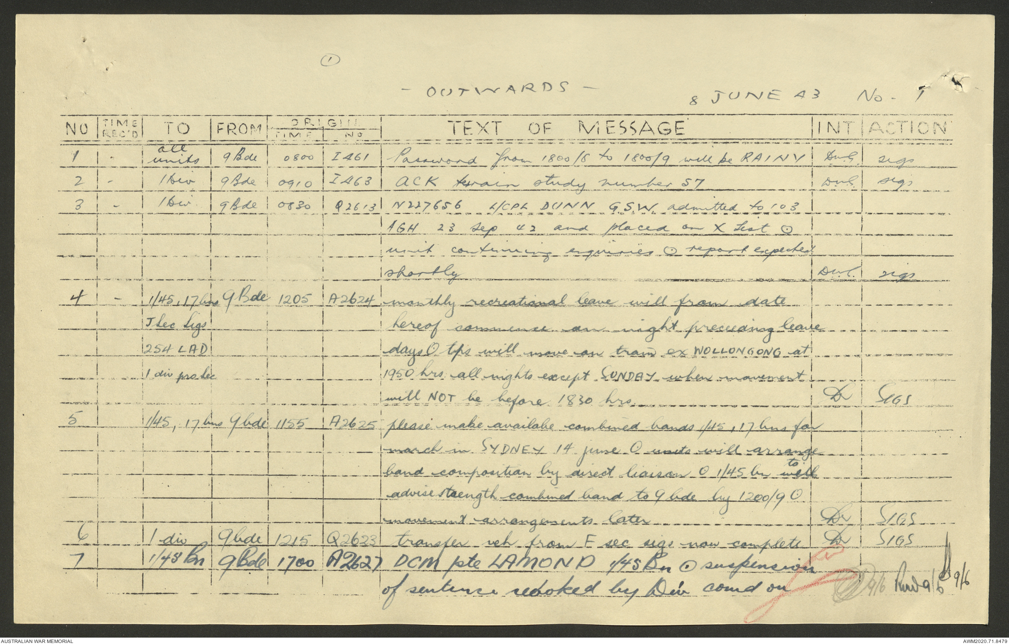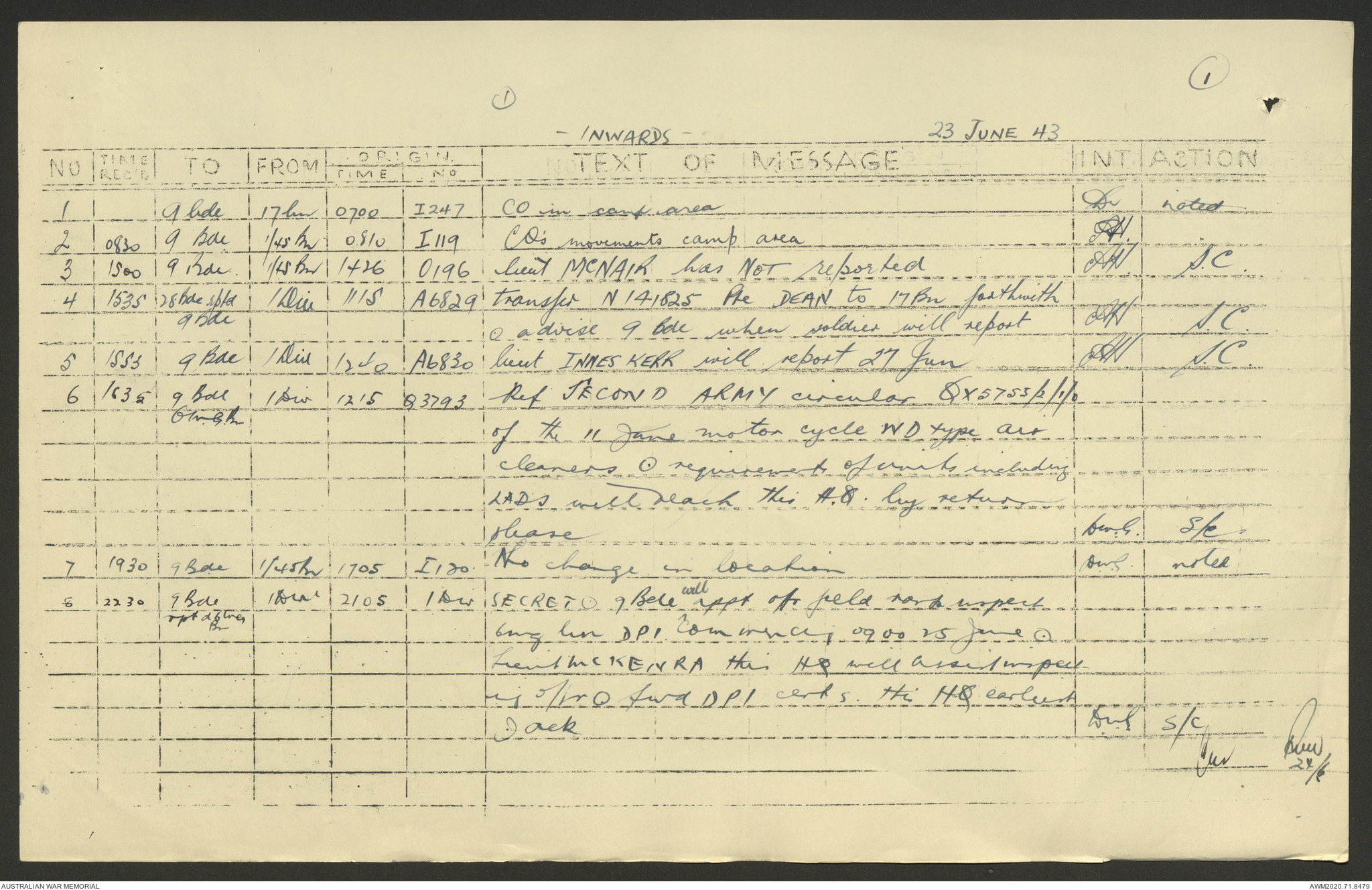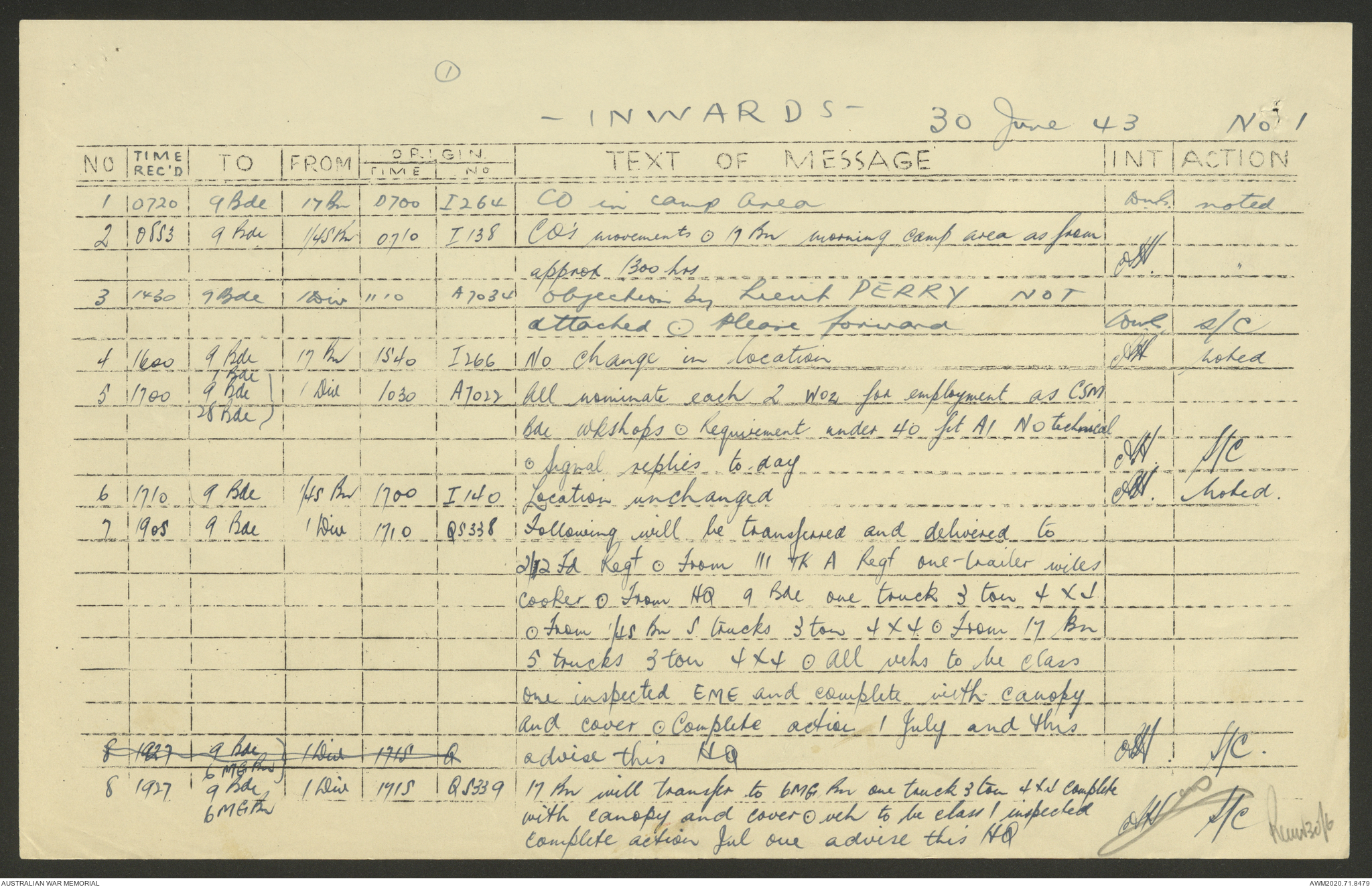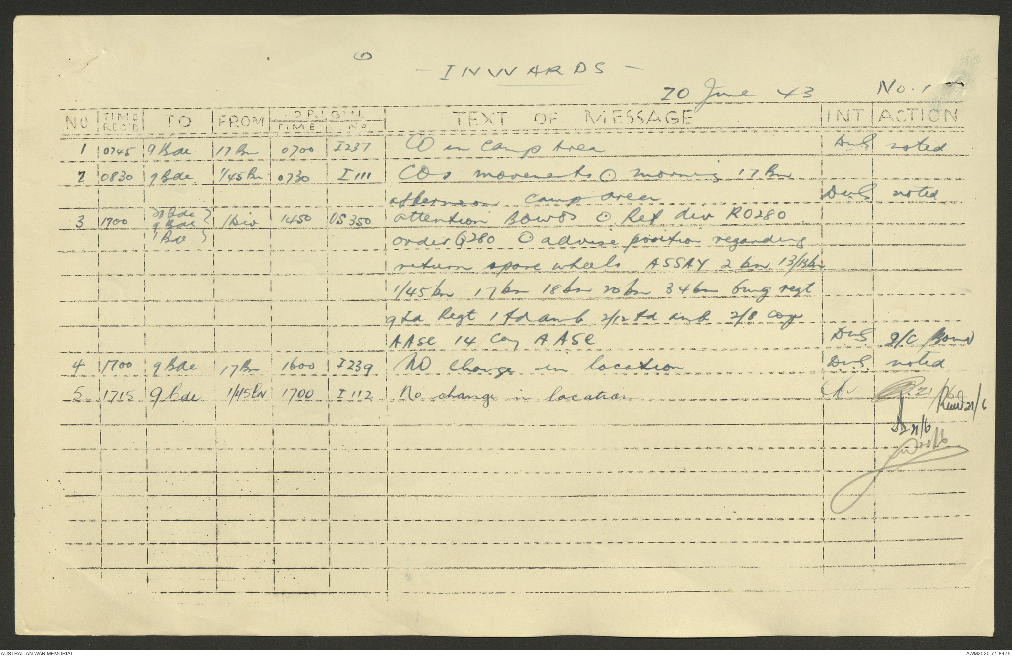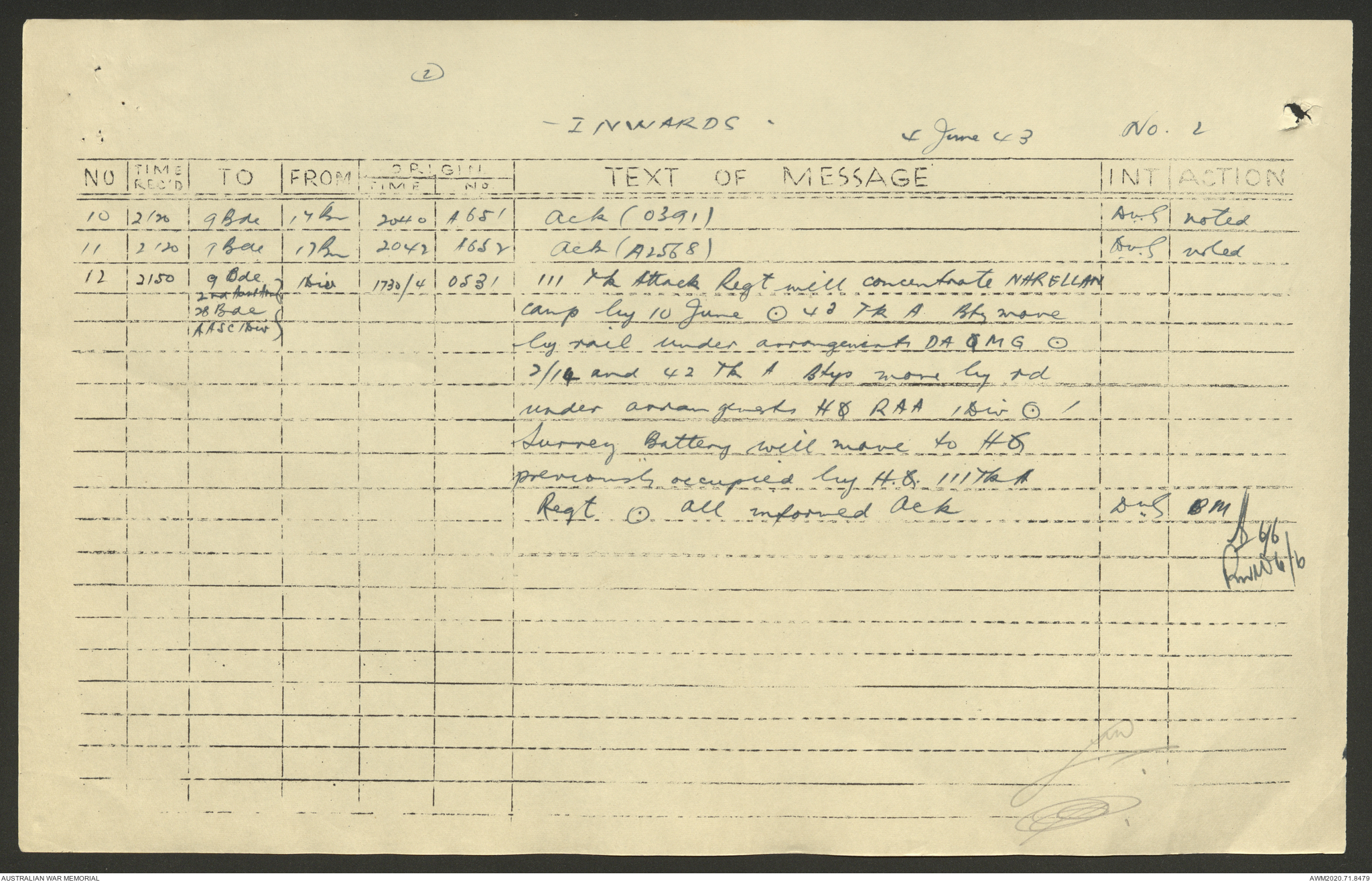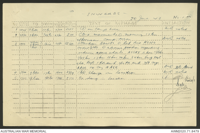 AWM52 8/2/9/25 - [Unit War Diaries, 1939-45 War] HQ 9 Australian Infantry Brigade AIF, June 1943, Message Logs