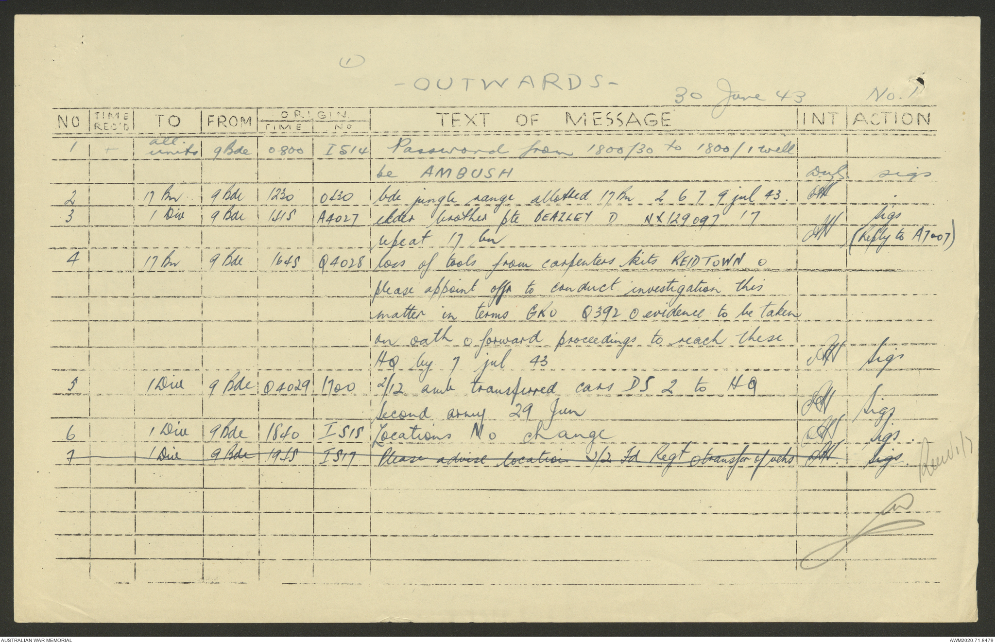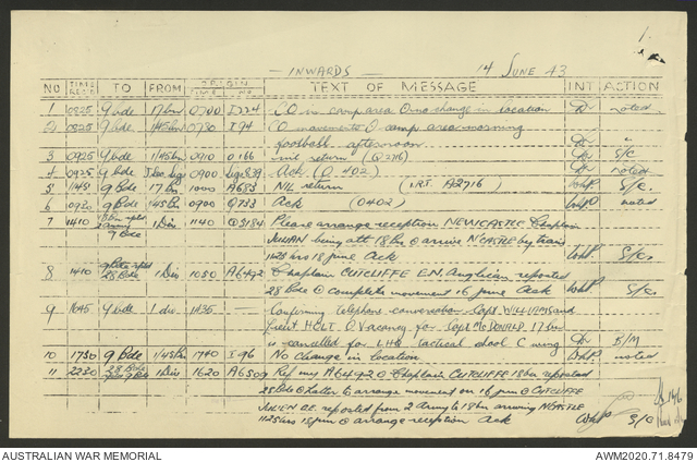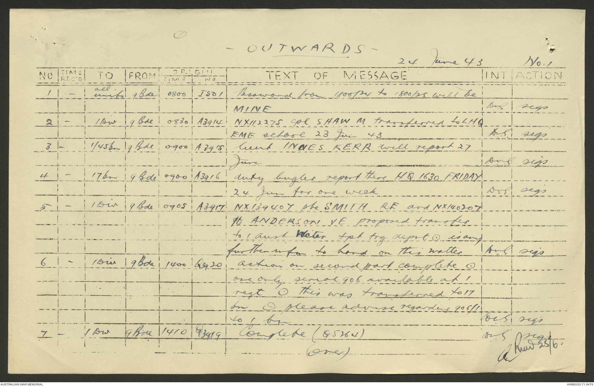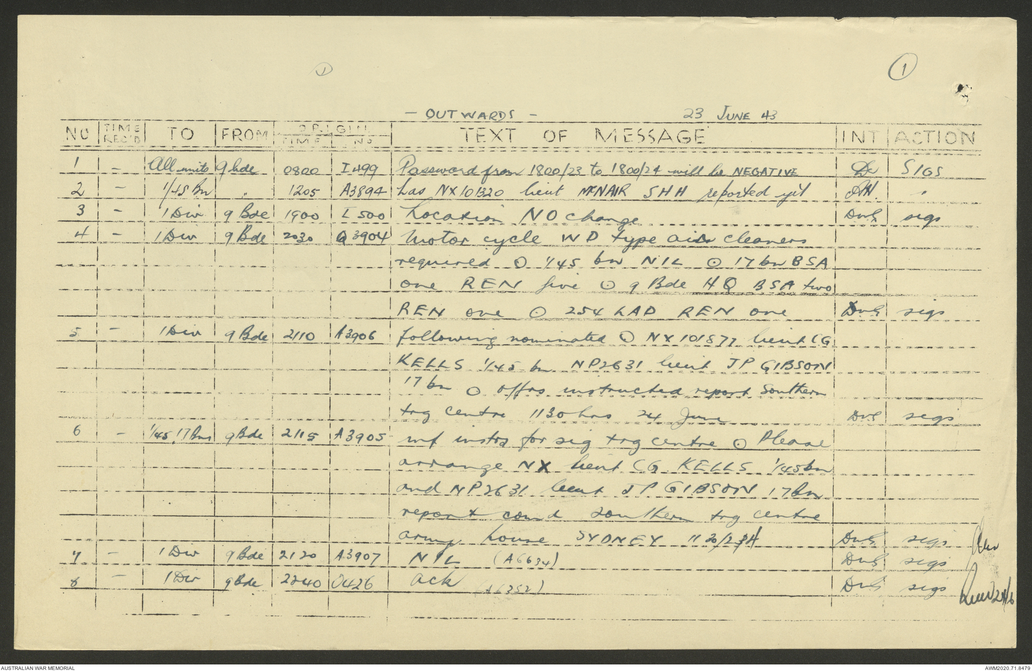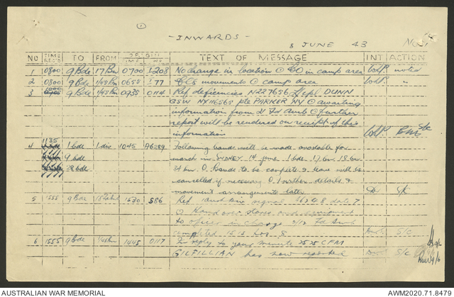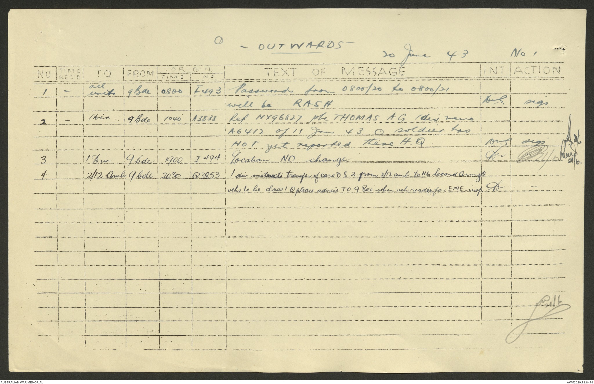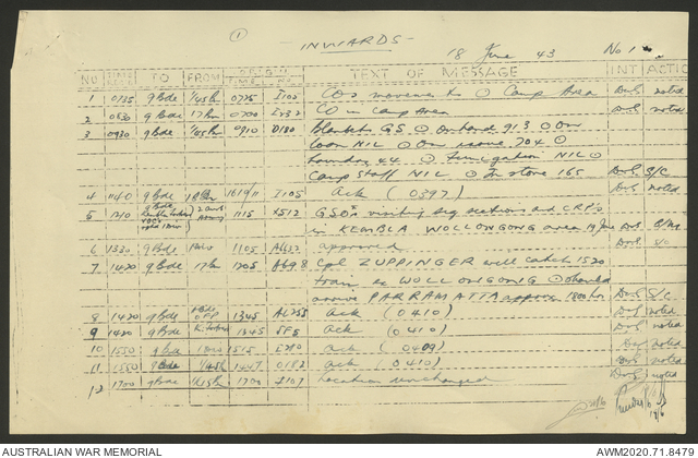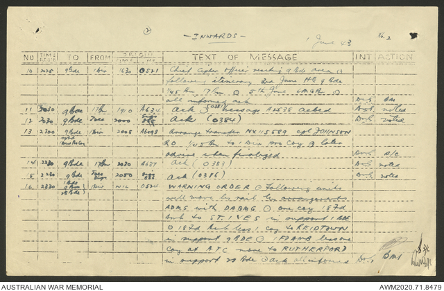 AWM52 8/2/9/25 - [Unit War Diaries, 1939-45 War] HQ 9 Australian Infantry Brigade AIF, June 1943, Message Logs