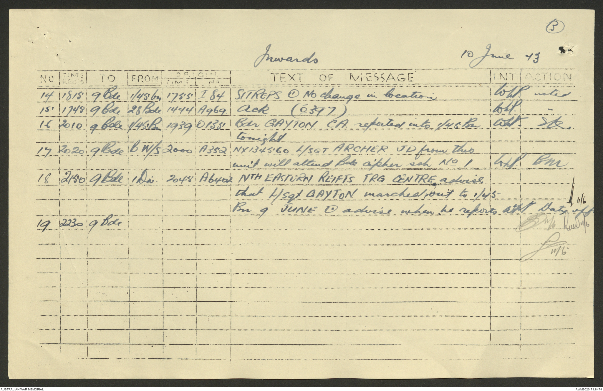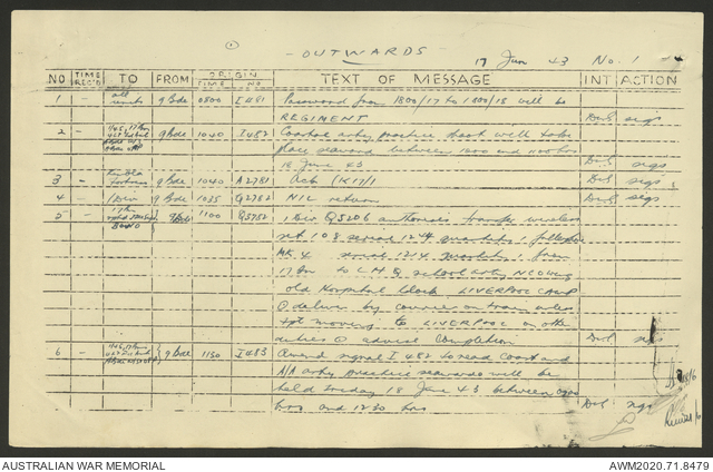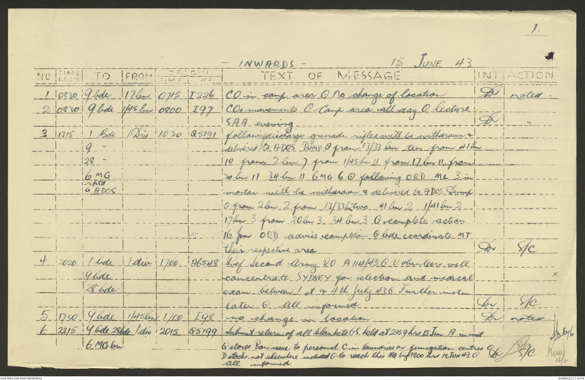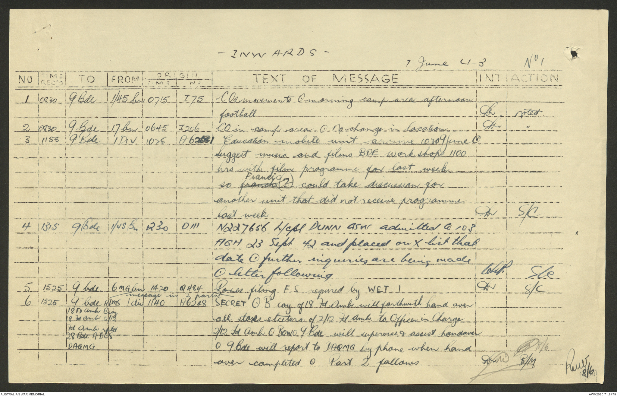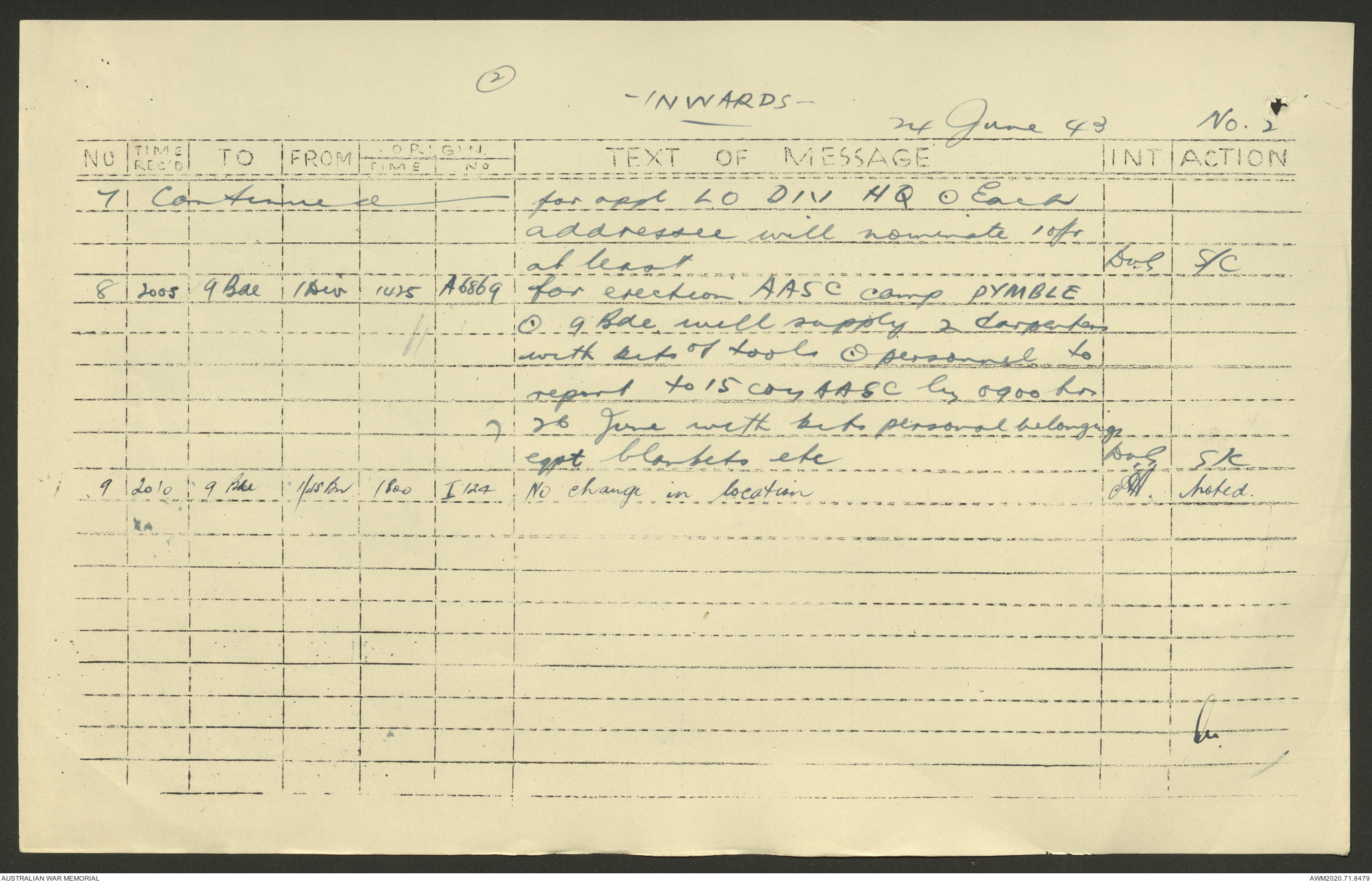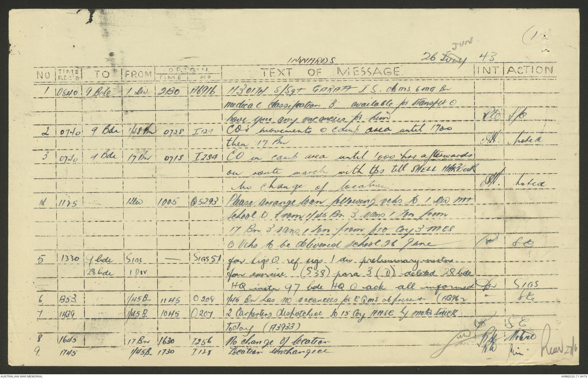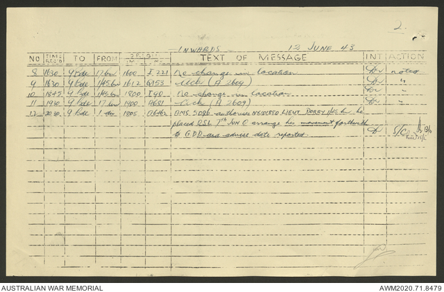 AWM52 8/2/9/25 - [Unit War Diaries, 1939-45 War] HQ 9 Australian Infantry Brigade AIF, June 1943, Message Logs