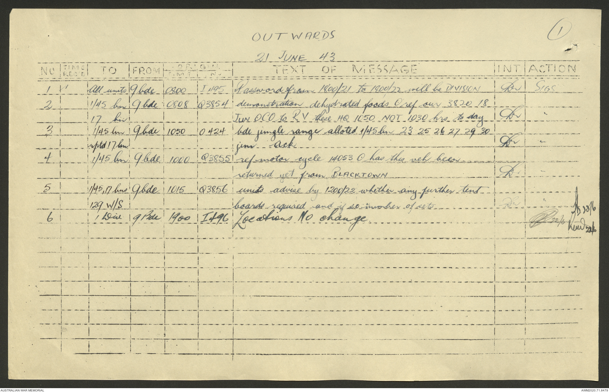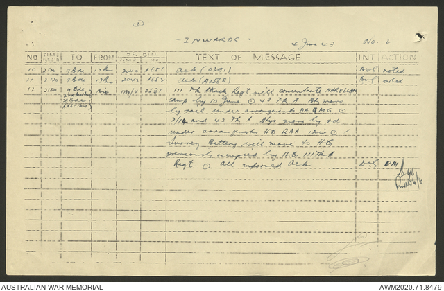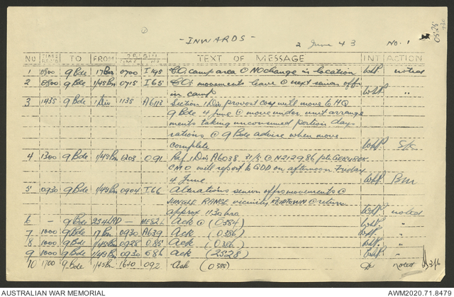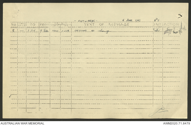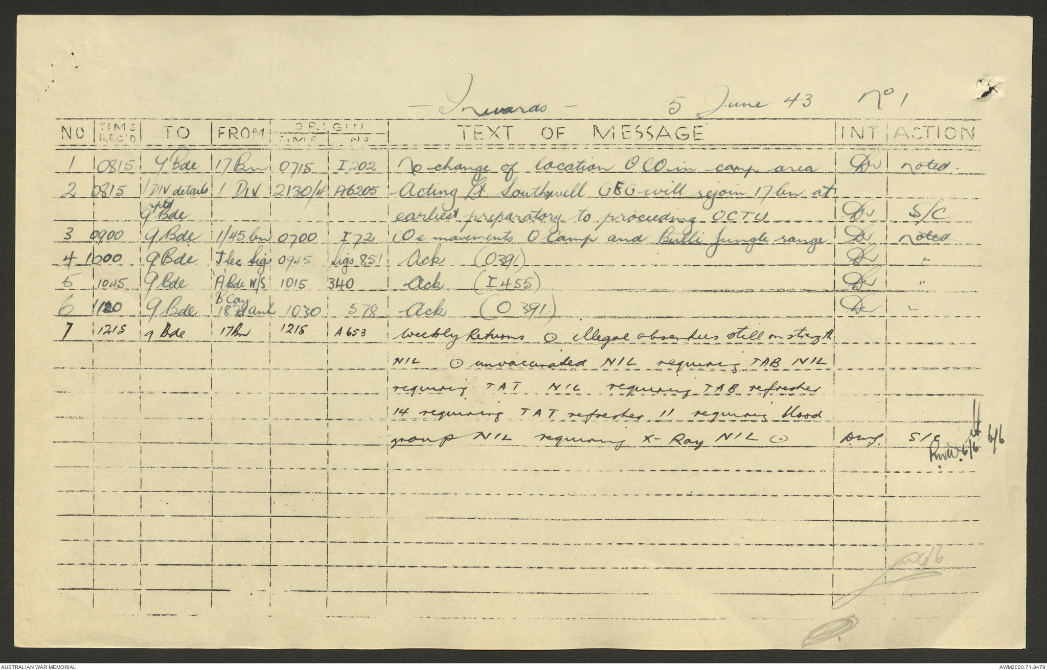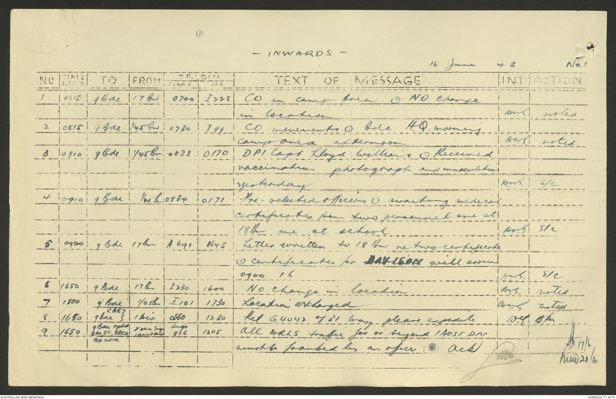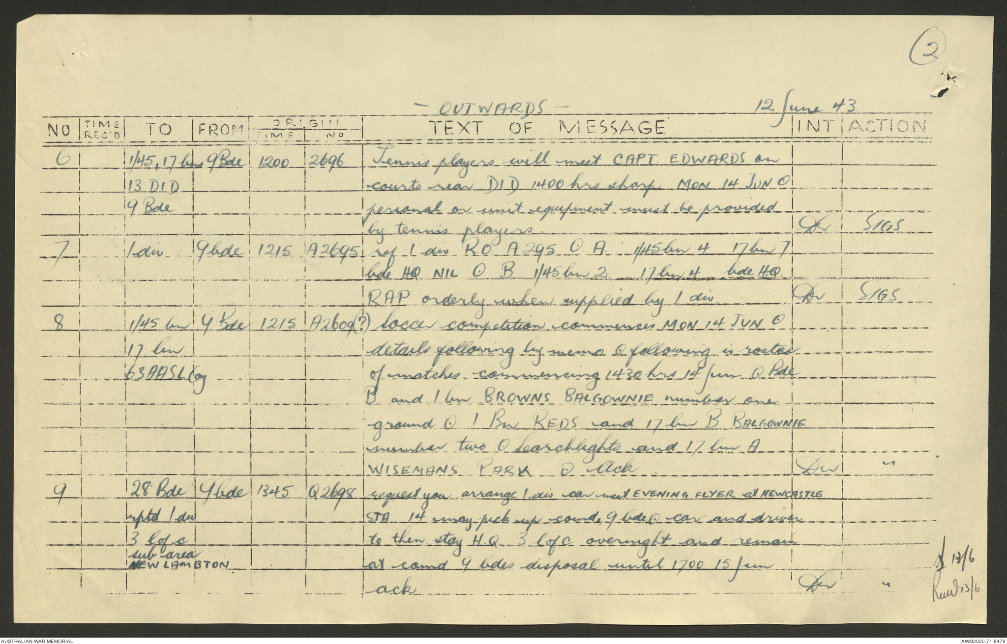 AWM52 8/2/9/25 - [Unit War Diaries, 1939-45 War] HQ 9 Australian Infantry Brigade AIF, June 1943, Message Logs