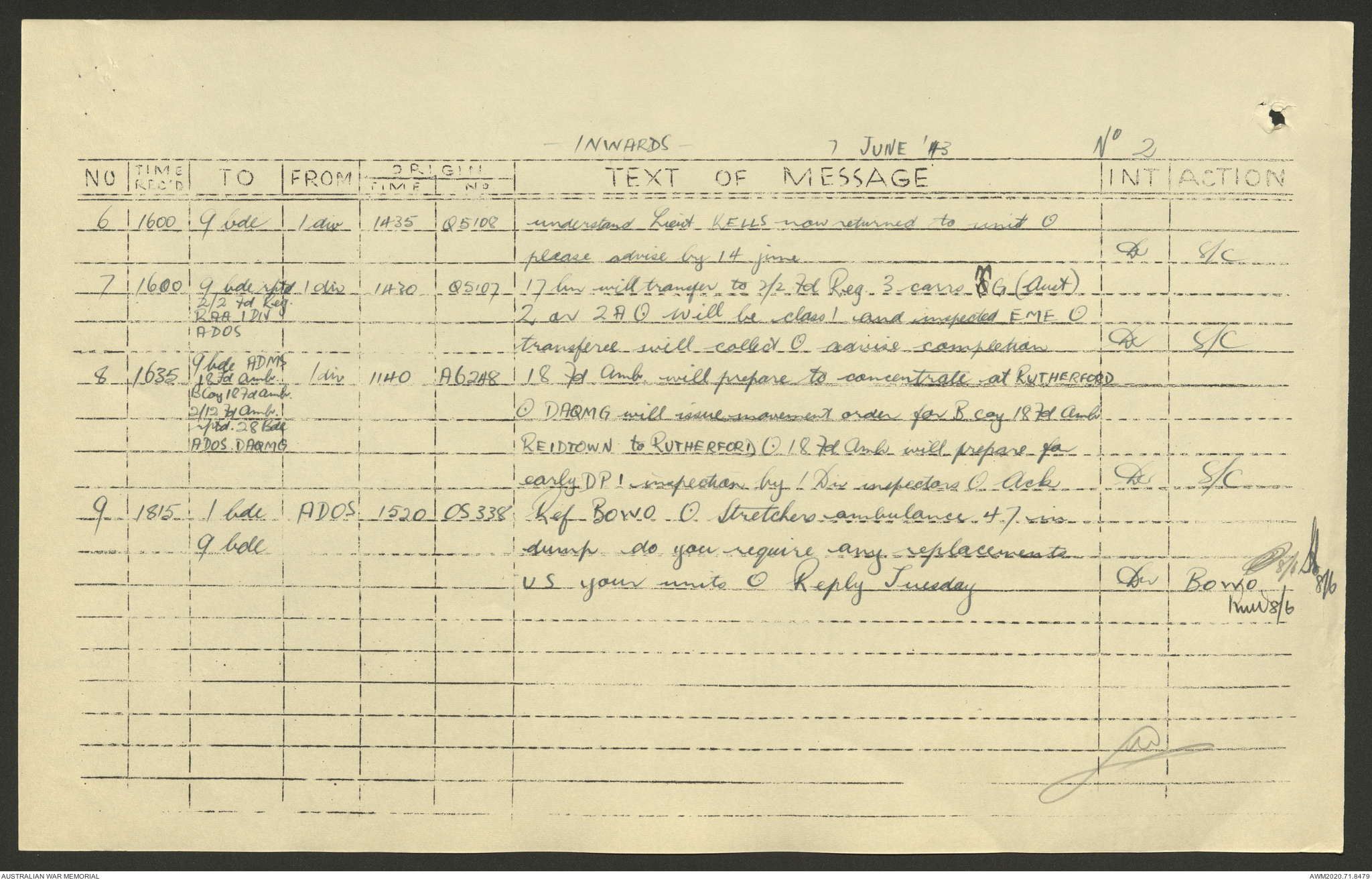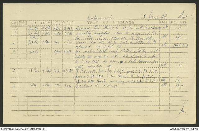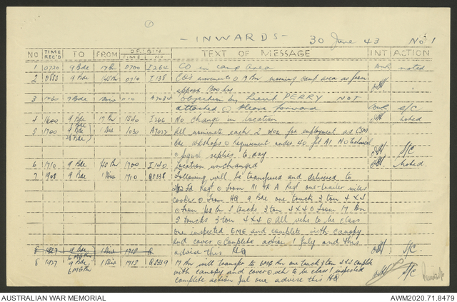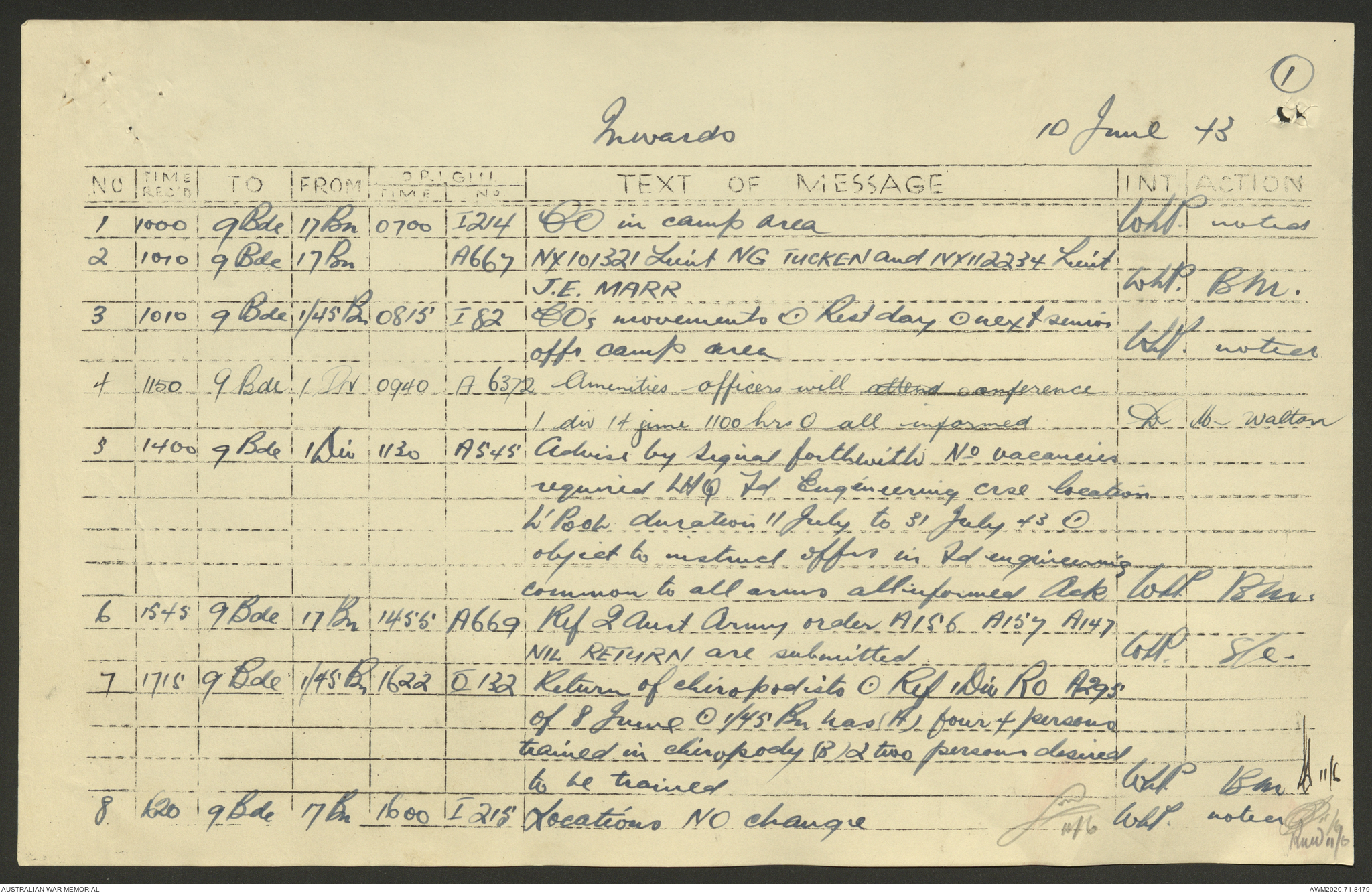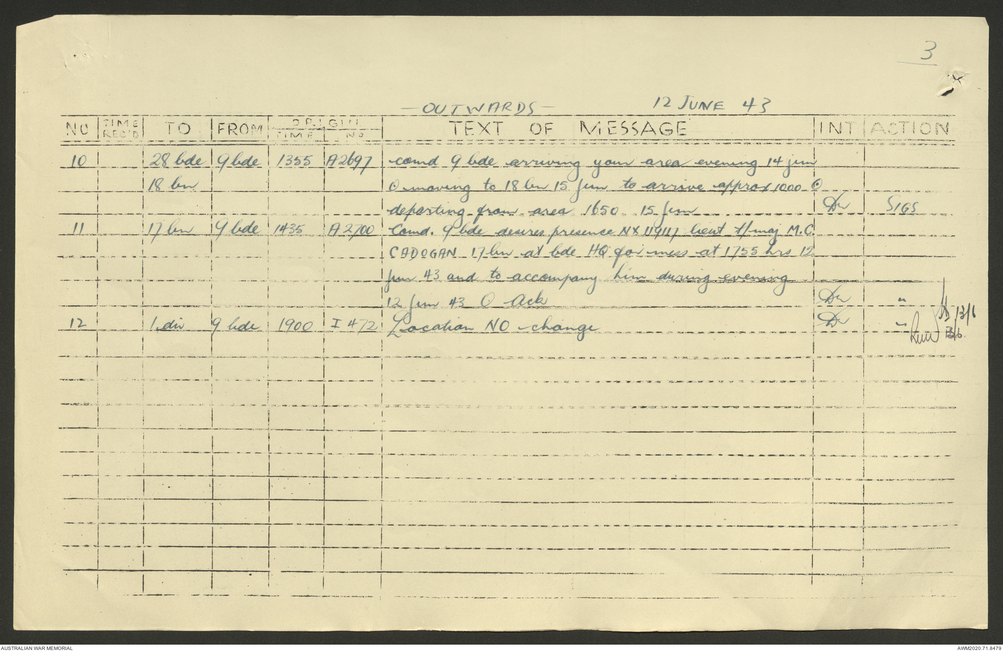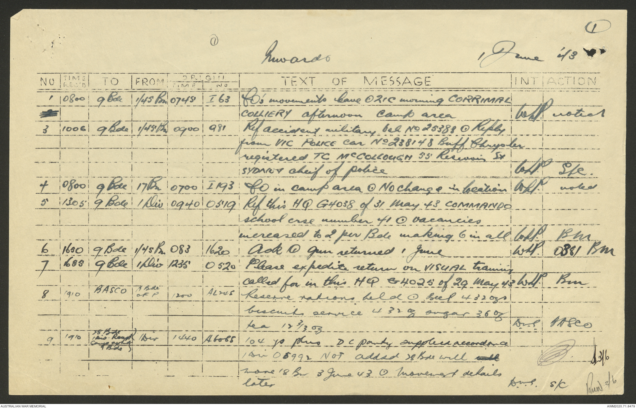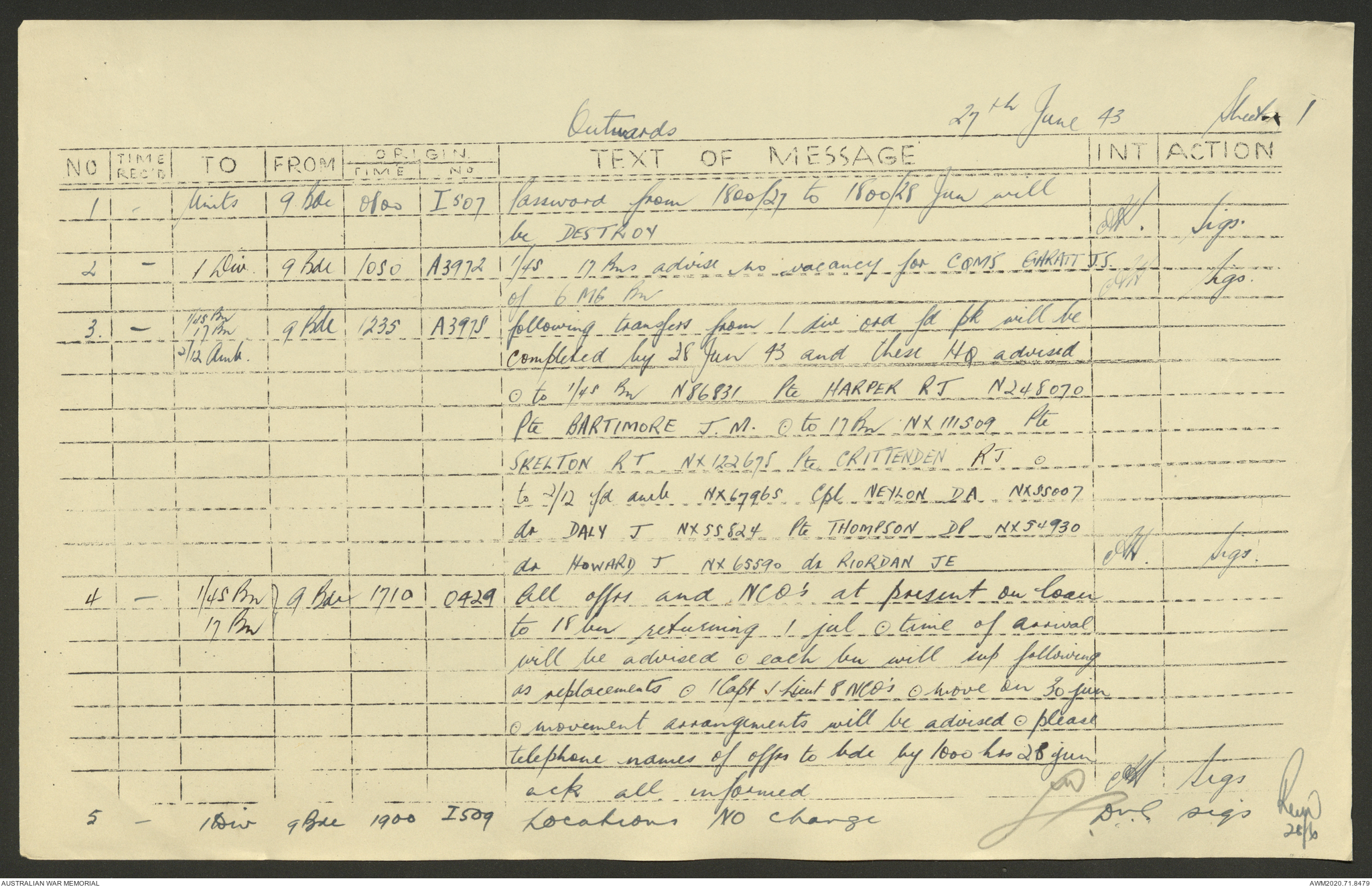 AWM52 8/2/9/25 - [Unit War Diaries, 1939-45 War] HQ 9 Australian Infantry Brigade AIF, June 1943, Message Logs