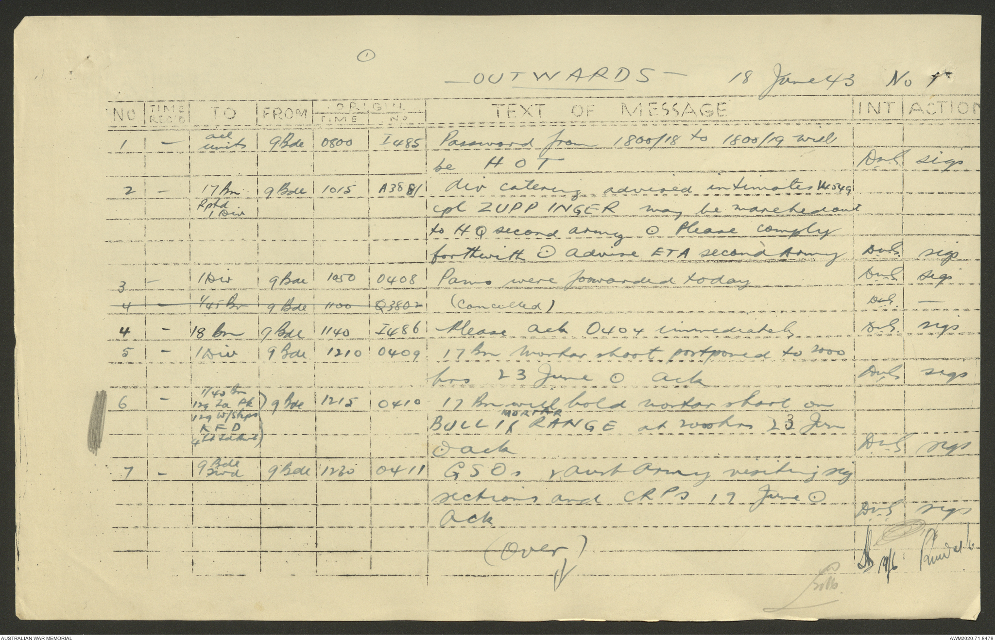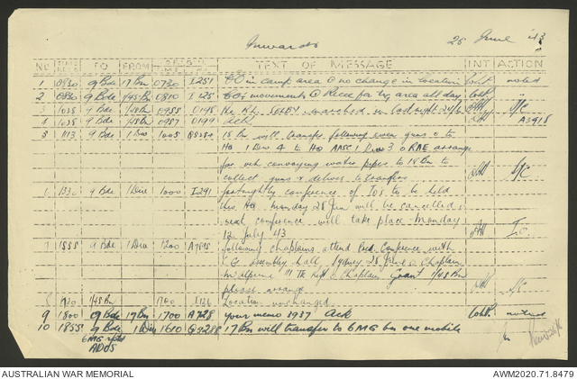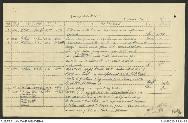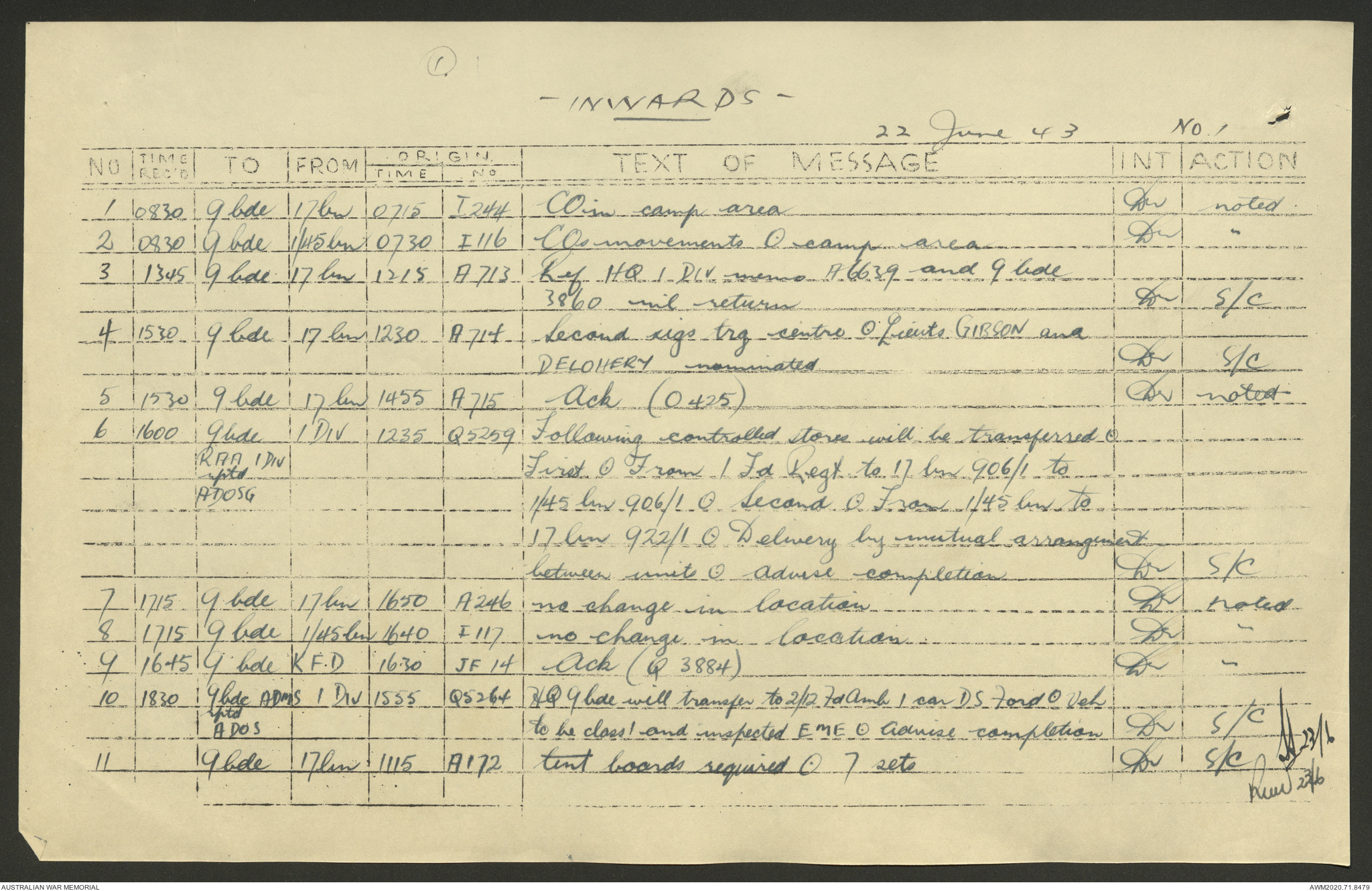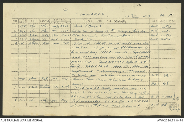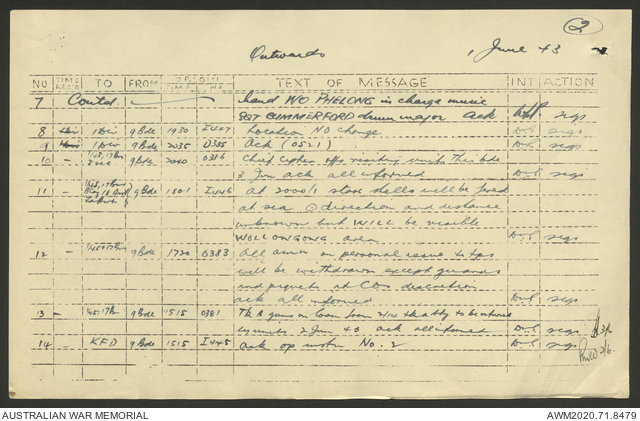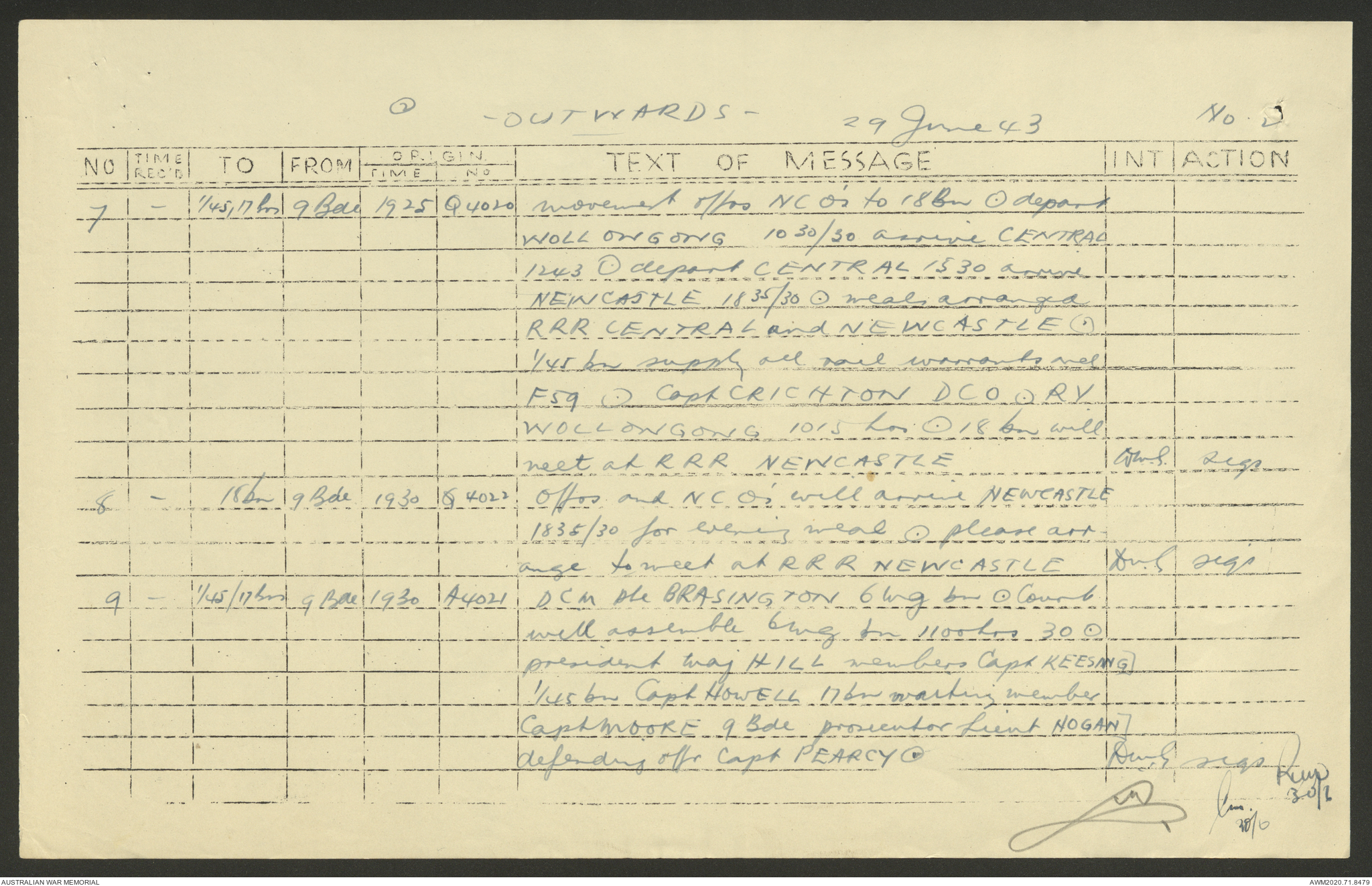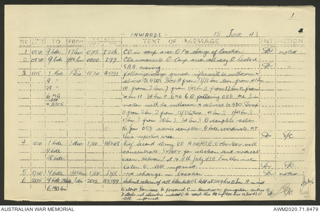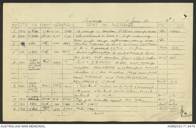 AWM52 8/2/9/25 - [Unit War Diaries, 1939-45 War] HQ 9 Australian Infantry Brigade AIF, June 1943, Message Logs
