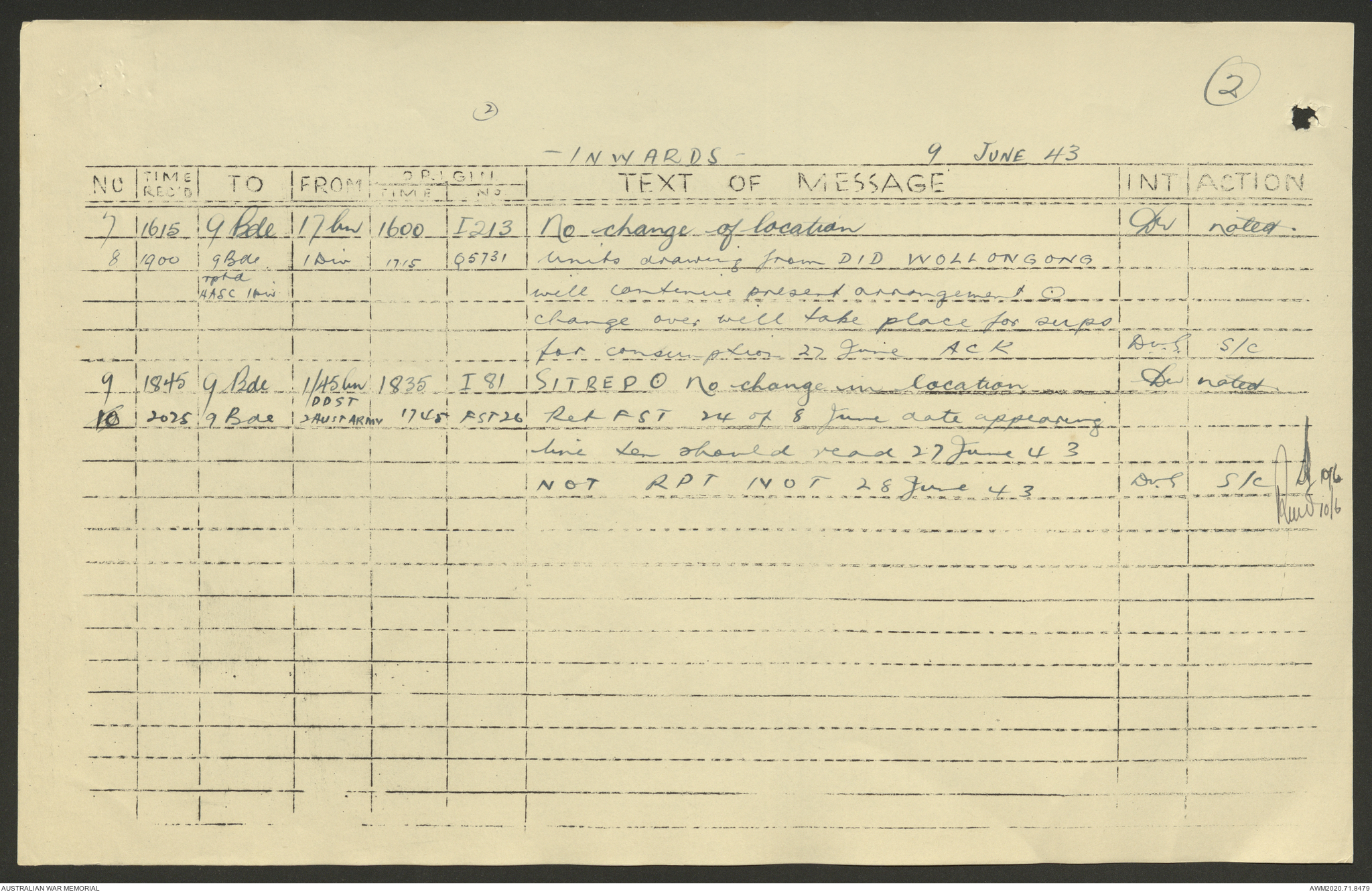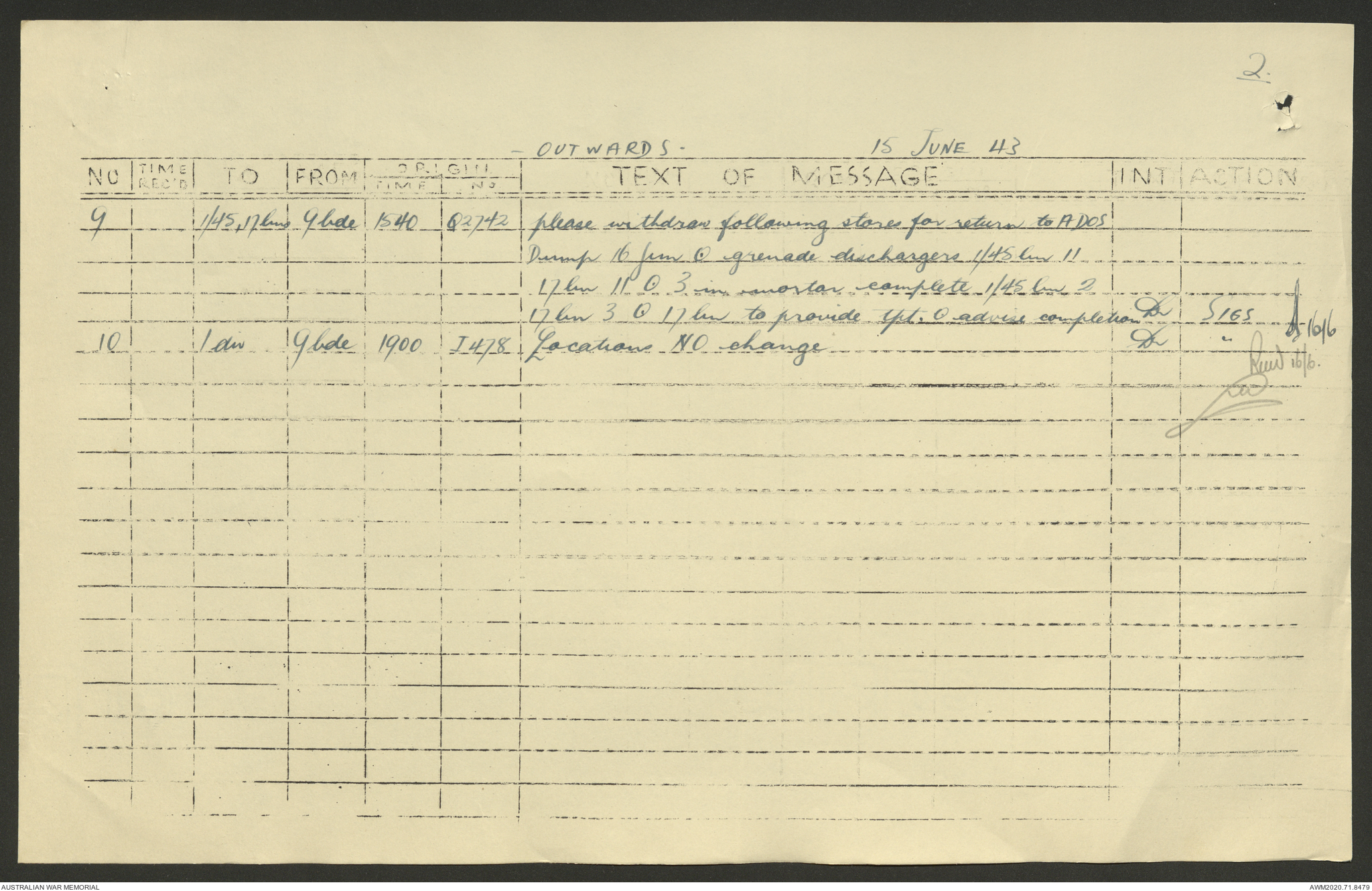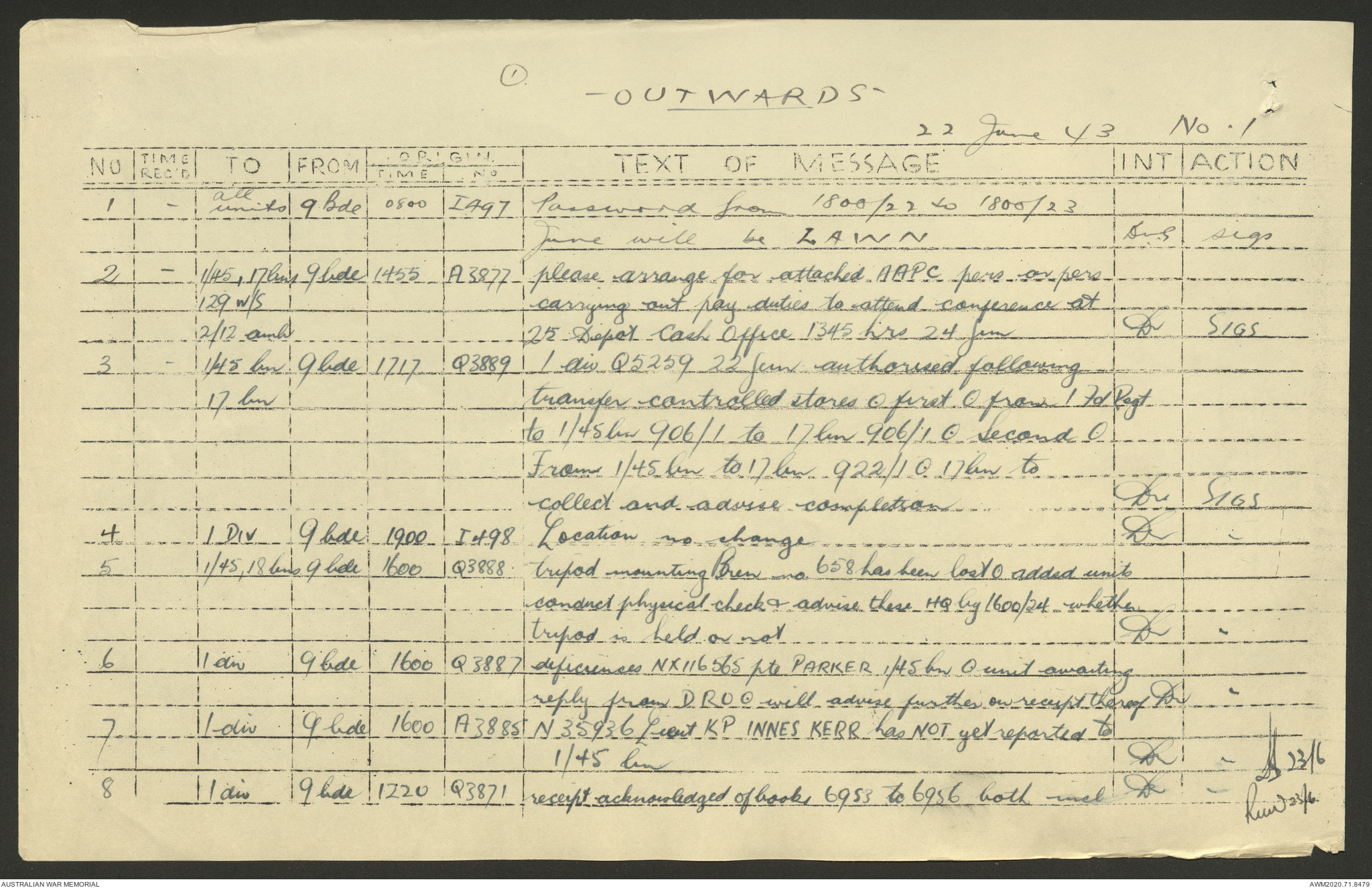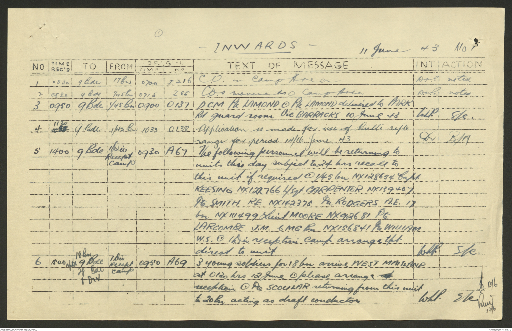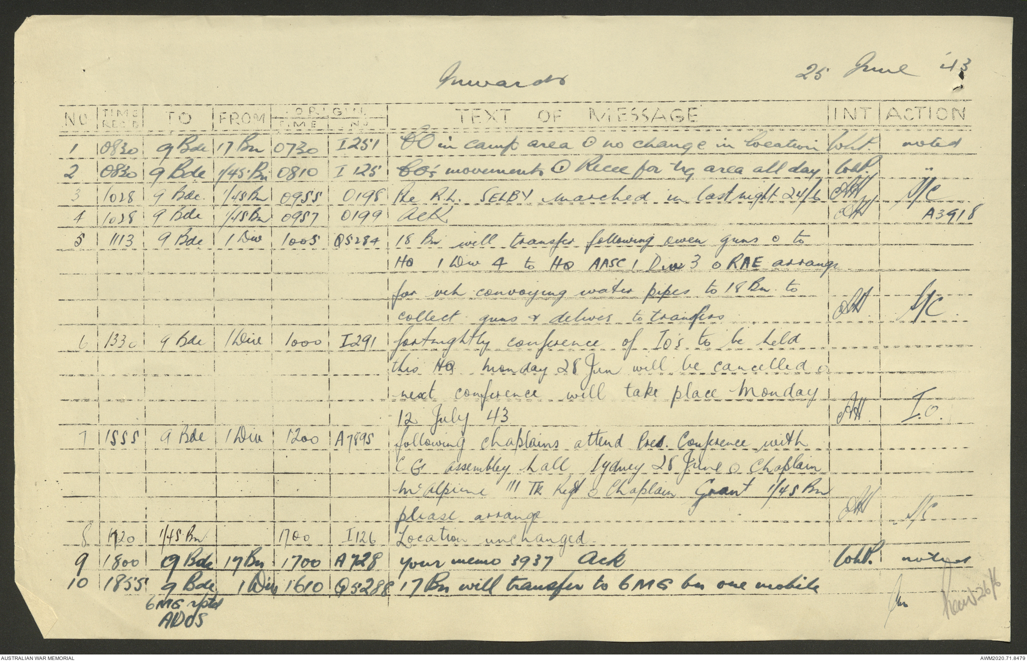 AWM52 8/2/9/25 - [Unit War Diaries, 1939-45 War] HQ 9 Australian Infantry Brigade AIF, June 1943, Message Logs