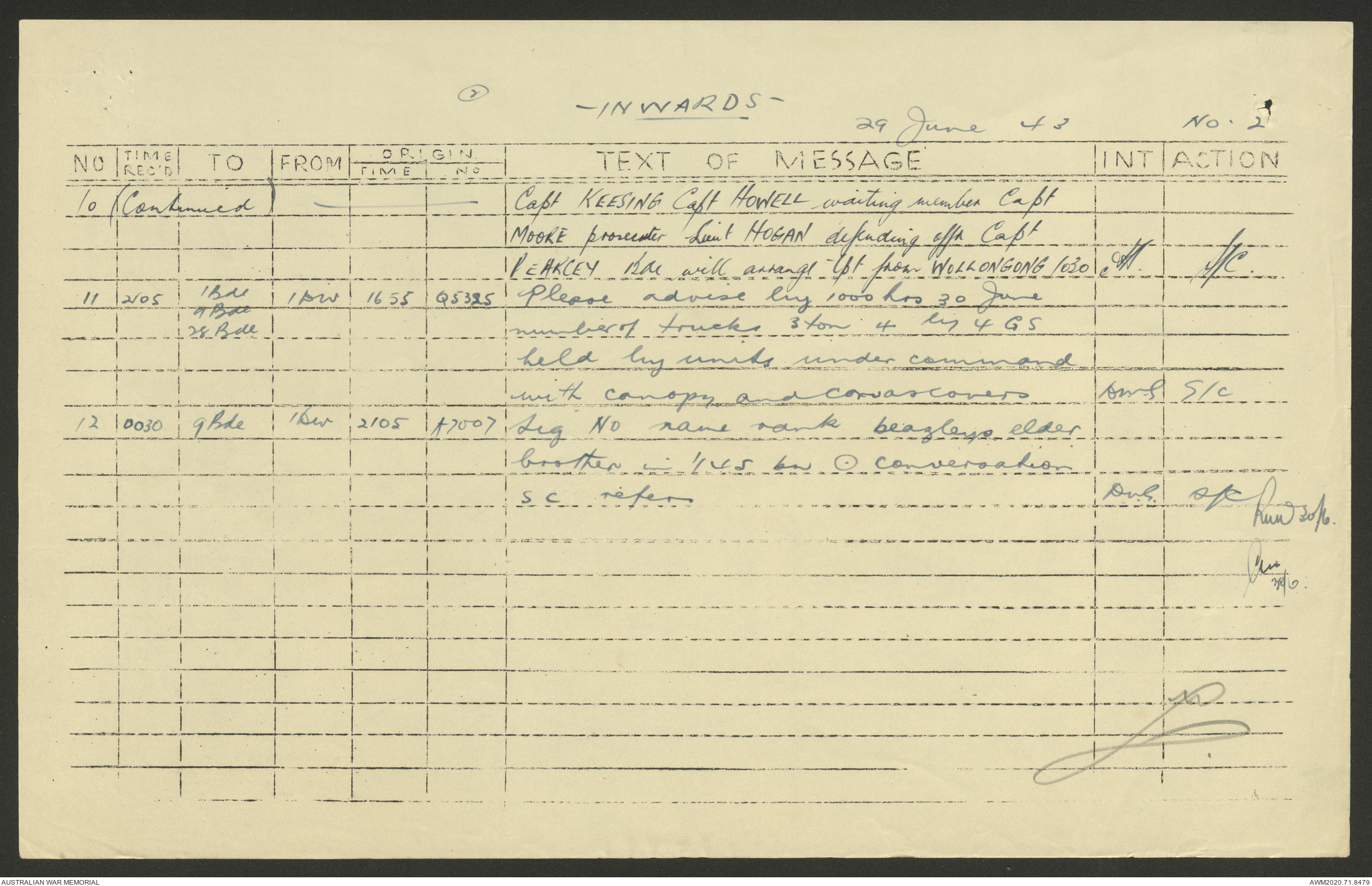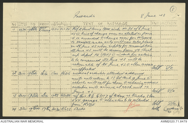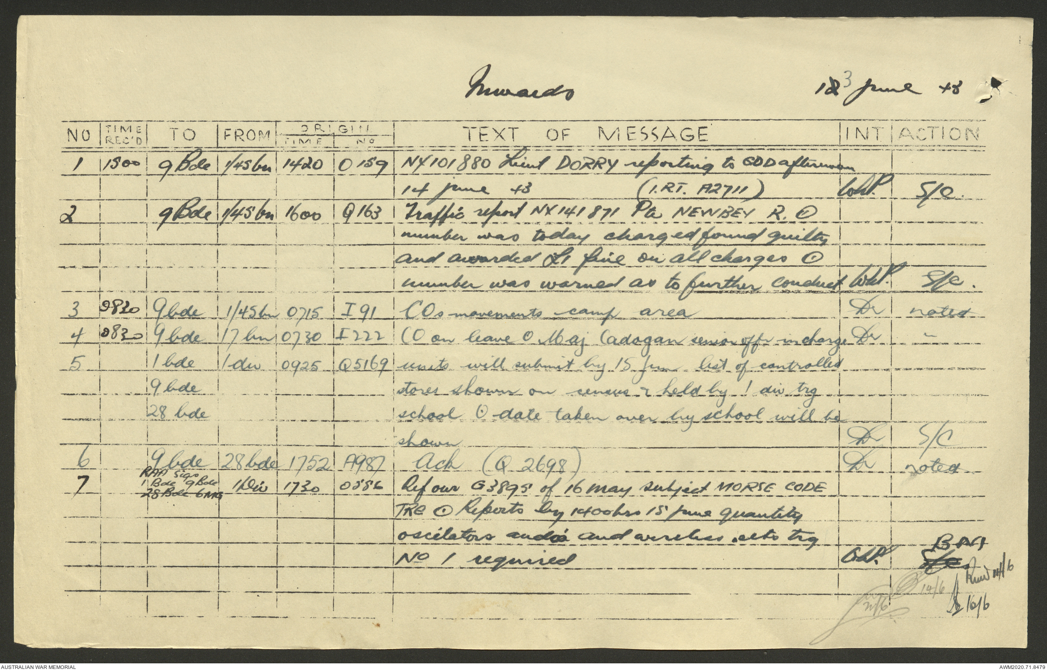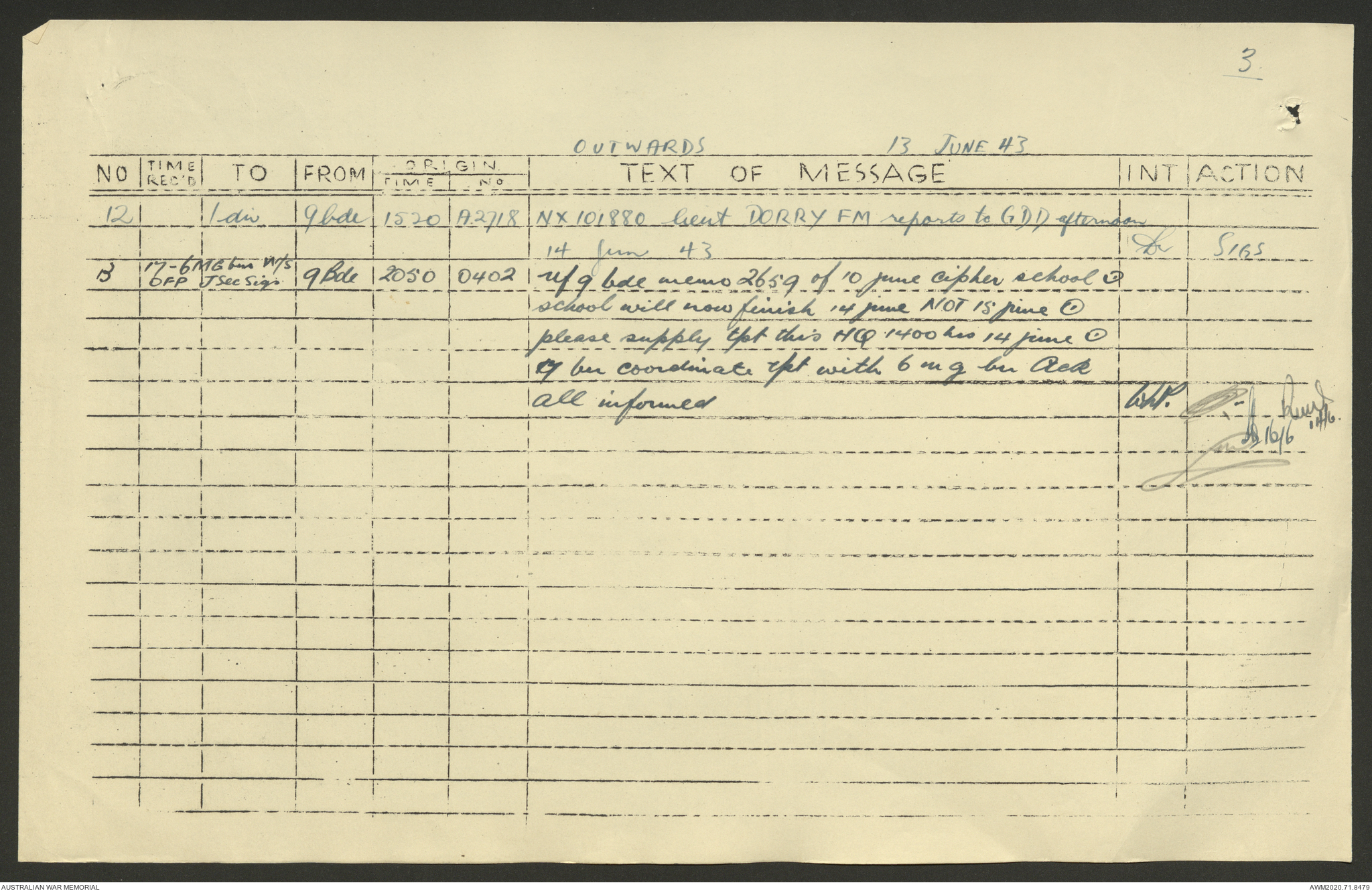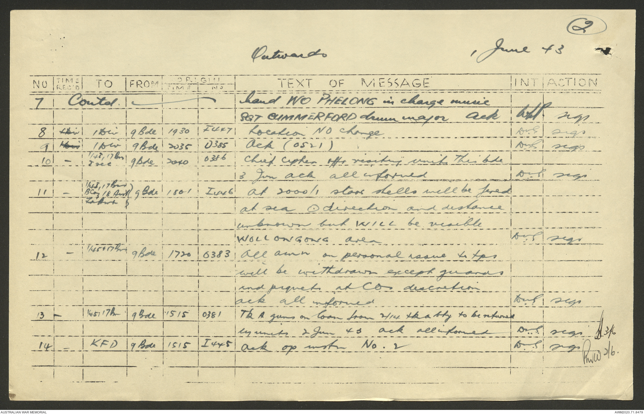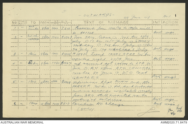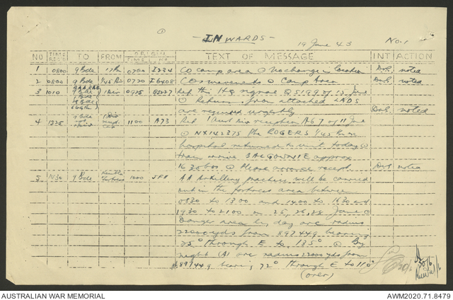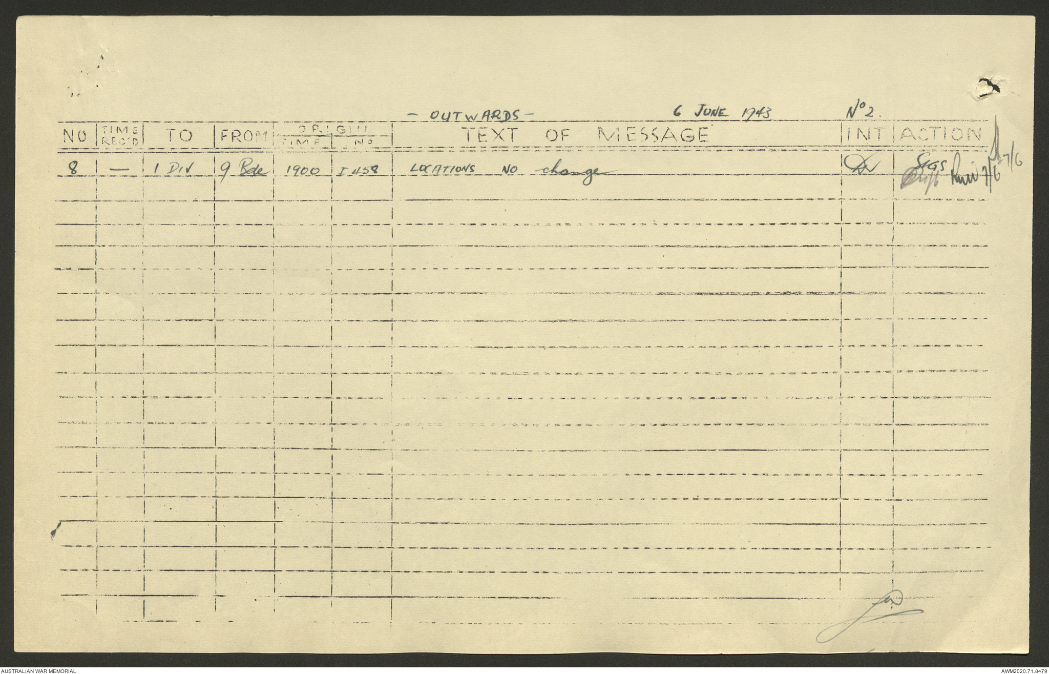 AWM52 8/2/9/25 - [Unit War Diaries, 1939-45 War] HQ 9 Australian Infantry Brigade AIF, June 1943, Message Logs
