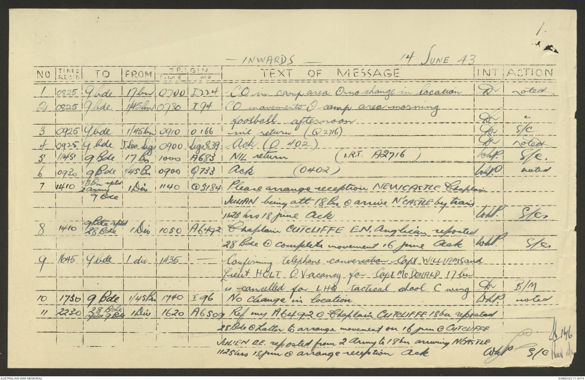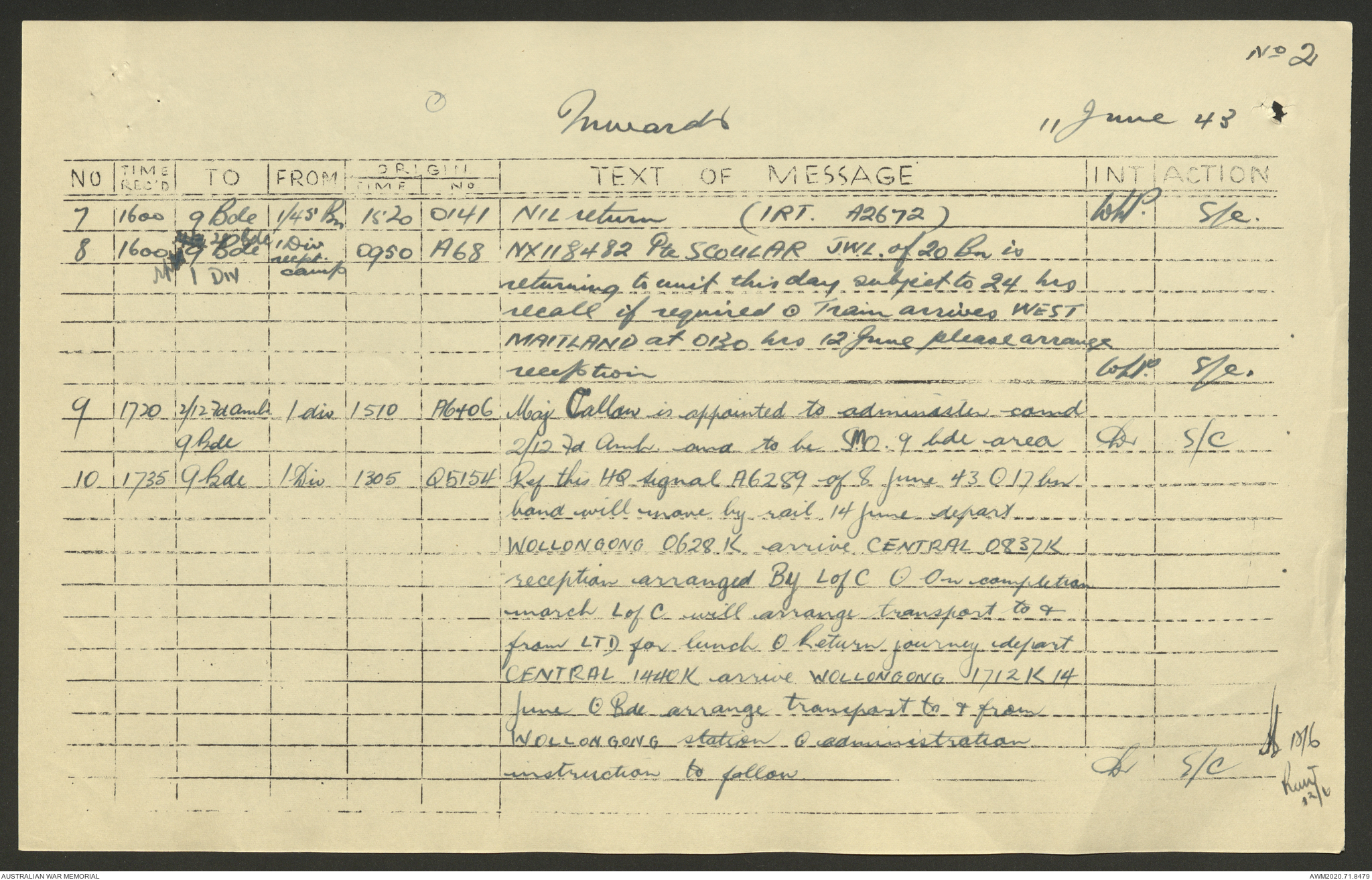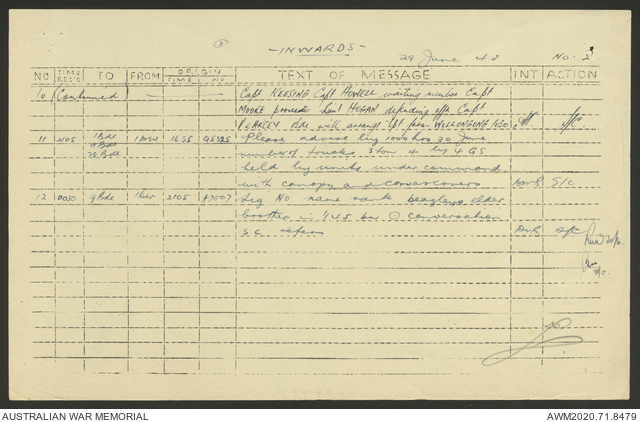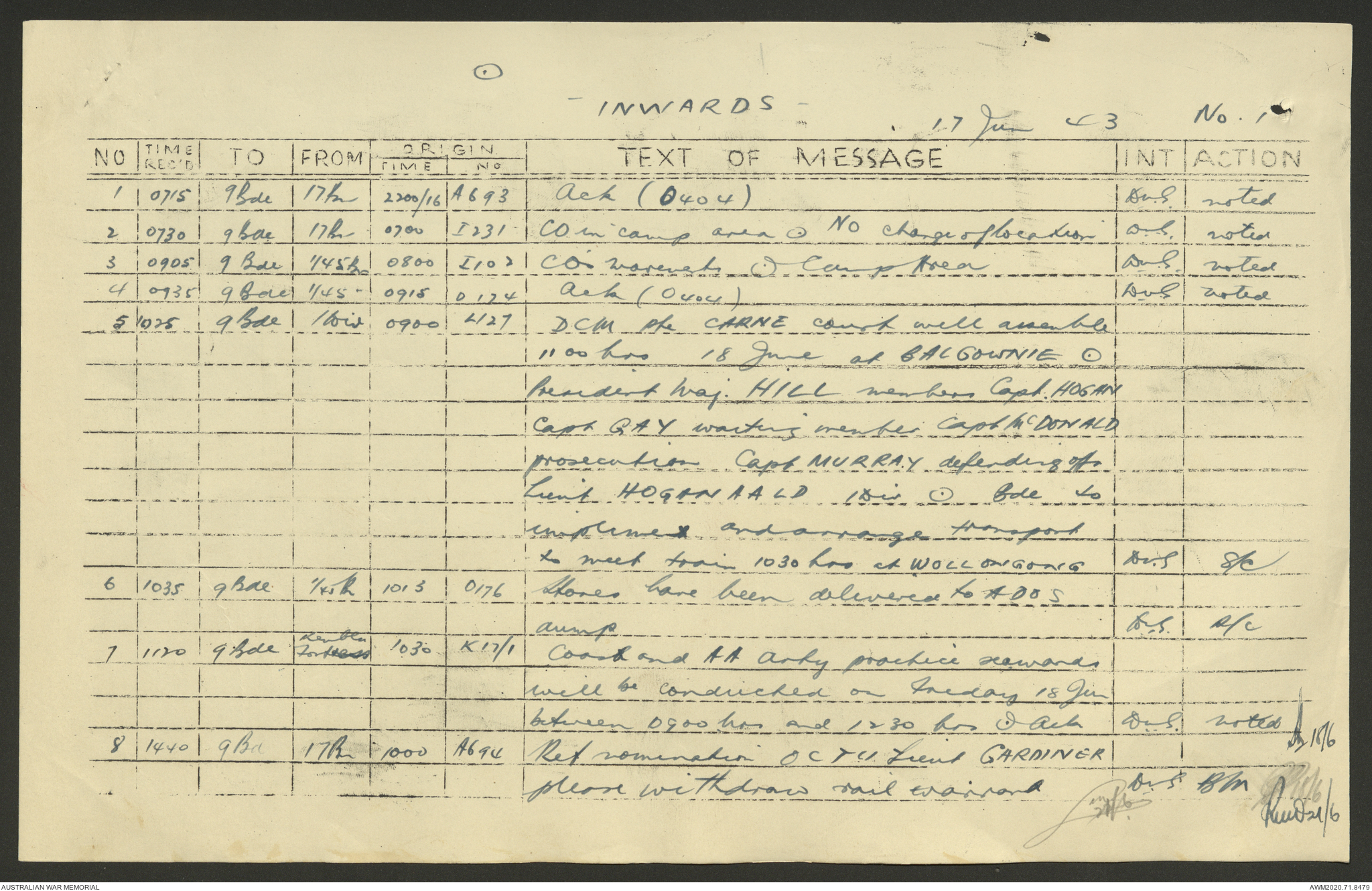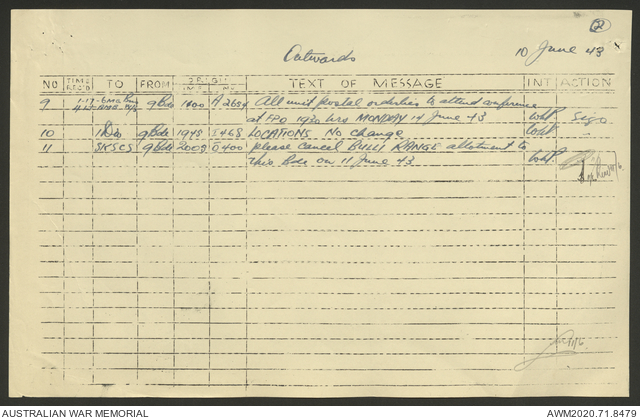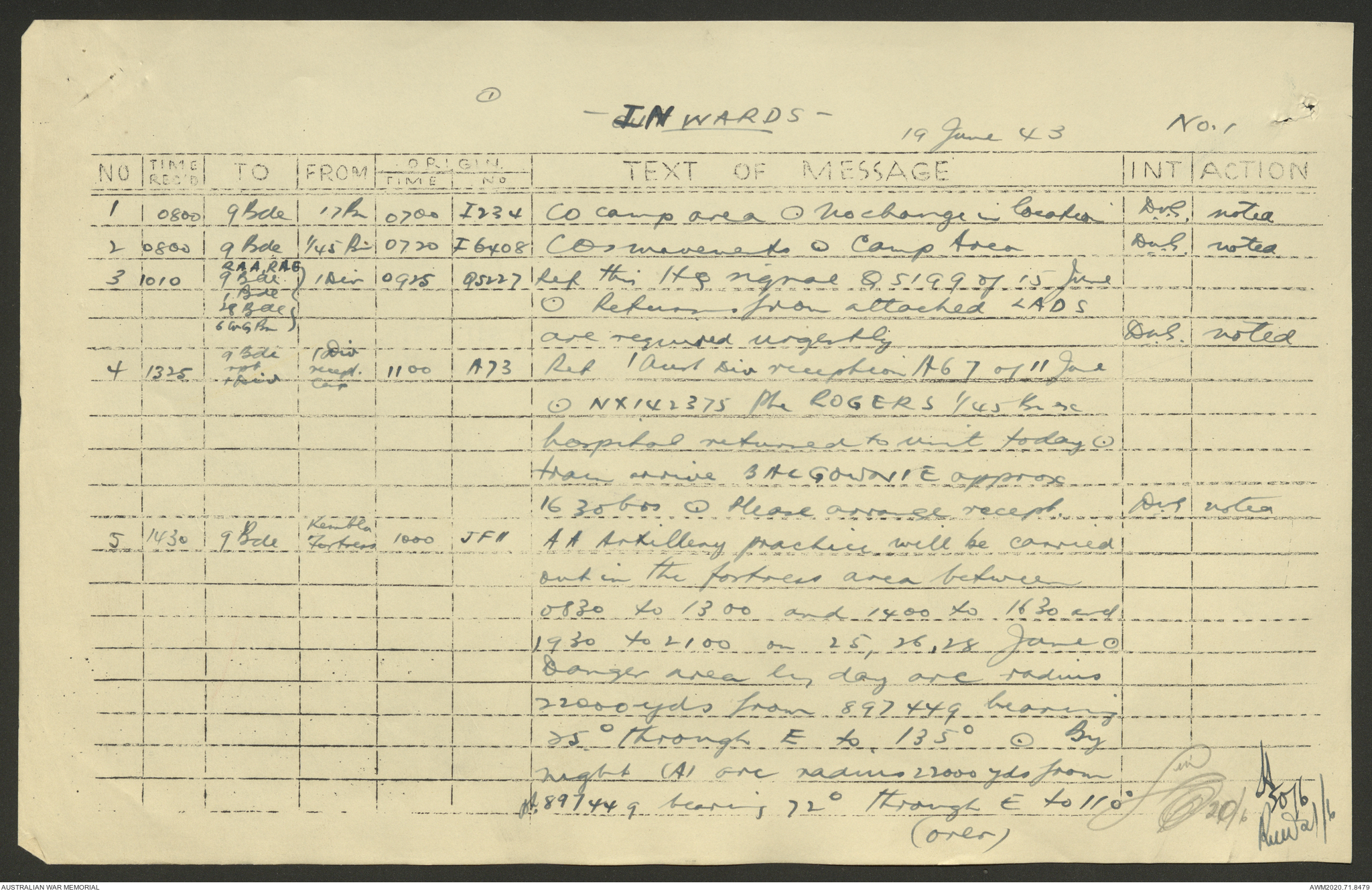 AWM52 8/2/9/25 - [Unit War Diaries, 1939-45 War] HQ 9 Australian Infantry Brigade AIF, June 1943, Message Logs