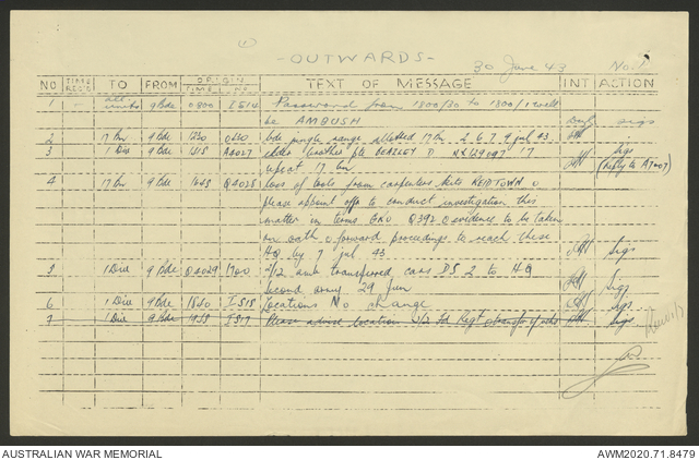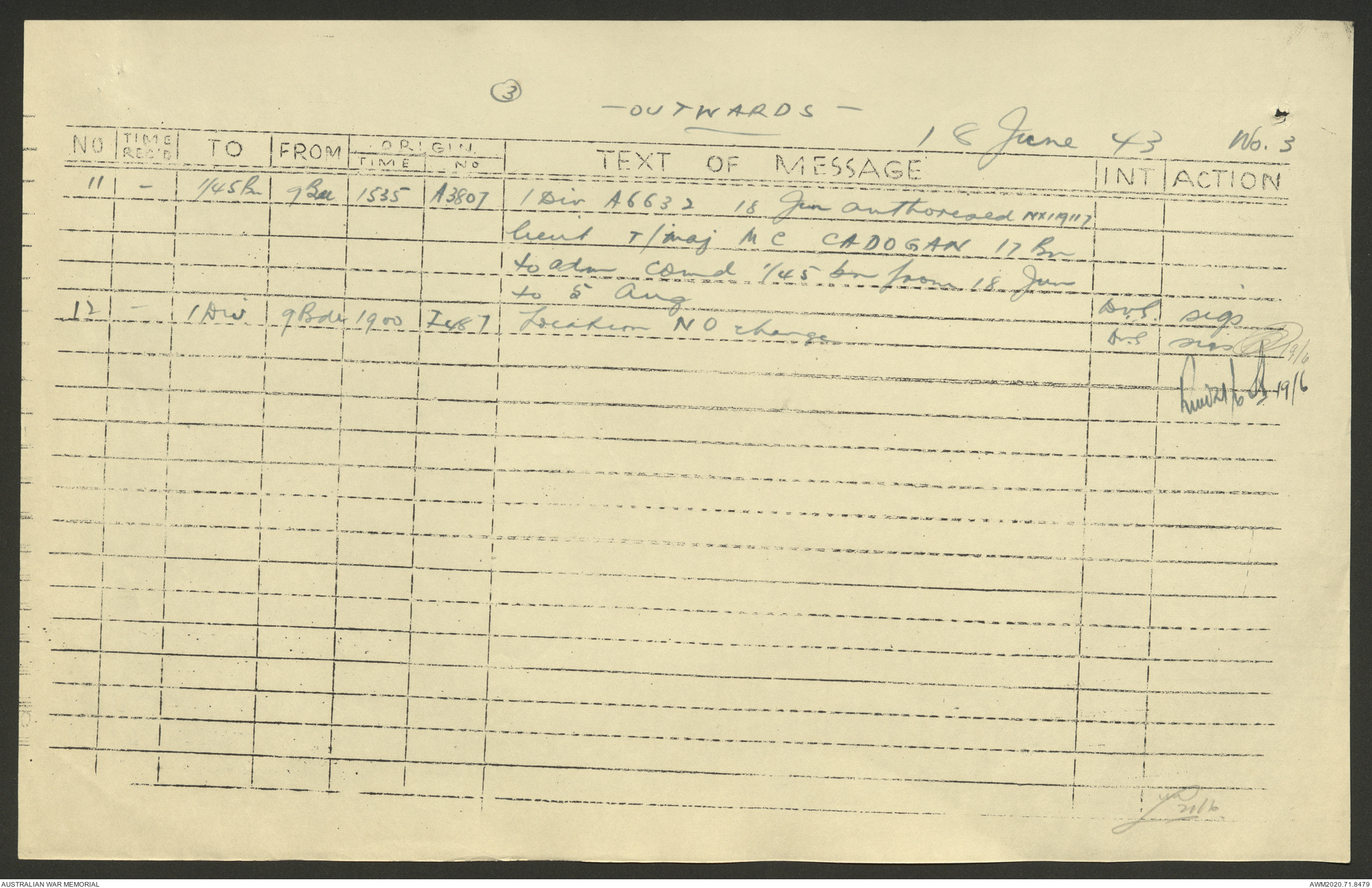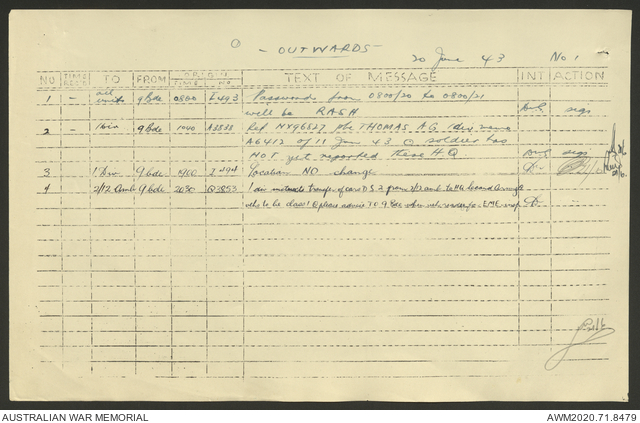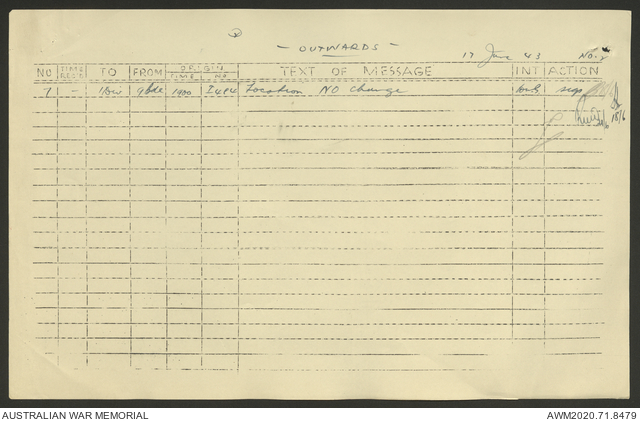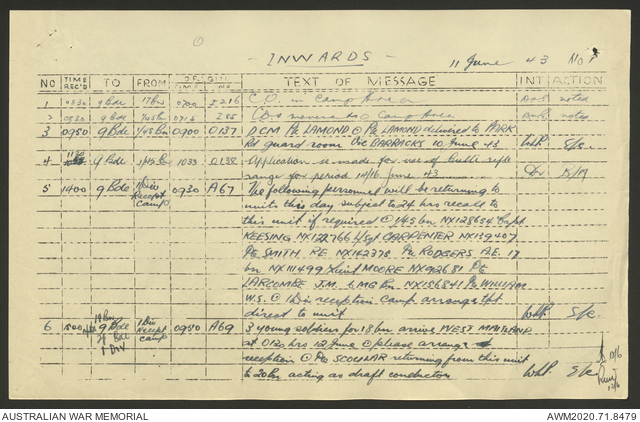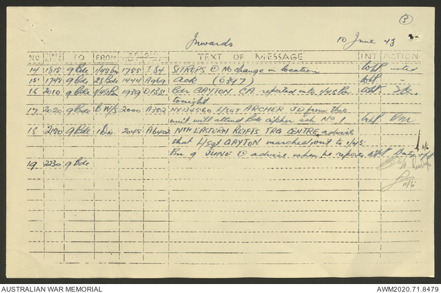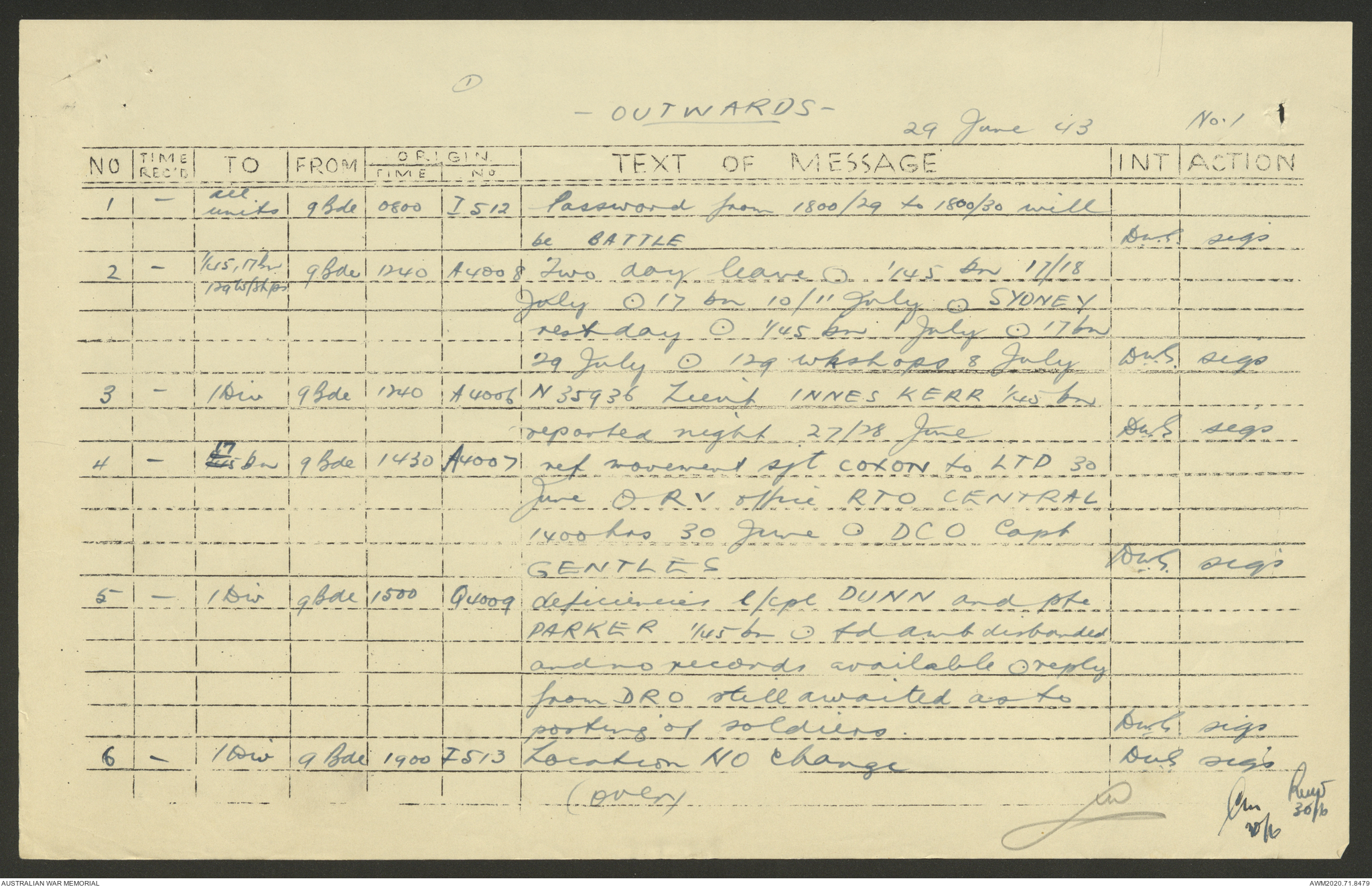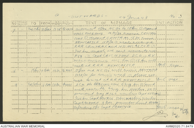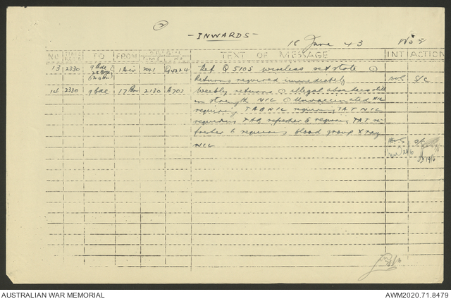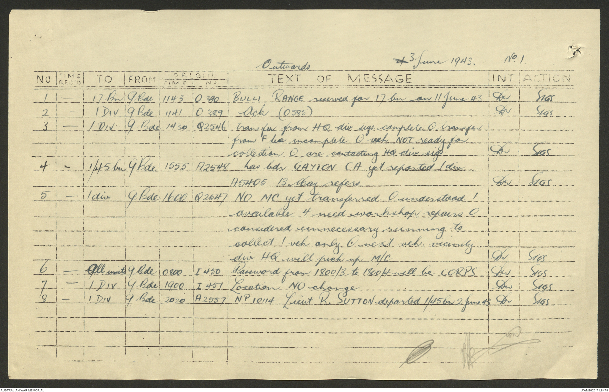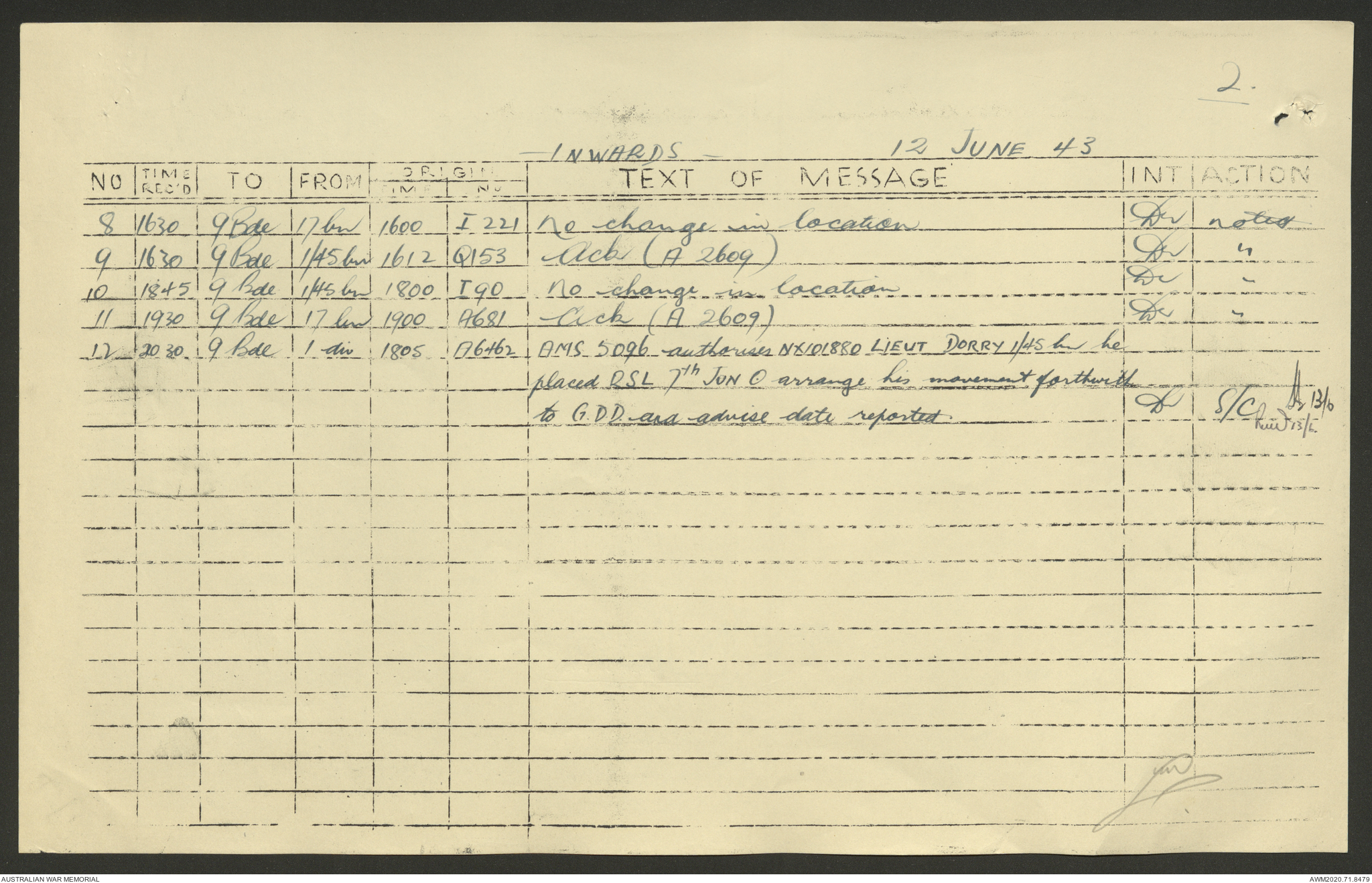 AWM52 8/2/9/25 - [Unit War Diaries, 1939-45 War] HQ 9 Australian Infantry Brigade AIF, June 1943, Message Logs