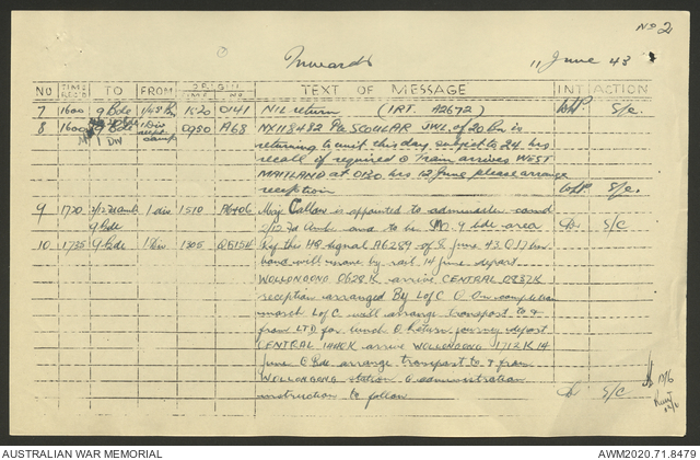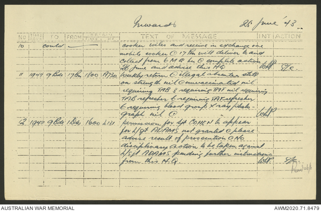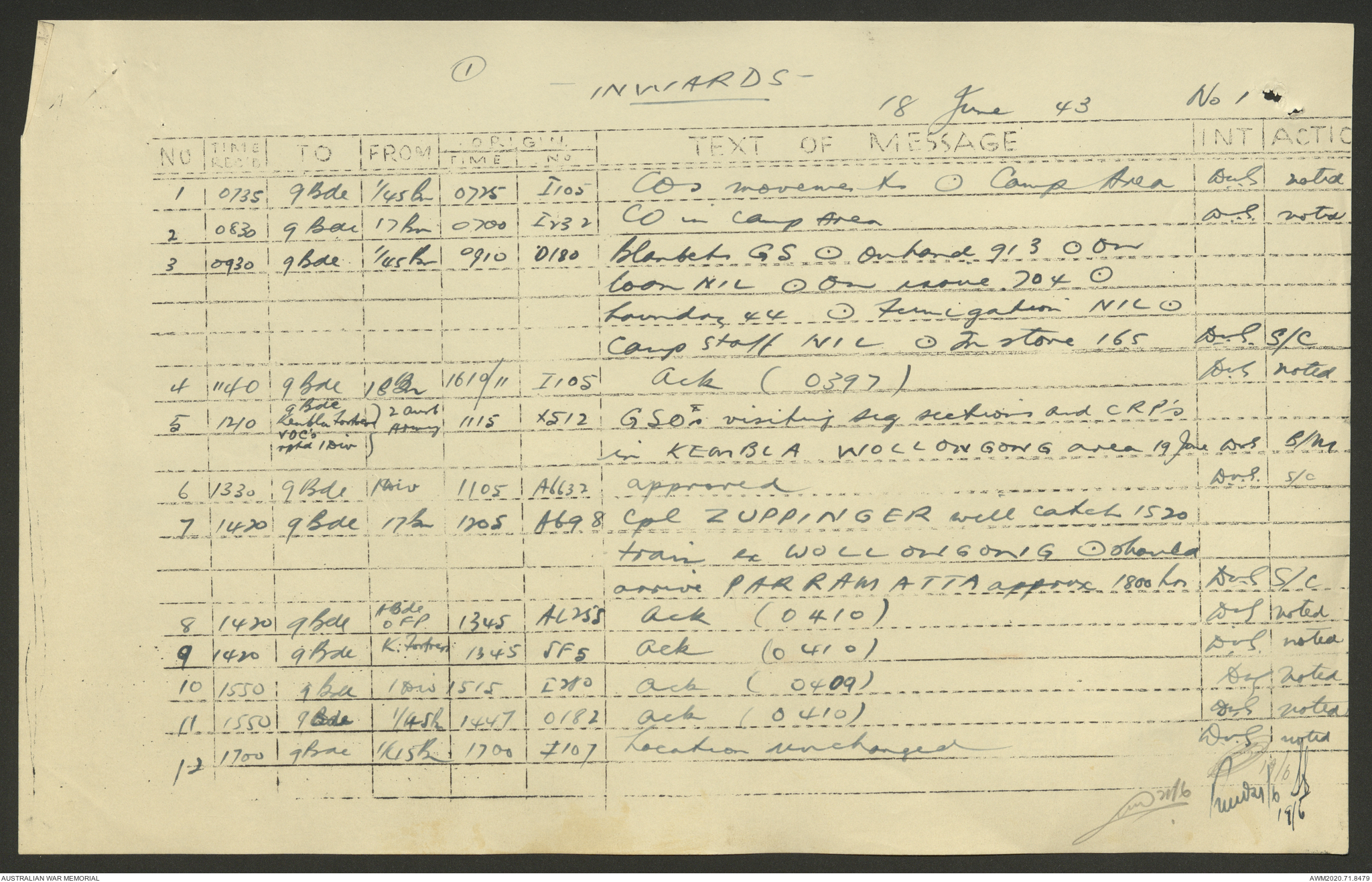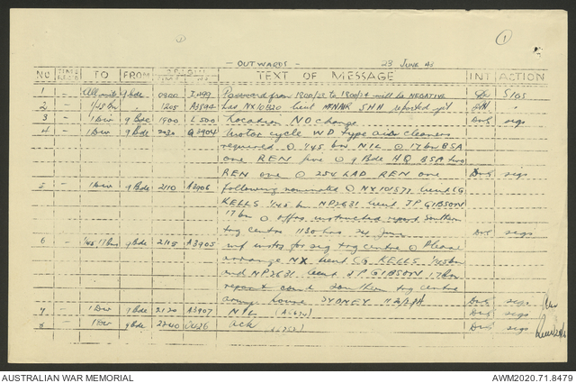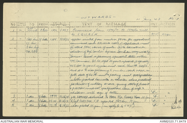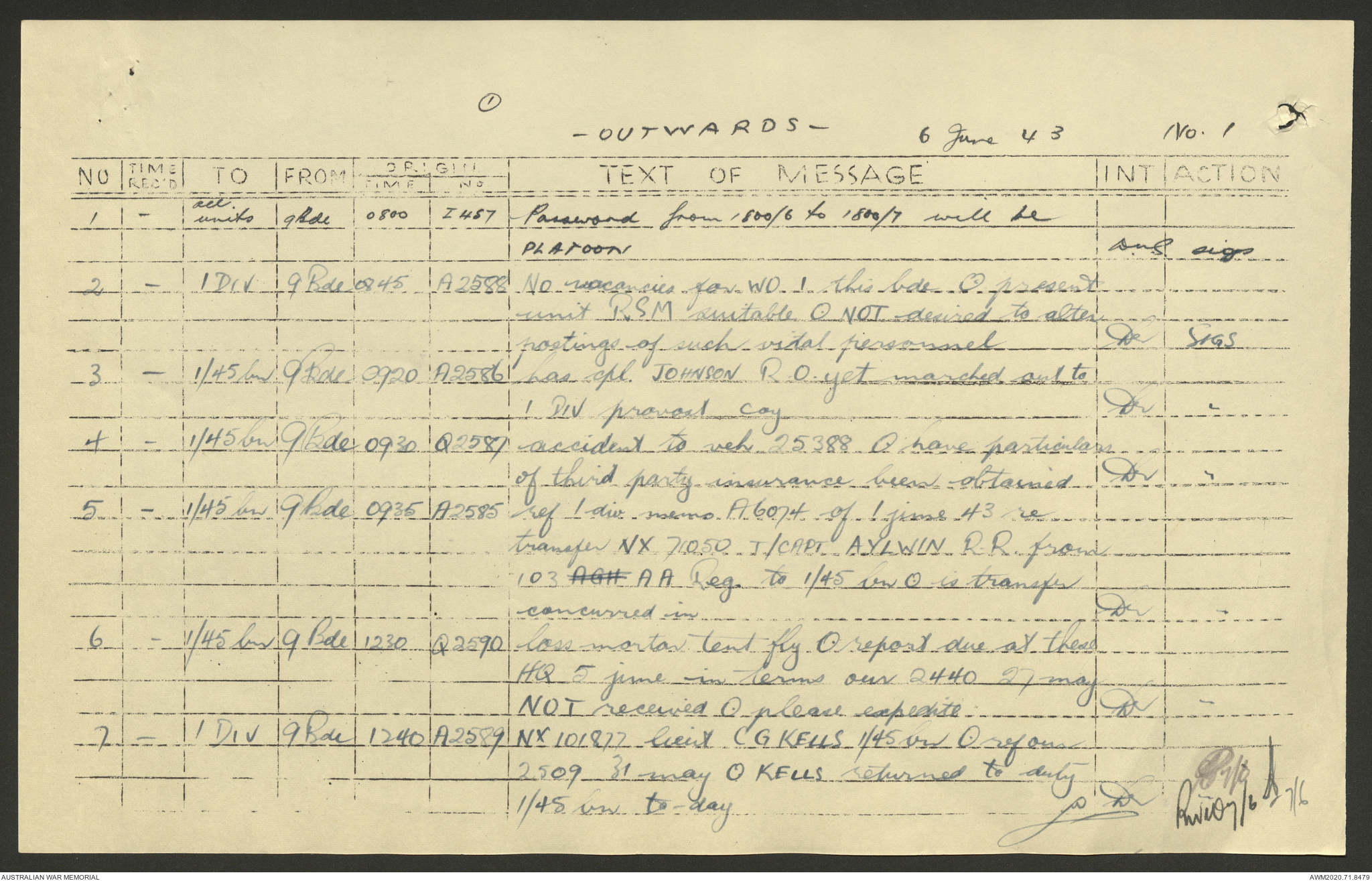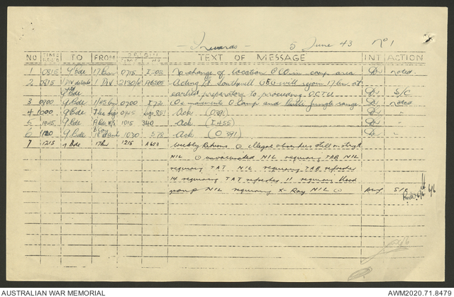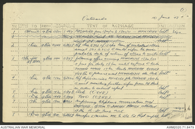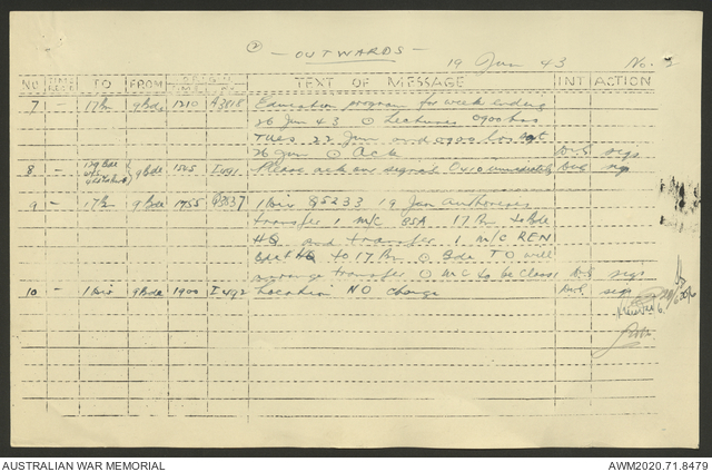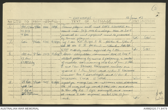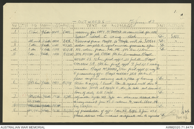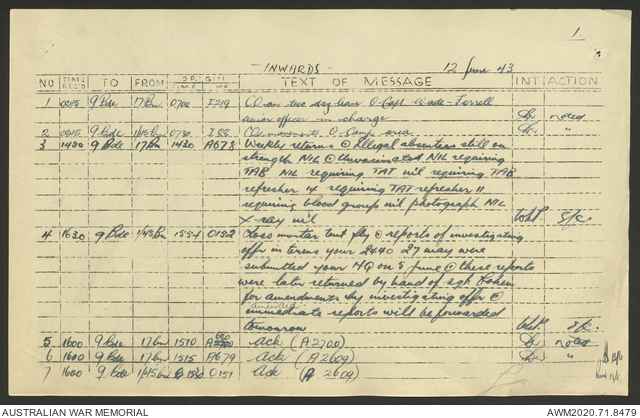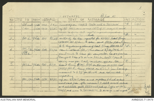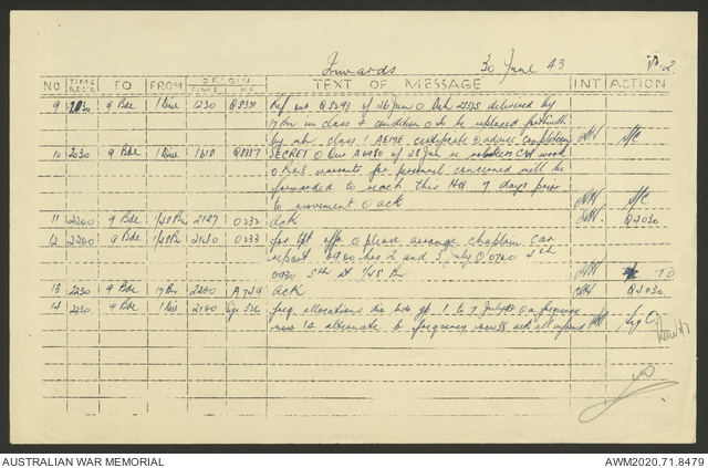 AWM52 8/2/9/25 - [Unit War Diaries, 1939-45 War] HQ 9 Australian Infantry Brigade AIF, June 1943, Message Logs