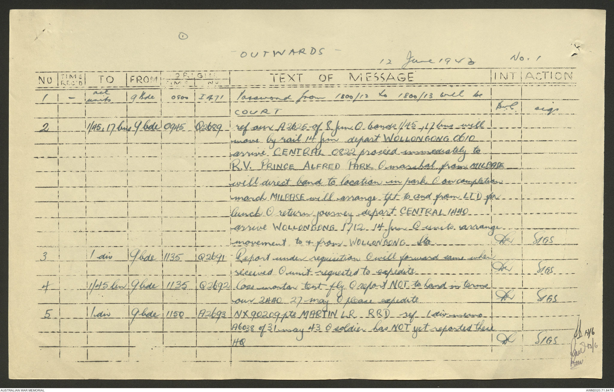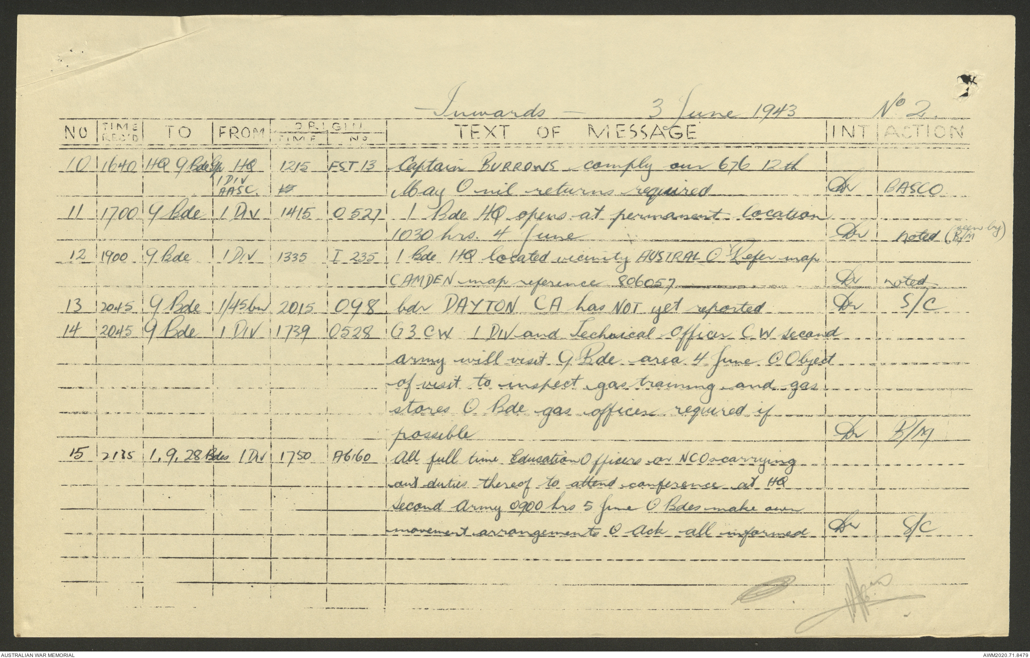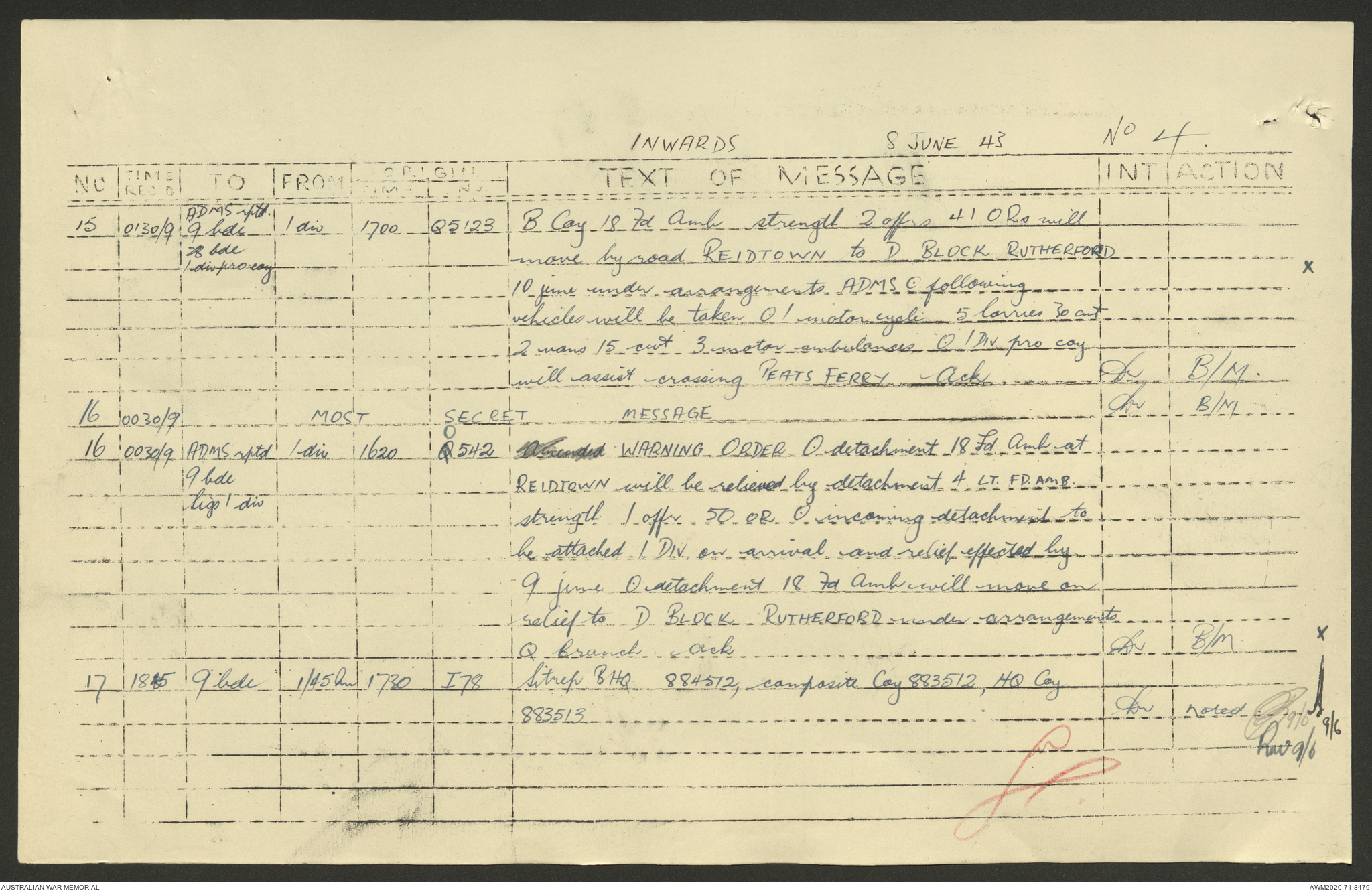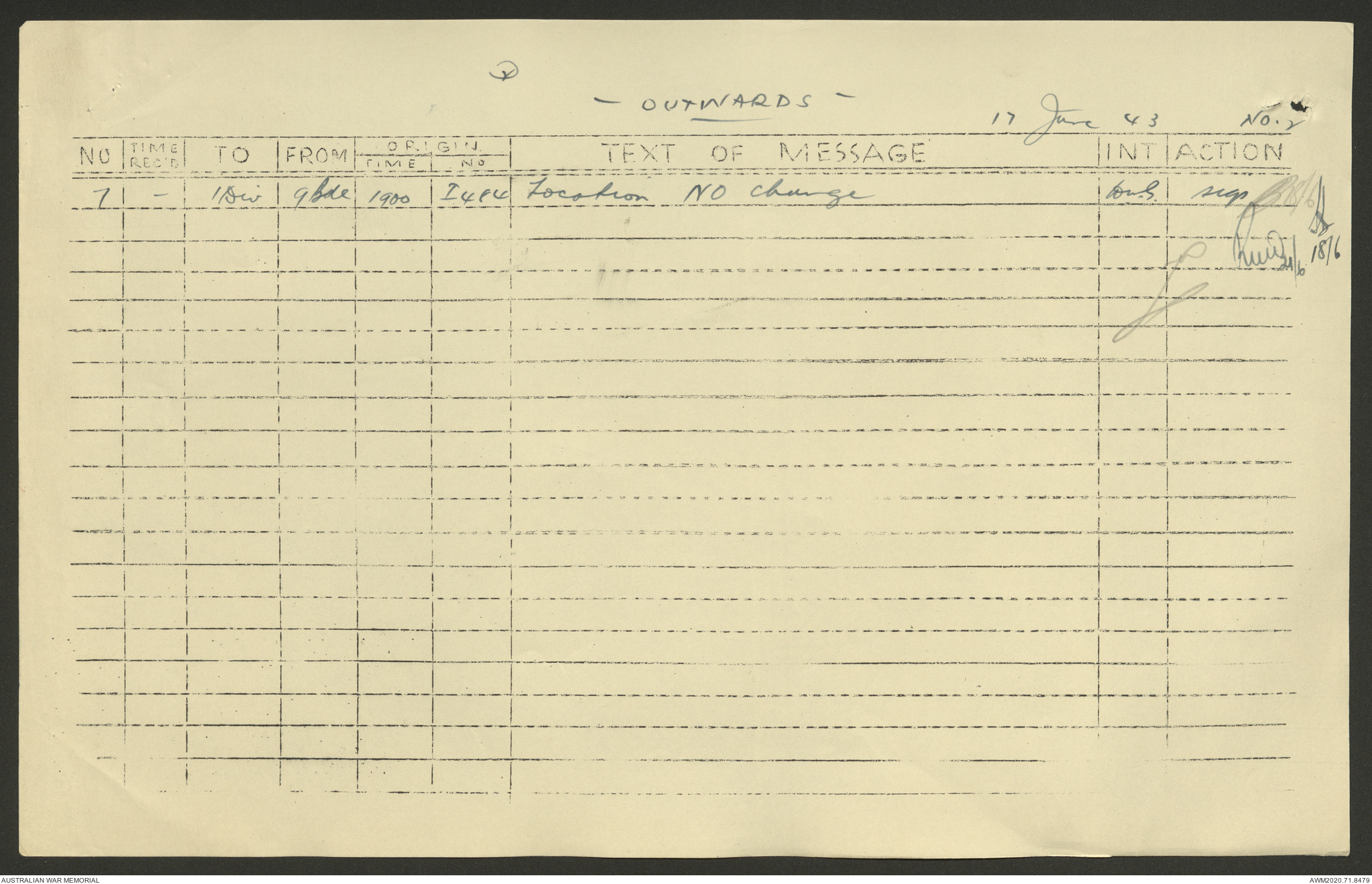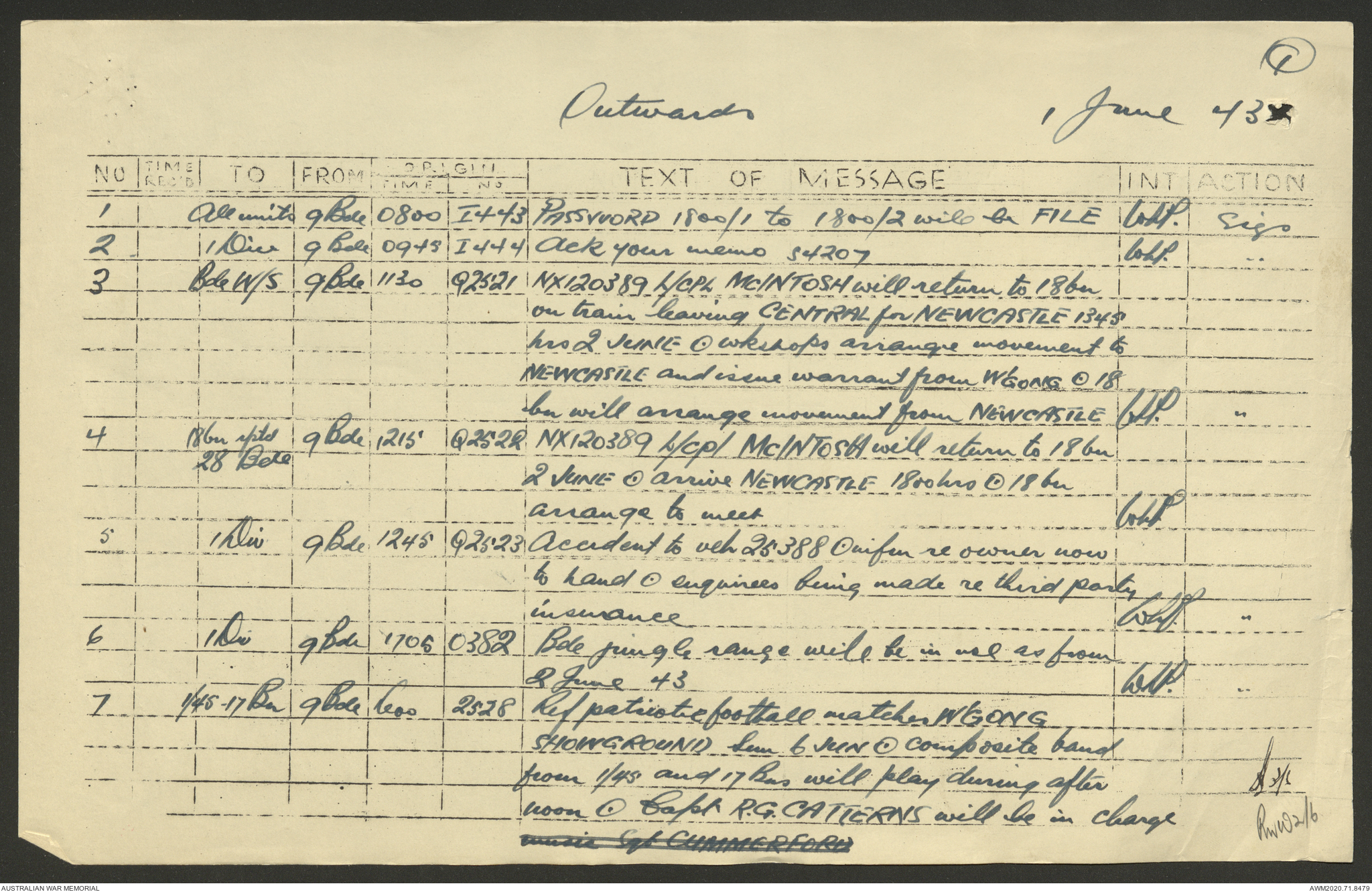 AWM52 8/2/9/25 - [Unit War Diaries, 1939-45 War] HQ 9 Australian Infantry Brigade AIF, June 1943, Message Logs