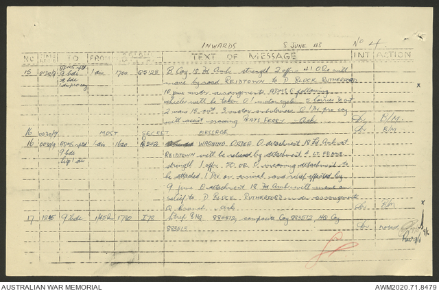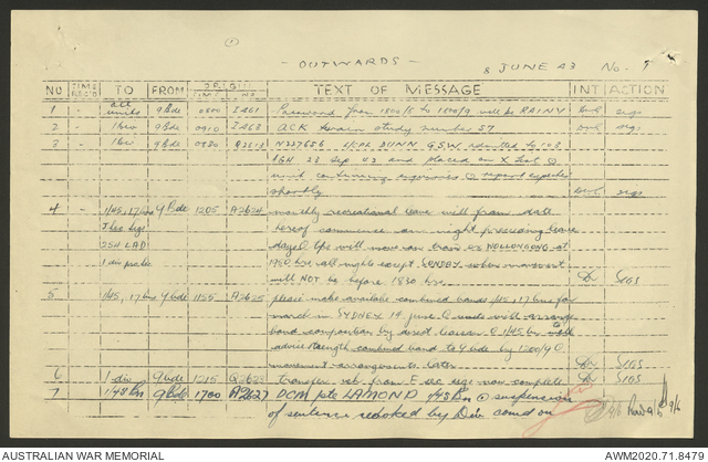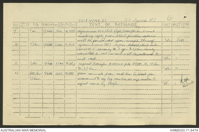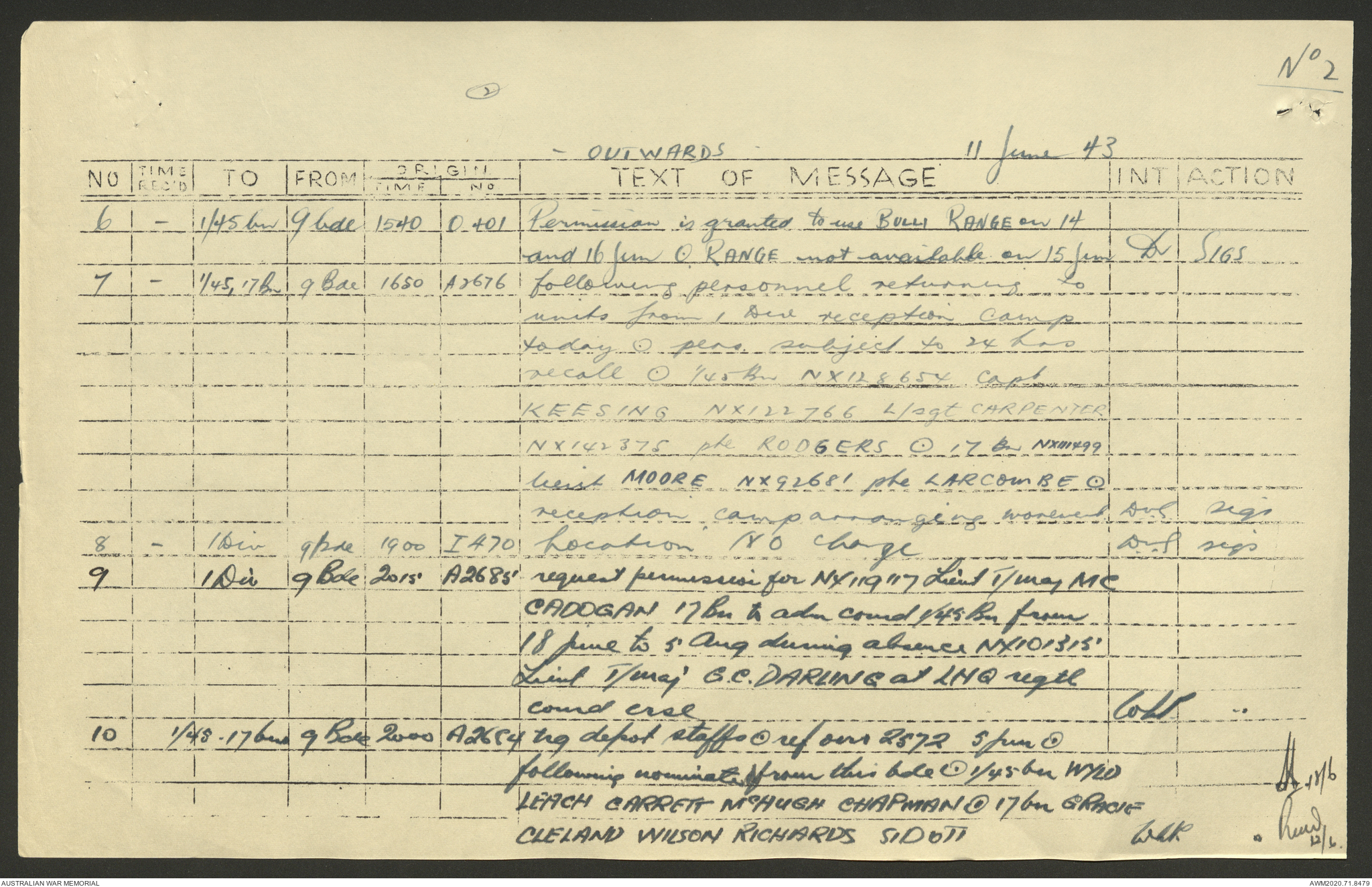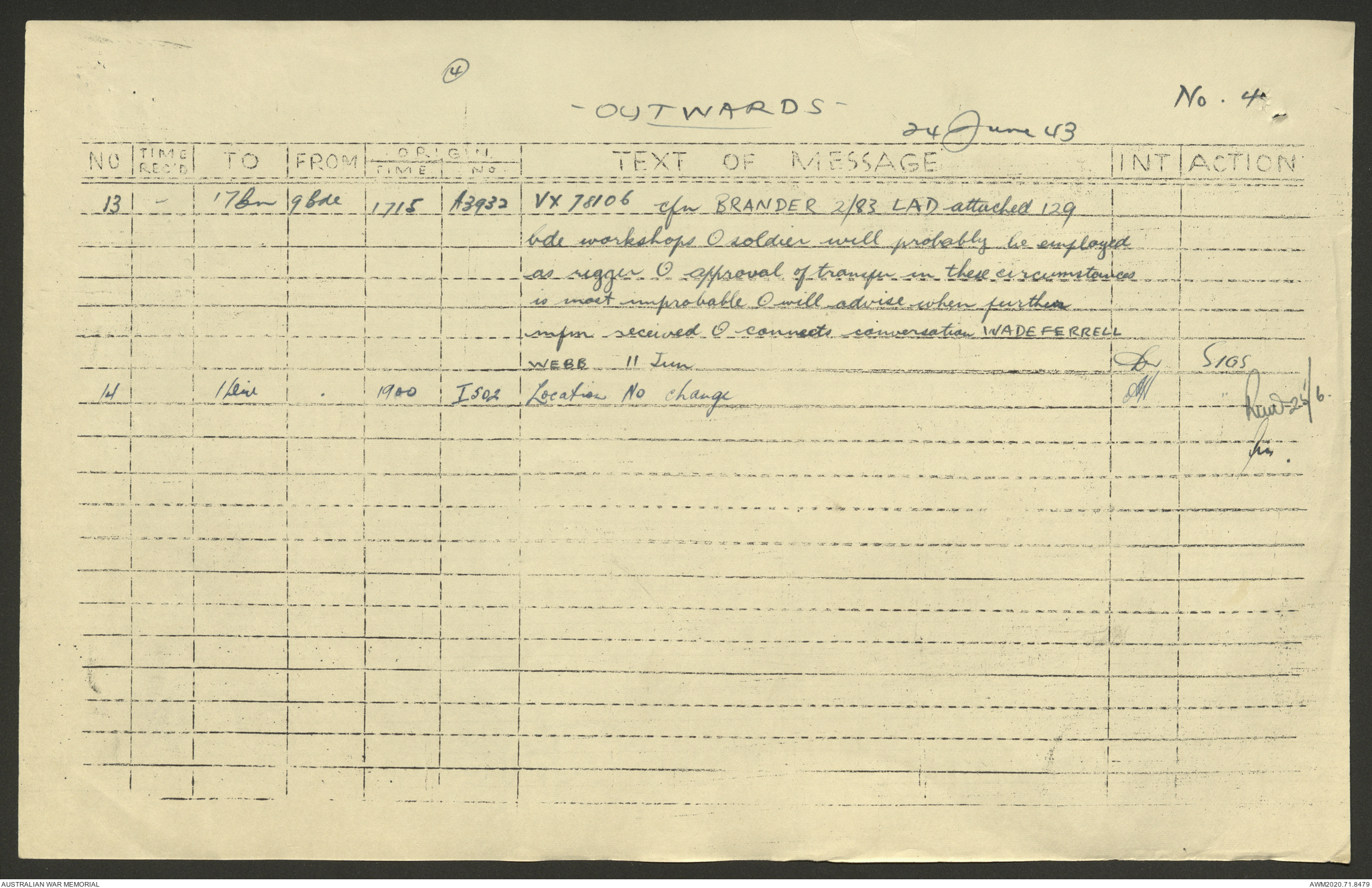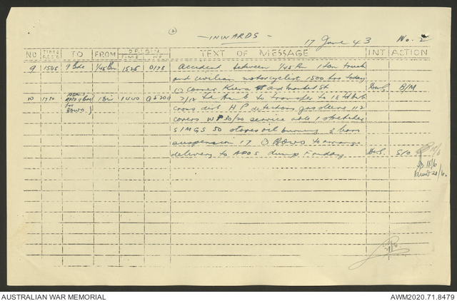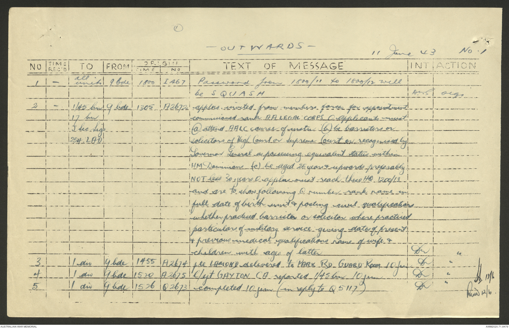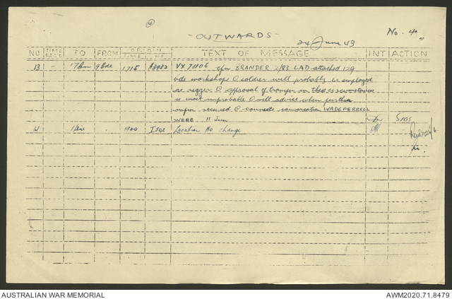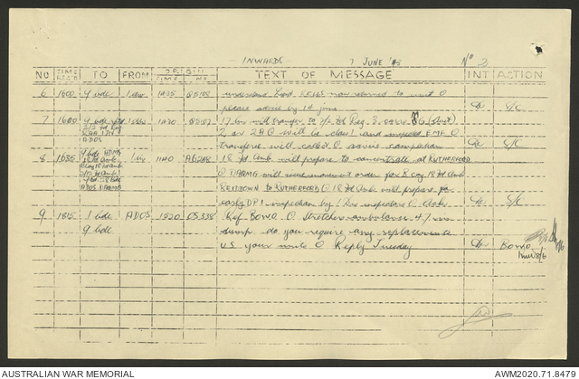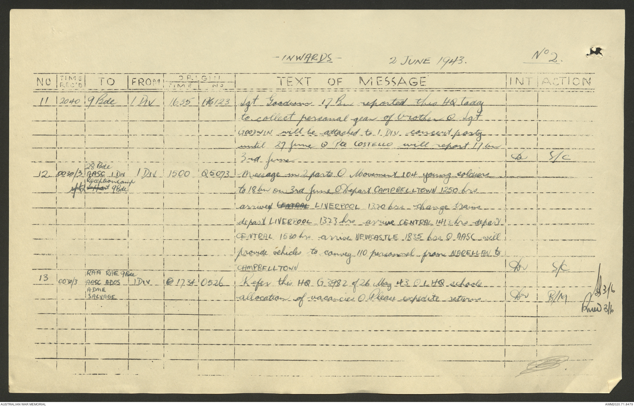 AWM52 8/2/9/25 - [Unit War Diaries, 1939-45 War] HQ 9 Australian Infantry Brigade AIF, June 1943, Message Logs