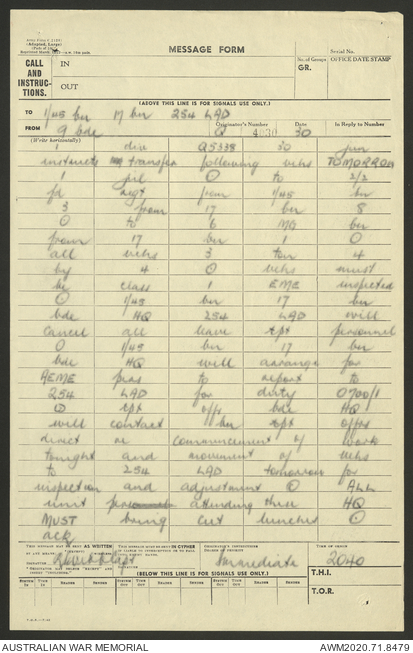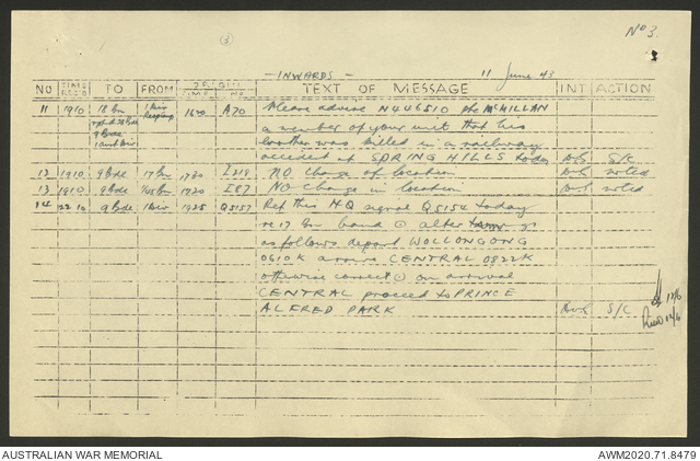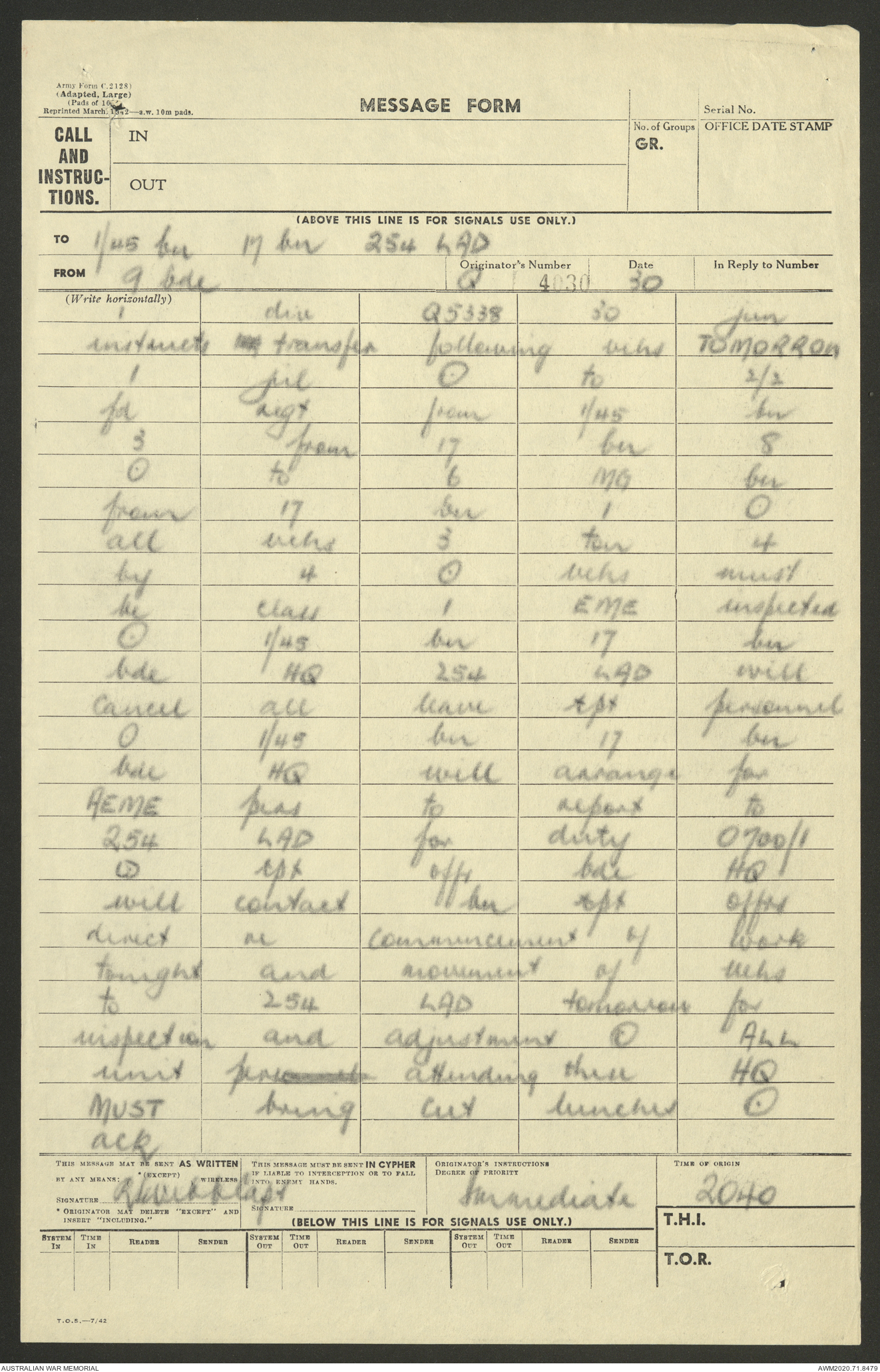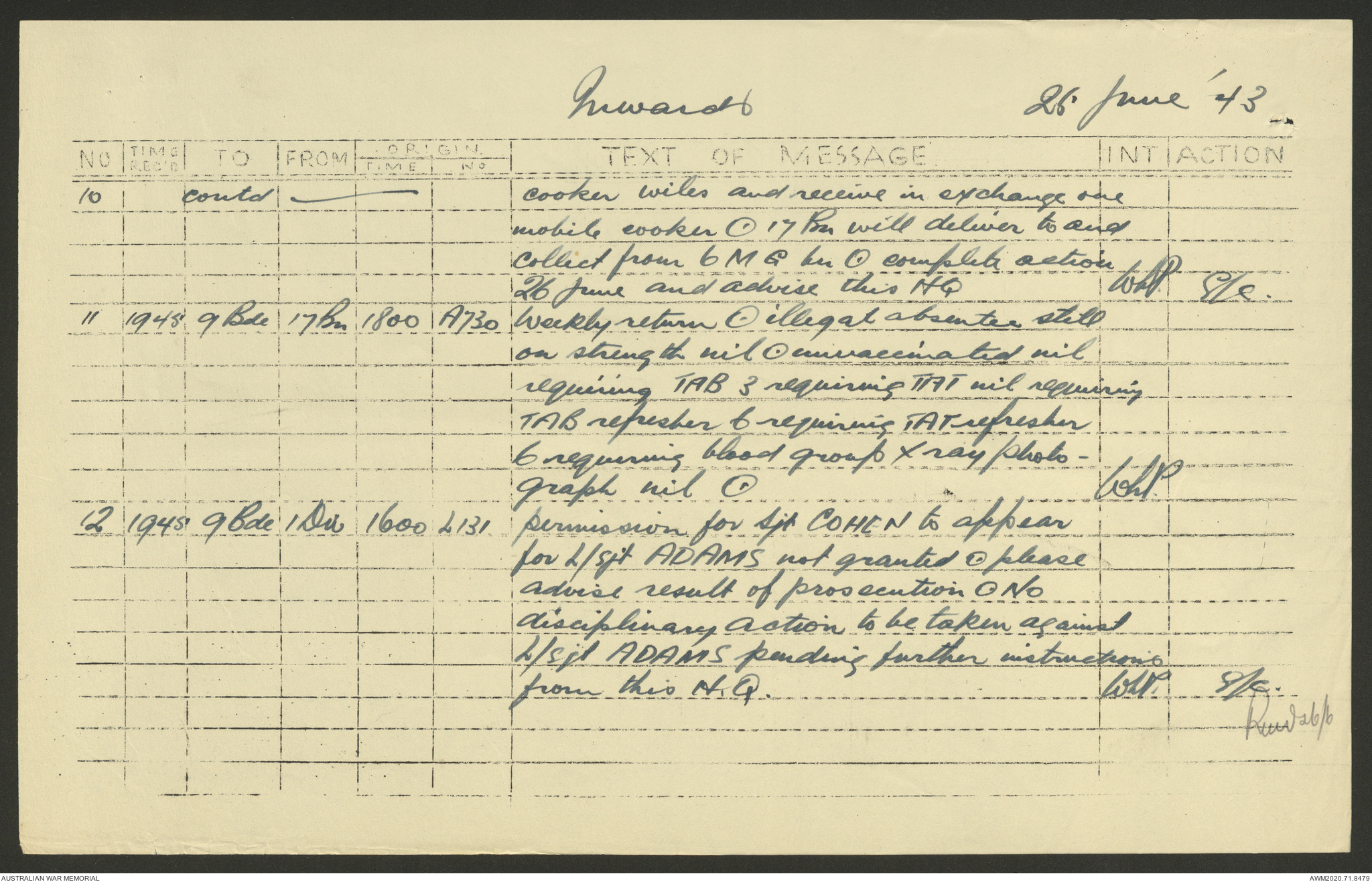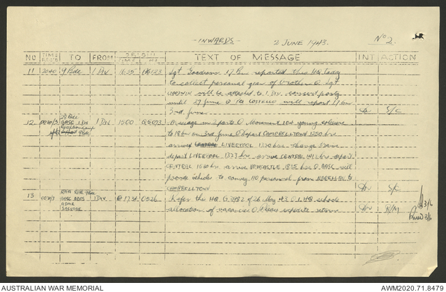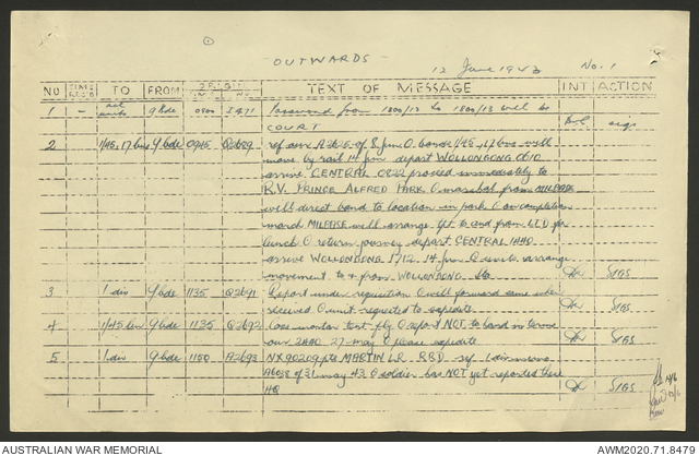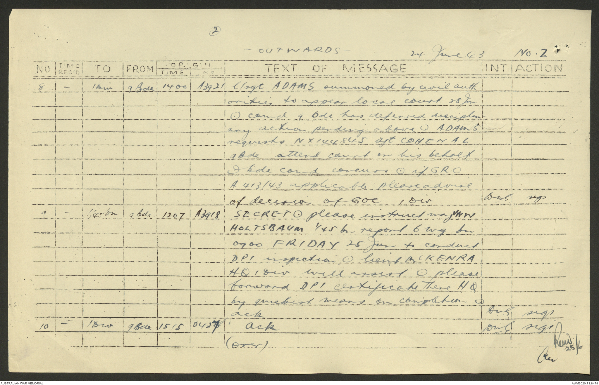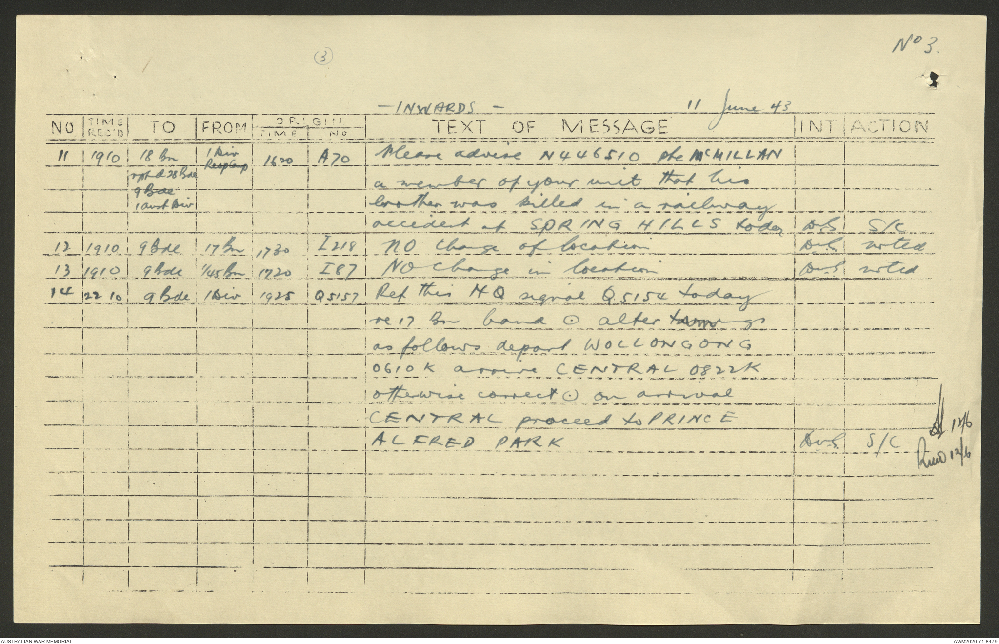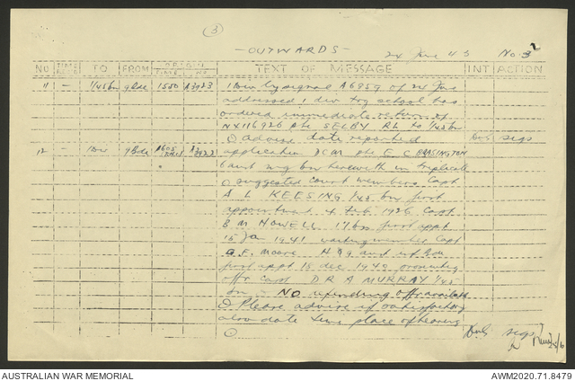 AWM52 8/2/9/25 - [Unit War Diaries, 1939-45 War] HQ 9 Australian Infantry Brigade AIF, June 1943, Message Logs
