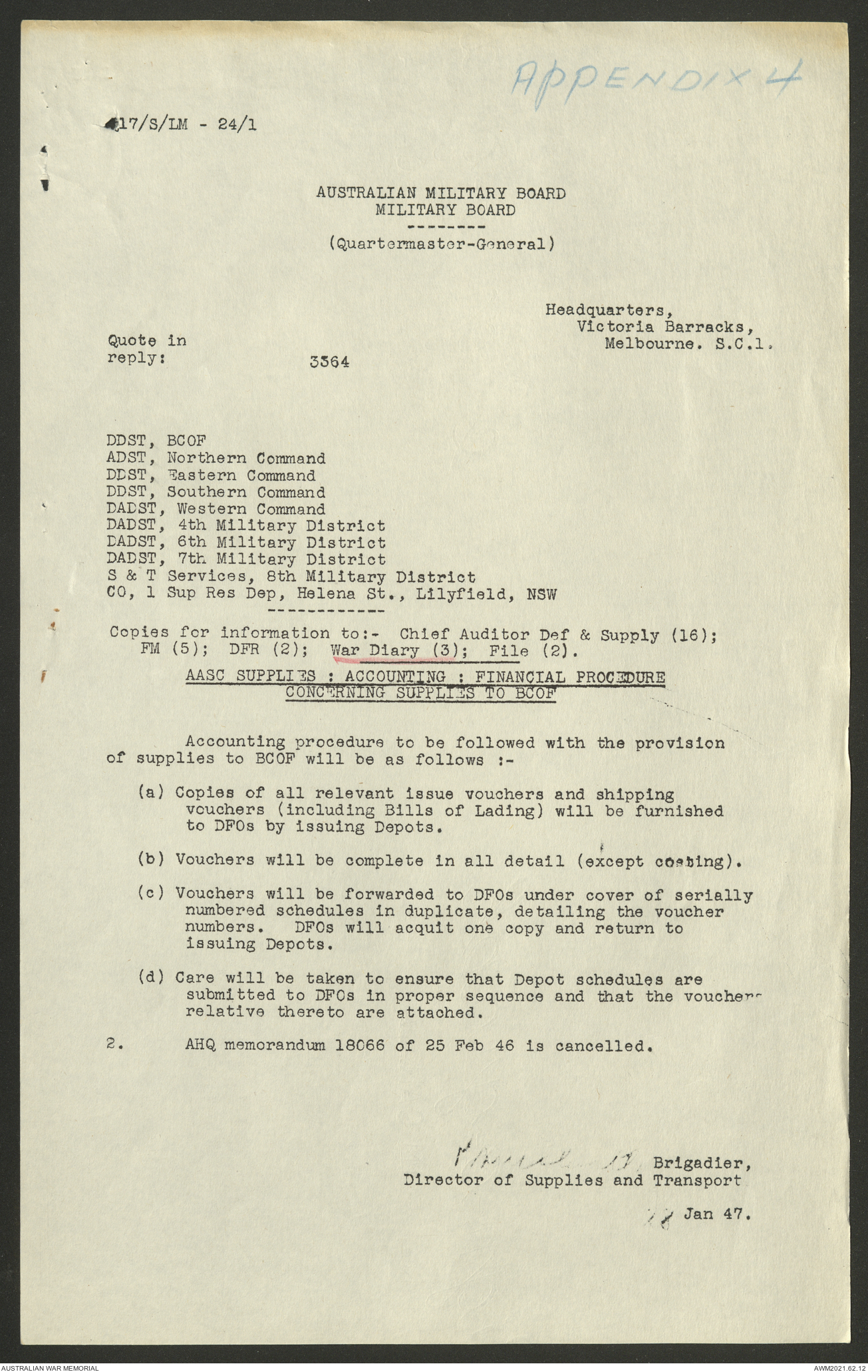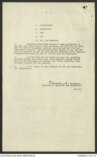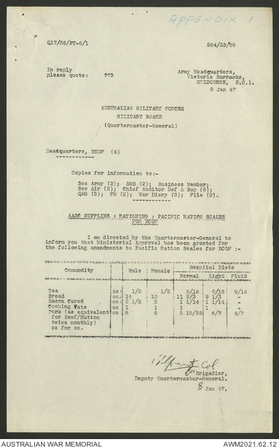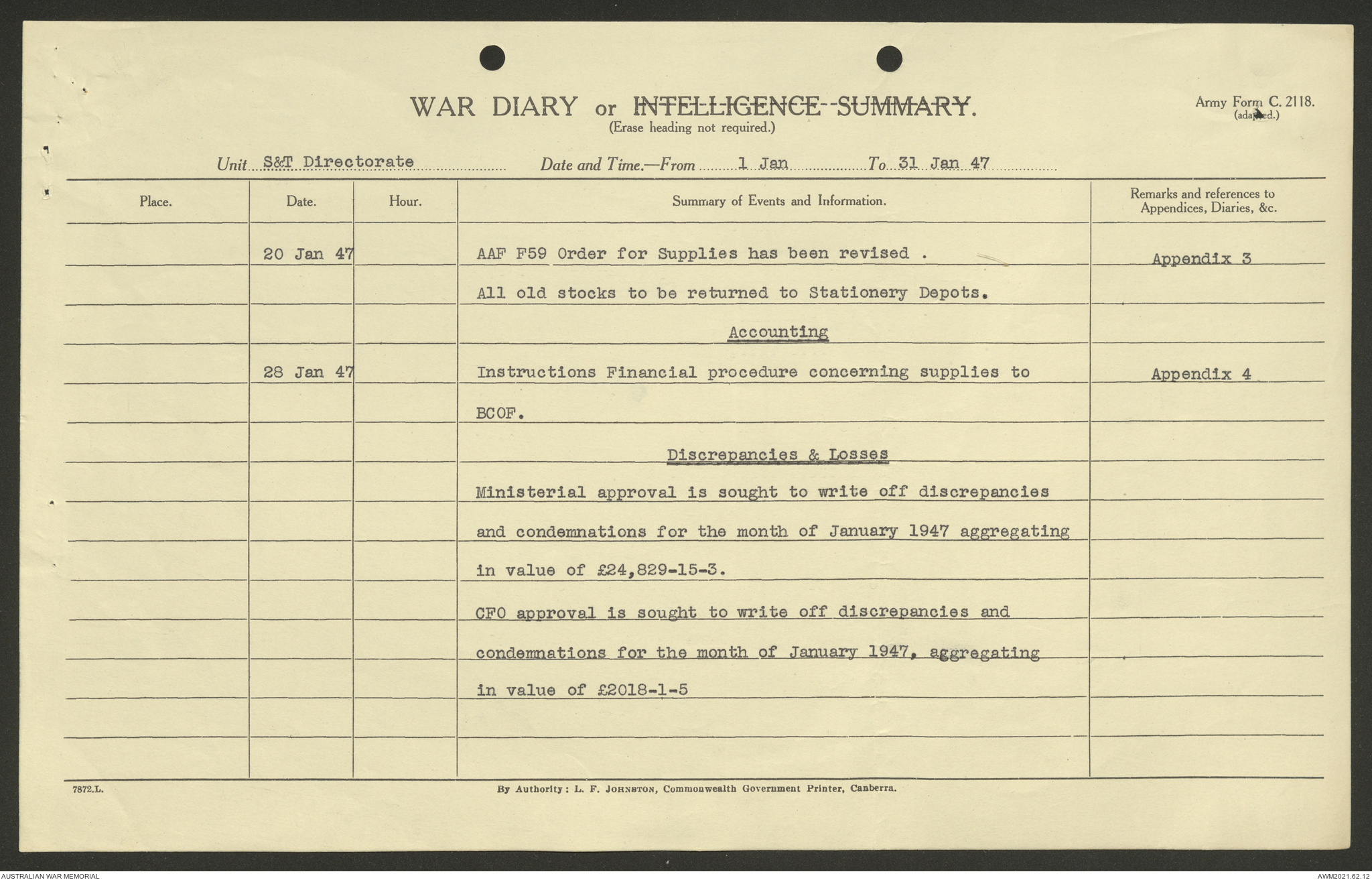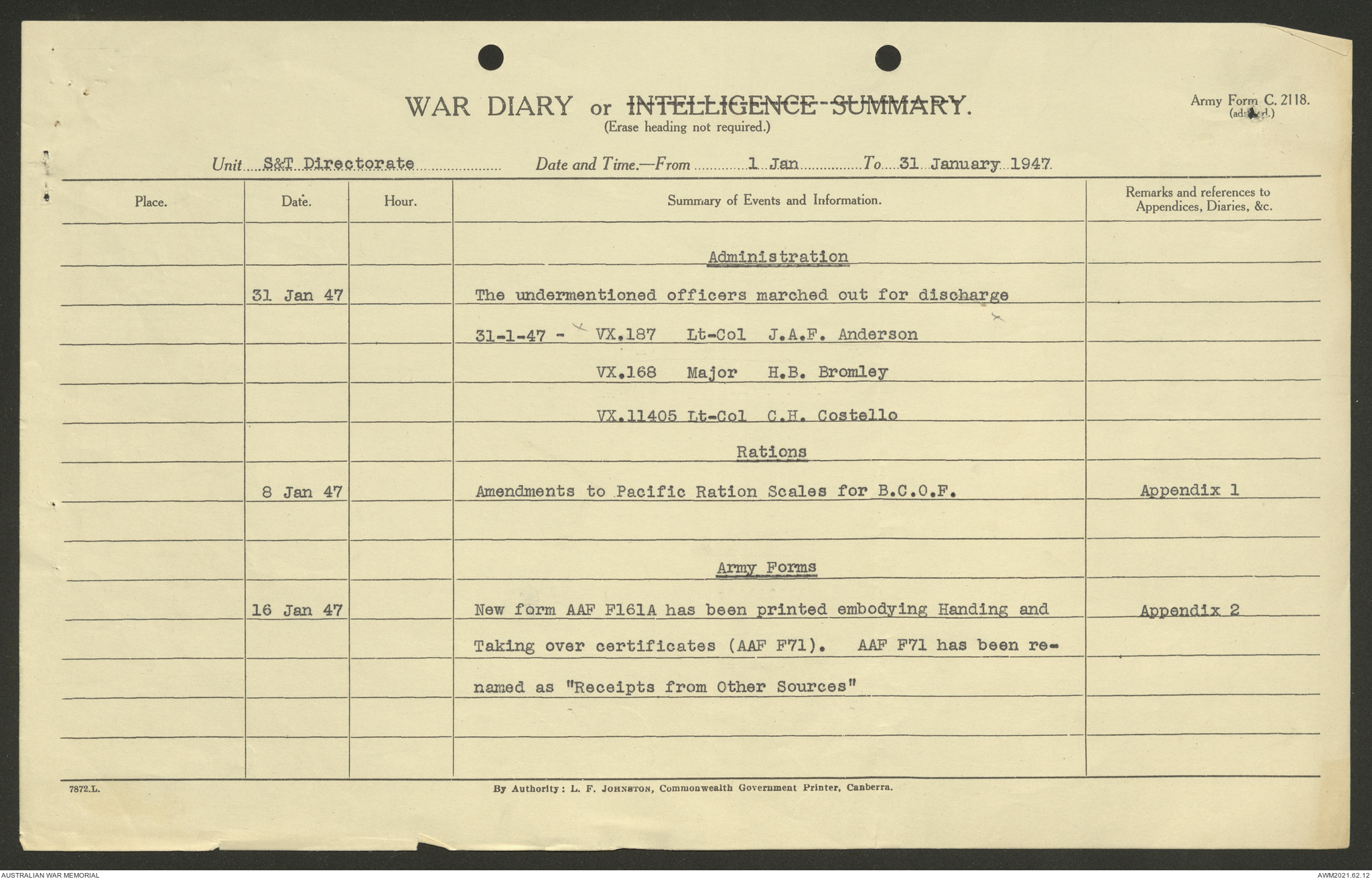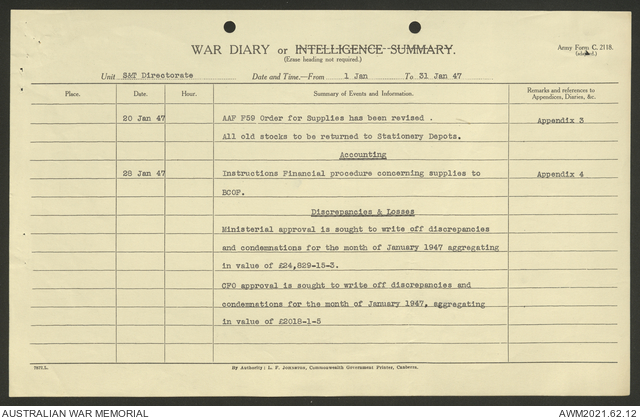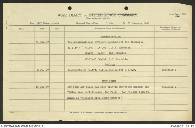 AWM52 10/1/1/11 - [Unit War Diaries, 1939-45 War] Supply and Transport Directorate AMF [Australian Military Force] January 1947