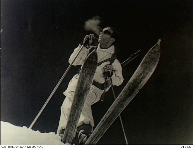 An Australian soldier reaches the summit on his snow skis during training at the newly opened 1 Australian Corps Ski School. He wears the white alpine gear common to such units.