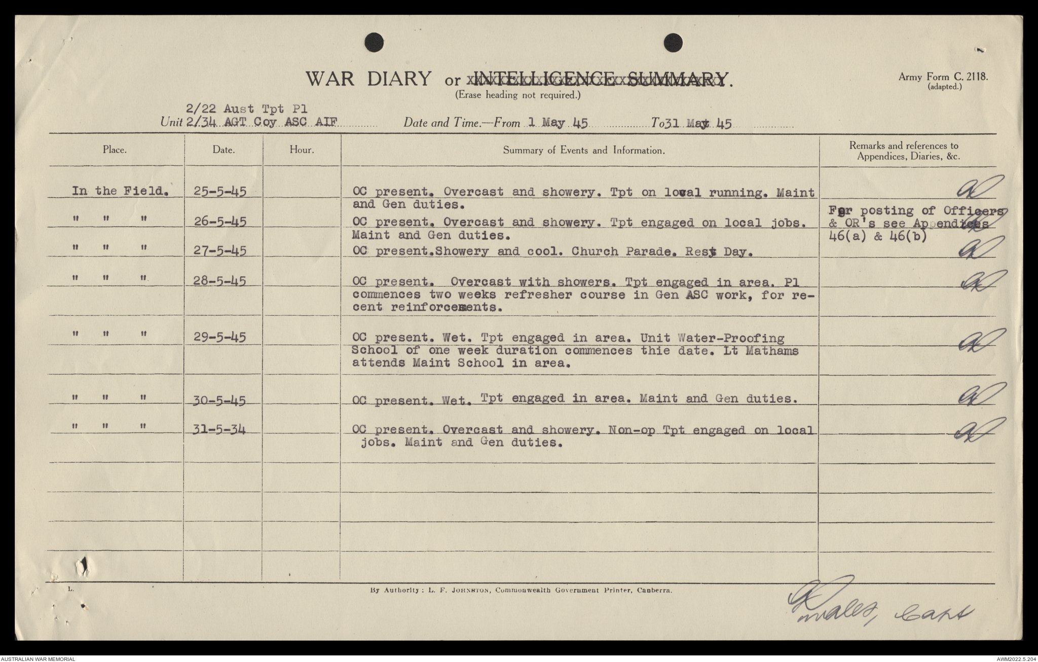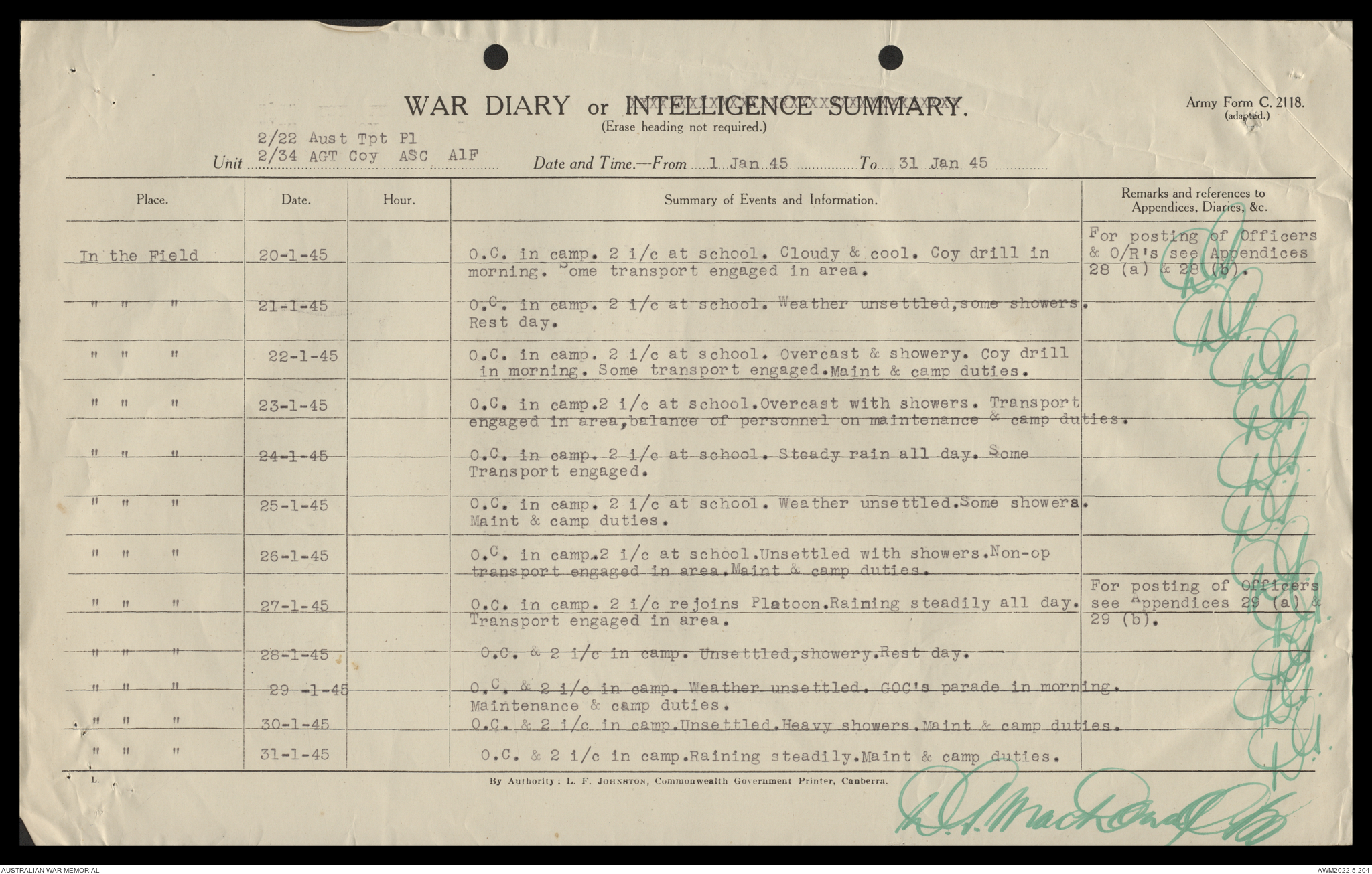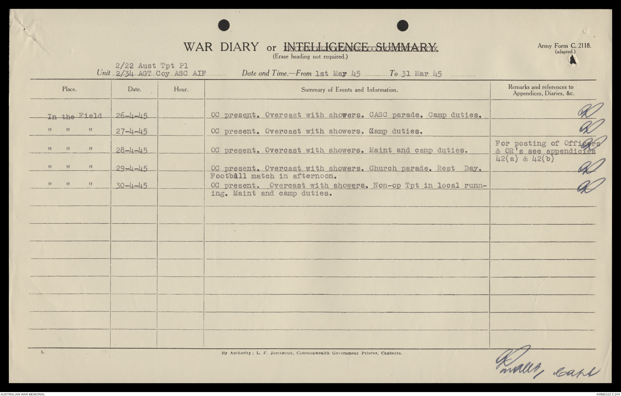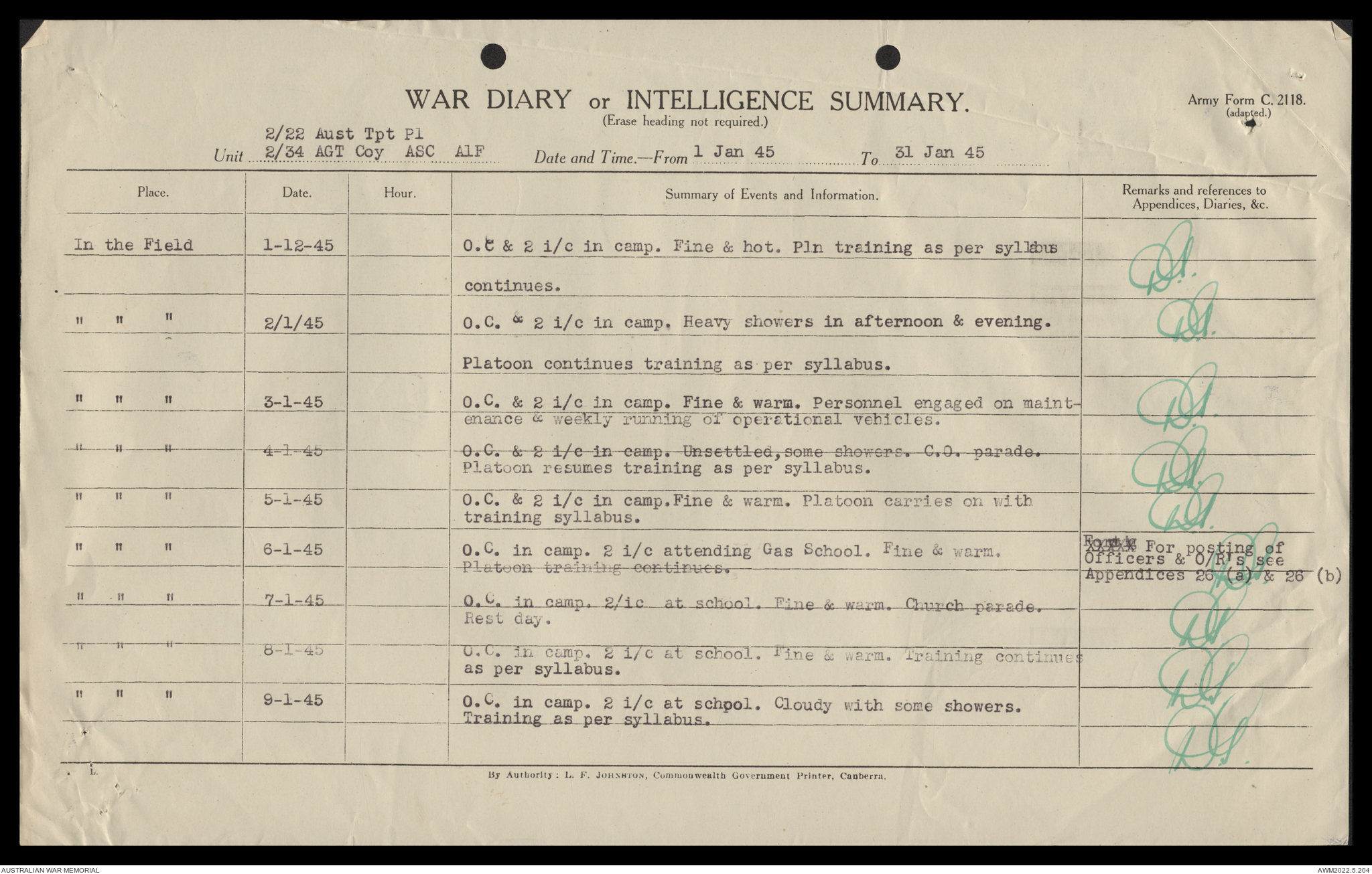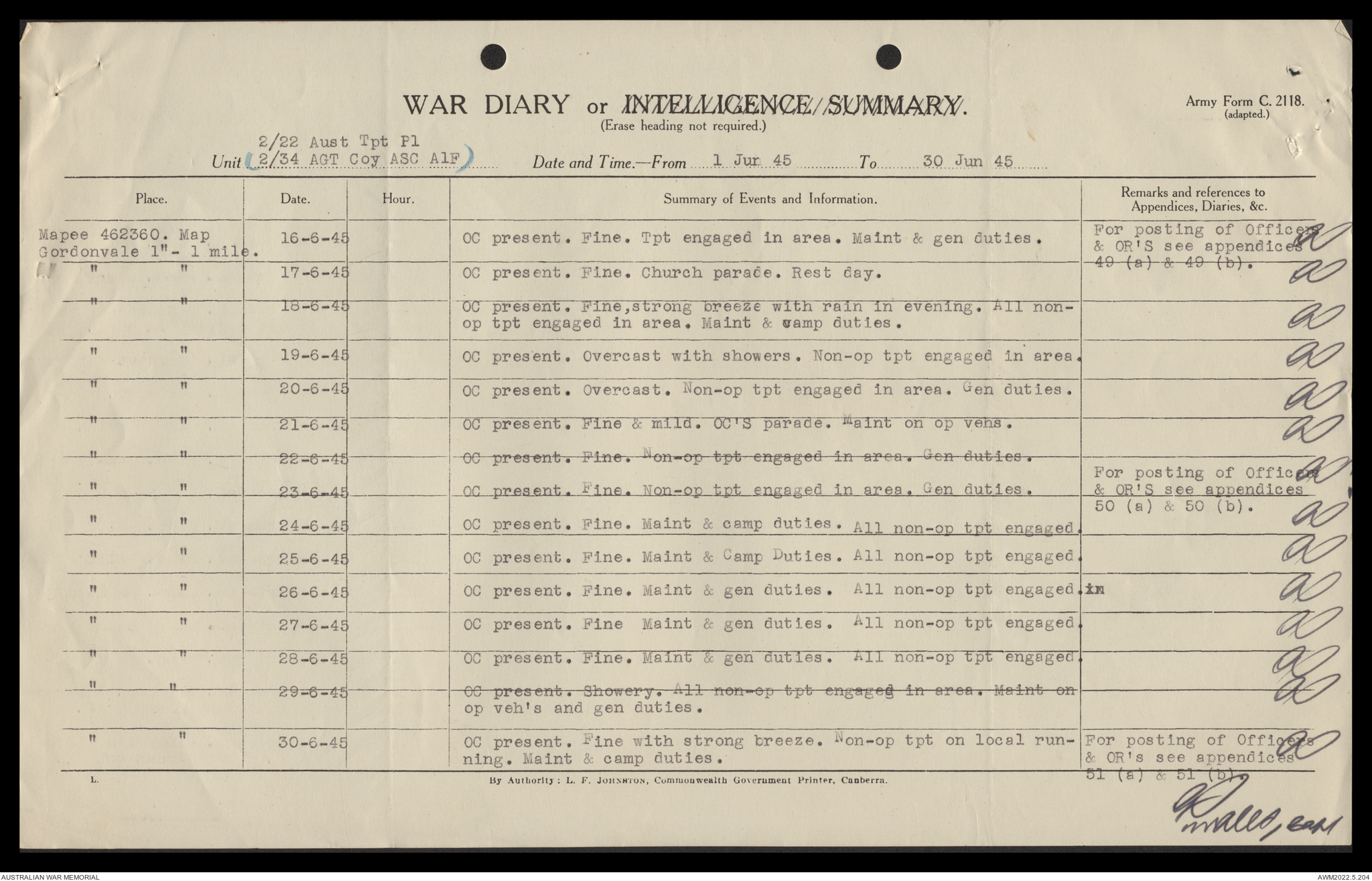 AWM52 10/4/22/2 - [Unit War Diaries, 1939-45 War] 2/22 Transport Platoon, January - June 1945