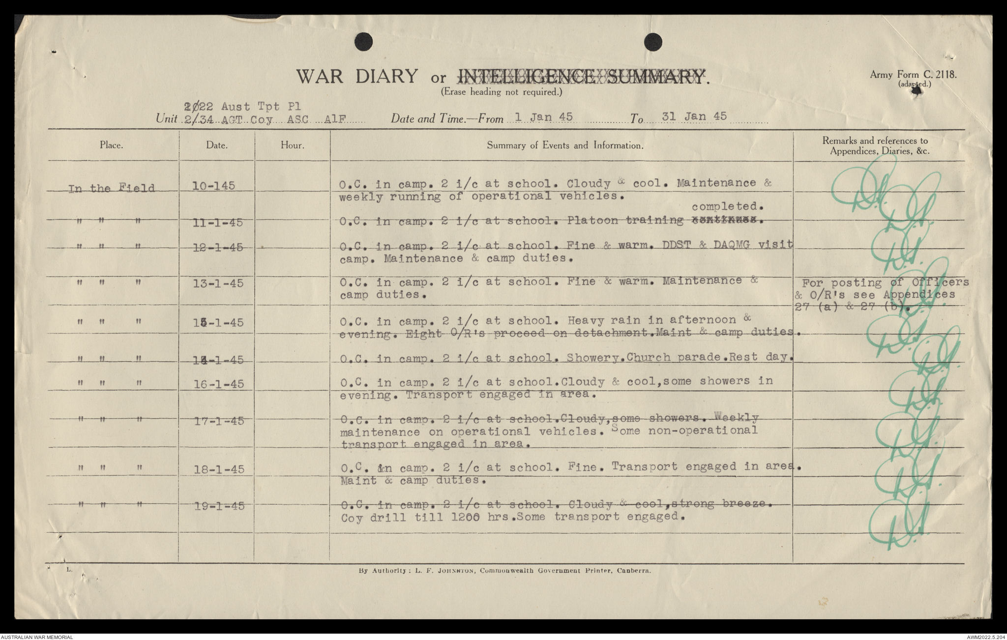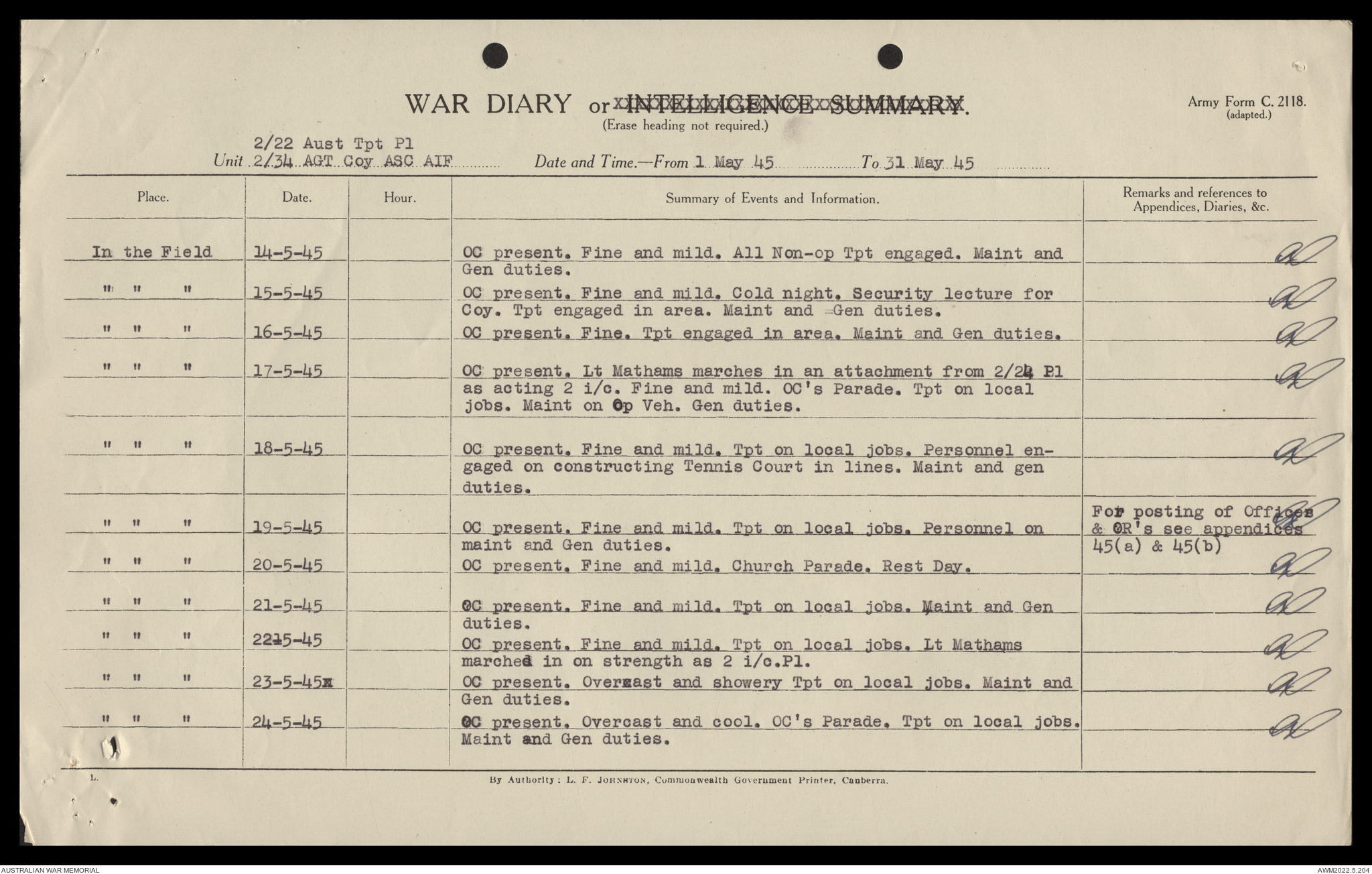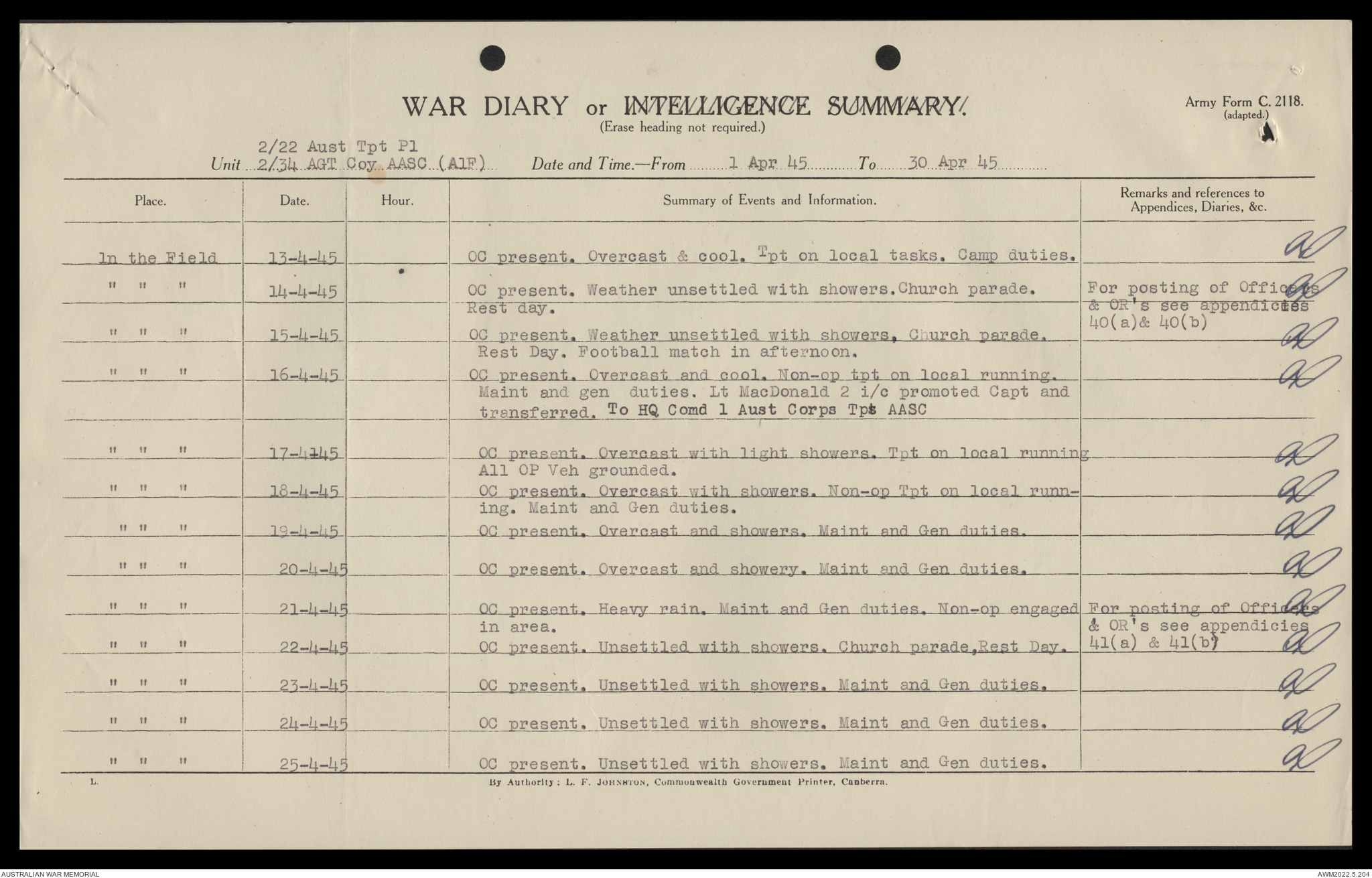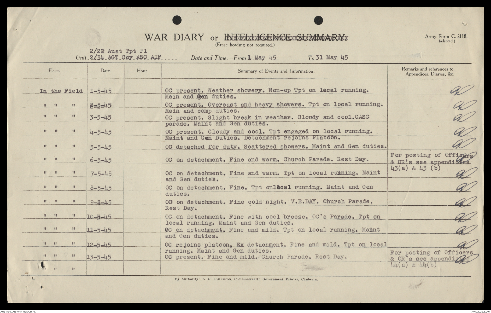AWM52 10/4/22/2 - [Unit War Diaries, 1939-45 War] 2/22 Transport Platoon, January - June 1945