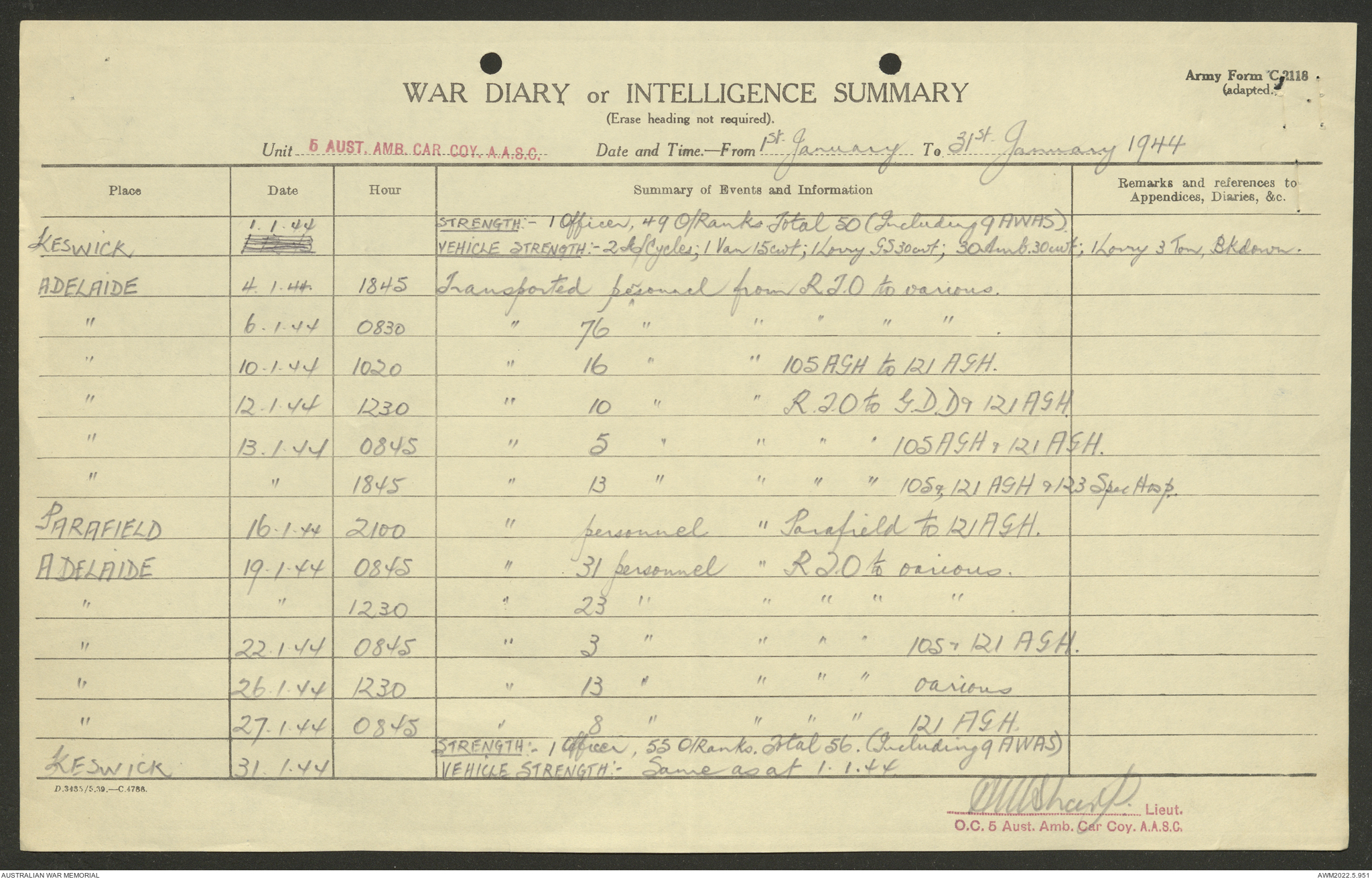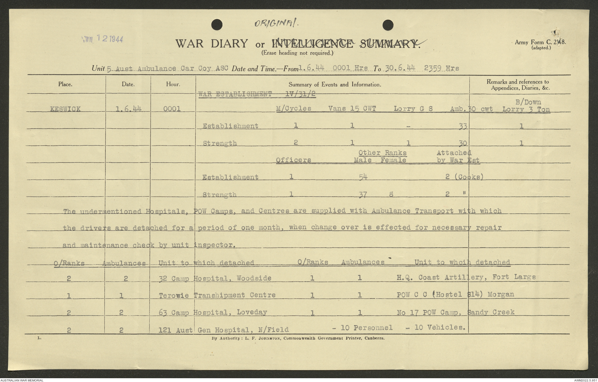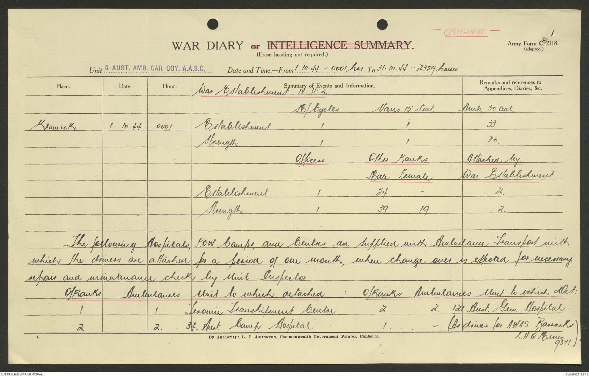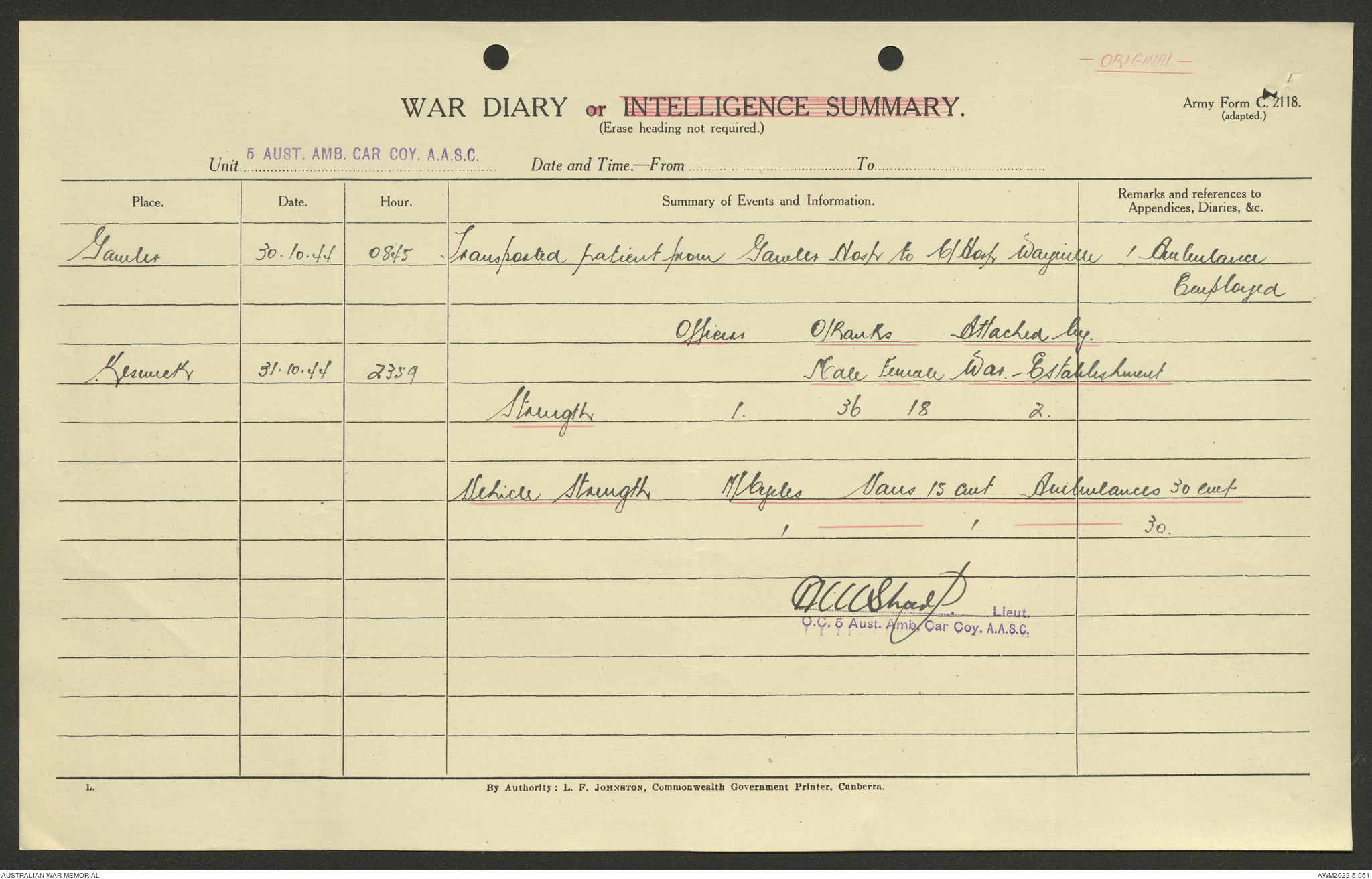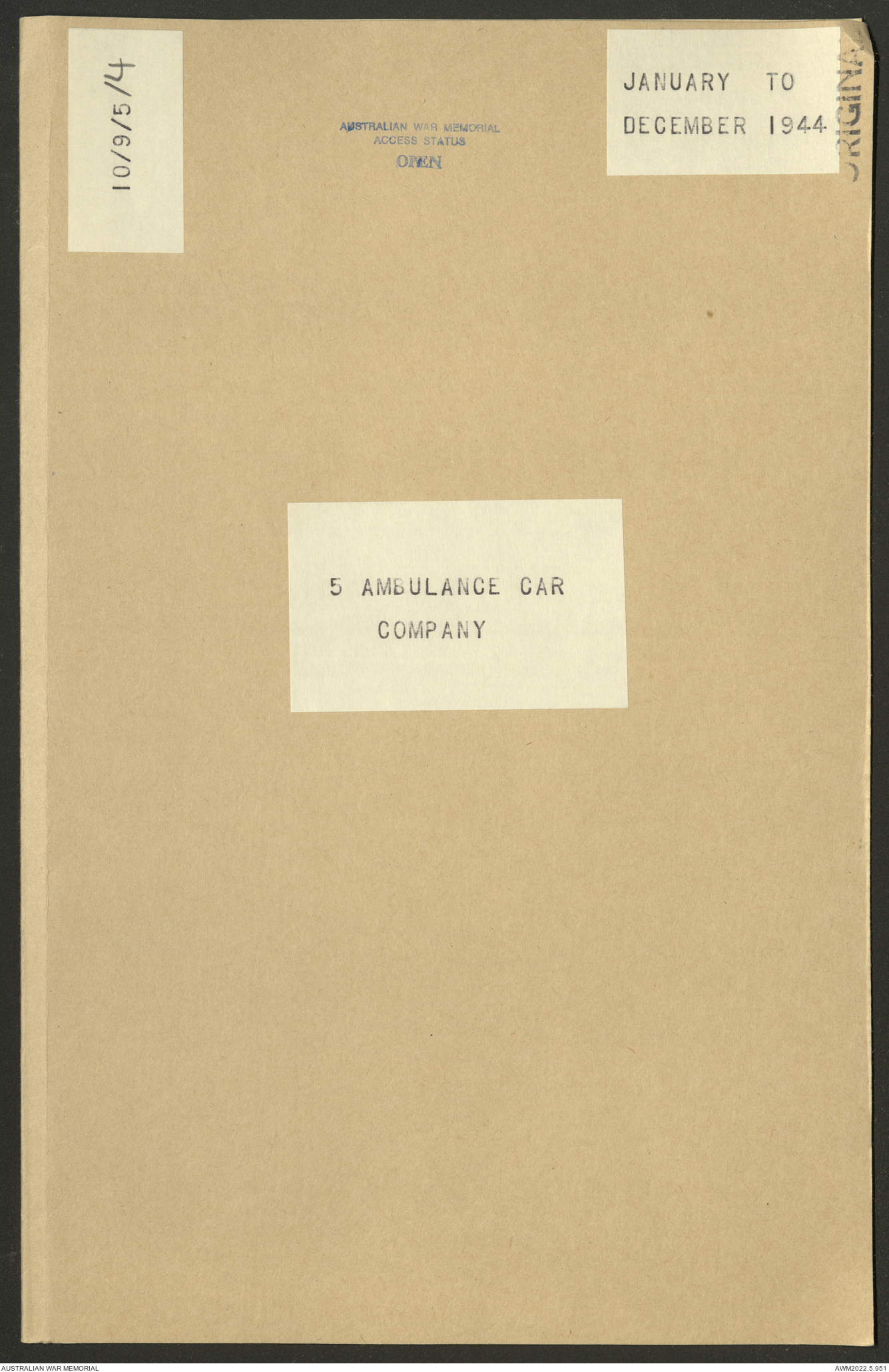 AWM52 10/9/5/4 - [Unit War Diaries, 1939-45 War] 5 Australian Ambulance Car Company AASC [Australian Army Service Corps] January - December 1944