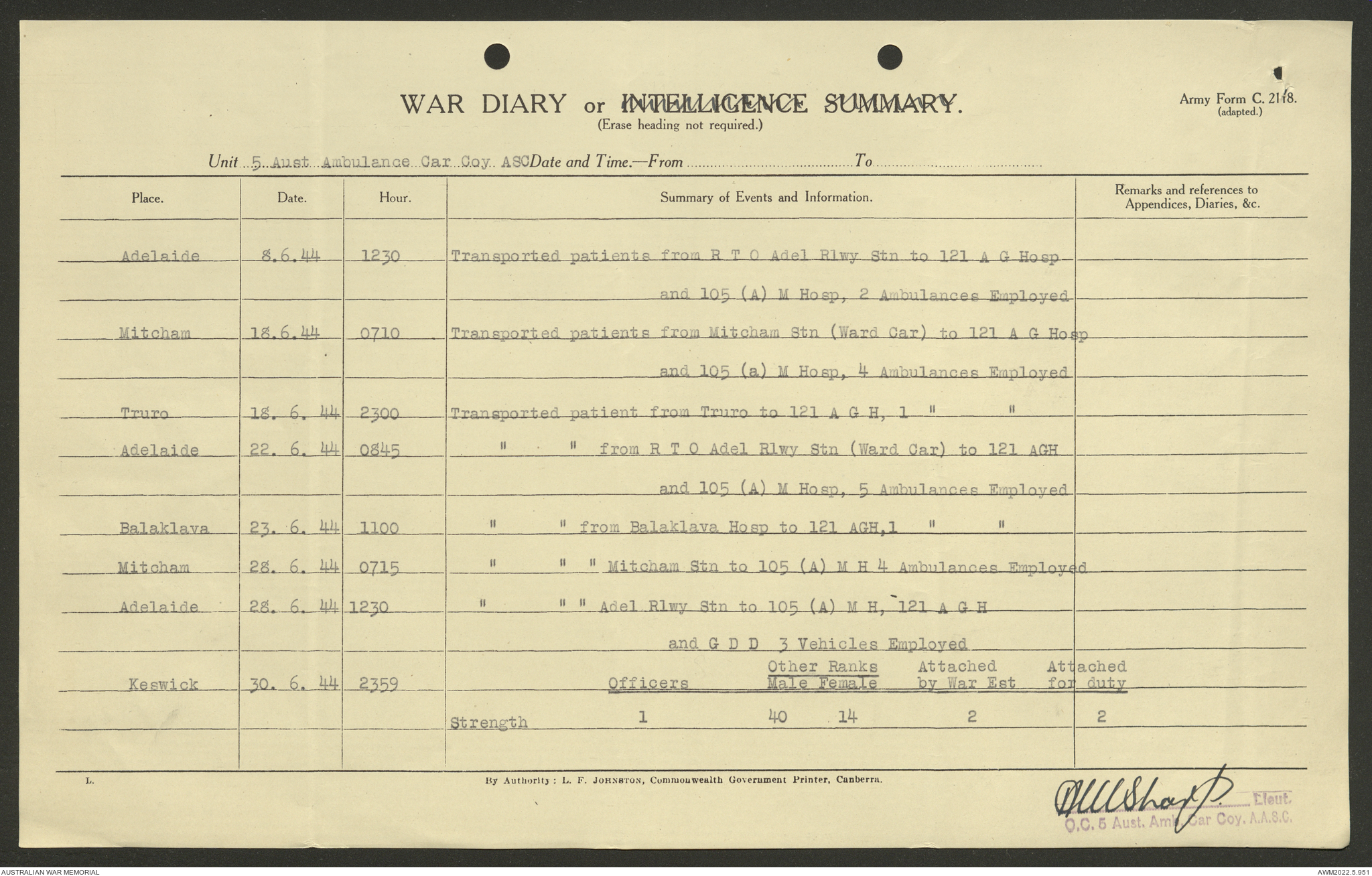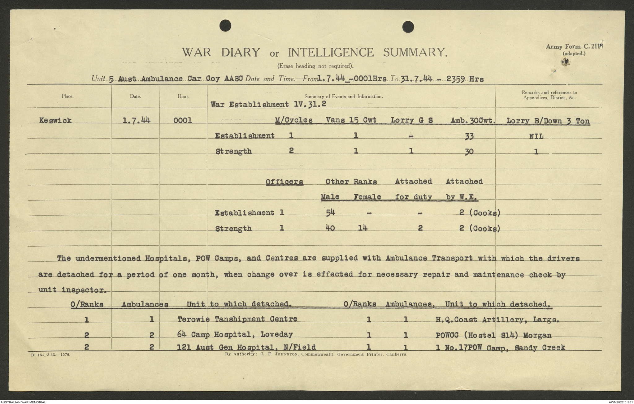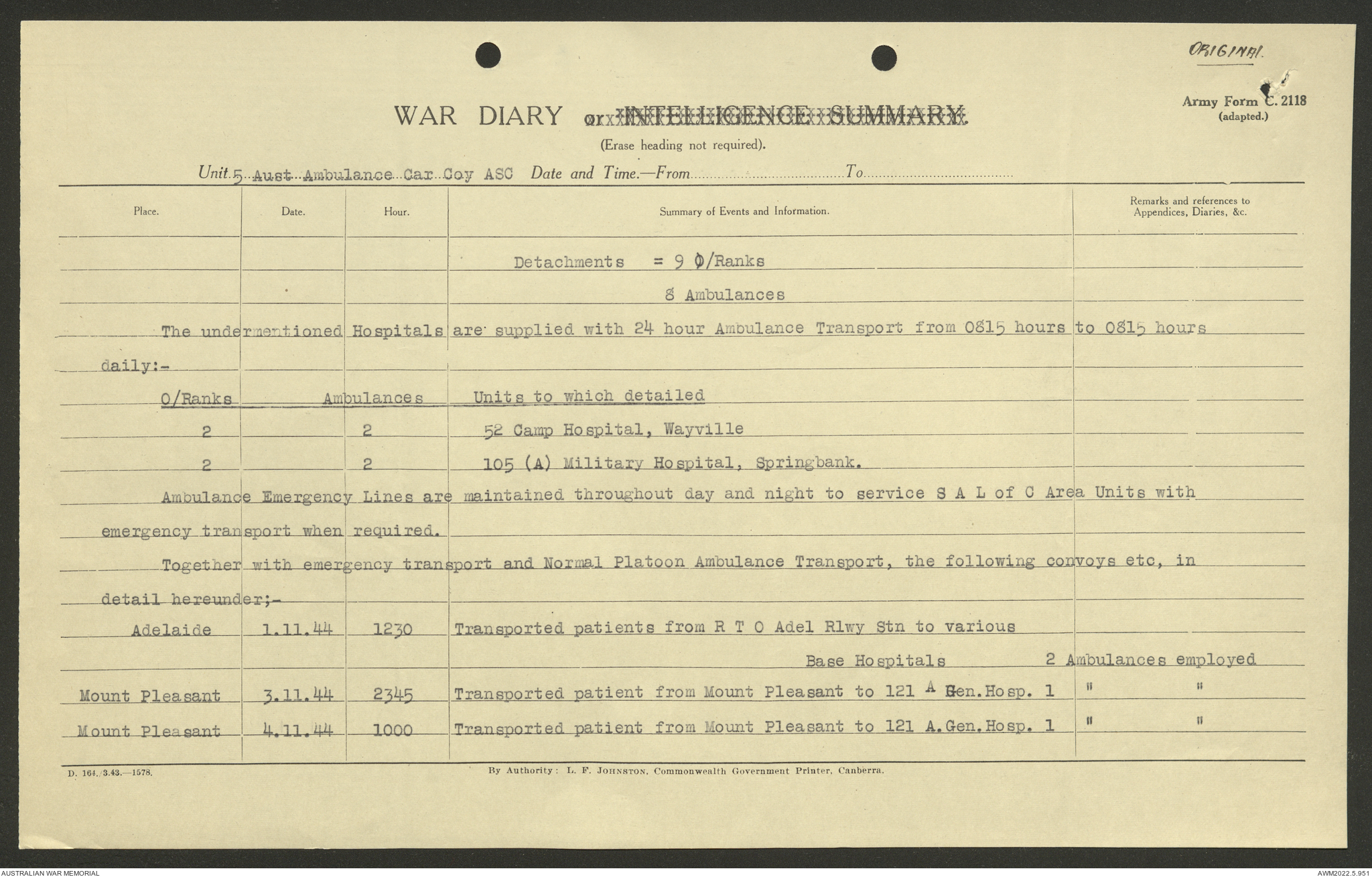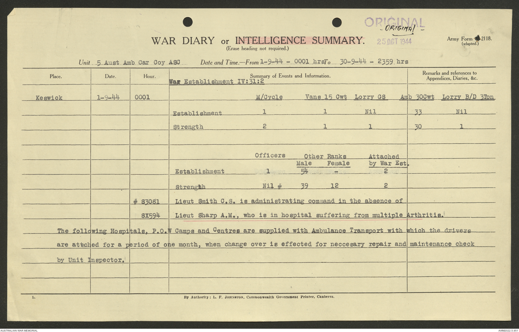 AWM52 10/9/5/4 - [Unit War Diaries, 1939-45 War] 5 Australian Ambulance Car Company AASC [Australian Army Service Corps] January - December 1944