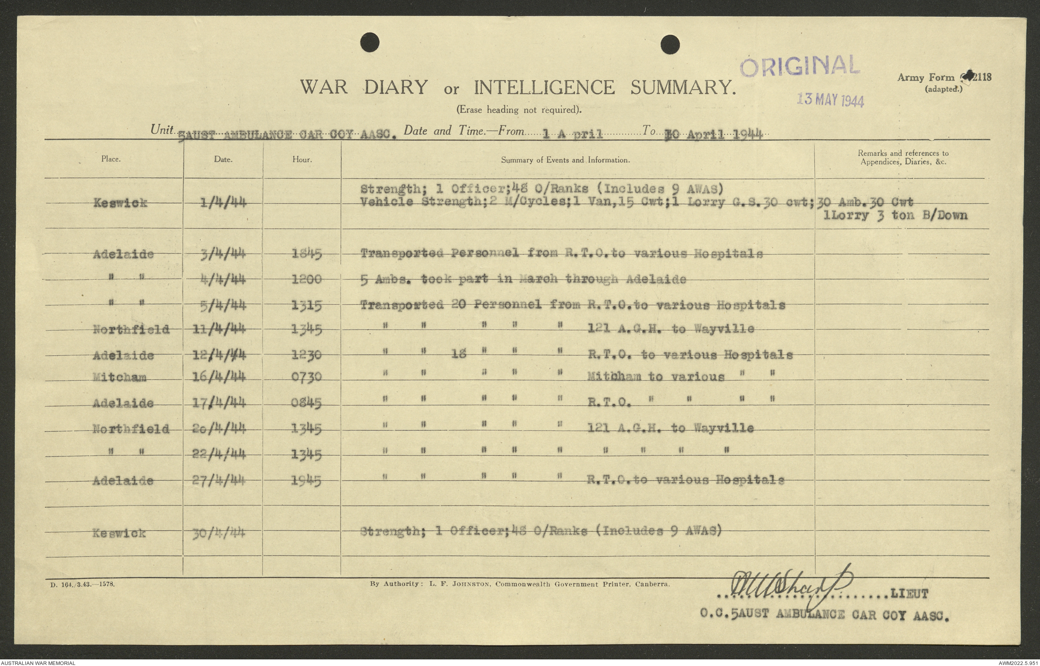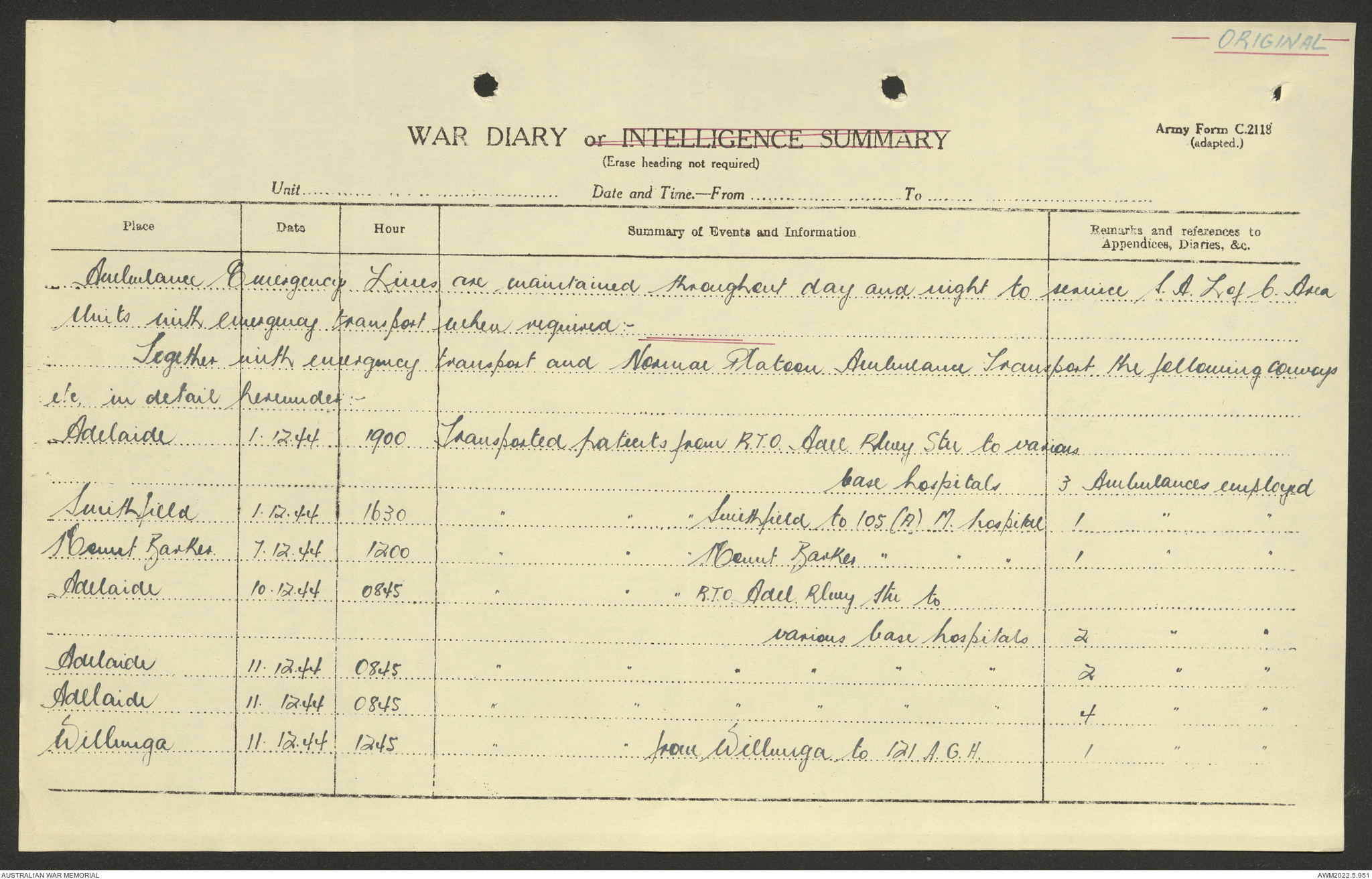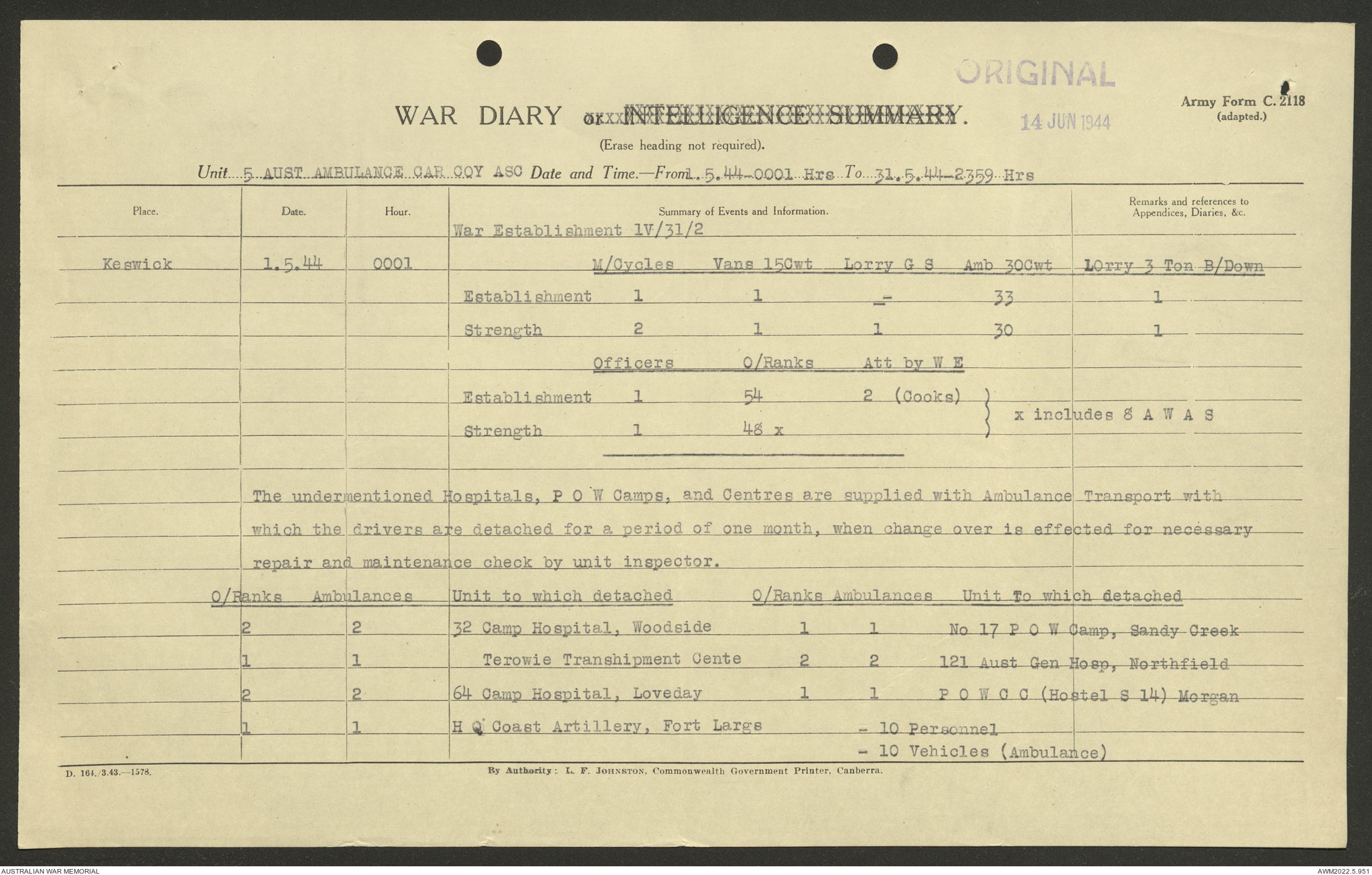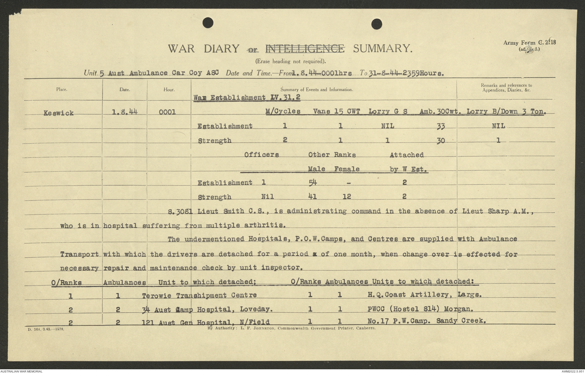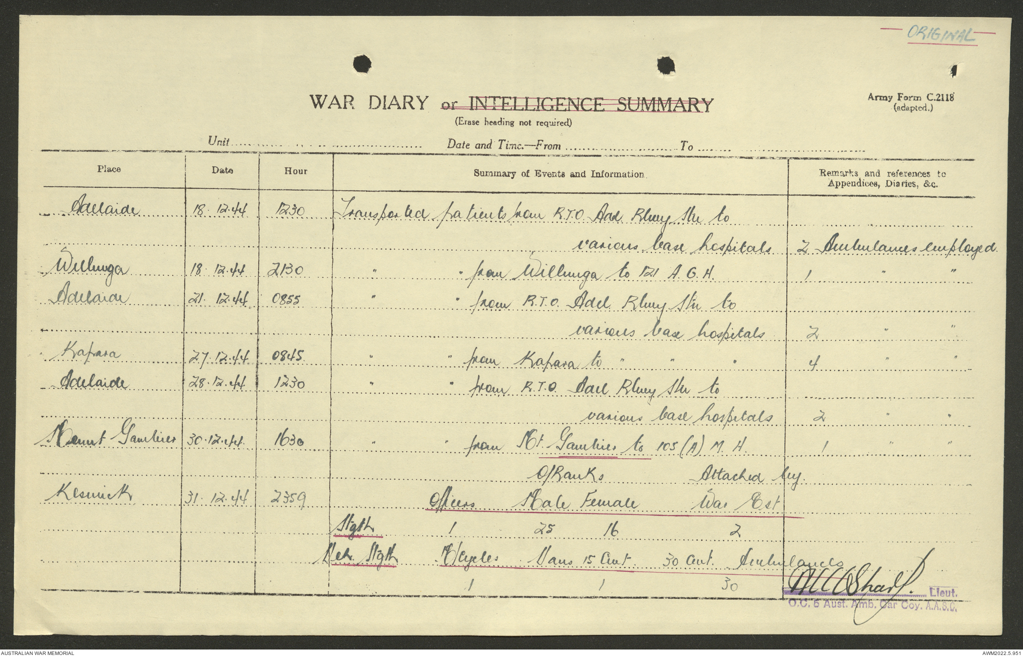 AWM52 10/9/5/4 - [Unit War Diaries, 1939-45 War] 5 Australian Ambulance Car Company AASC [Australian Army Service Corps] January - December 1944