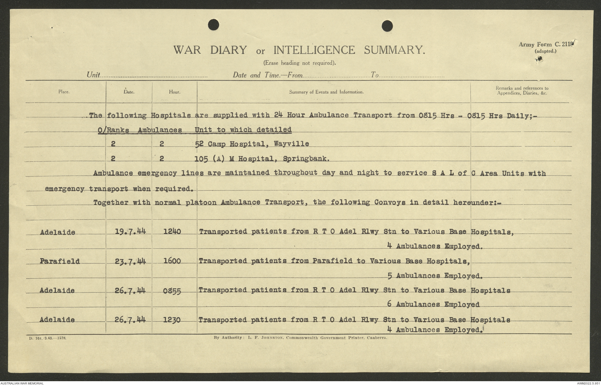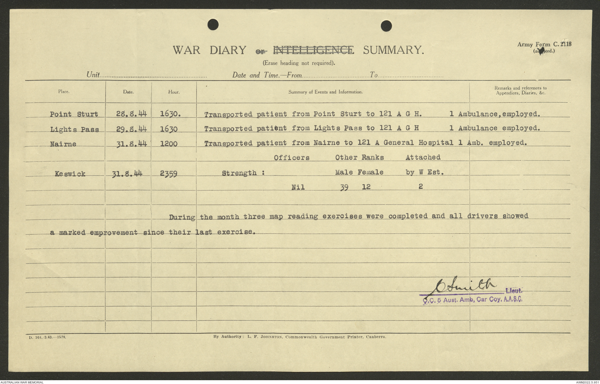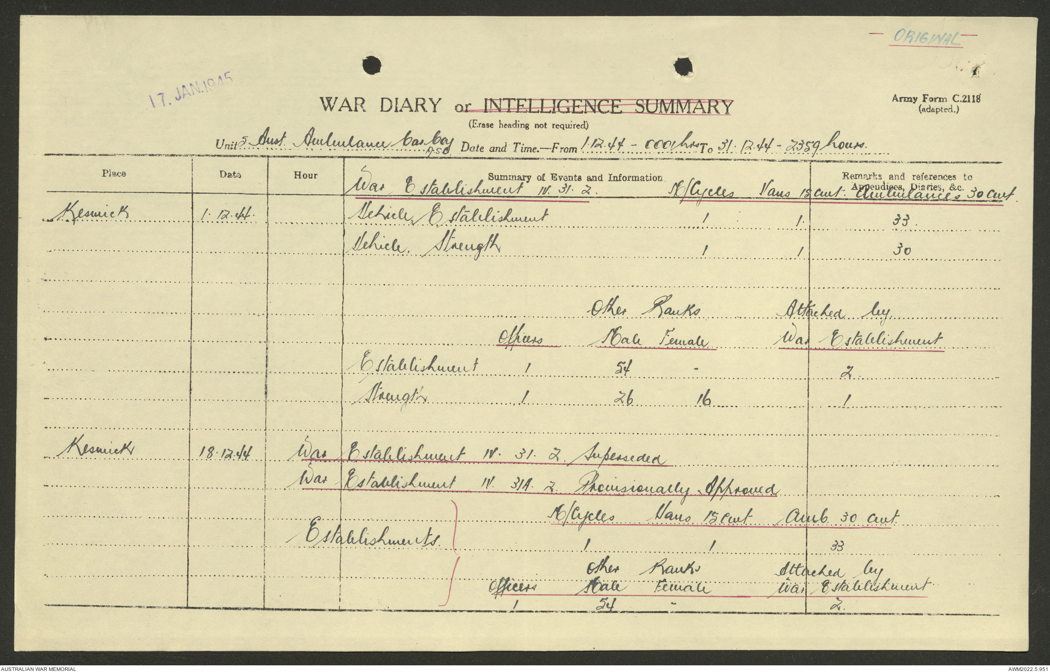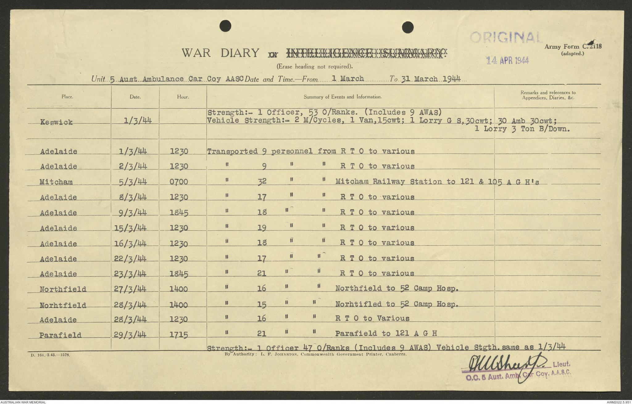 AWM52 10/9/5/4 - [Unit War Diaries, 1939-45 War] 5 Australian Ambulance Car Company AASC [Australian Army Service Corps] January - December 1944