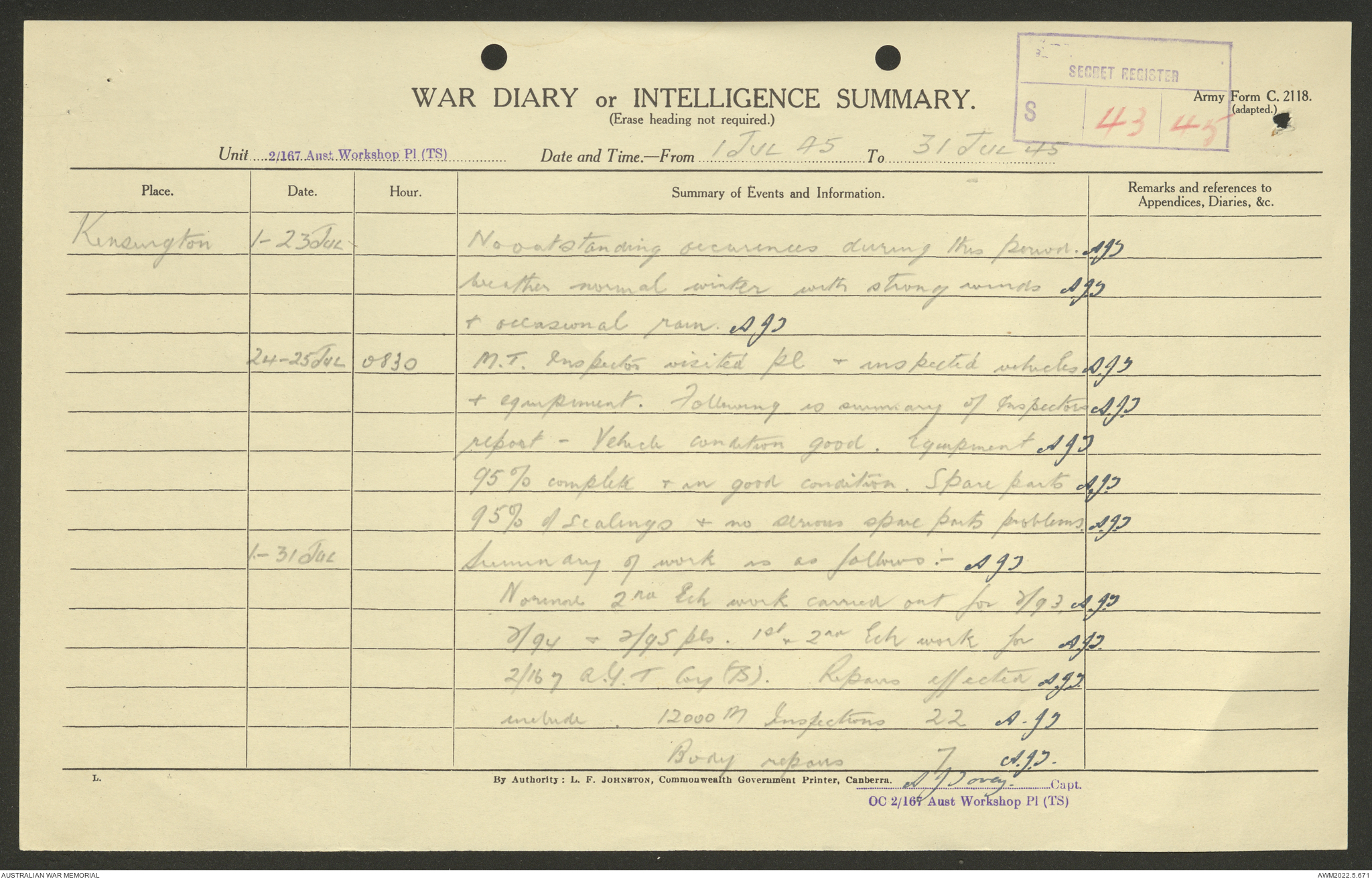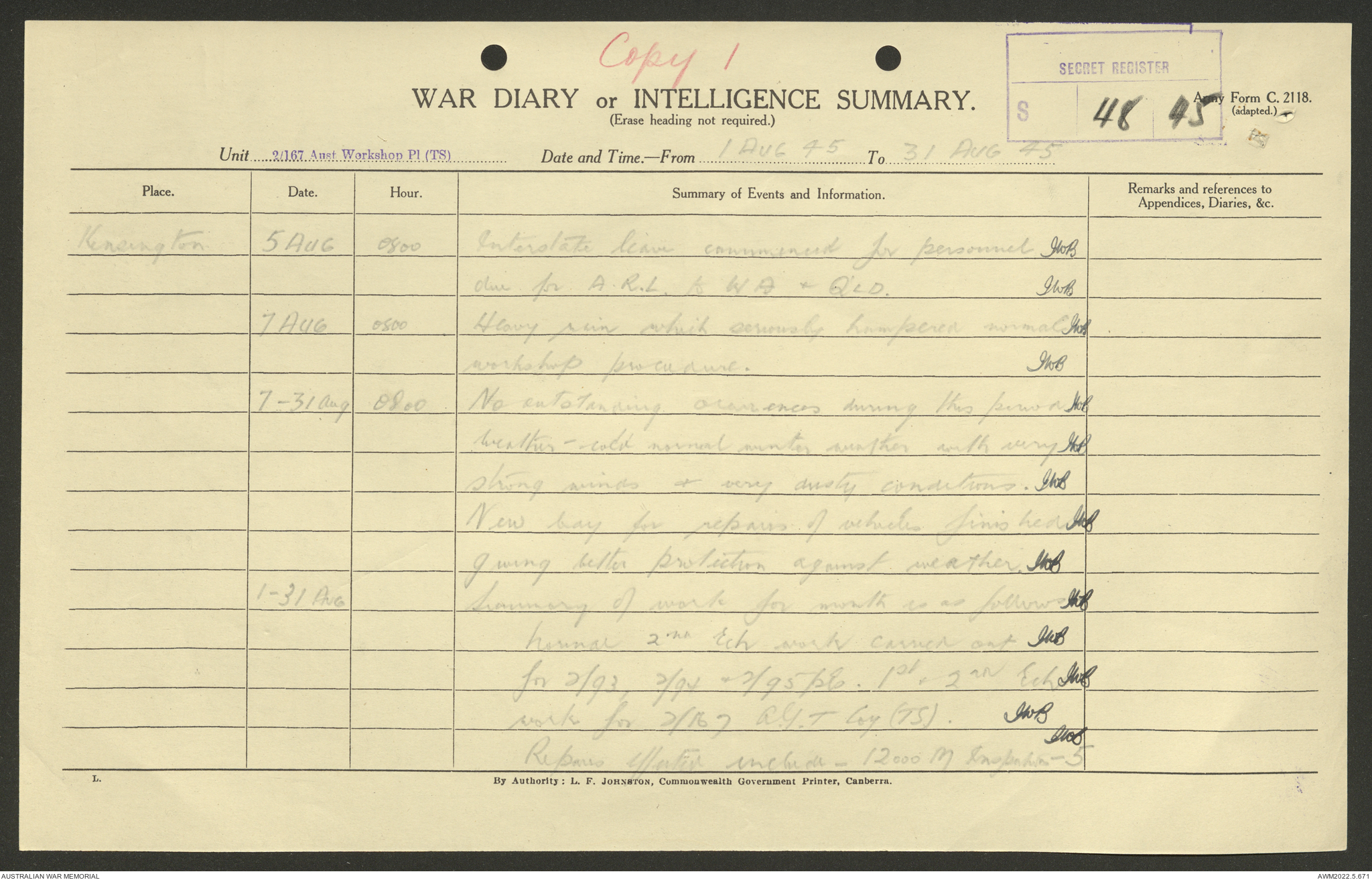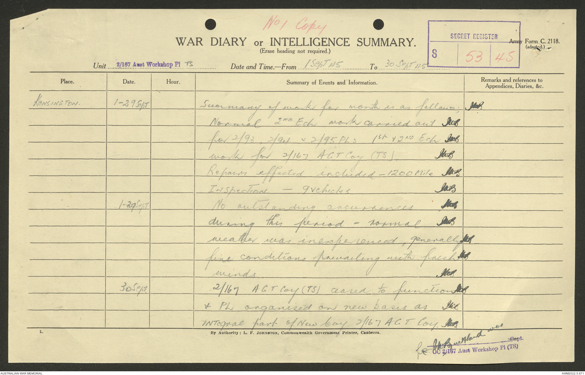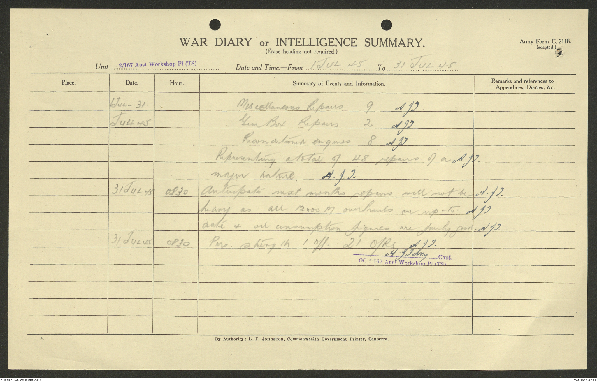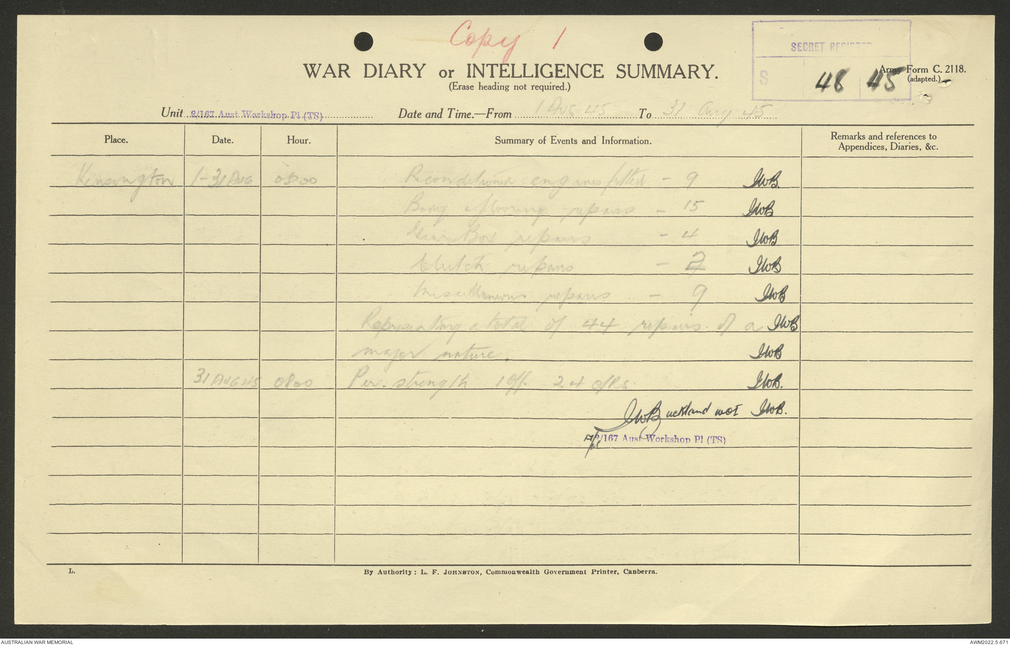 AWM52 10/5/29/1 - [Unit War Diaries, 1939-45 War] 2/167 Aust [Australian] Workshop Platoon TS [Tropical Scale] January - September 1945