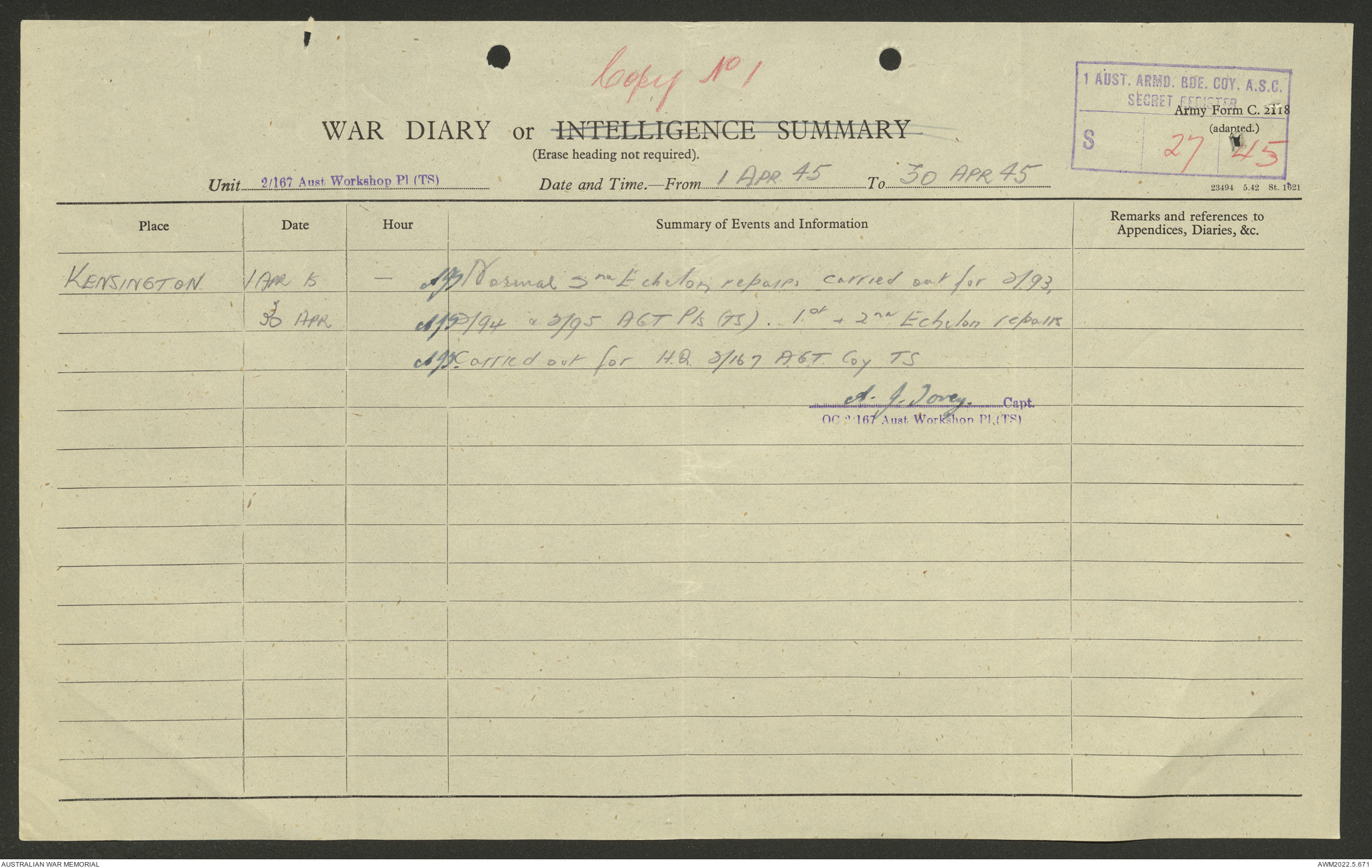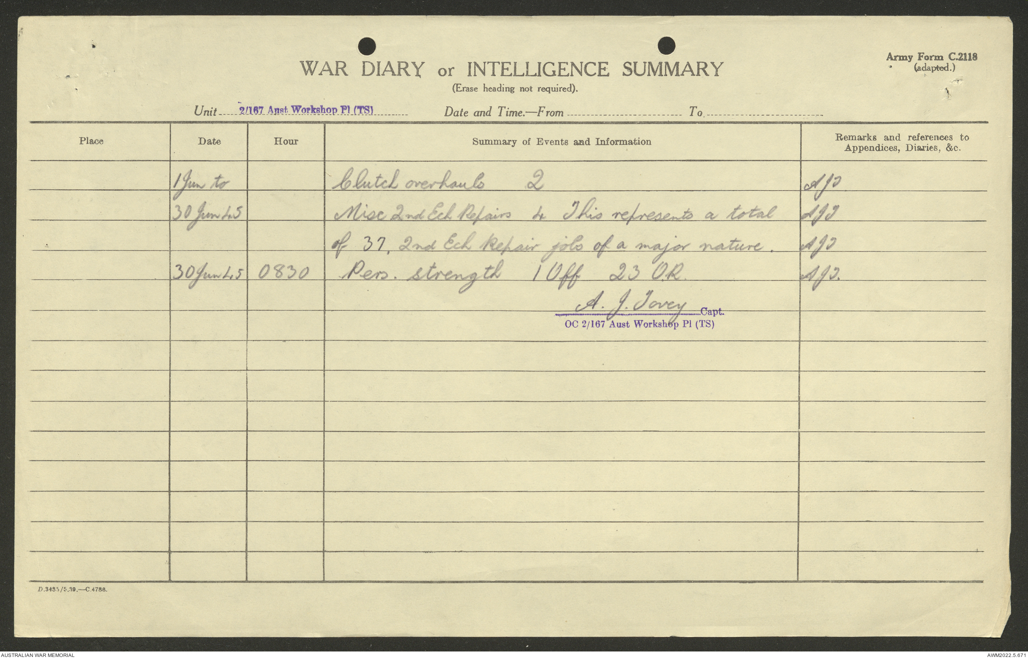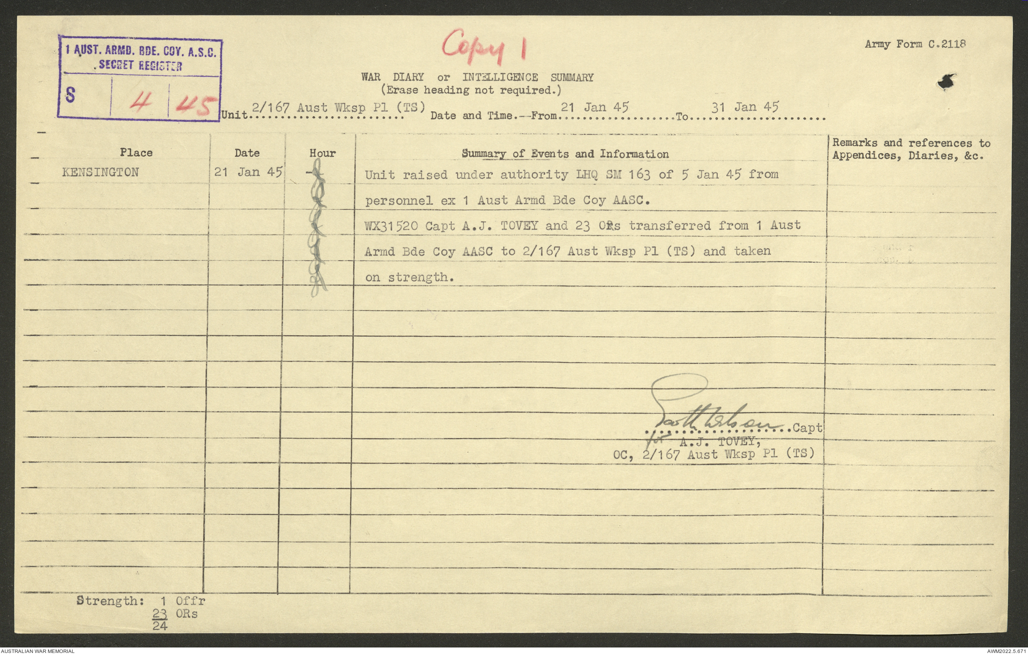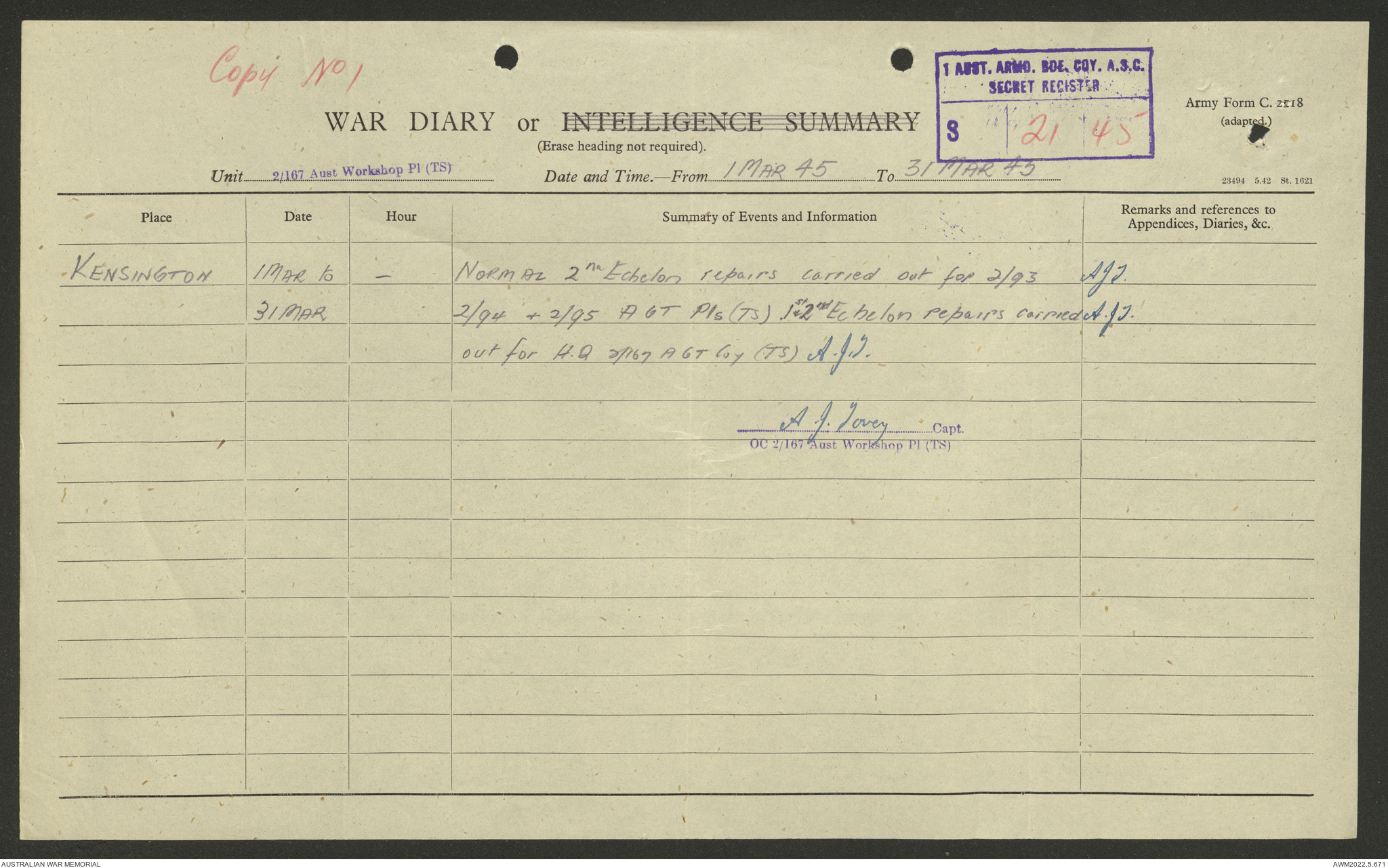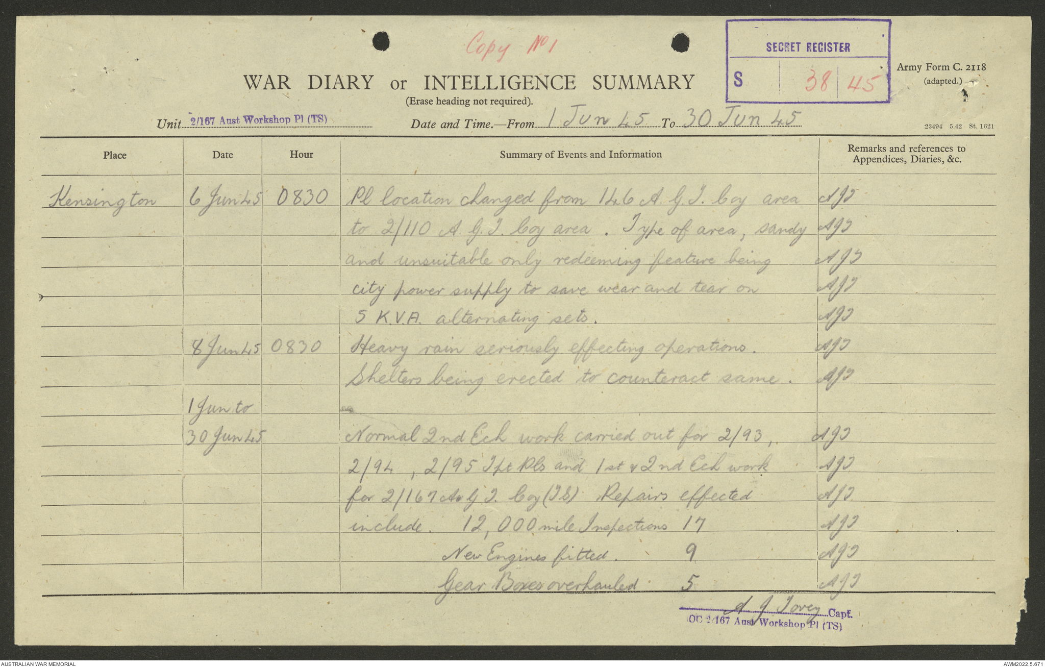 AWM52 10/5/29/1 - [Unit War Diaries, 1939-45 War] 2/167 Aust [Australian] Workshop Platoon TS [Tropical Scale] January - September 1945
