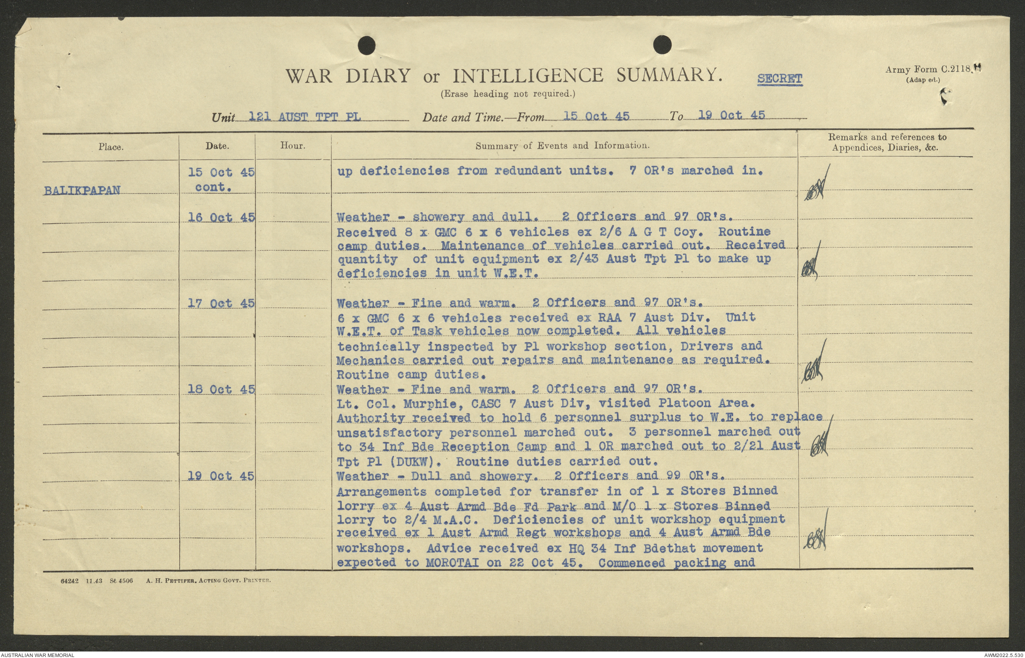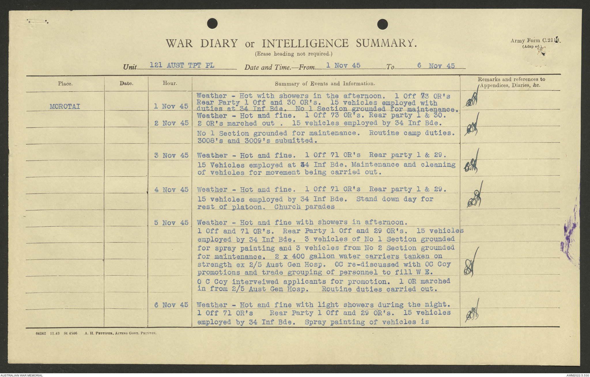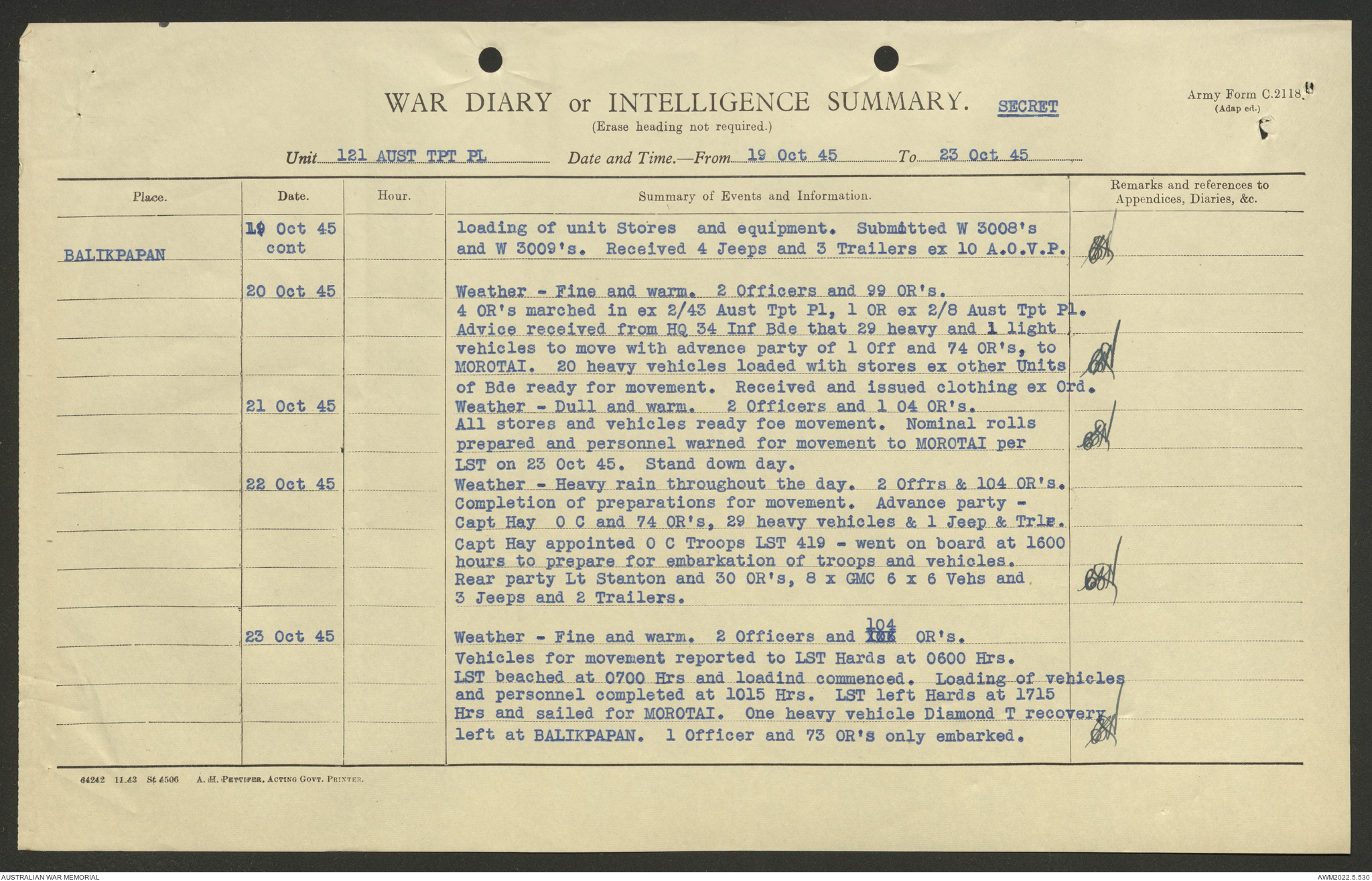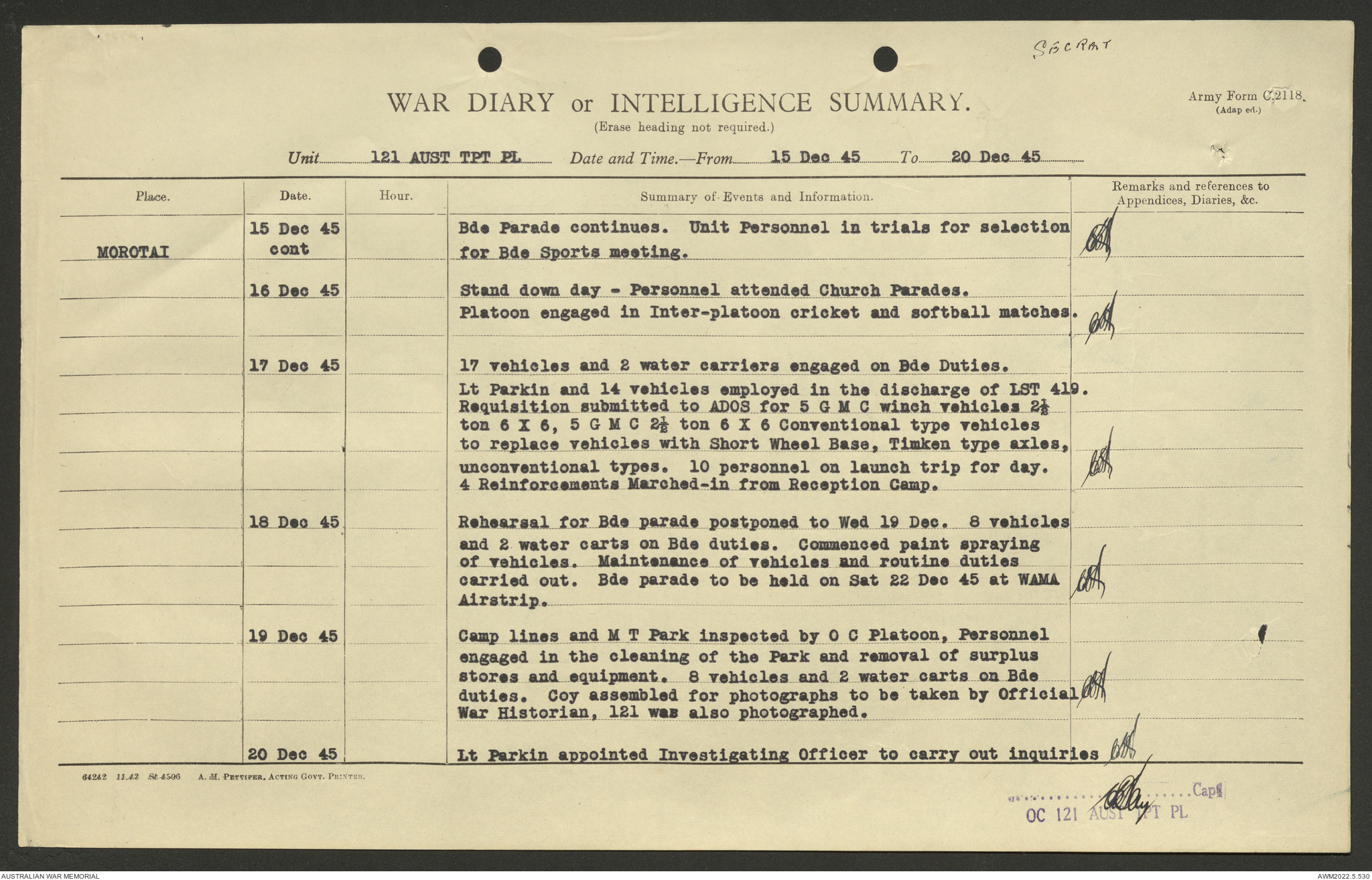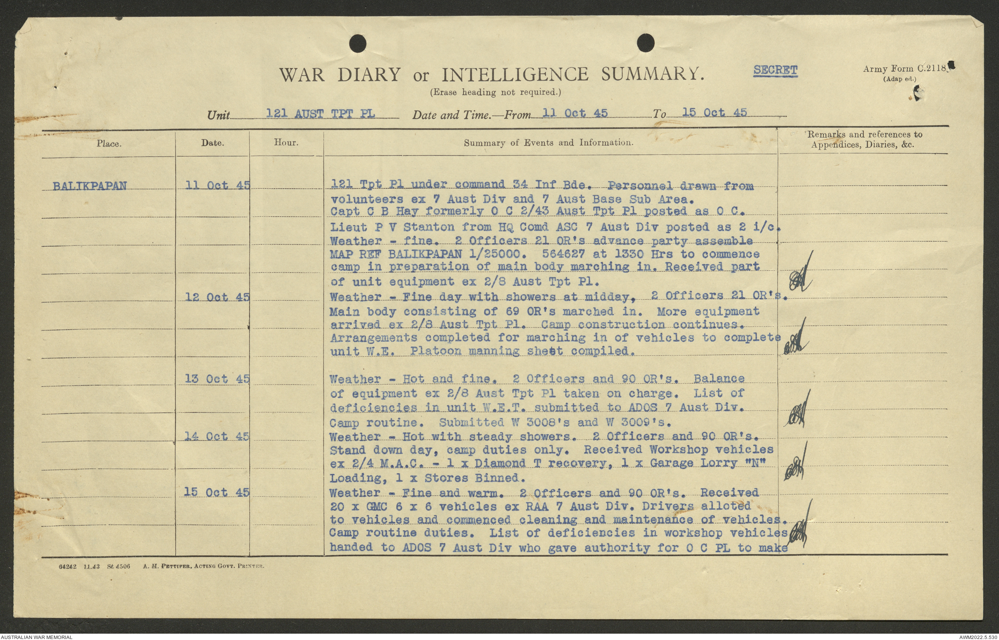 AWM52 10/4/126/1 - [Unit War Diaries, 1939-45 War] 121 Aust. [Australian] Transport Platoon, October - December 1945