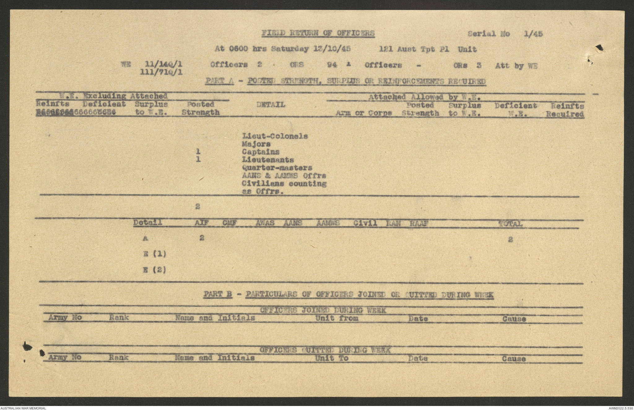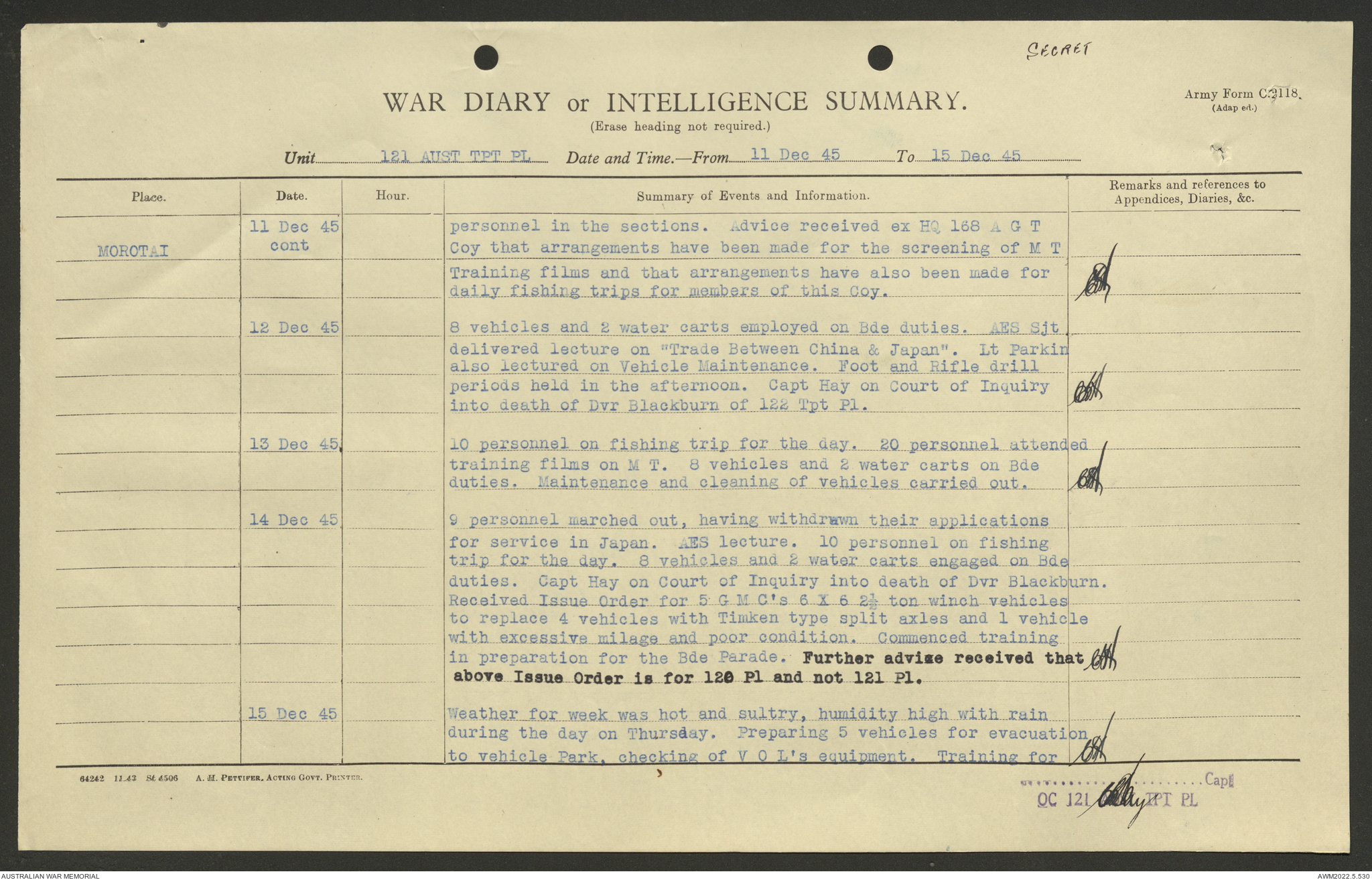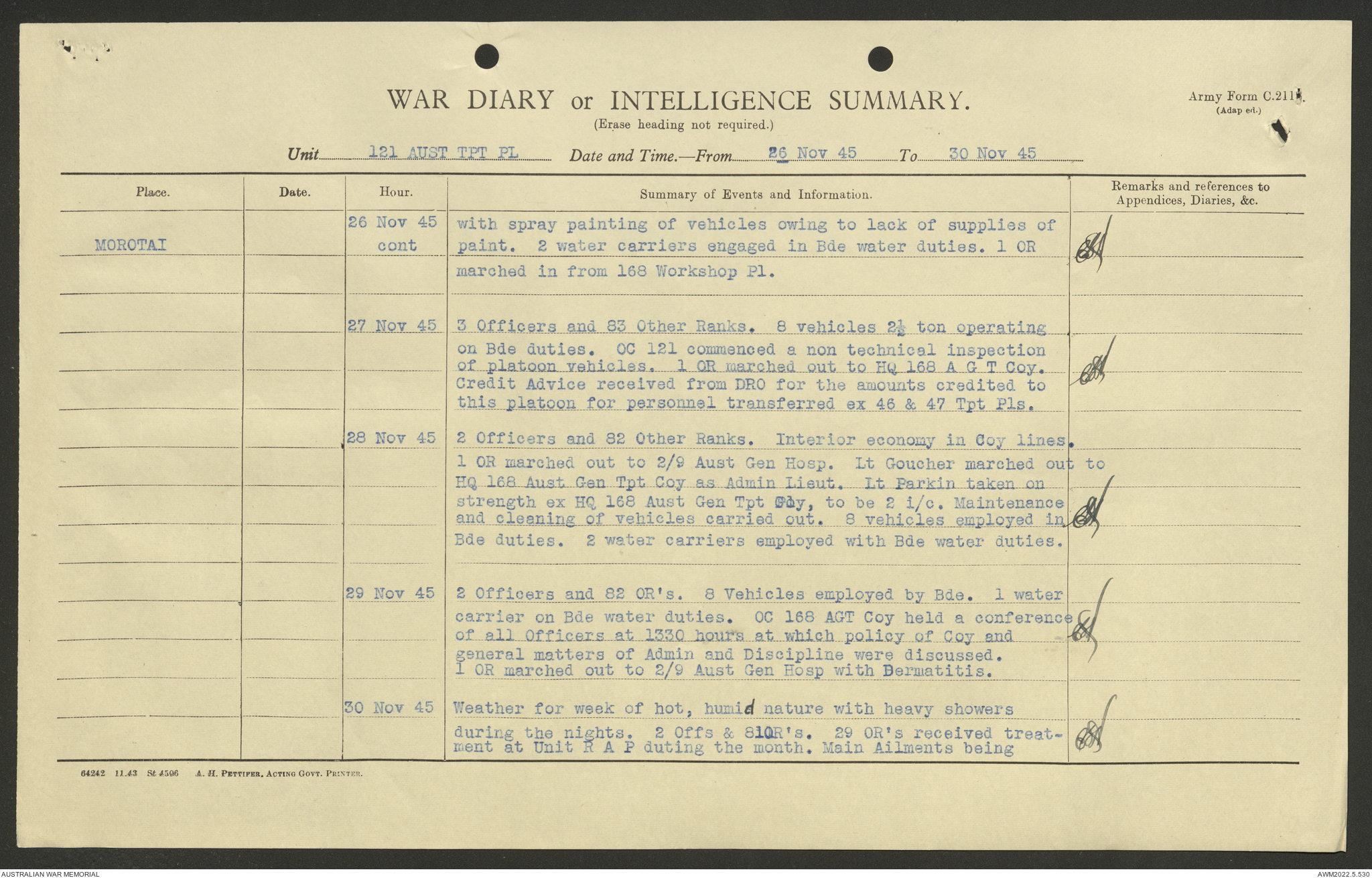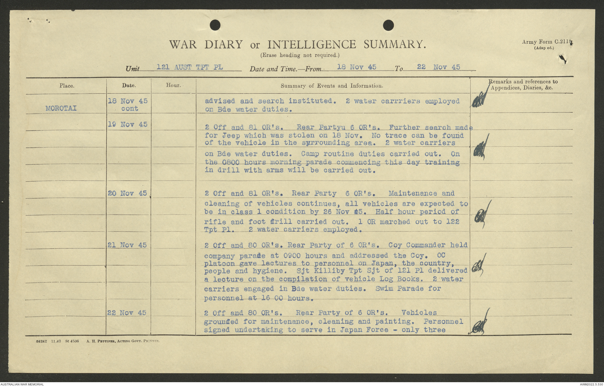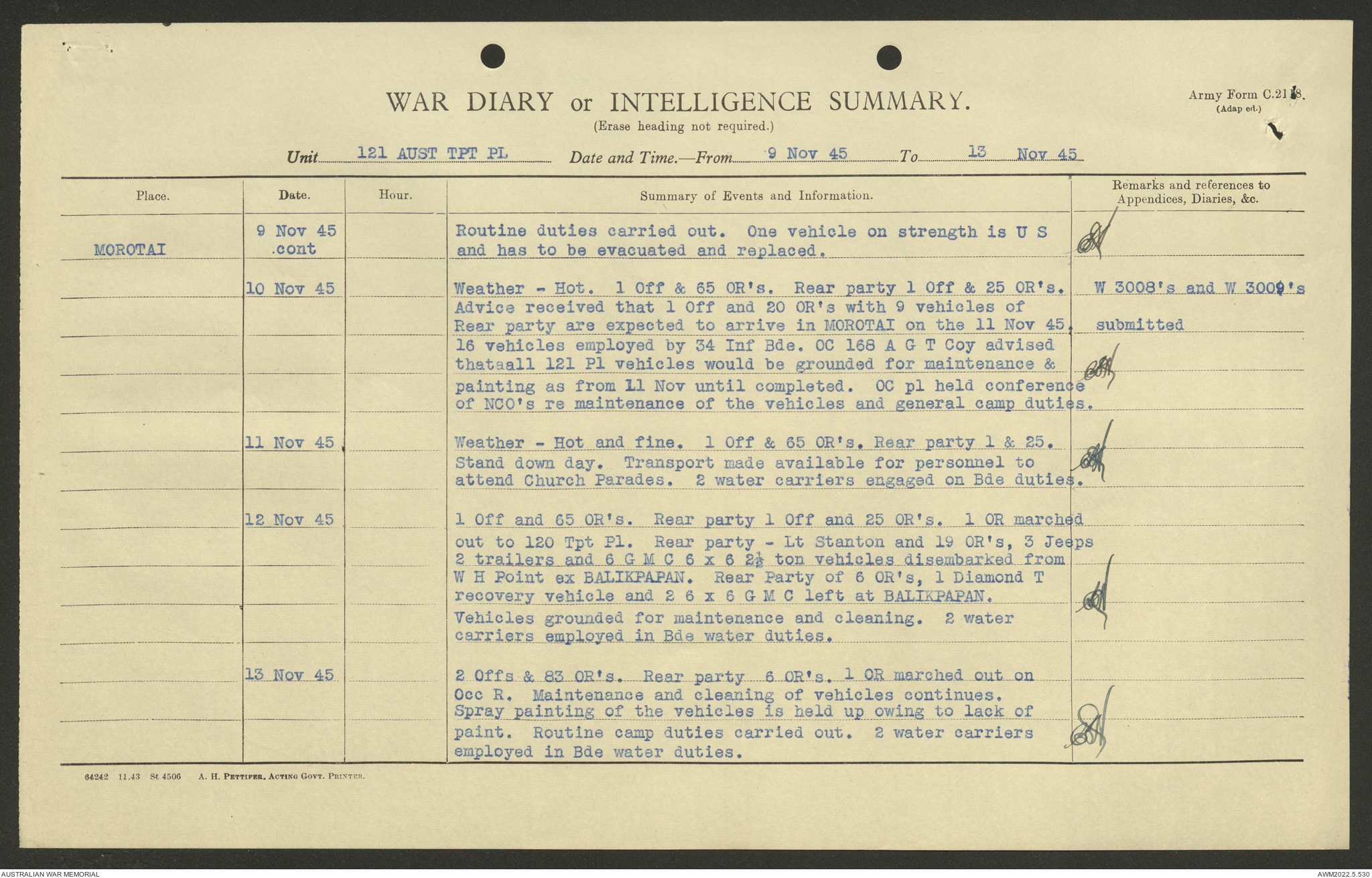 AWM52 10/4/126/1 - [Unit War Diaries, 1939-45 War] 121 Aust. [Australian] Transport Platoon, October - December 1945