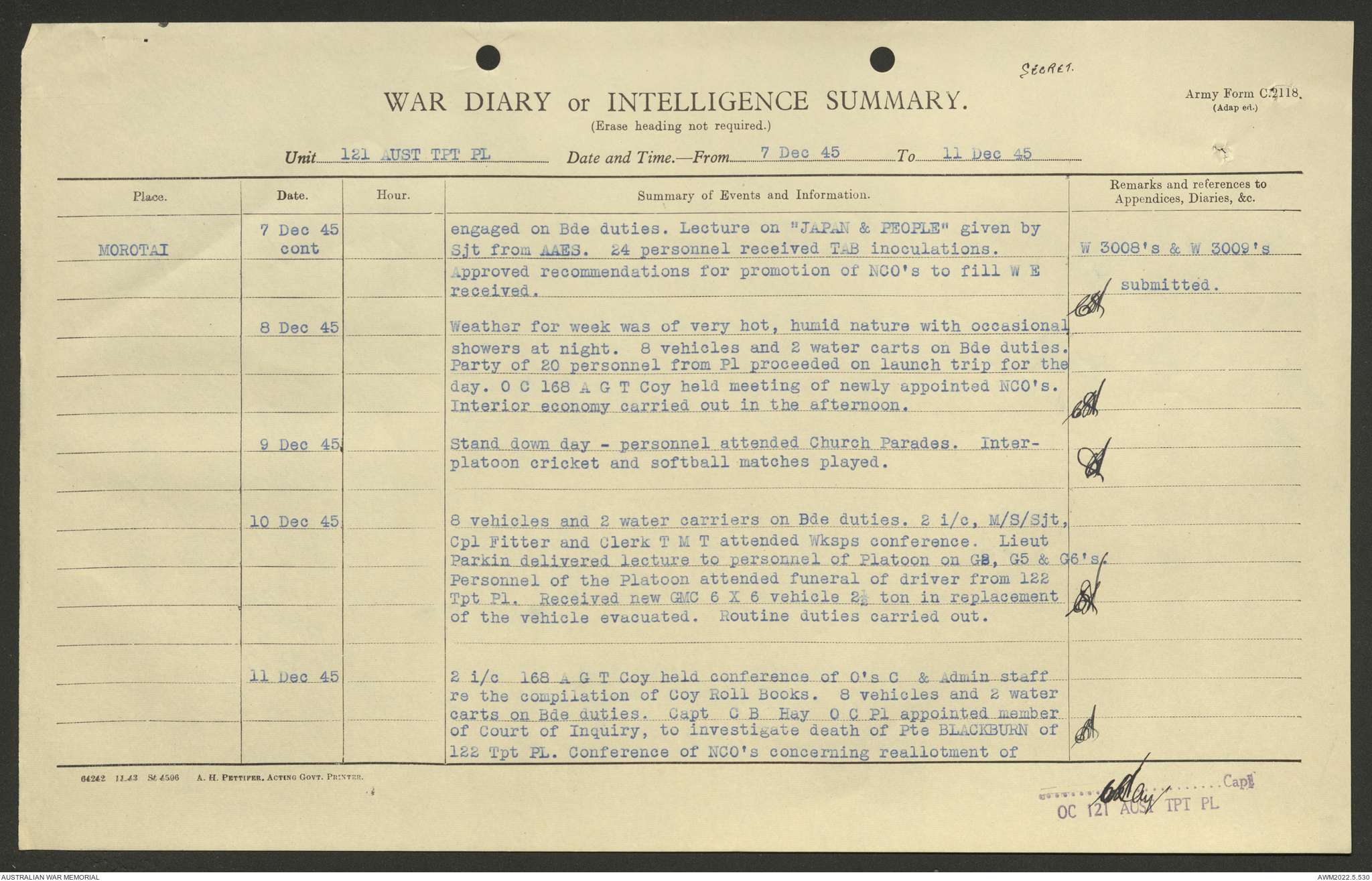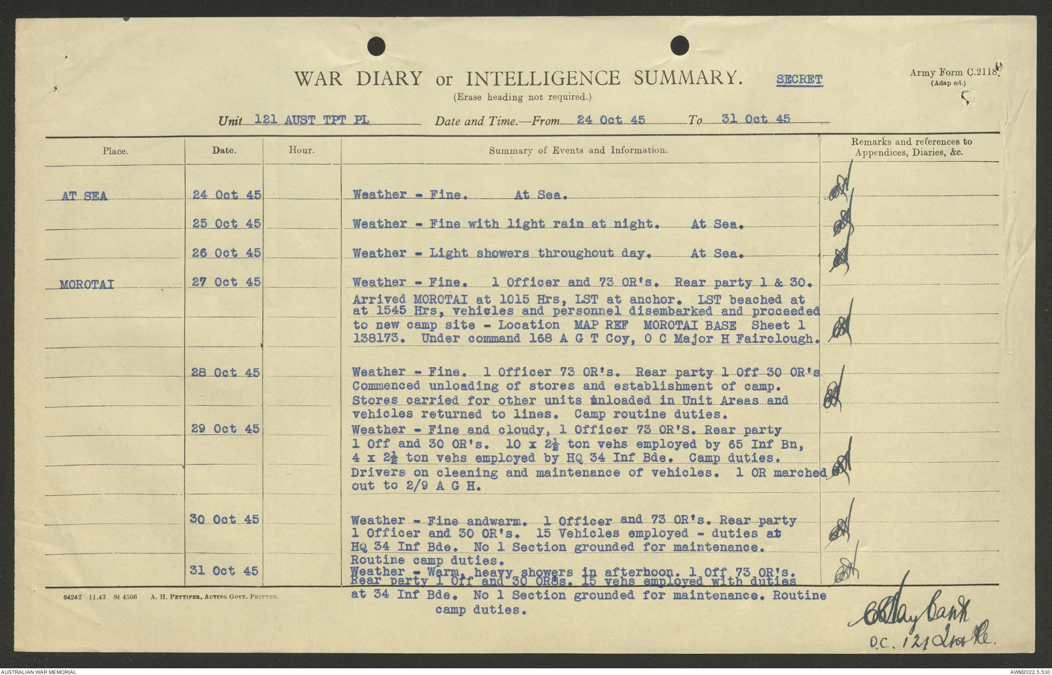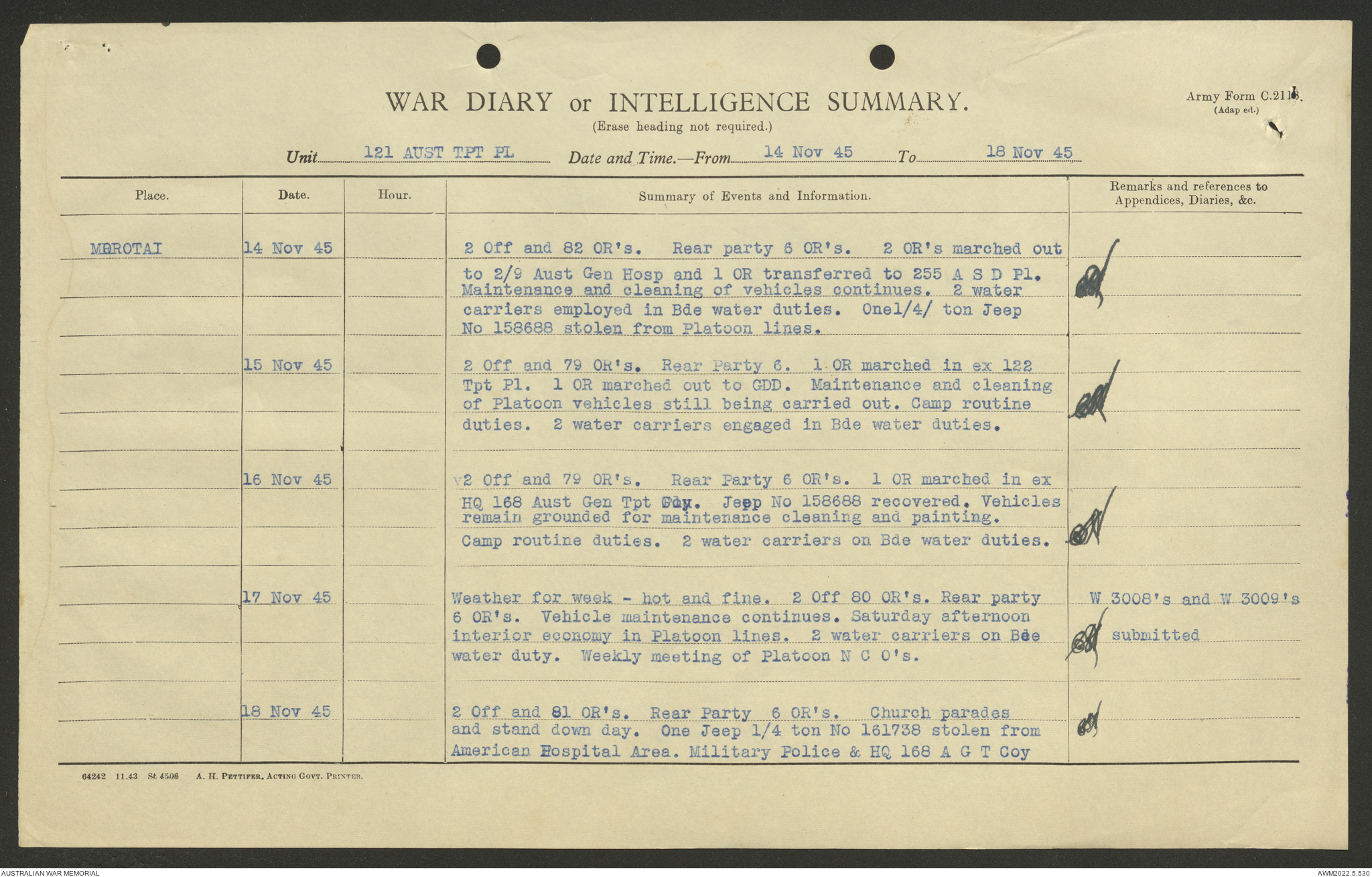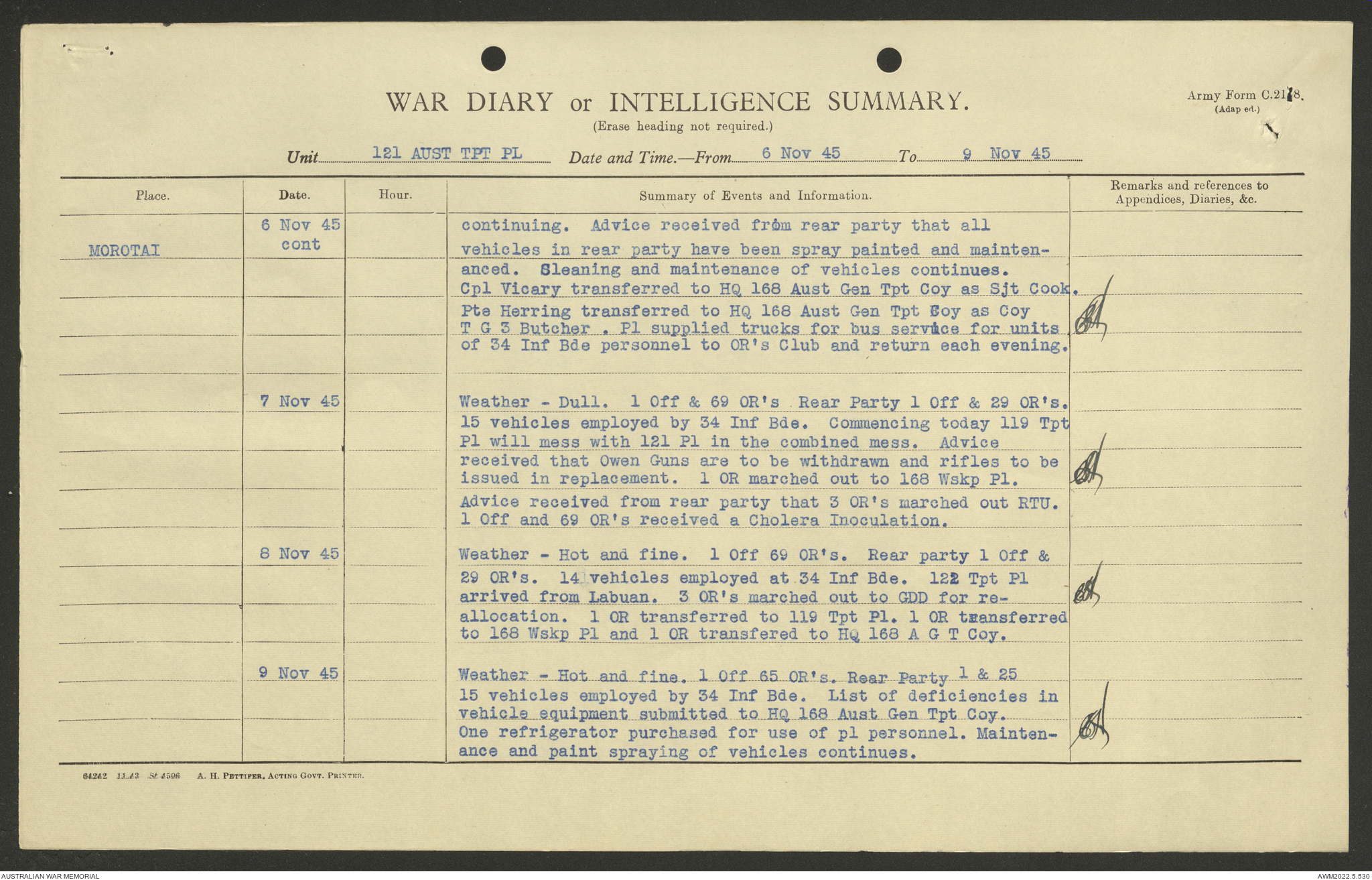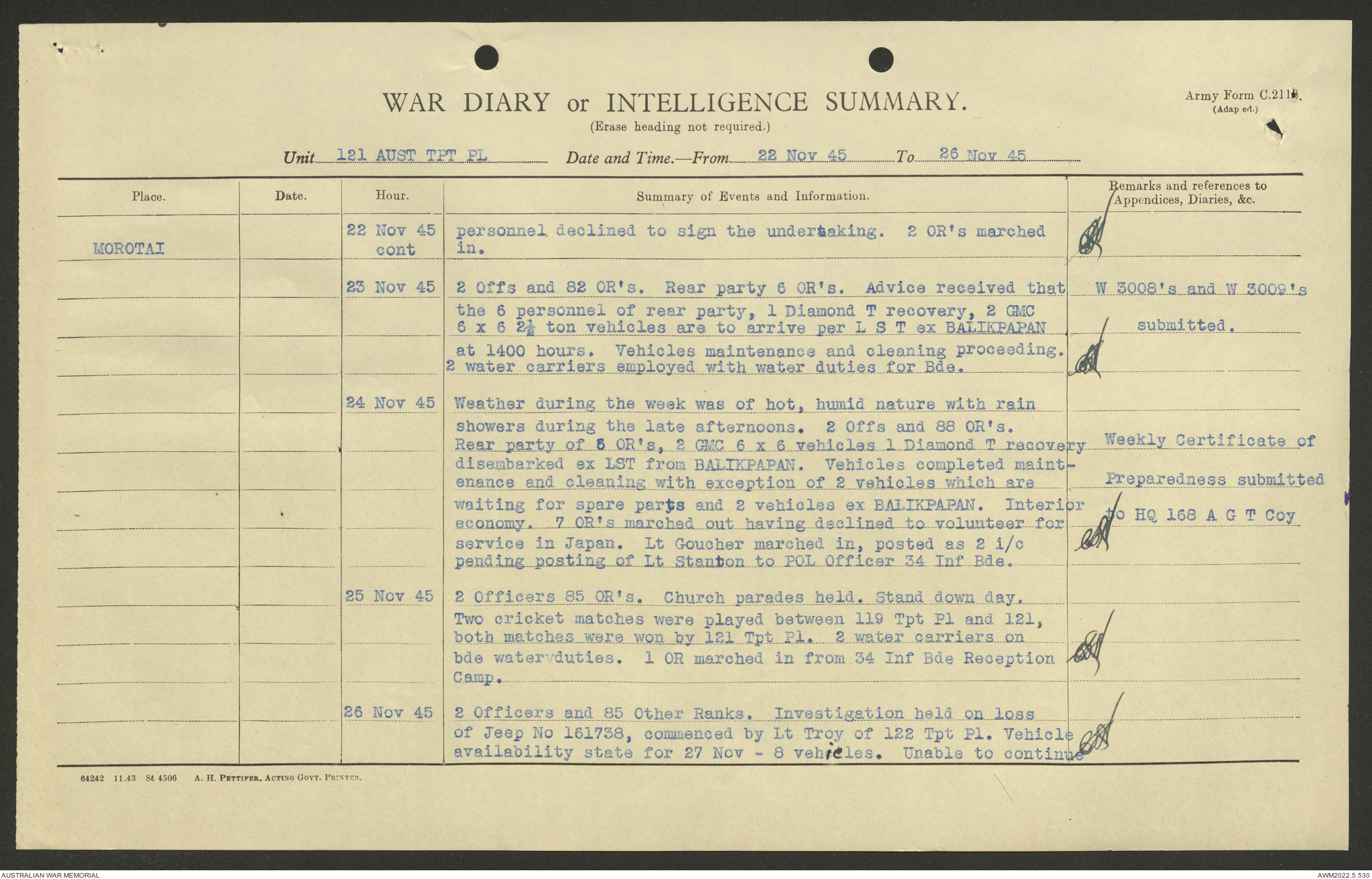 AWM52 10/4/126/1 - [Unit War Diaries, 1939-45 War] 121 Aust. [Australian] Transport Platoon, October - December 1945