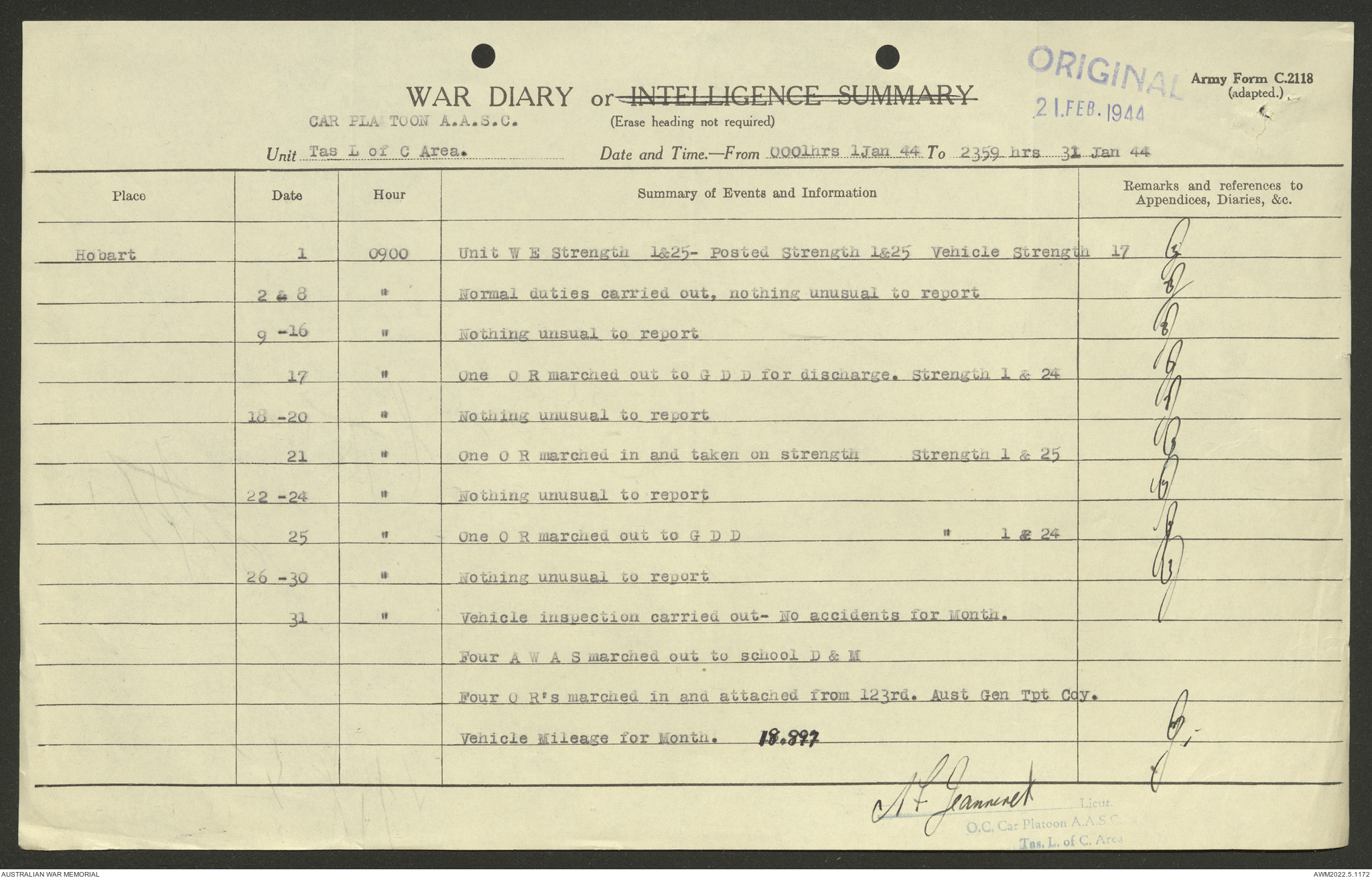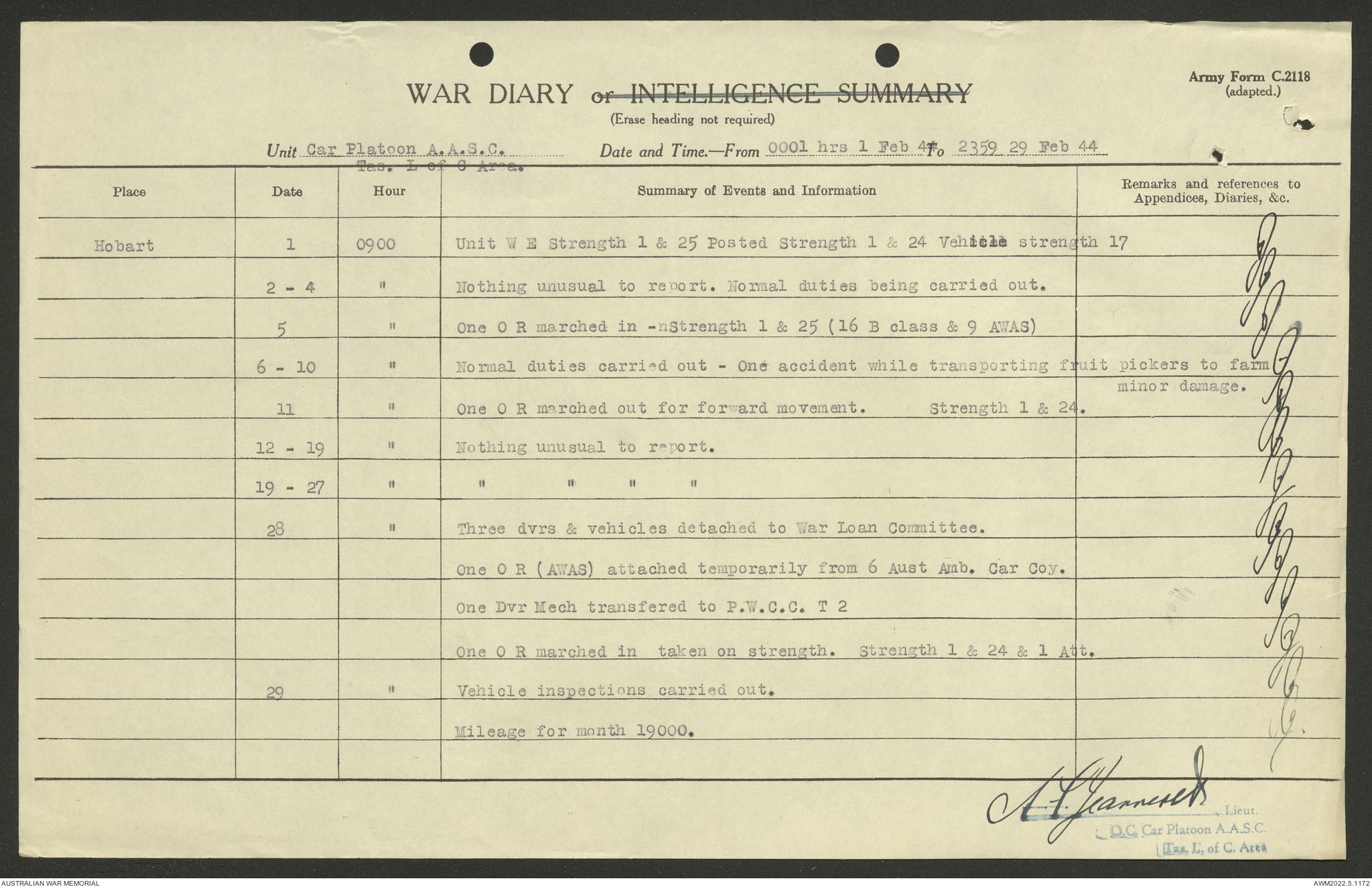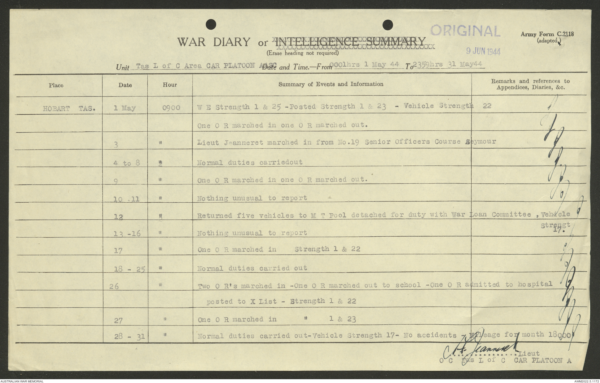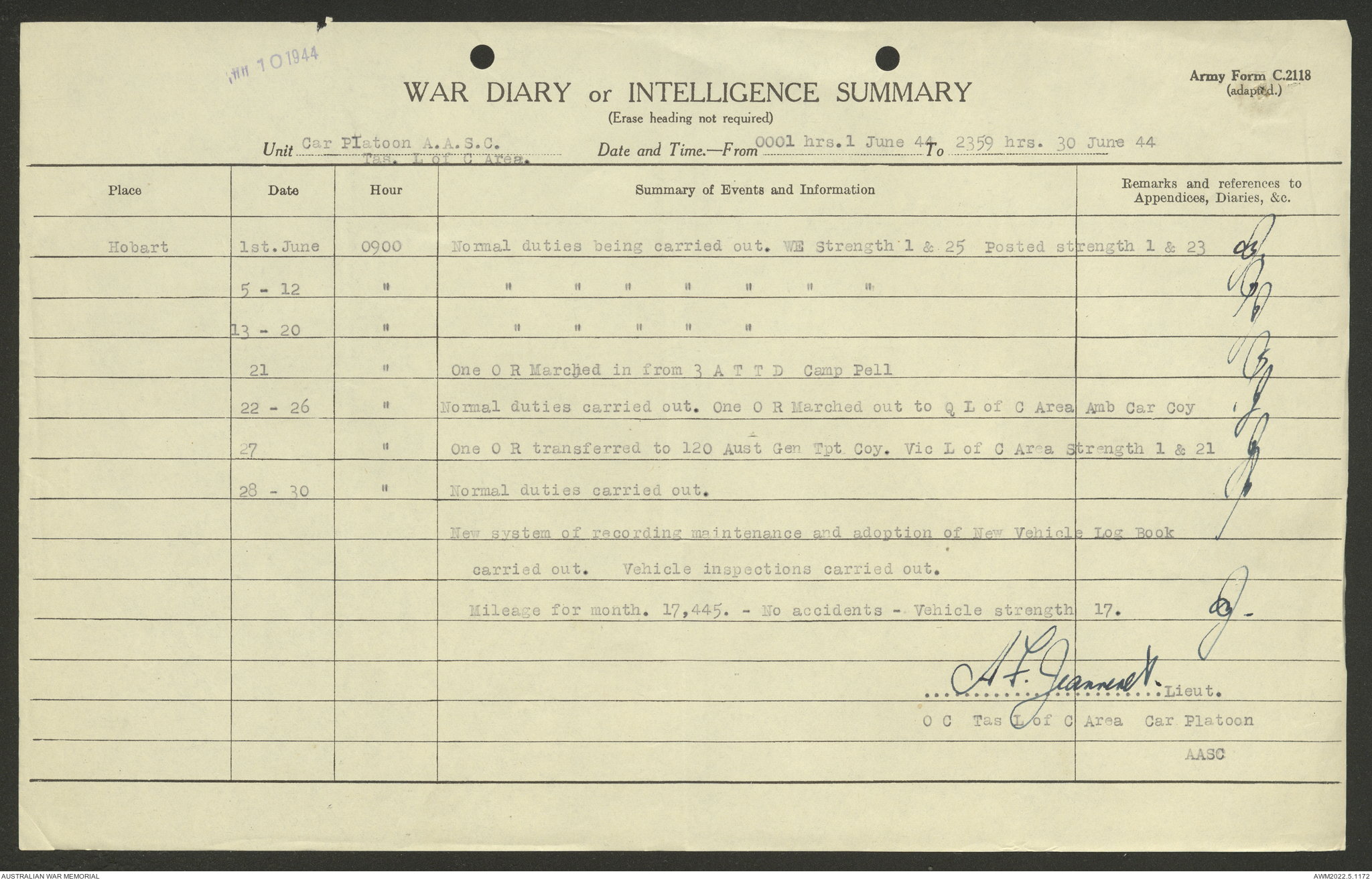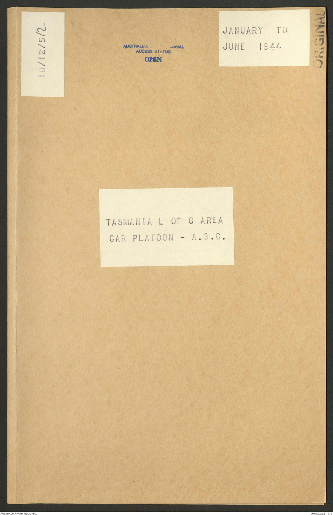AWM52 10/12/5/2 - [Unit War Diaries, 1939-45 War] Tasmania L of C [Lines of Communication] Area Command Car Company AASC [Australian Army Service Corps] January - June 1944