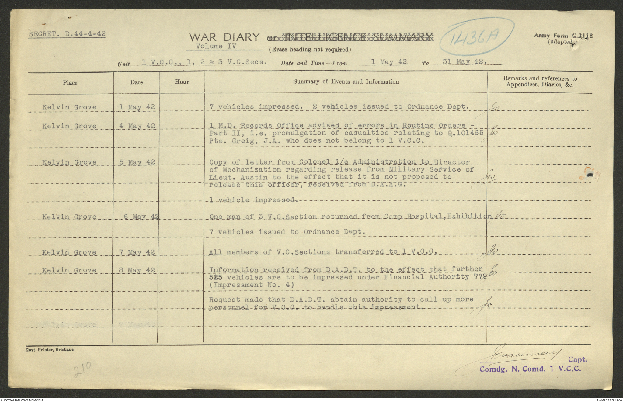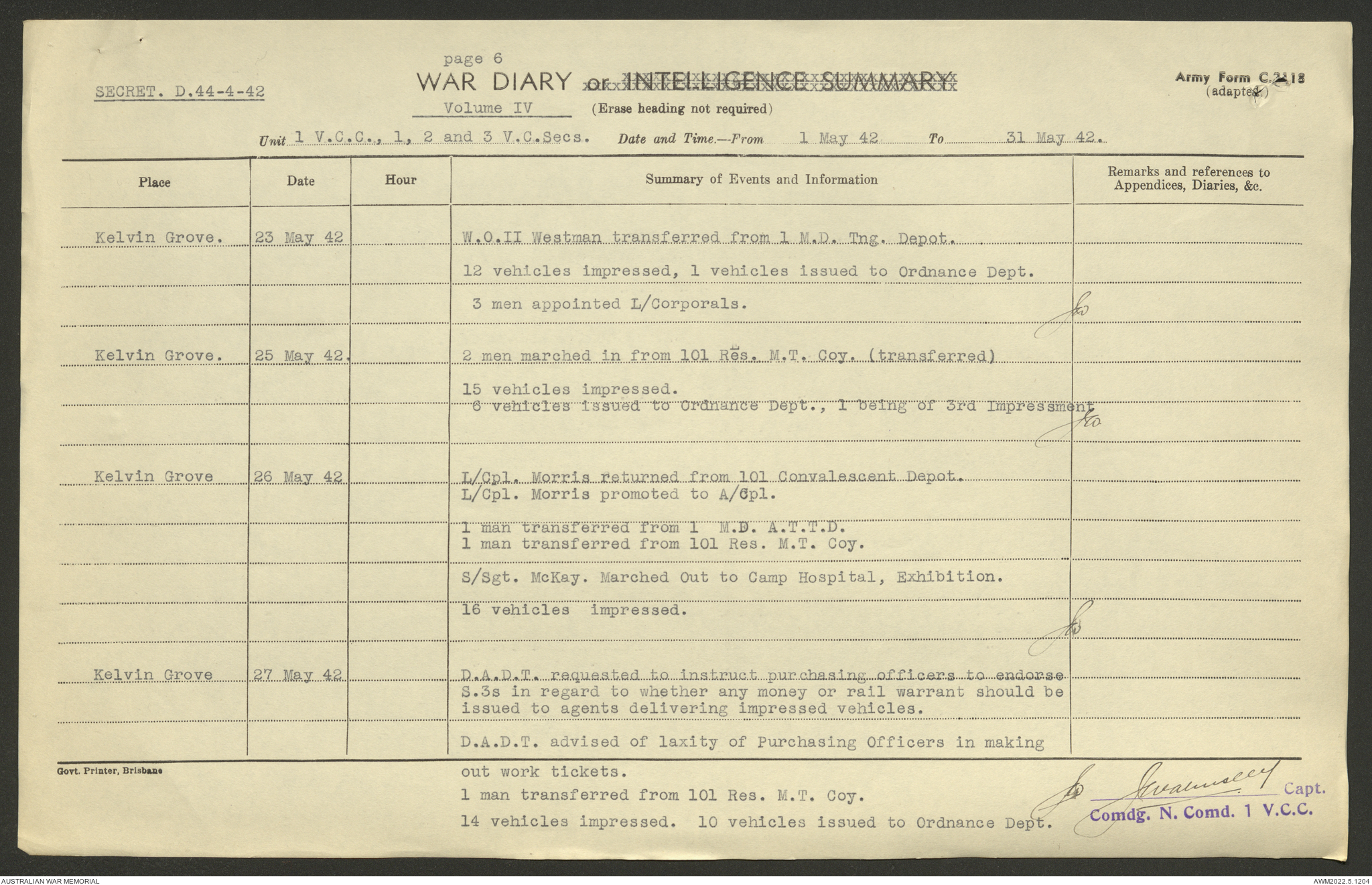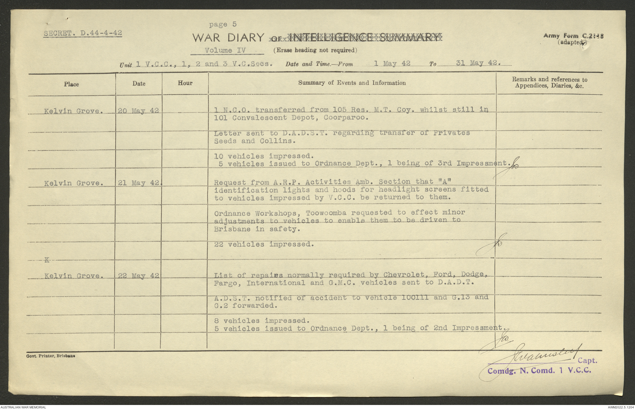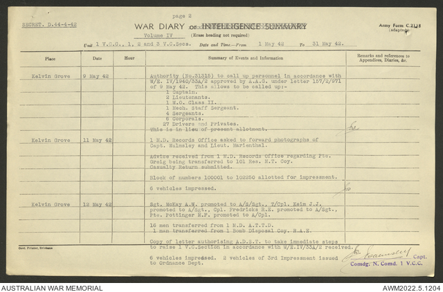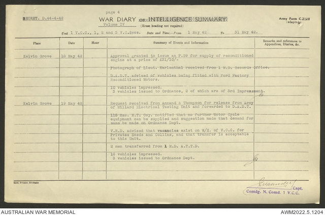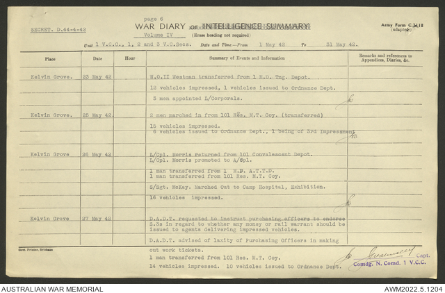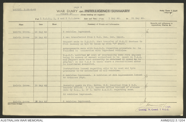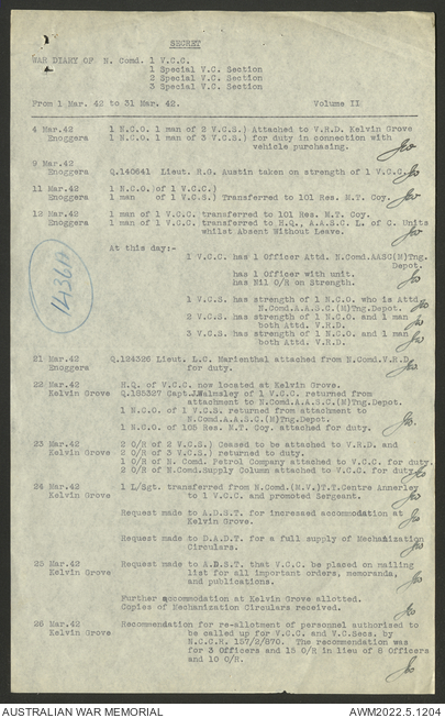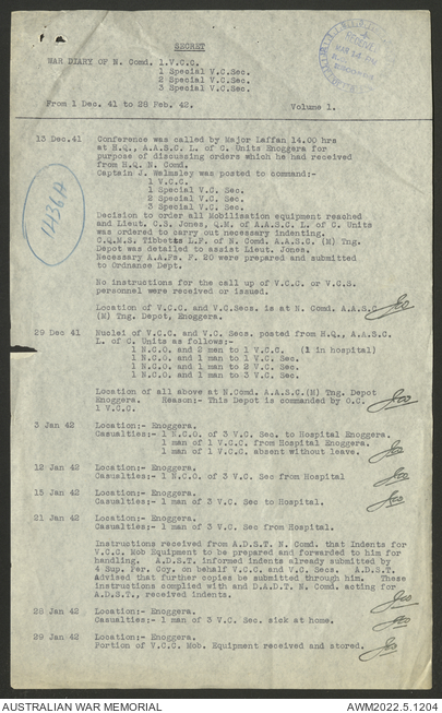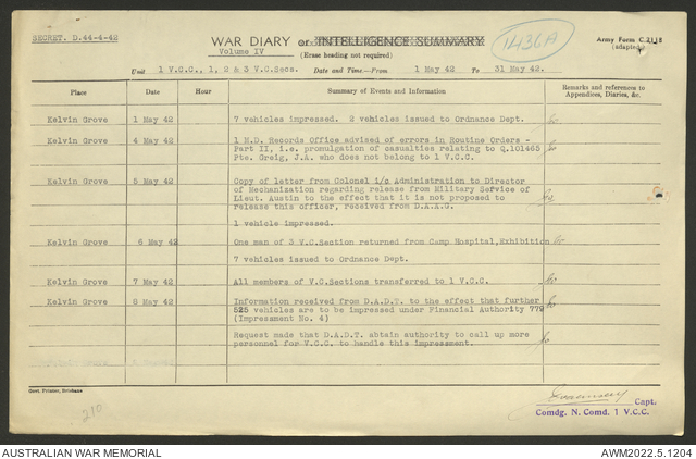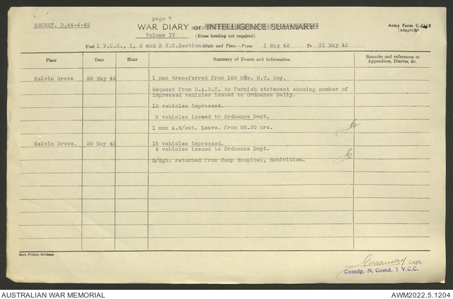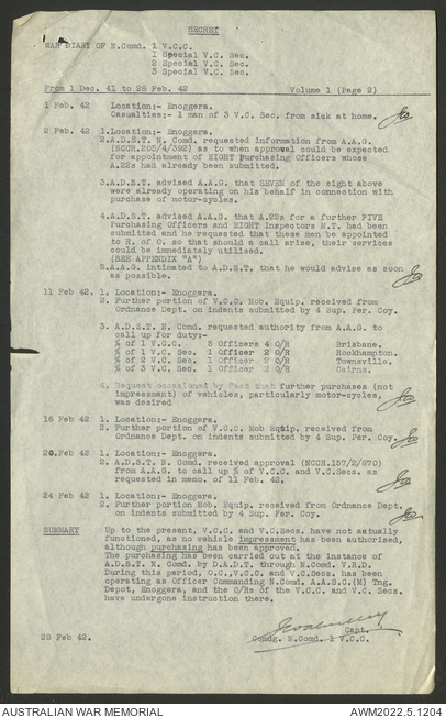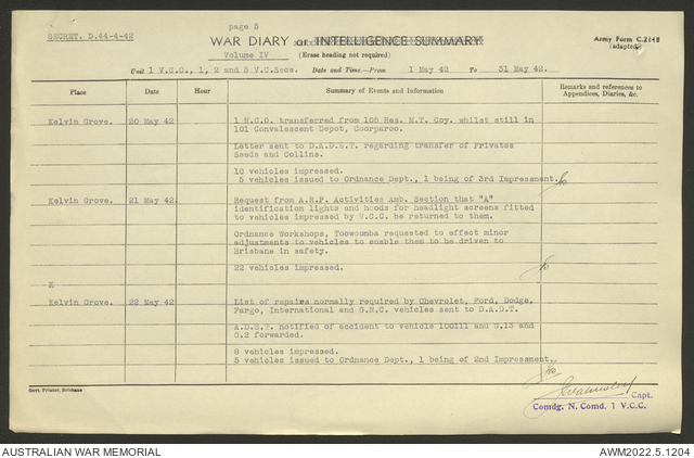 AWM52 10/15/1/1 - [Unit War Diaries, 1939-45 War] 1 Australian Vehicle Collecting Centre, December 1941 - May 1942