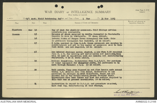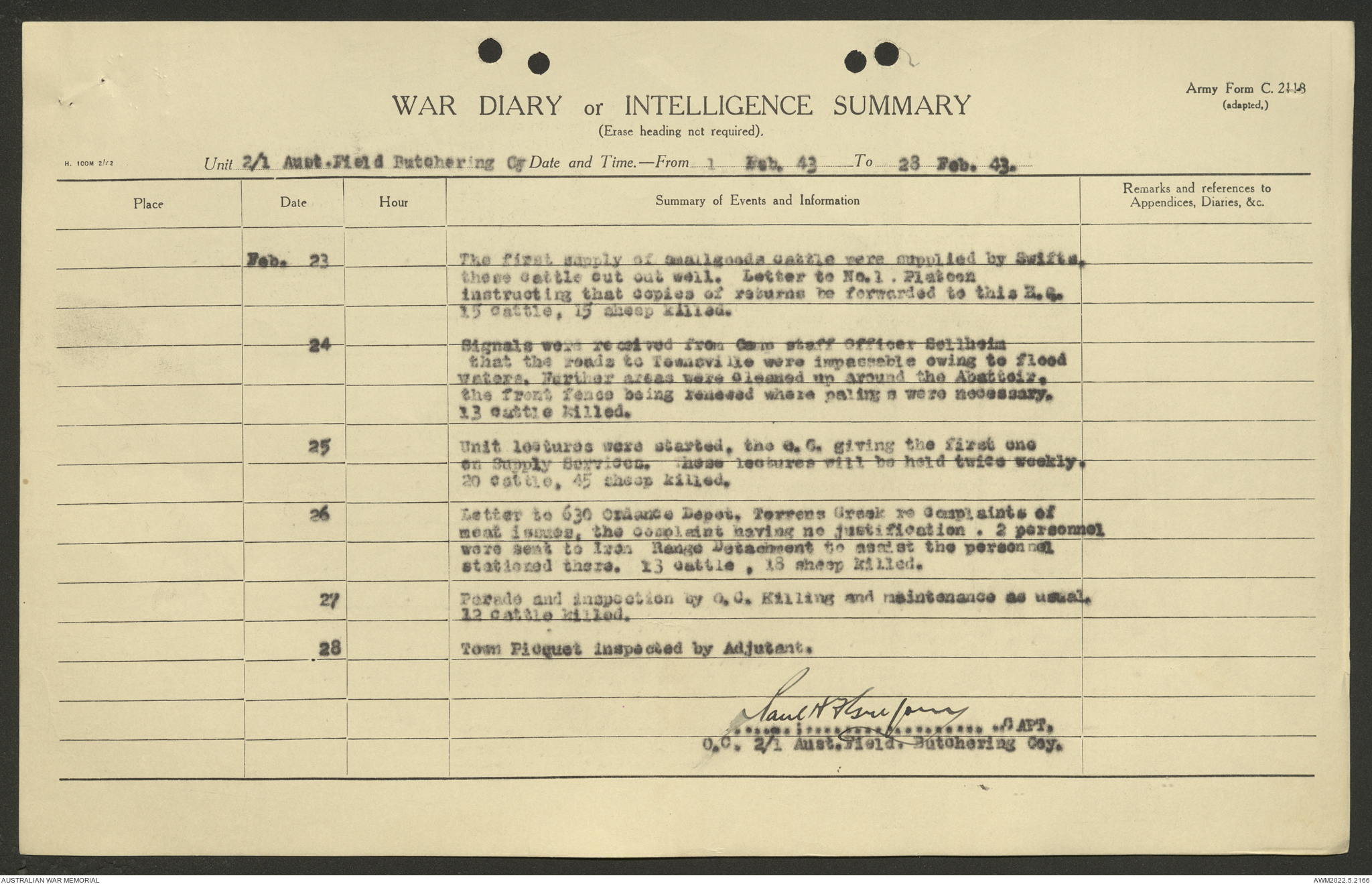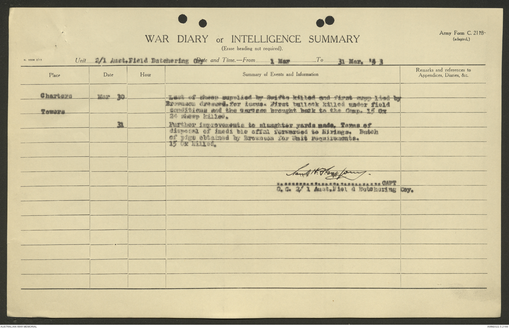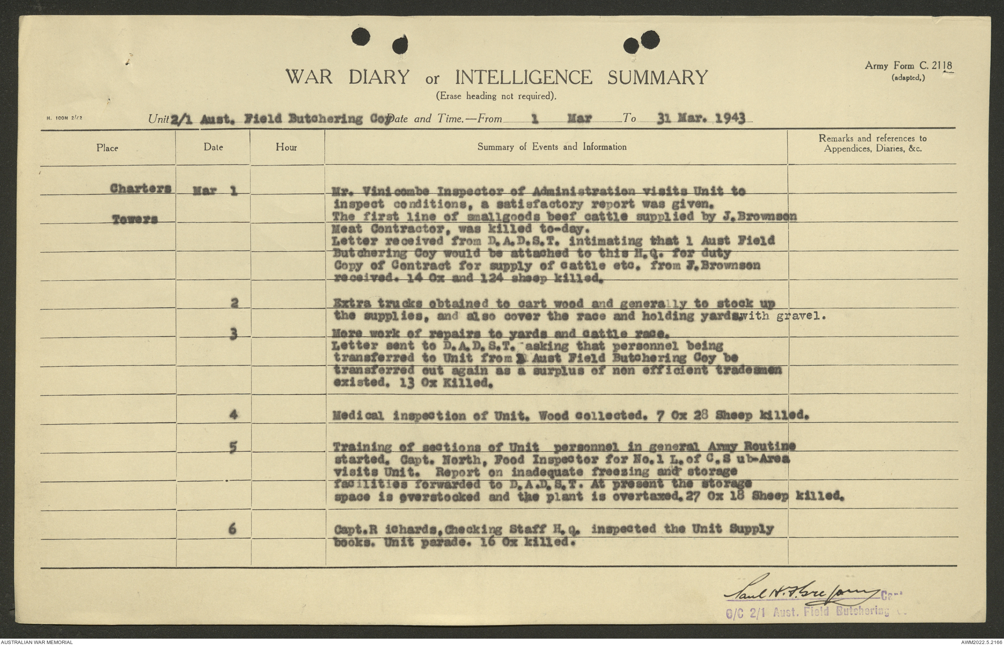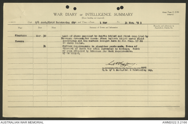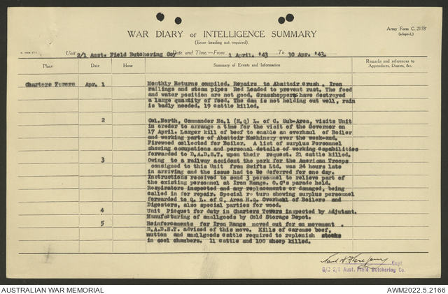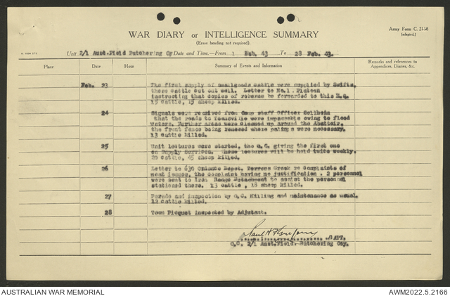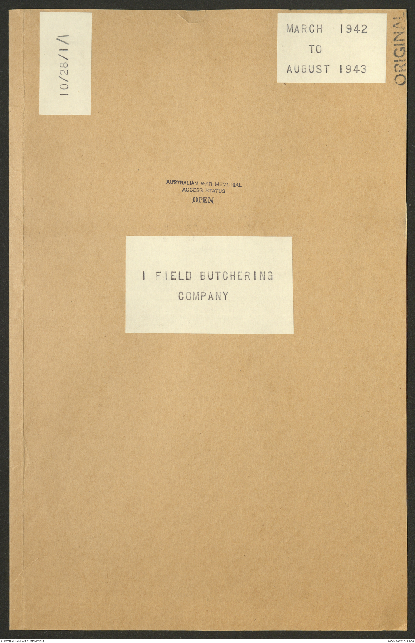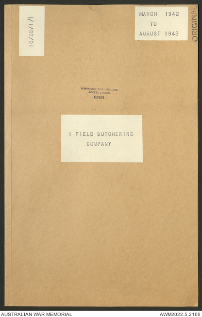 AWM52 10/28/1/1 - [Unit War Diaries, 1939-45 War] 1 Australian Field Butchering Company, March 1942 - August 1943
