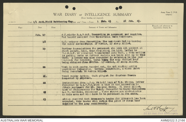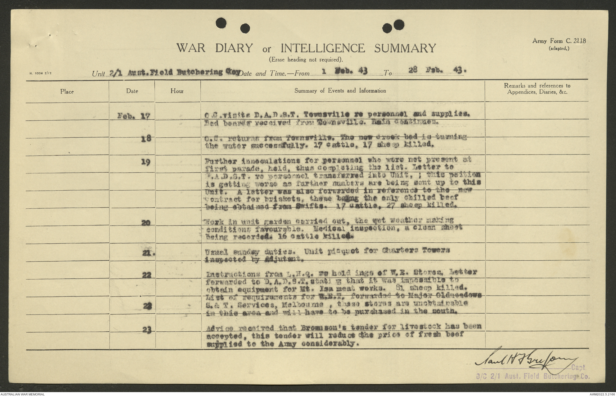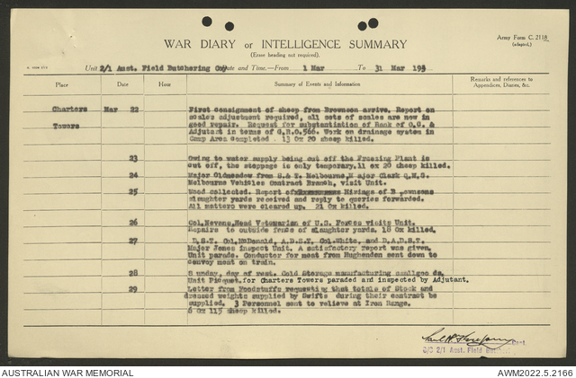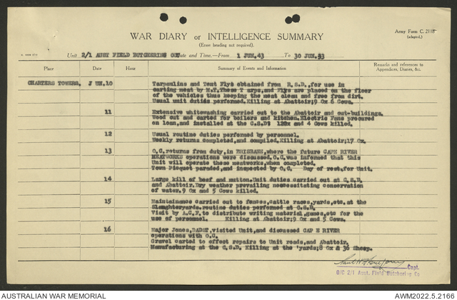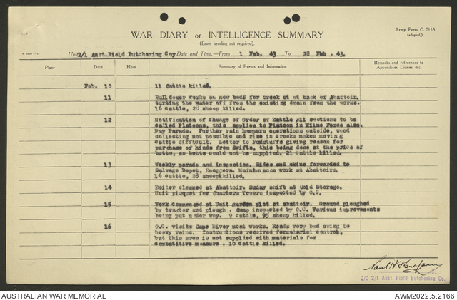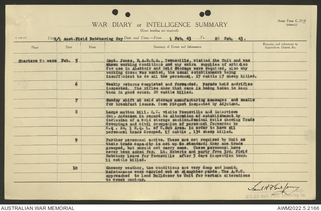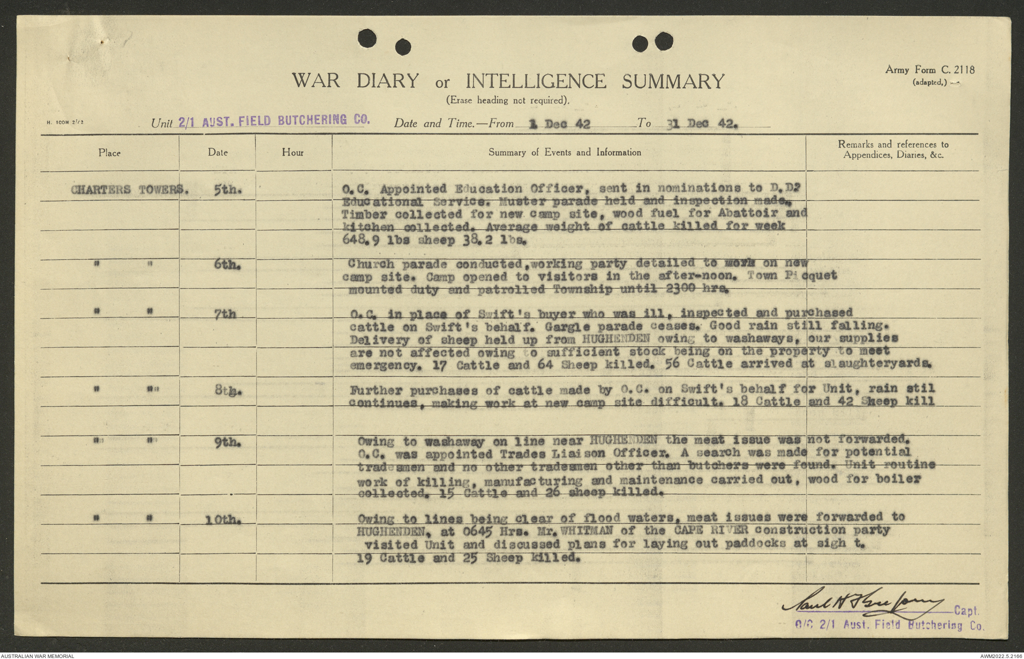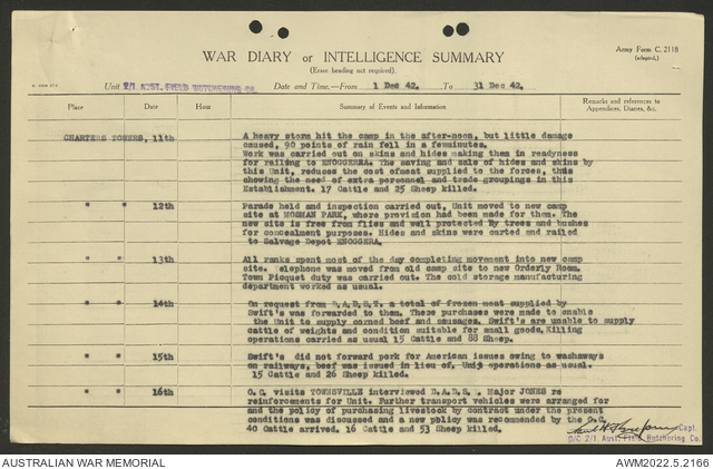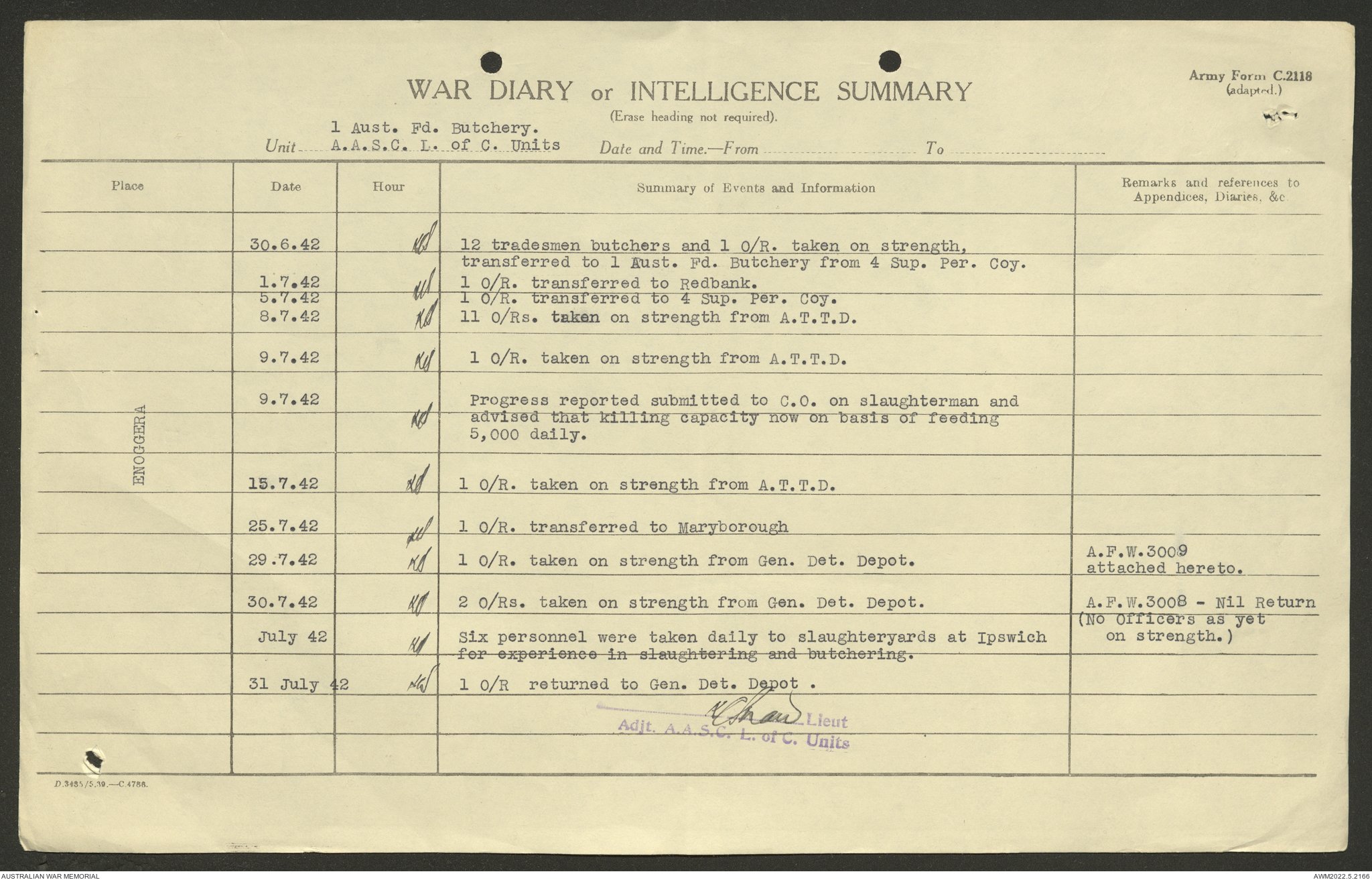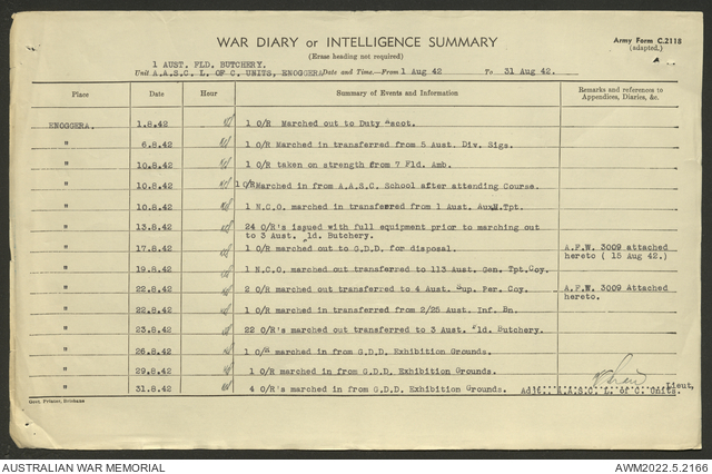 AWM52 10/28/1/1 - [Unit War Diaries, 1939-45 War] 1 Australian Field Butchering Company, March 1942 - August 1943