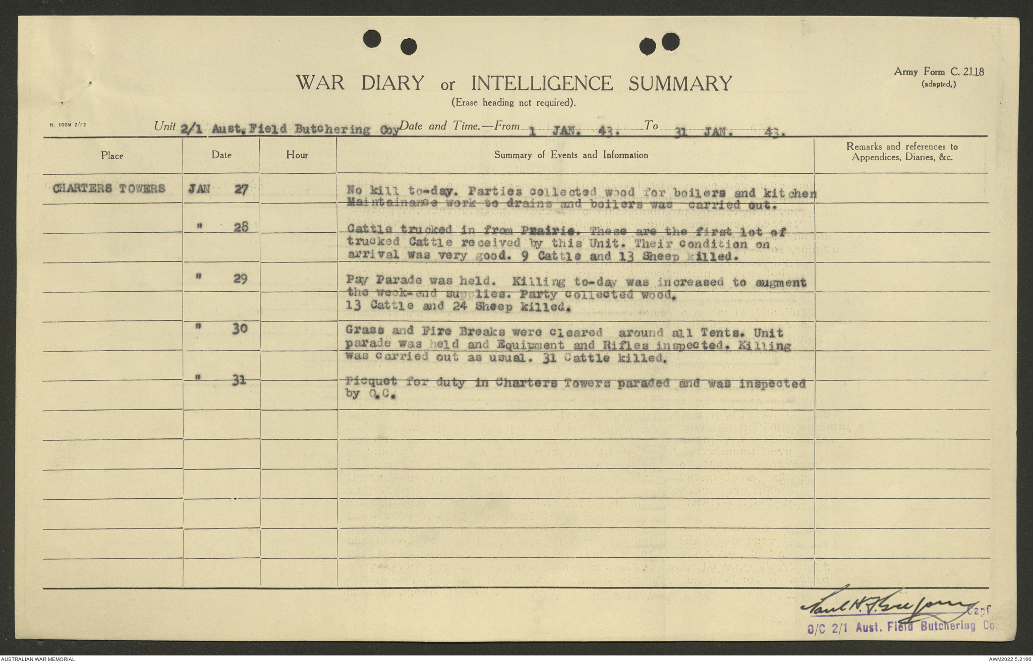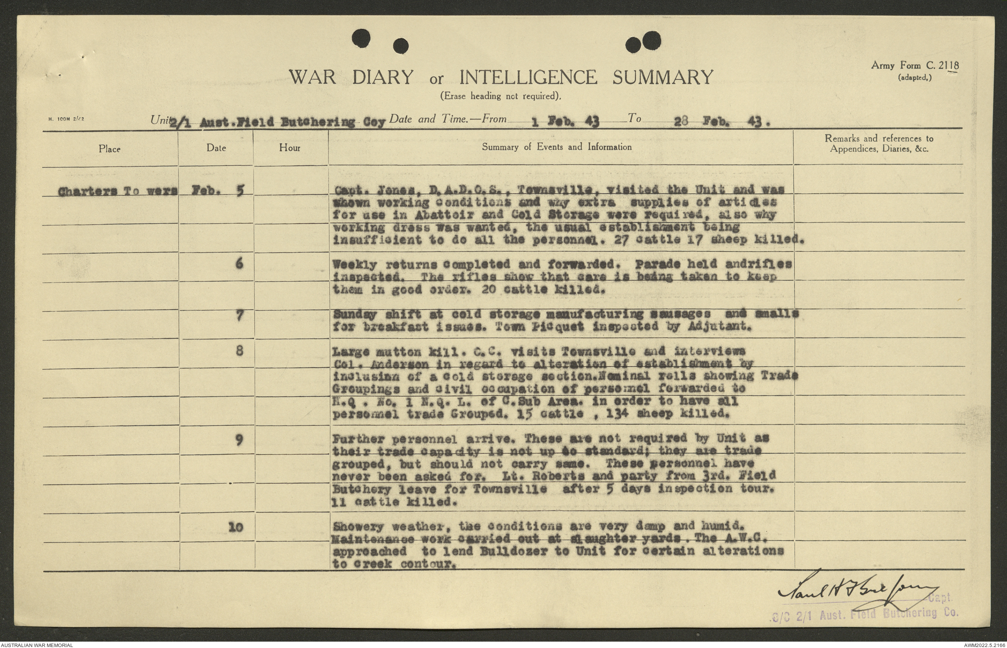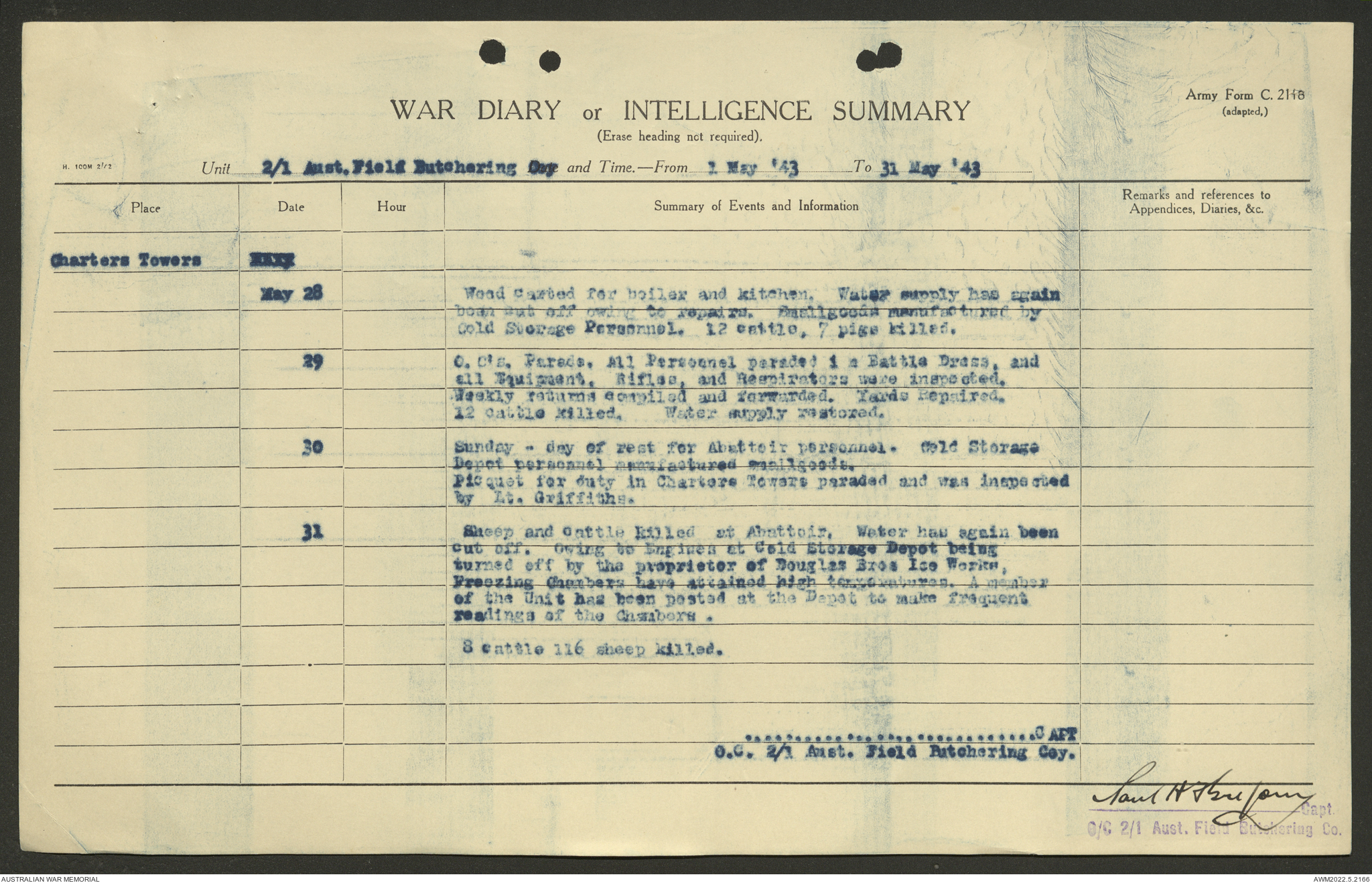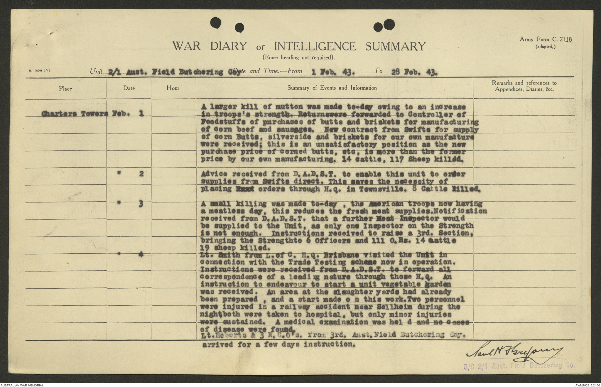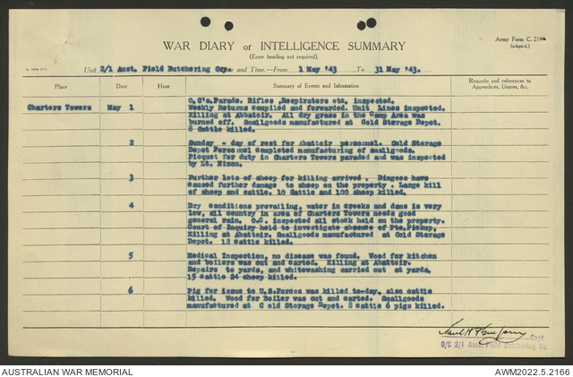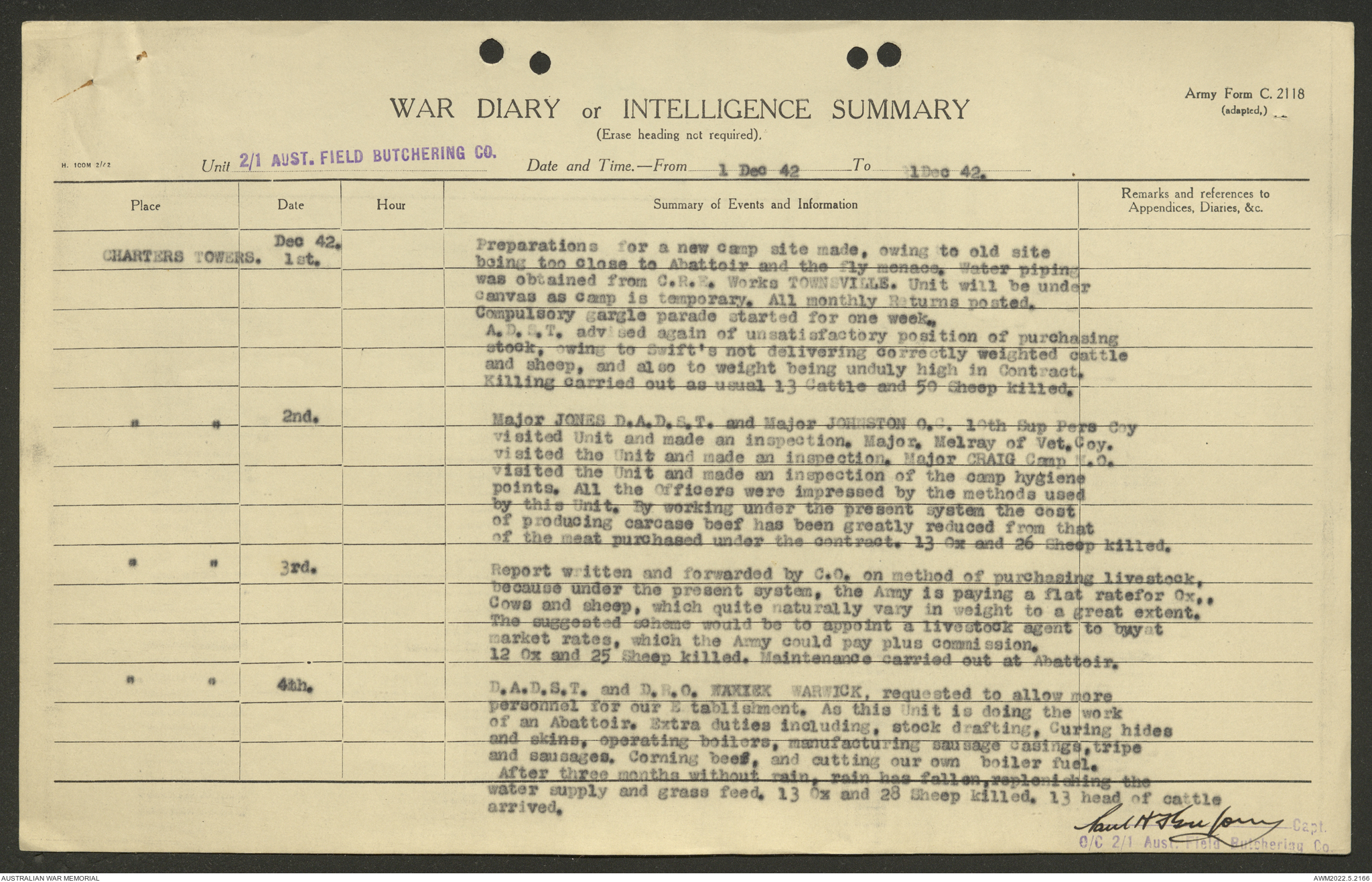 AWM52 10/28/1/1 - [Unit War Diaries, 1939-45 War] 1 Australian Field Butchering Company, March 1942 - August 1943