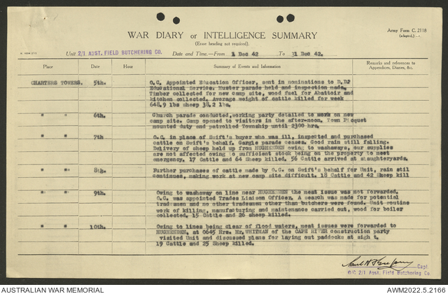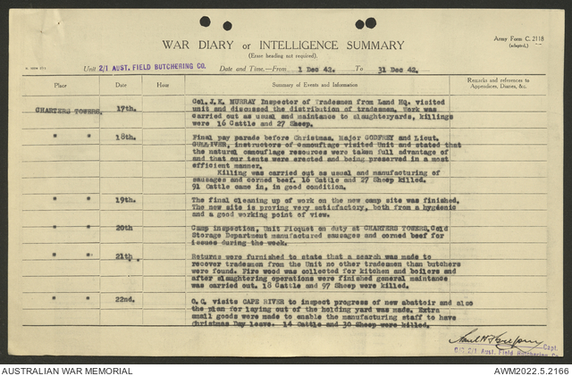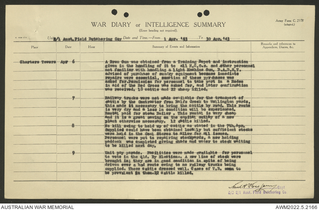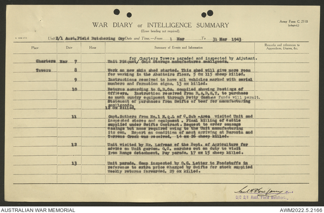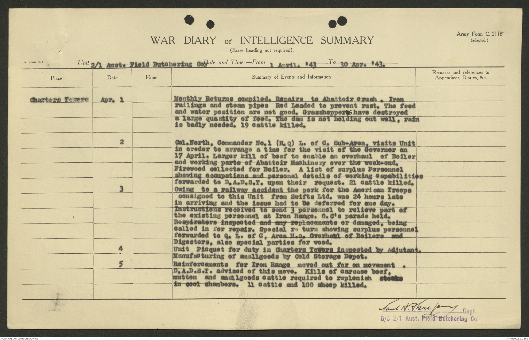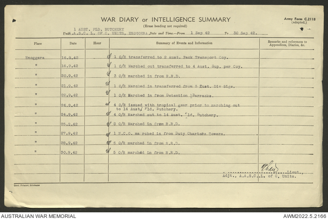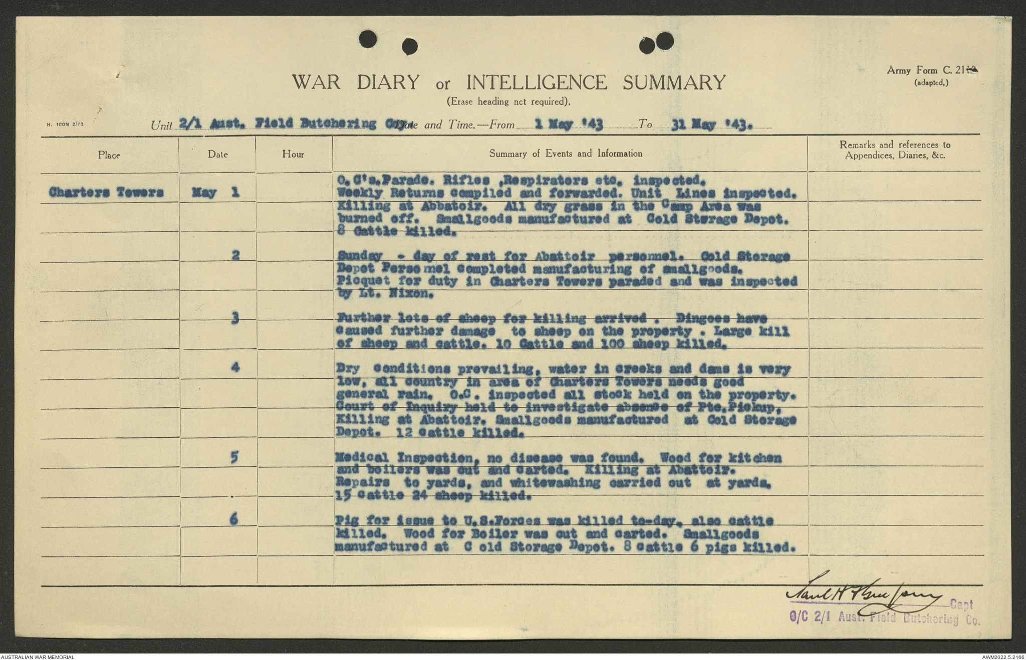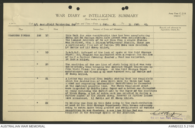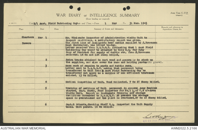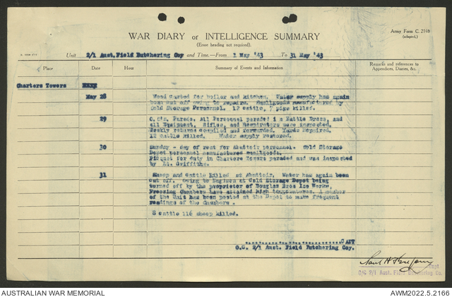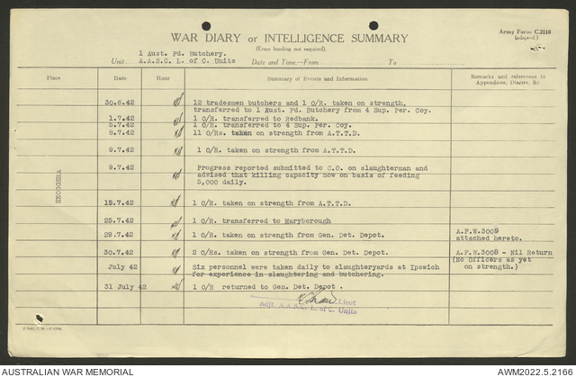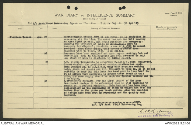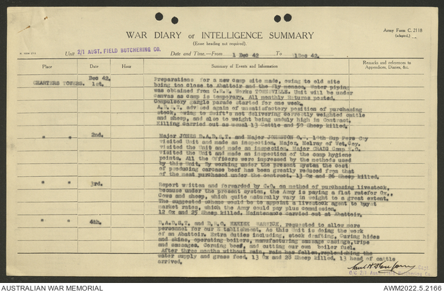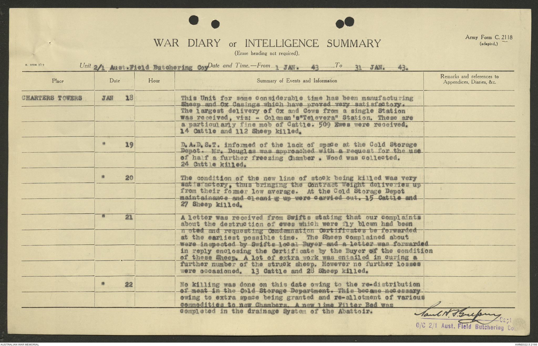 AWM52 10/28/1/1 - [Unit War Diaries, 1939-45 War] 1 Australian Field Butchering Company, March 1942 - August 1943