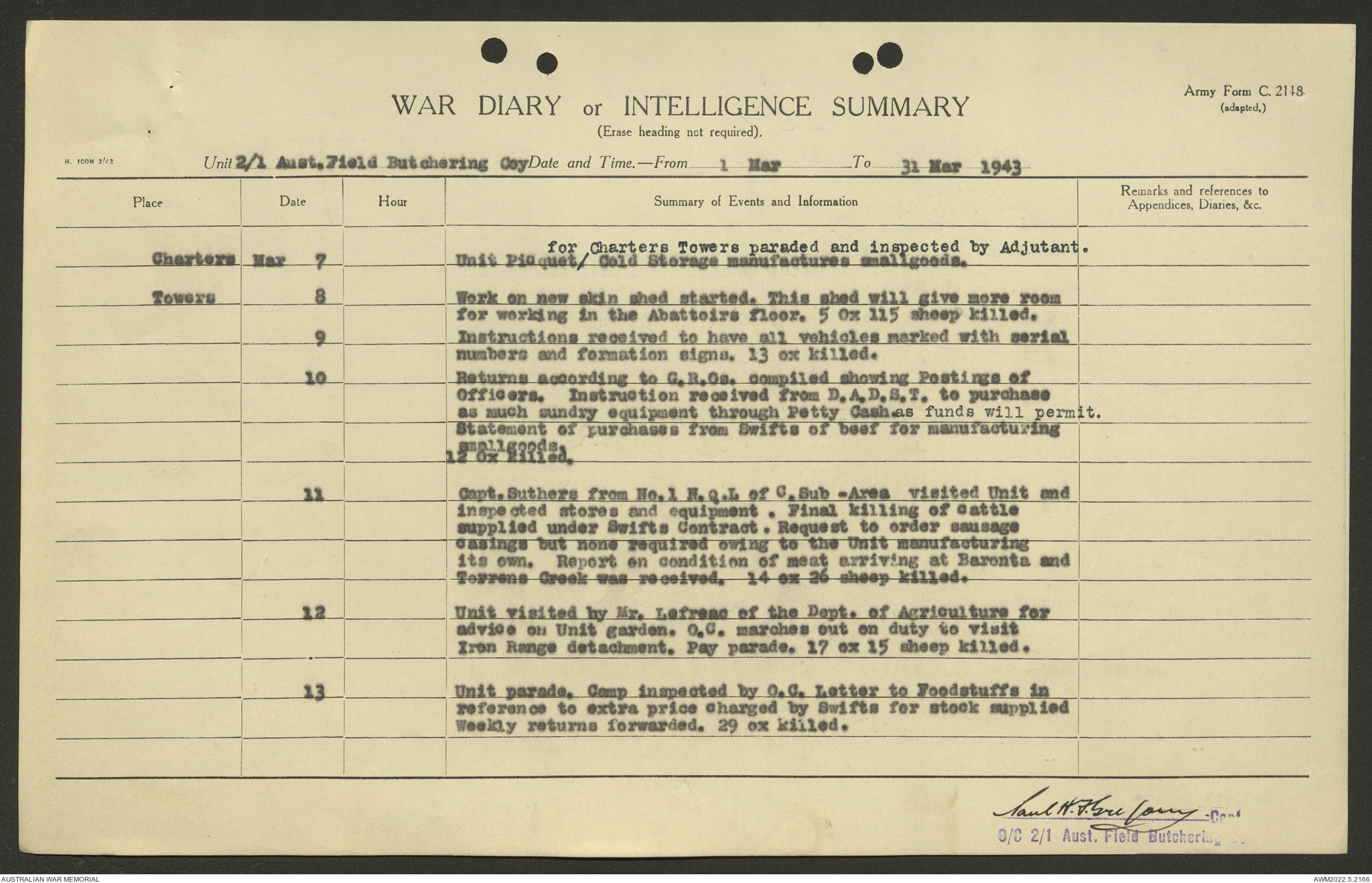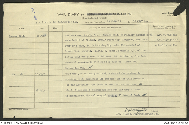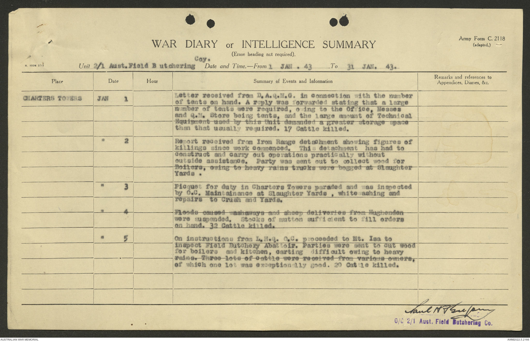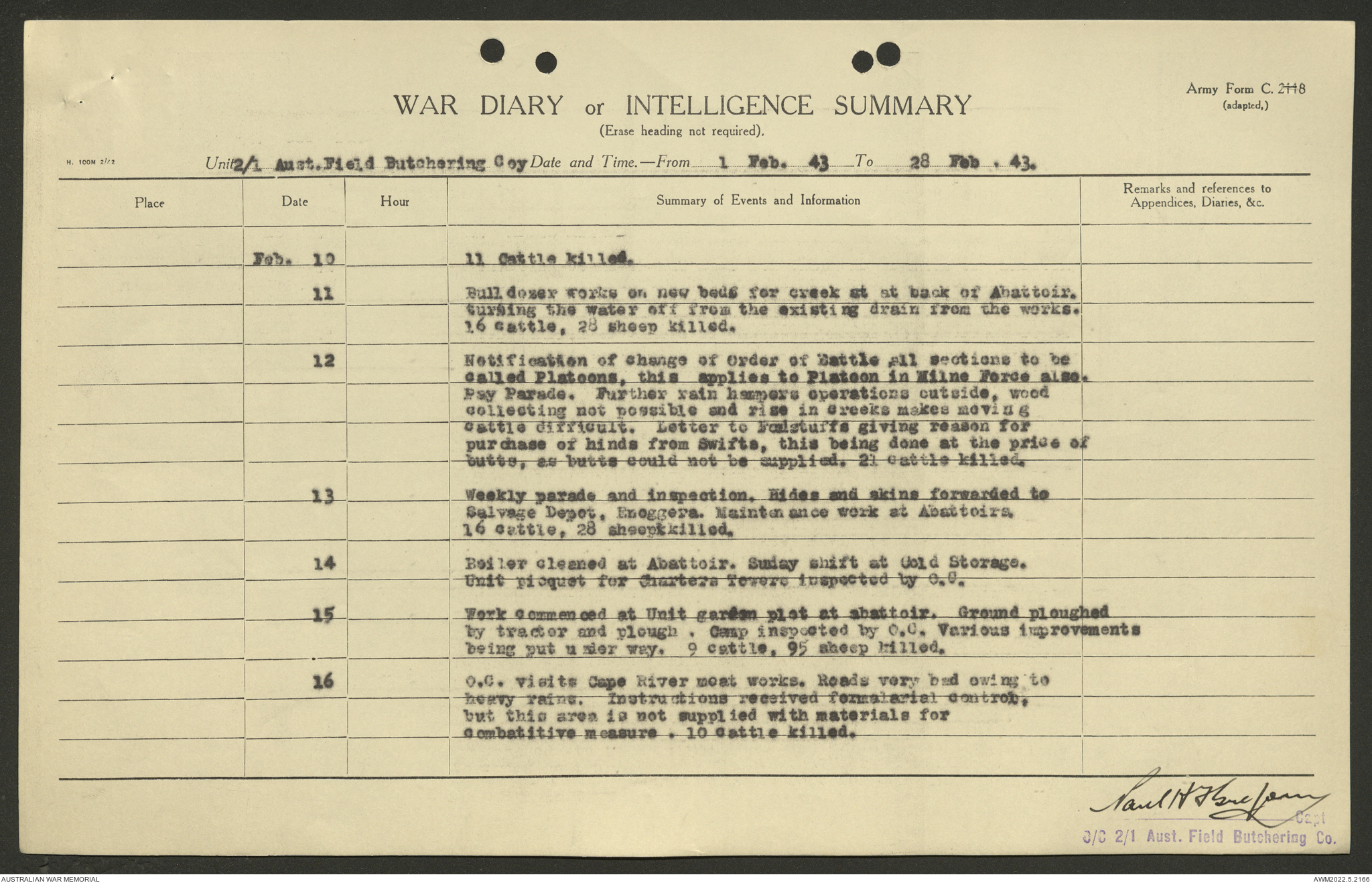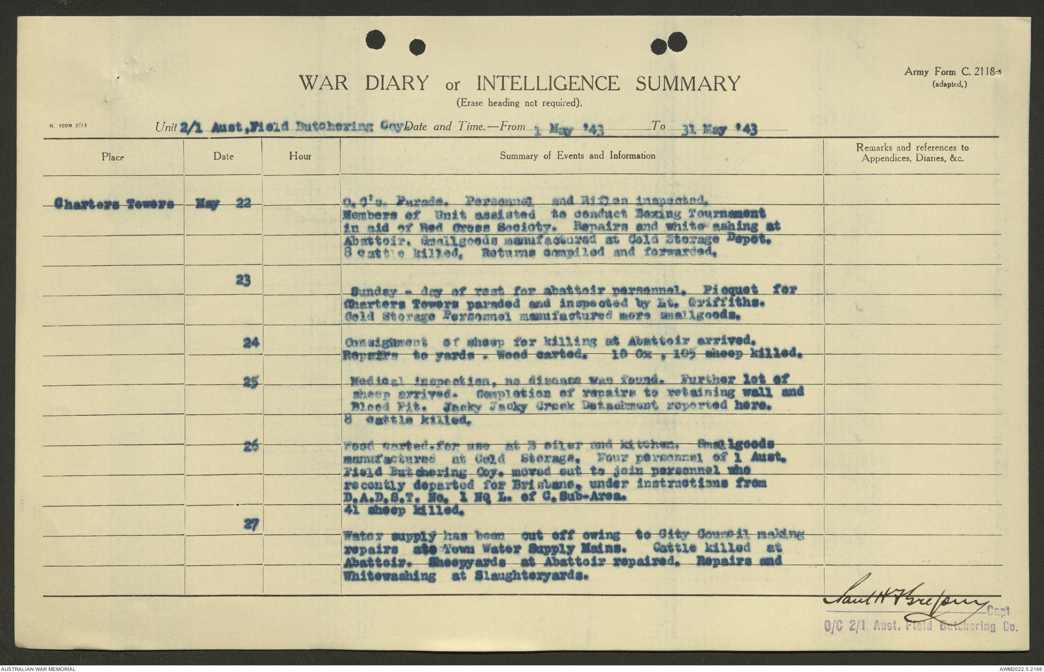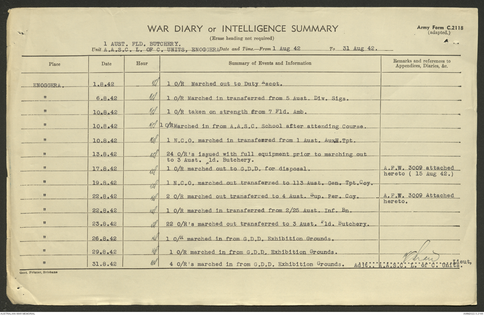 AWM52 10/28/1/1 - [Unit War Diaries, 1939-45 War] 1 Australian Field Butchering Company, March 1942 - August 1943