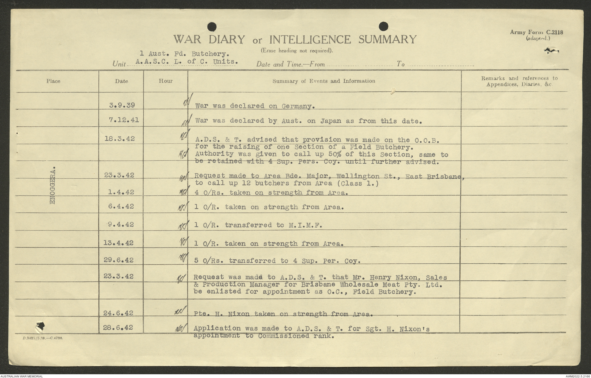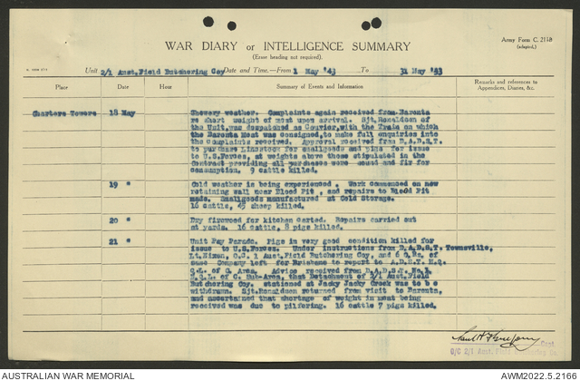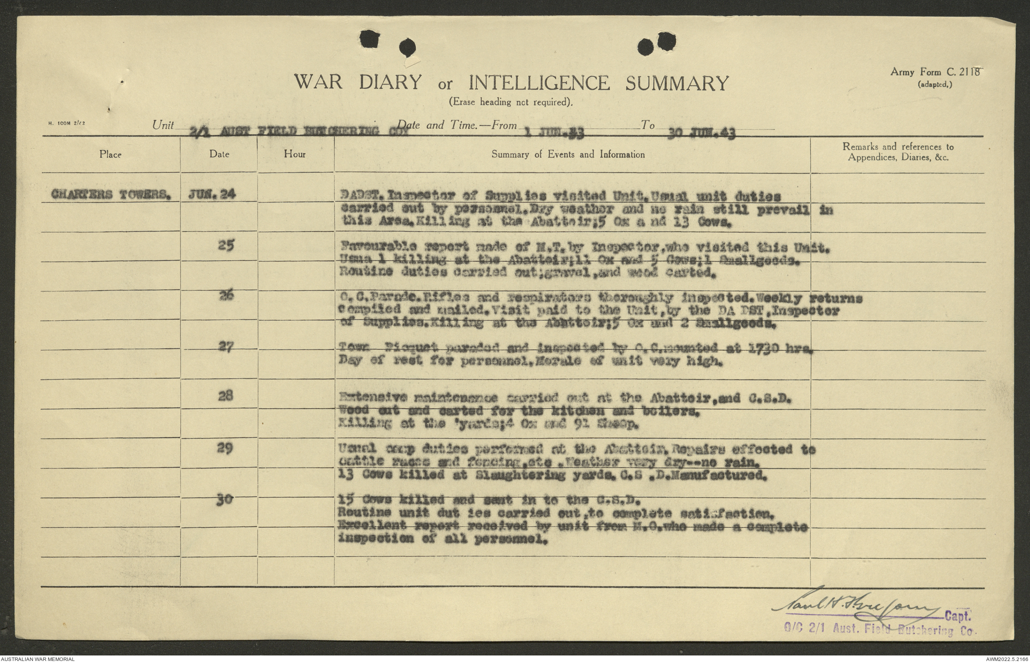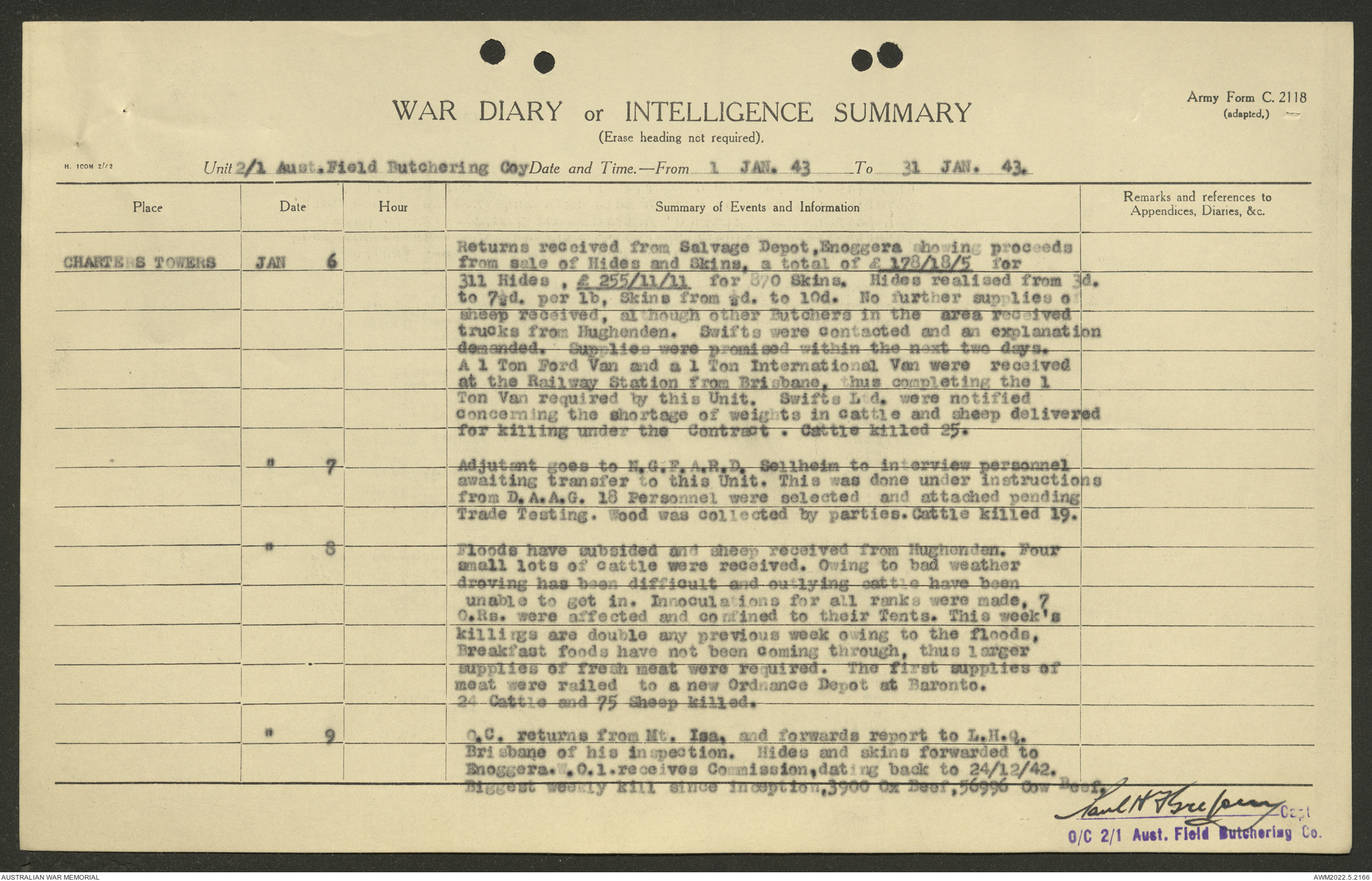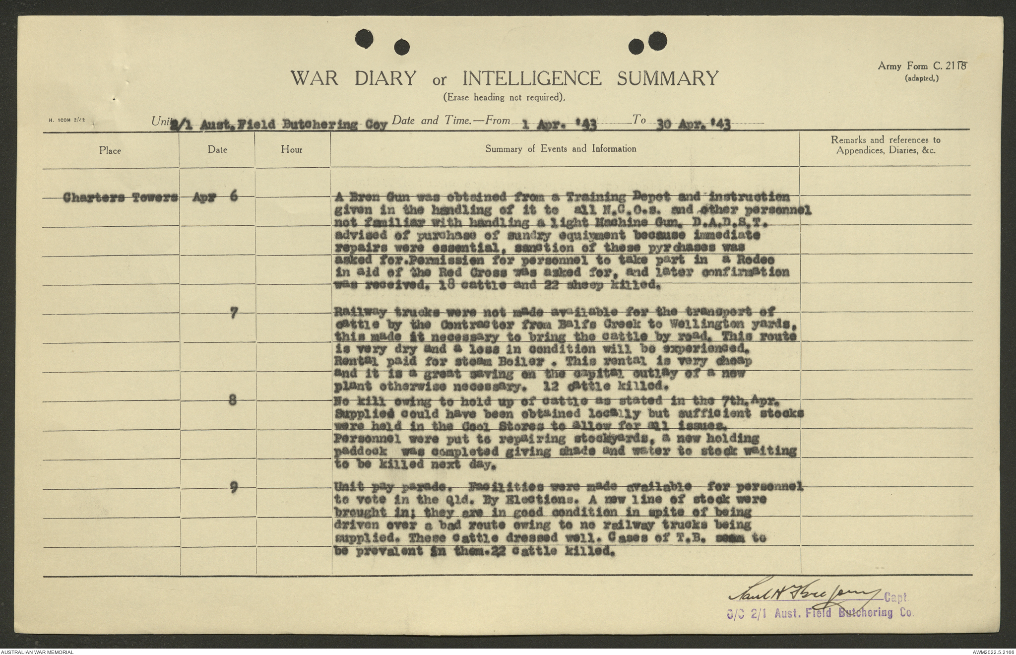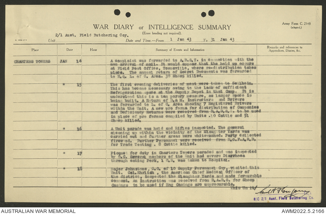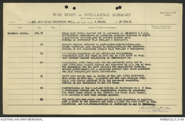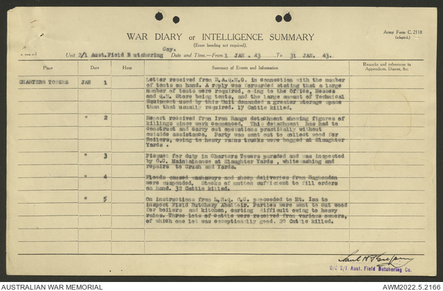 AWM52 10/28/1/1 - [Unit War Diaries, 1939-45 War] 1 Australian Field Butchering Company, March 1942 - August 1943