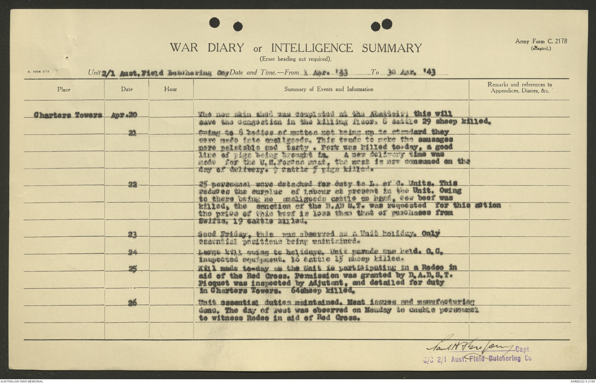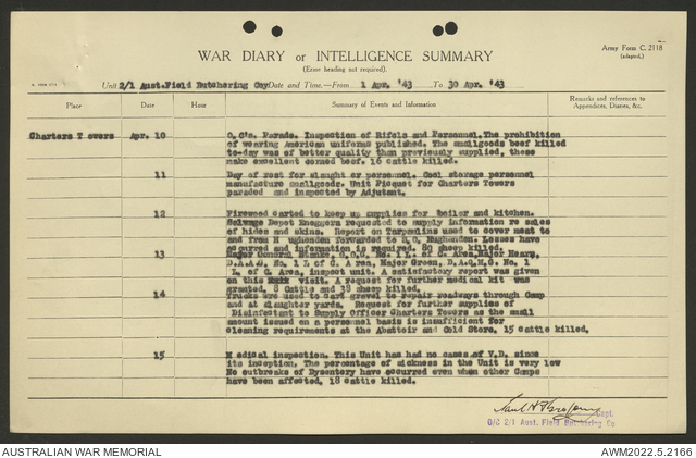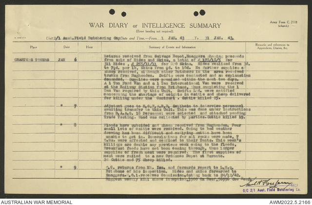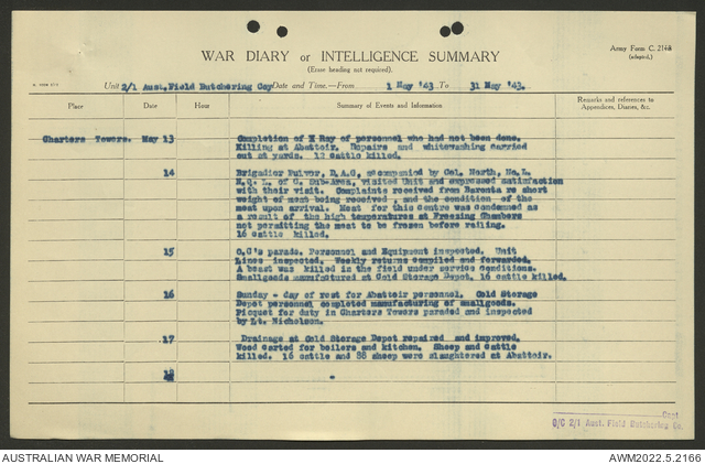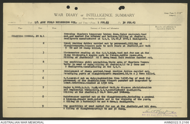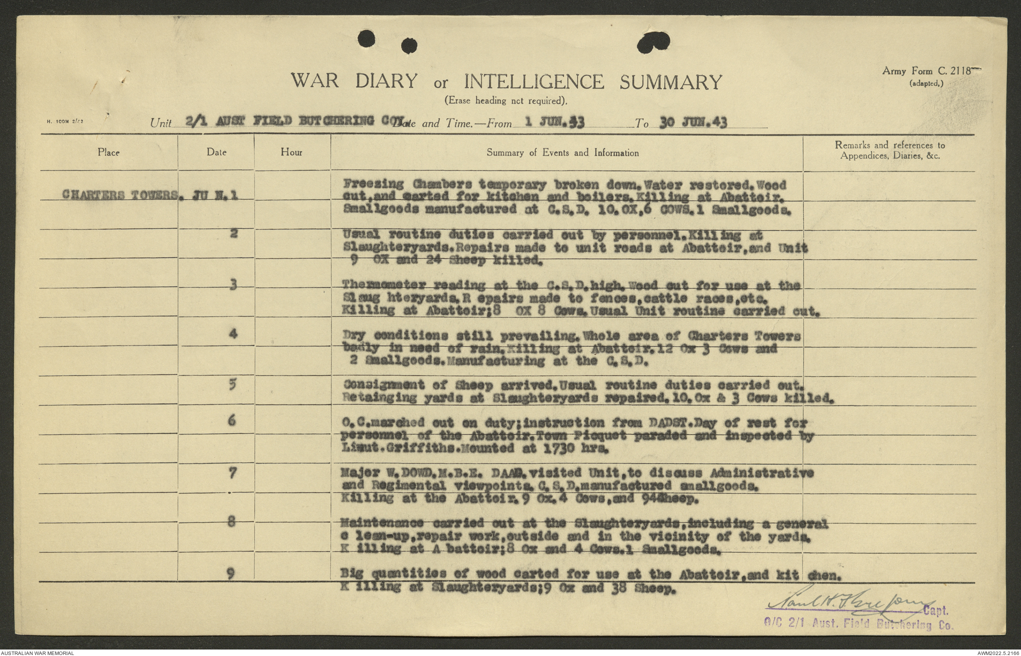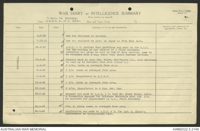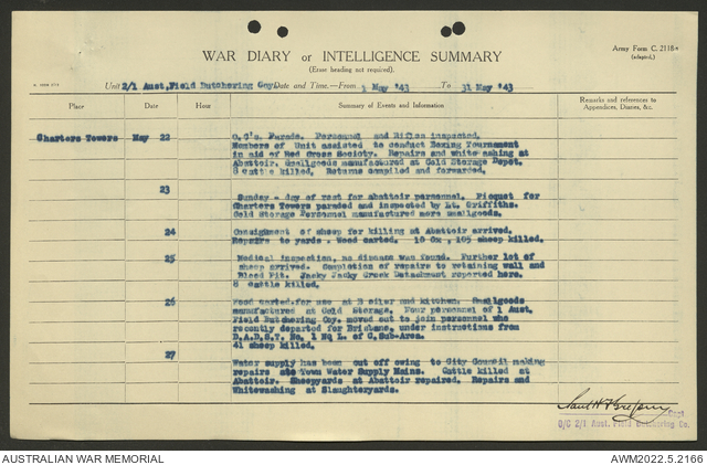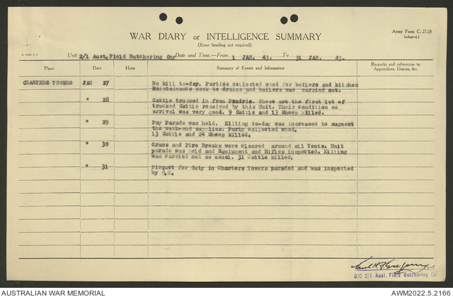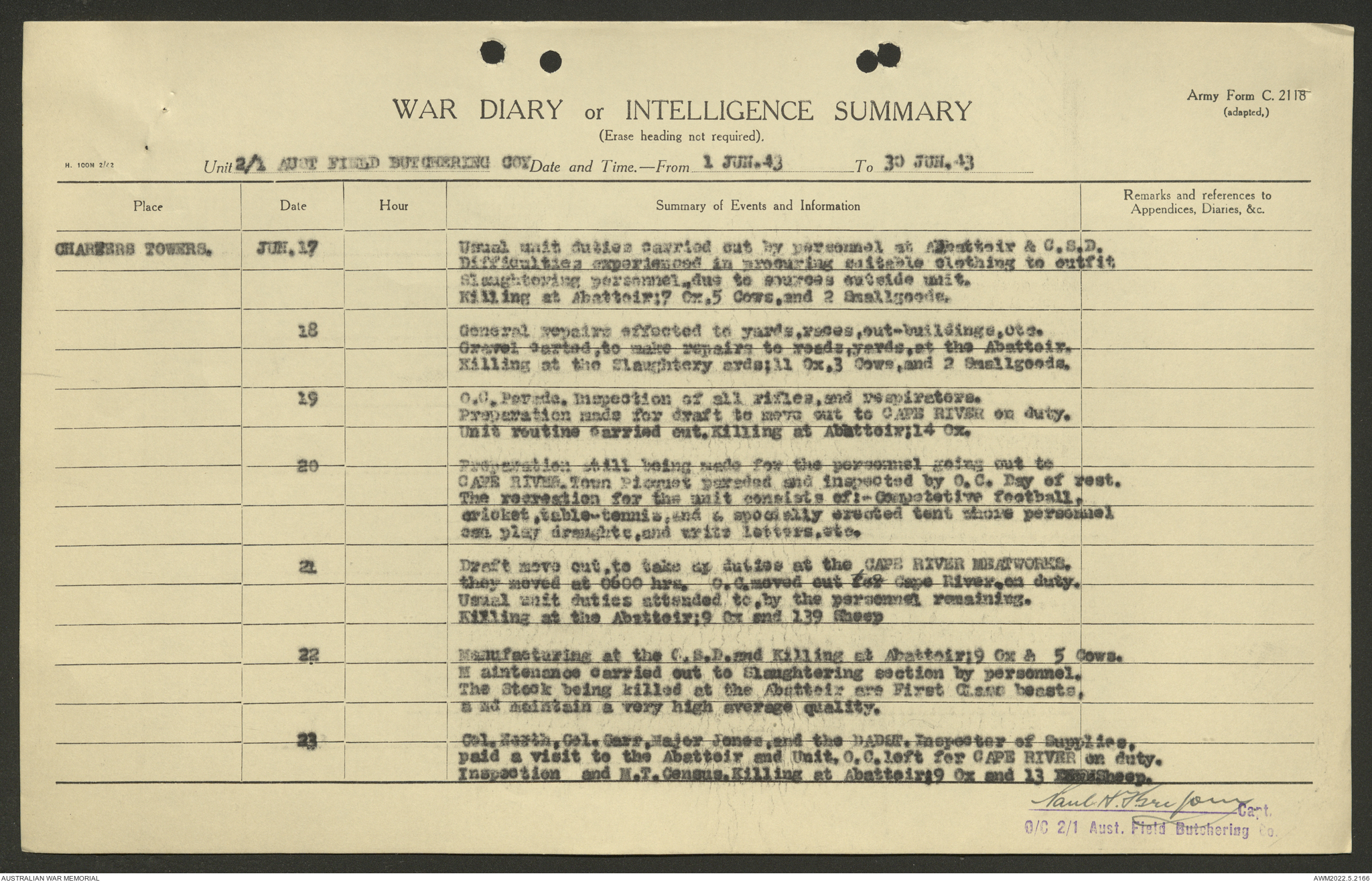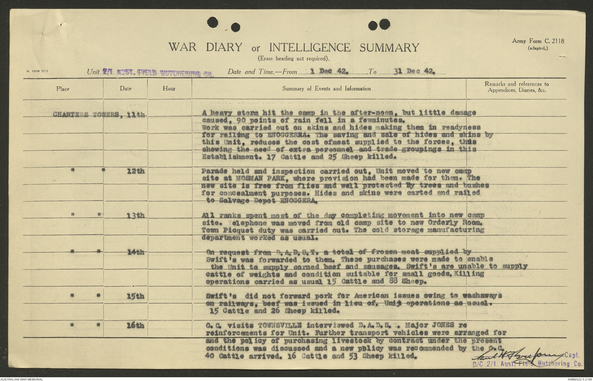 AWM52 10/28/1/1 - [Unit War Diaries, 1939-45 War] 1 Australian Field Butchering Company, March 1942 - August 1943