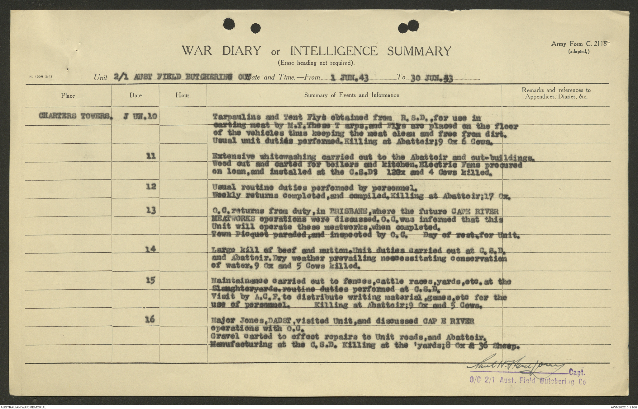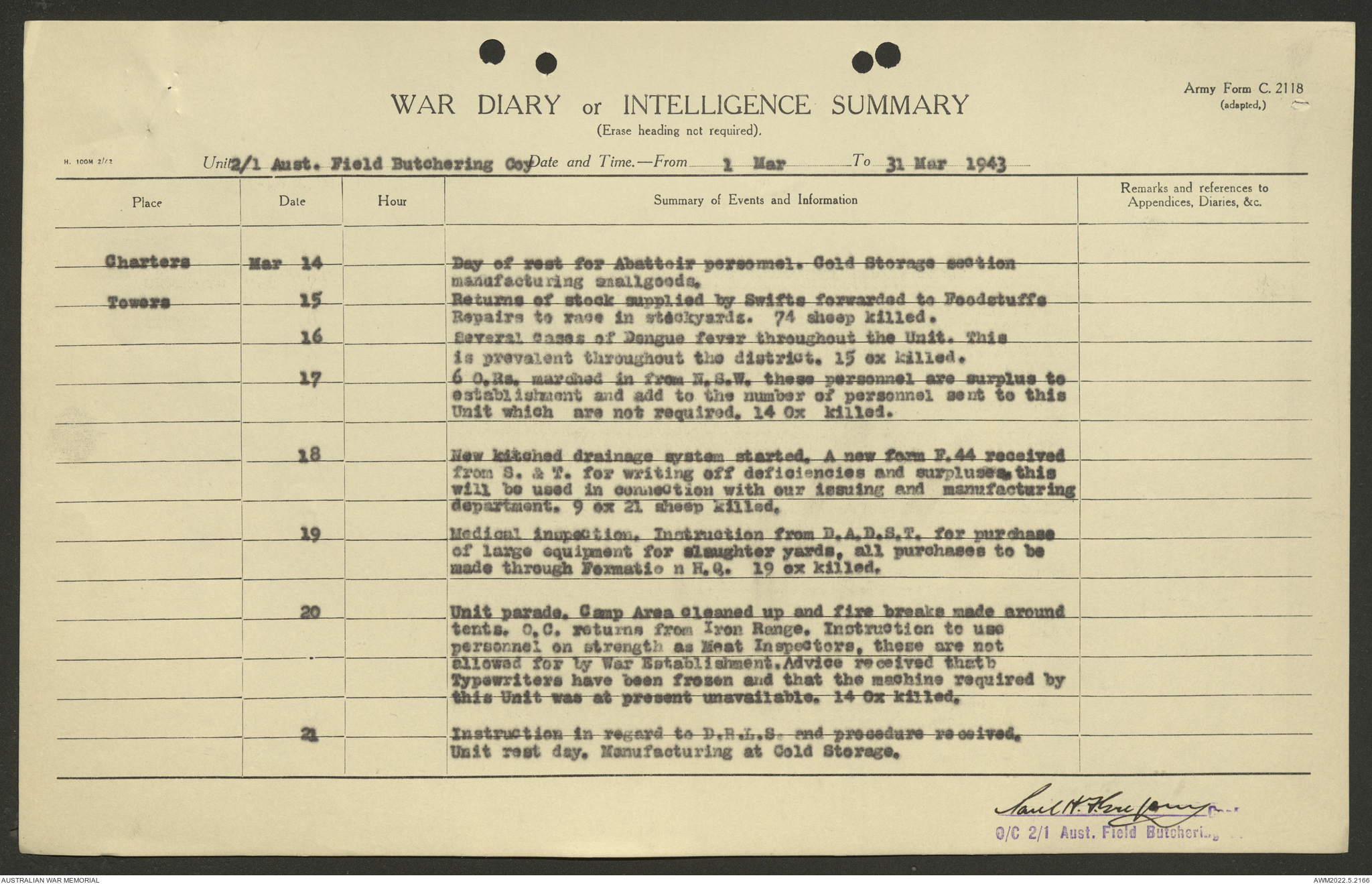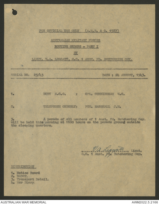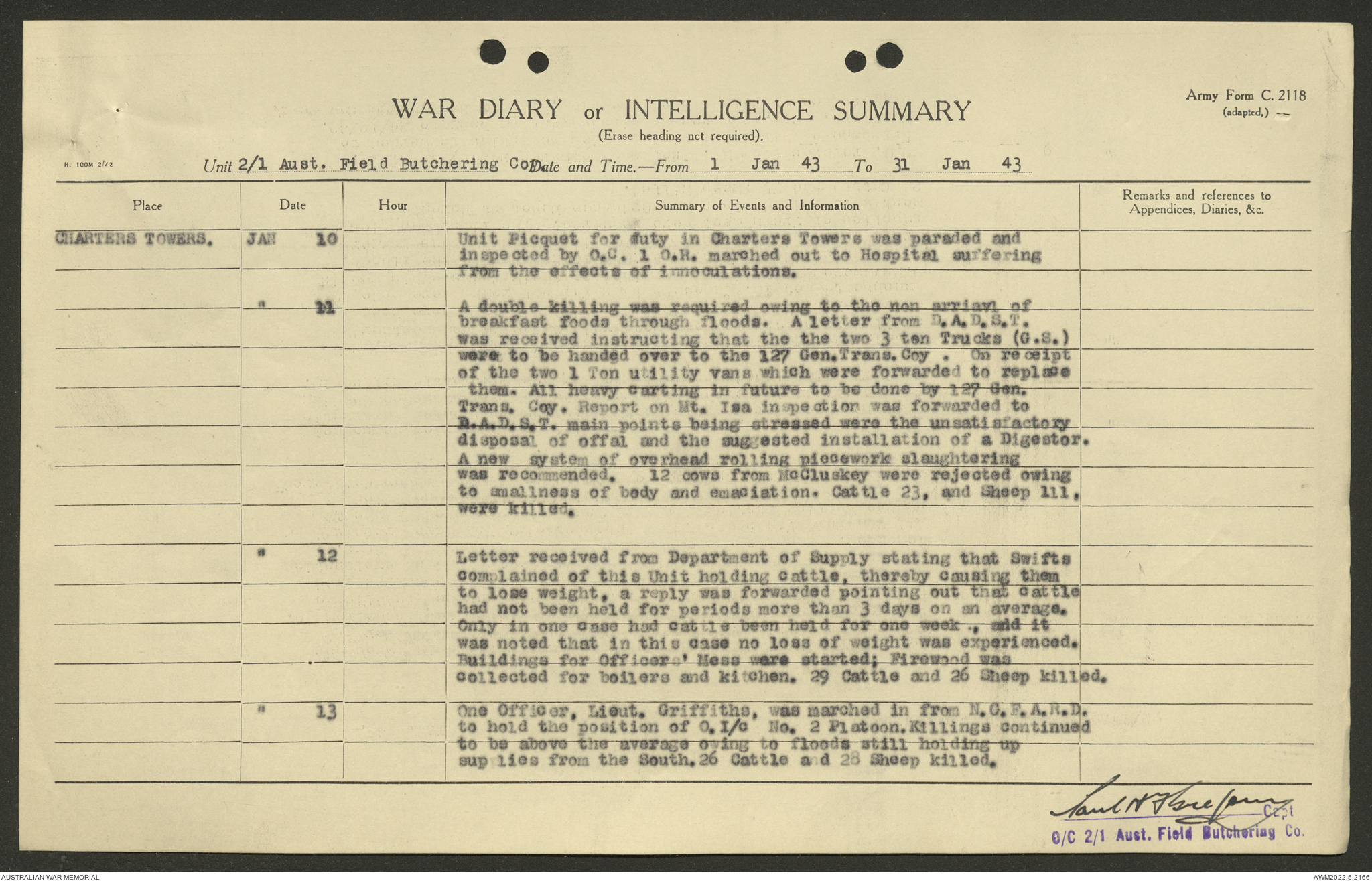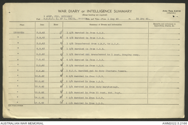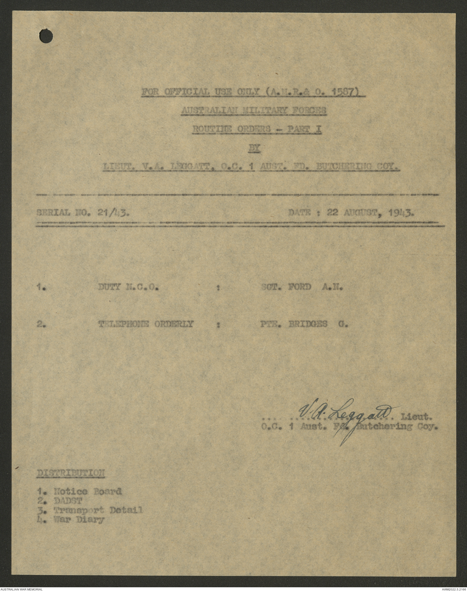 AWM52 10/28/1/1 - [Unit War Diaries, 1939-45 War] 1 Australian Field Butchering Company, March 1942 - August 1943