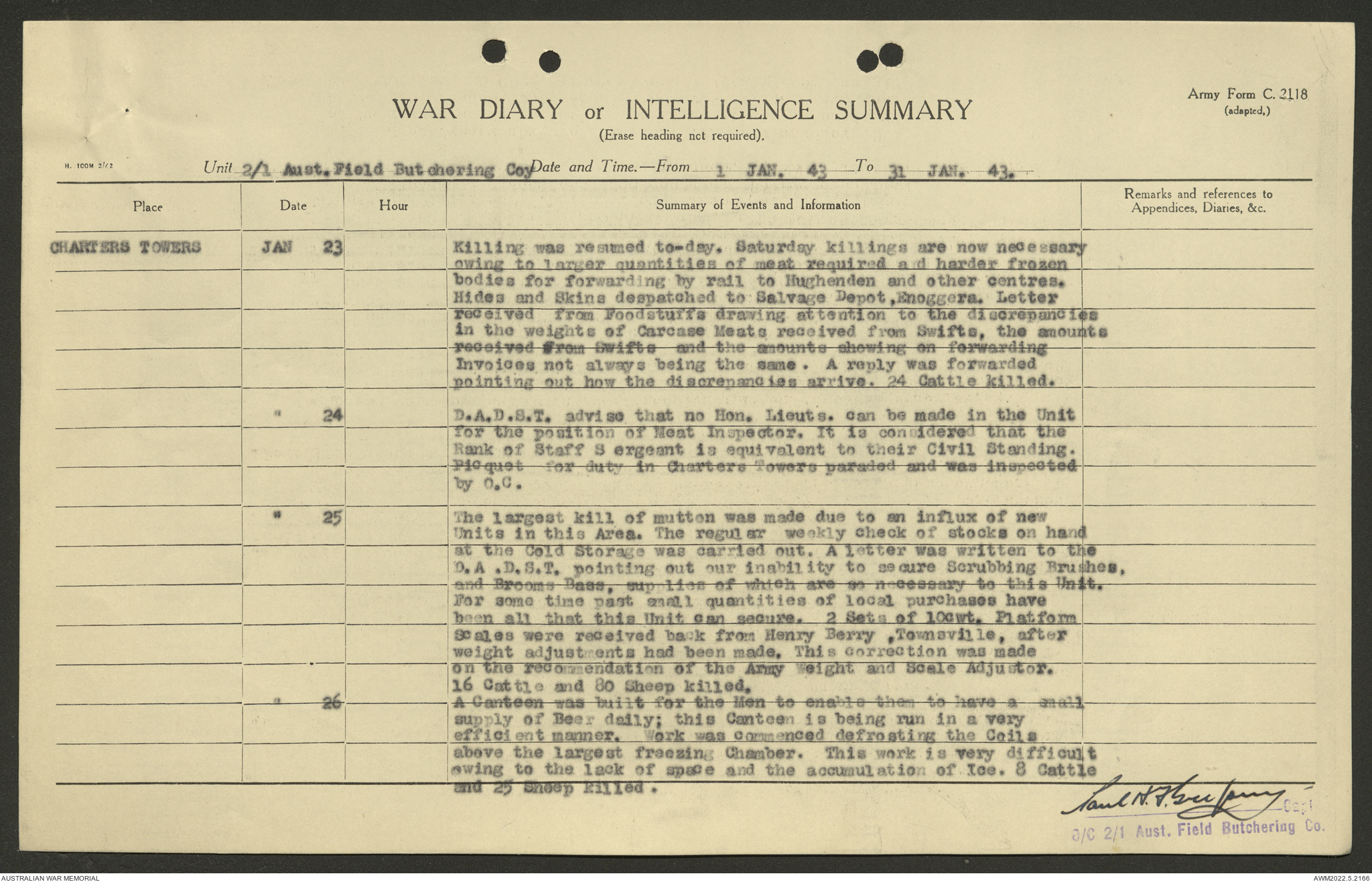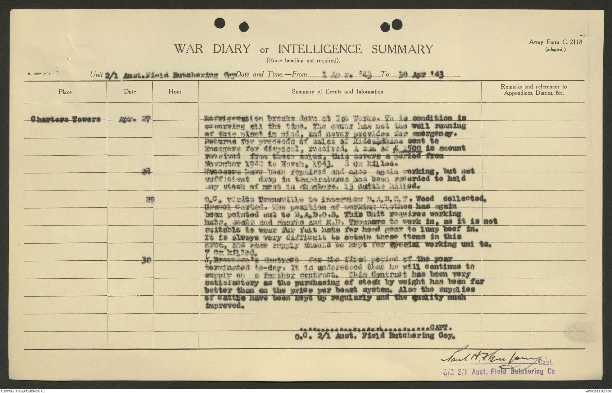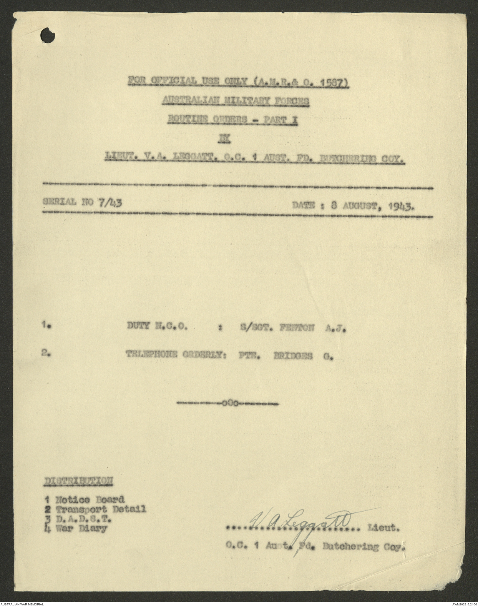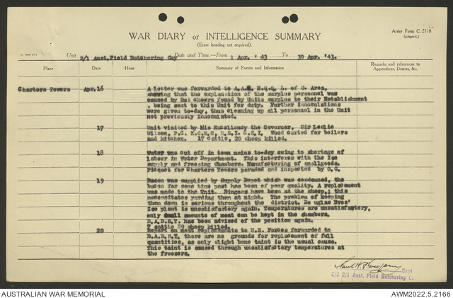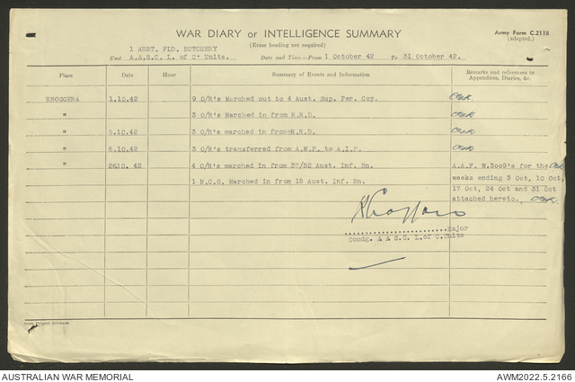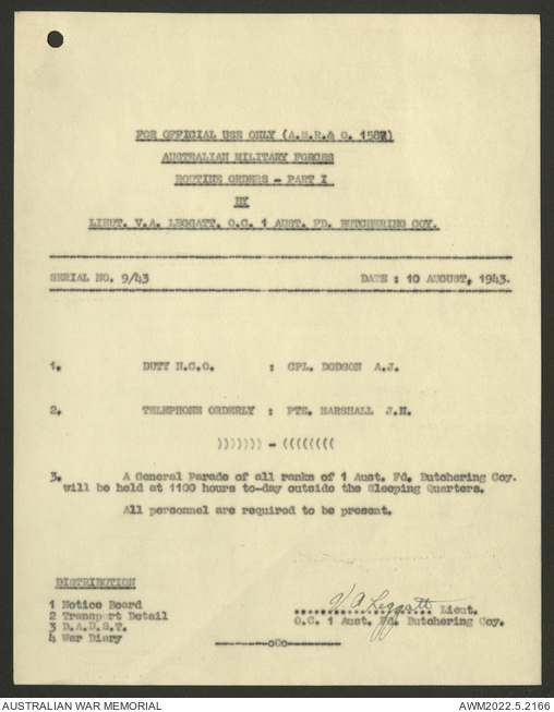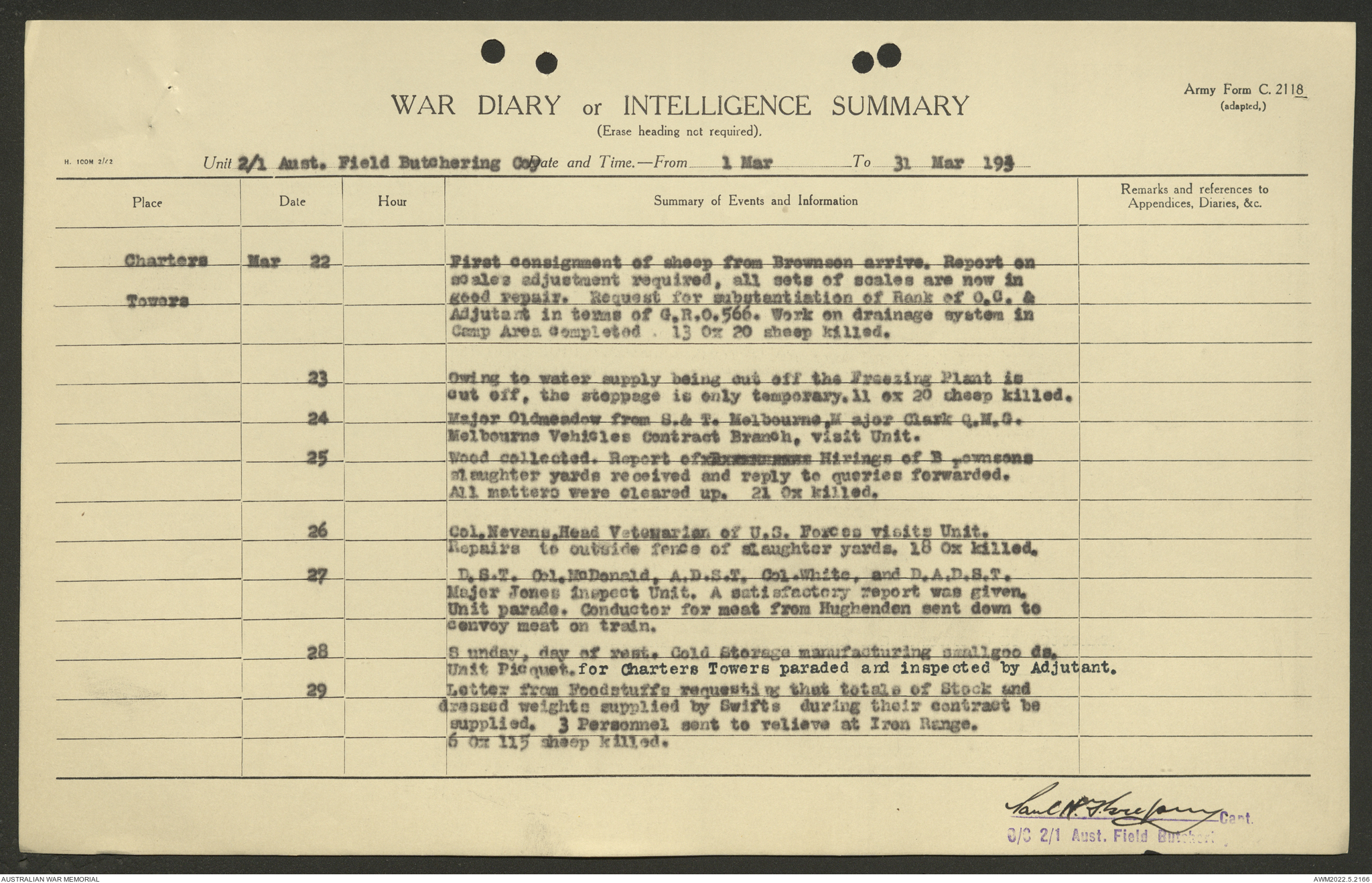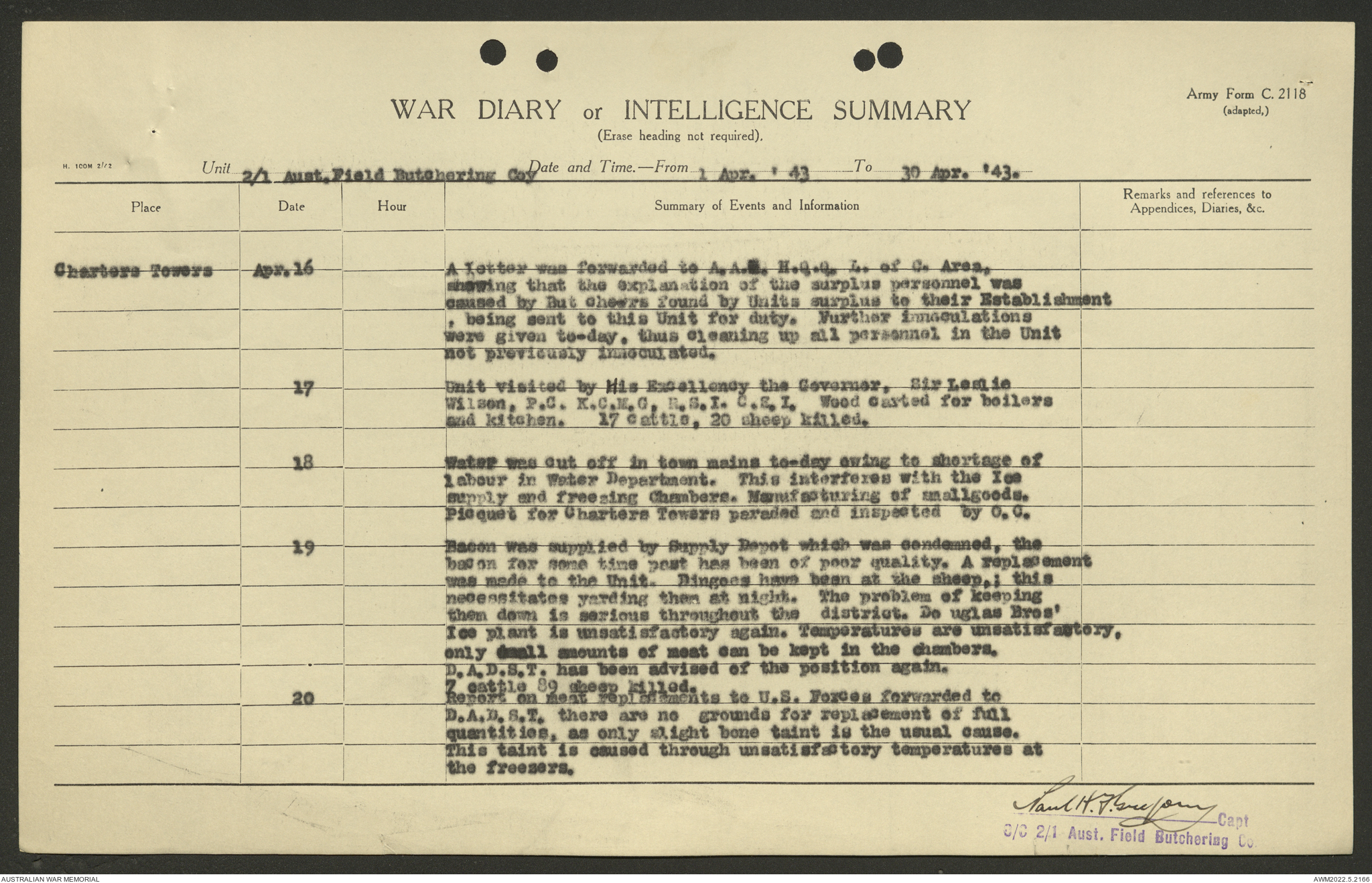 AWM52 10/28/1/1 - [Unit War Diaries, 1939-45 War] 1 Australian Field Butchering Company, March 1942 - August 1943