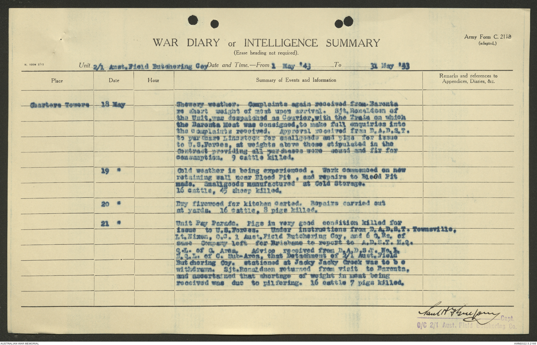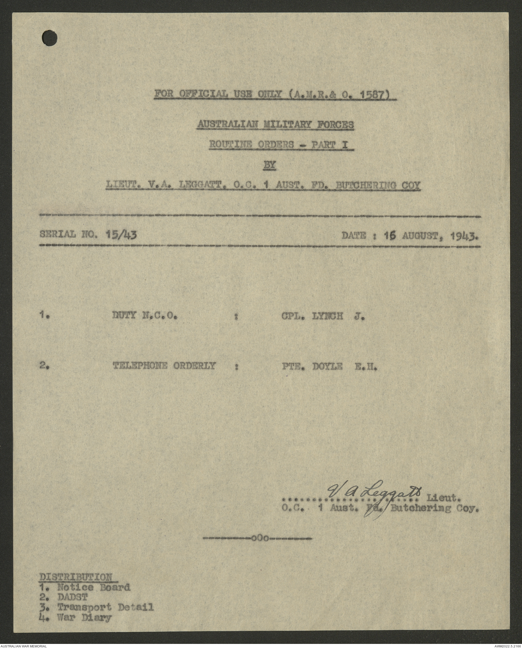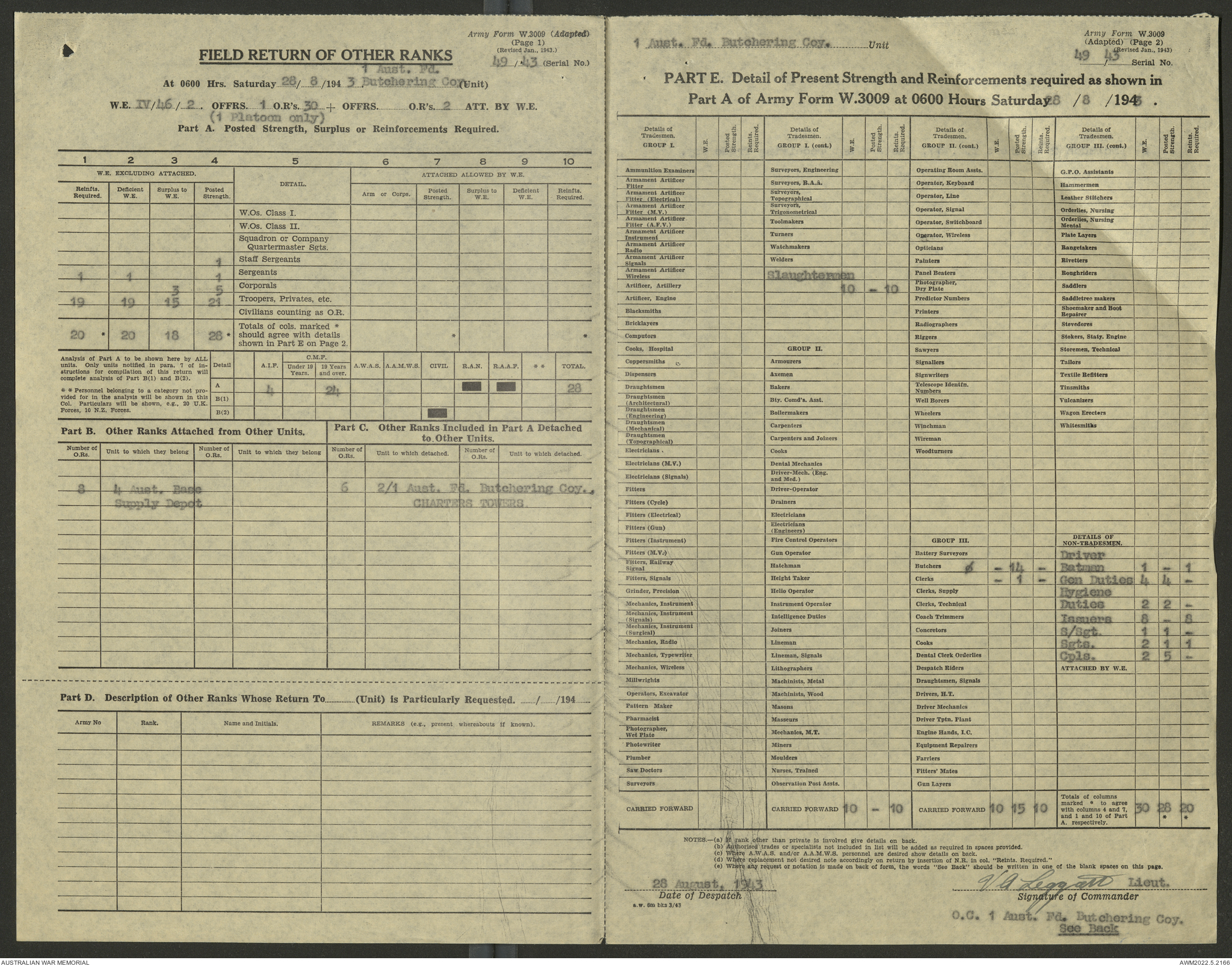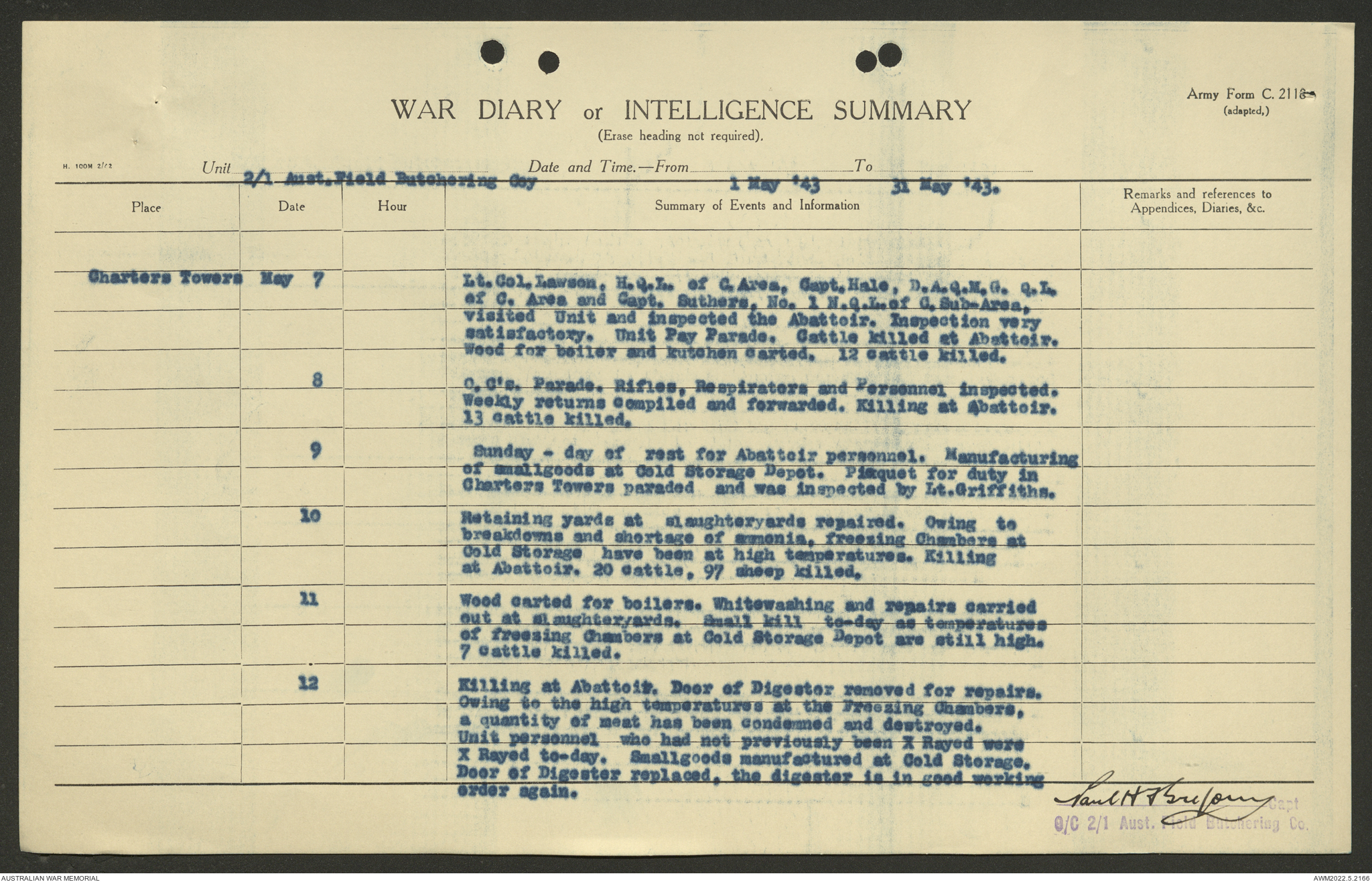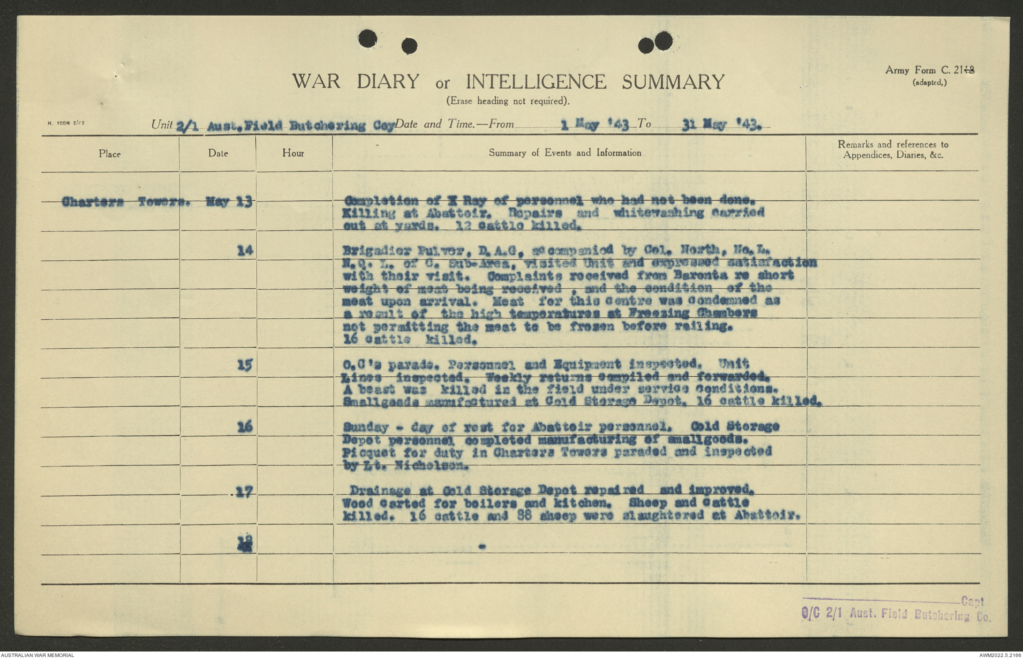 AWM52 10/28/1/1 - [Unit War Diaries, 1939-45 War] 1 Australian Field Butchering Company, March 1942 - August 1943