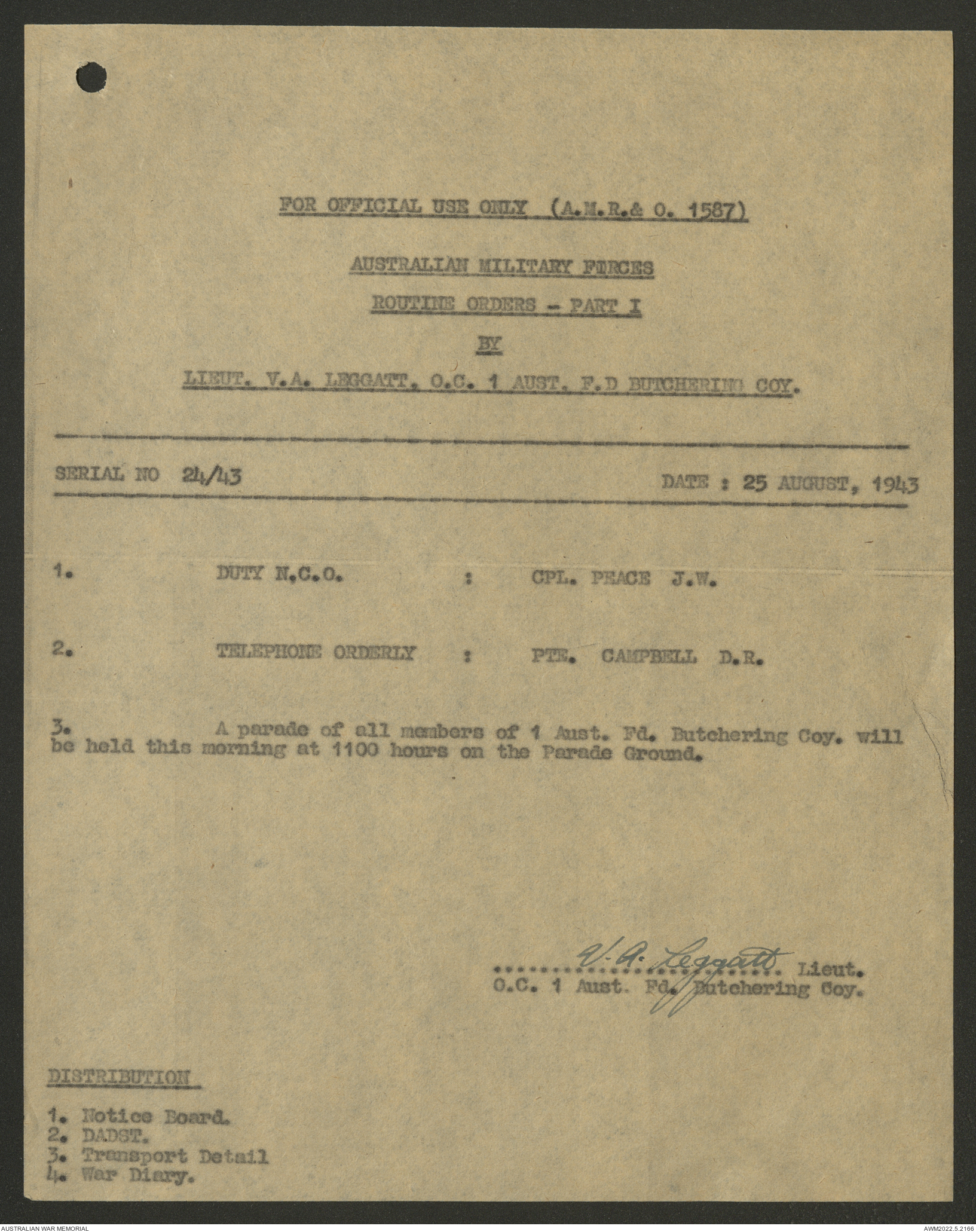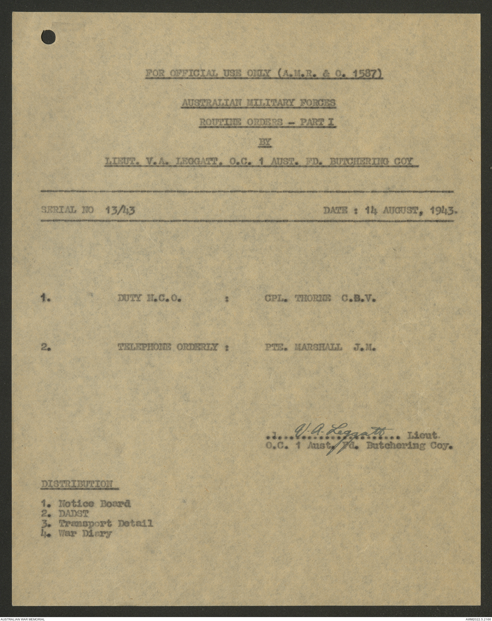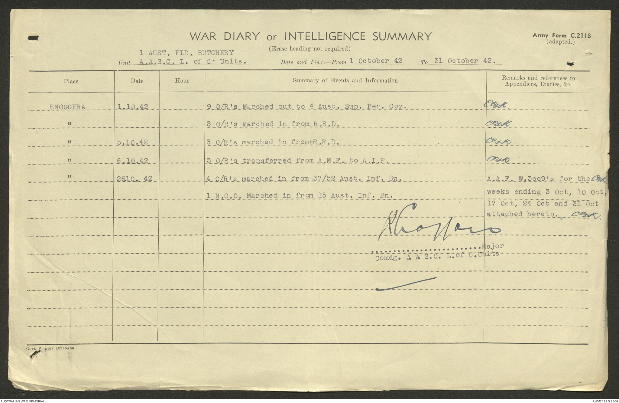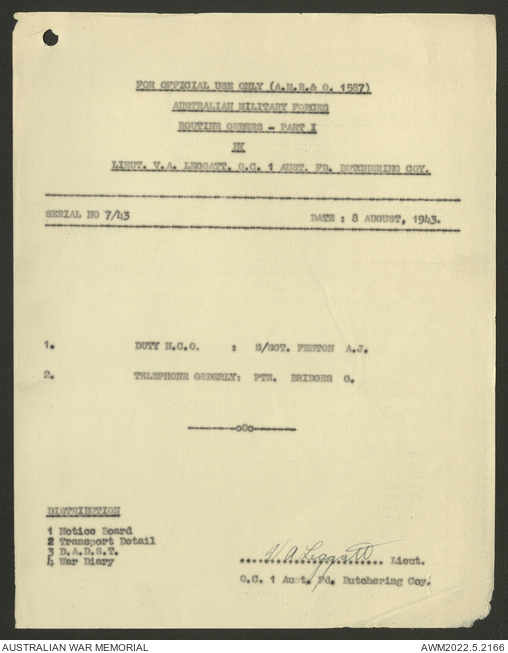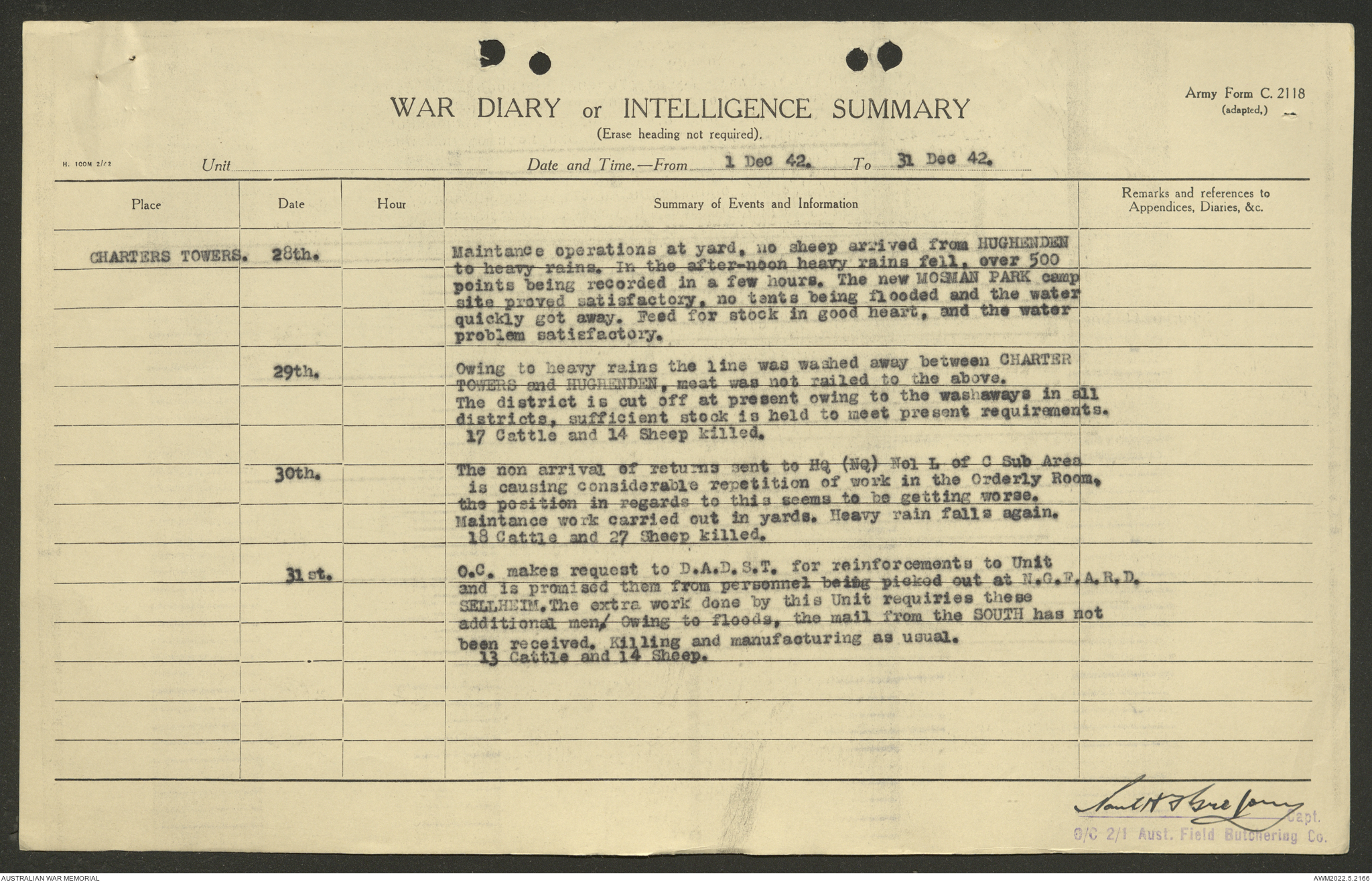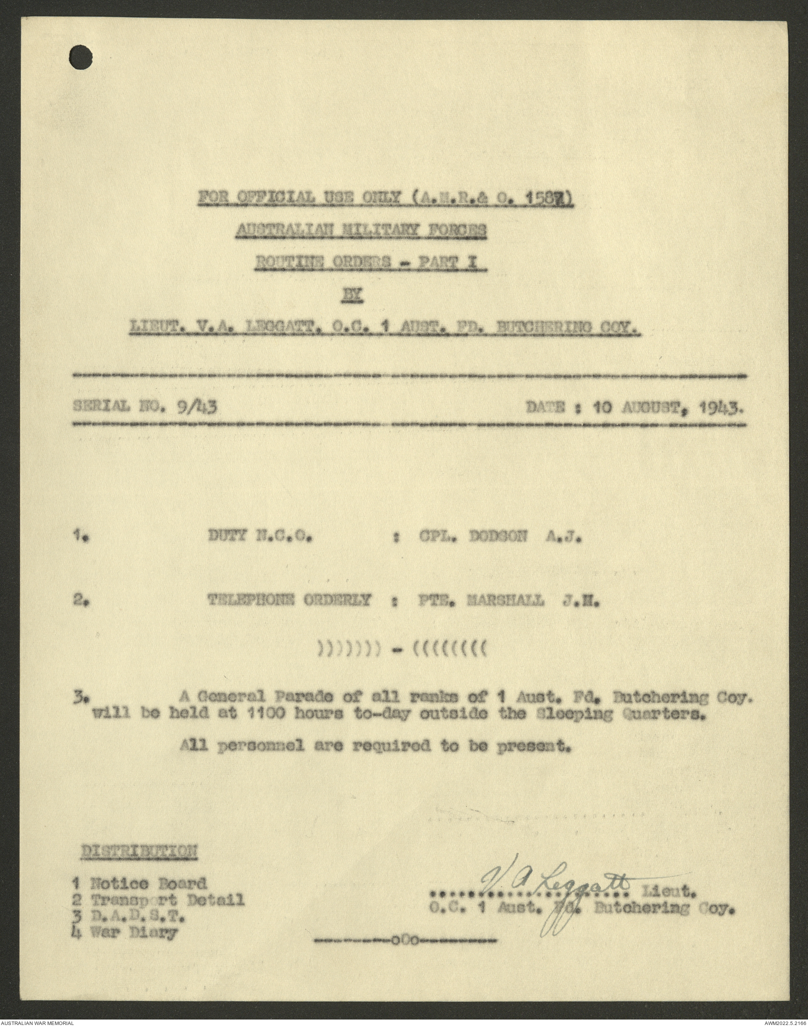 AWM52 10/28/1/1 - [Unit War Diaries, 1939-45 War] 1 Australian Field Butchering Company, March 1942 - August 1943