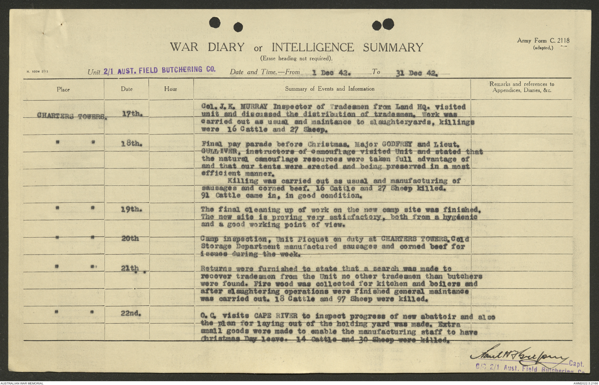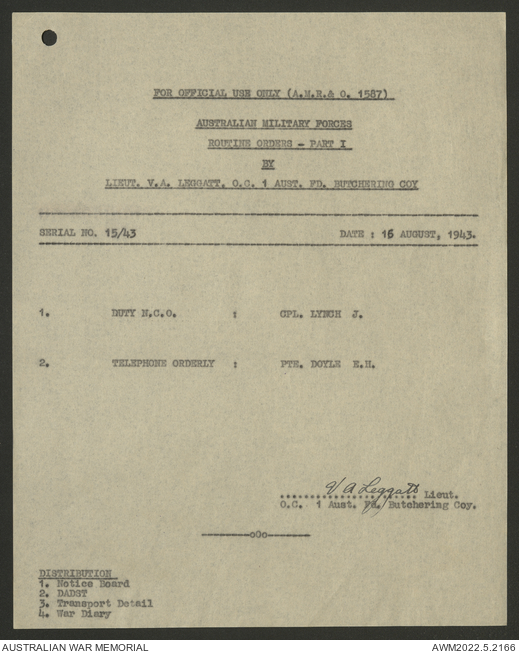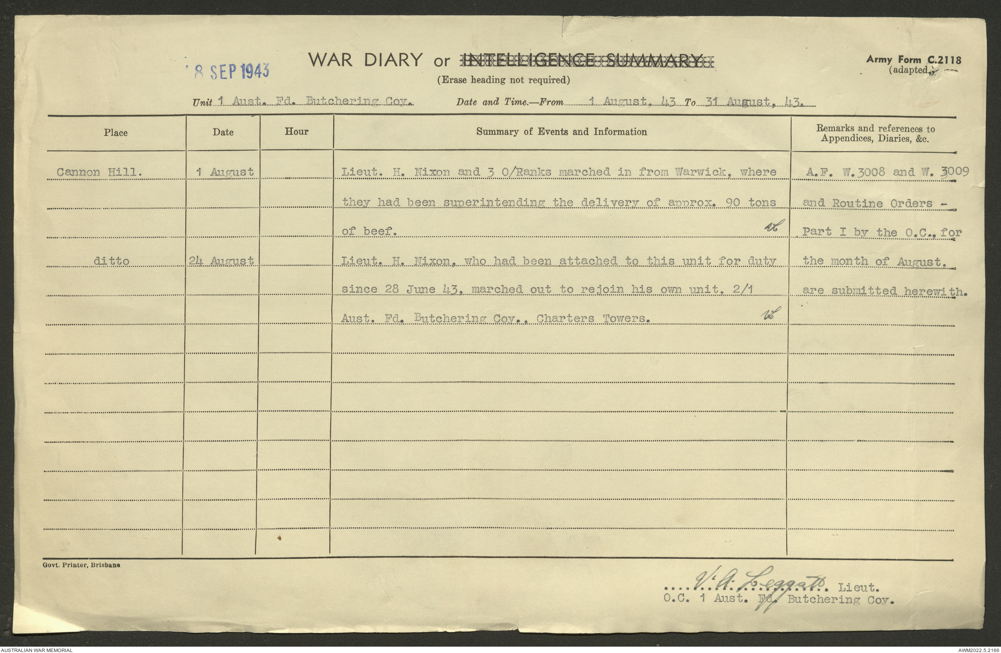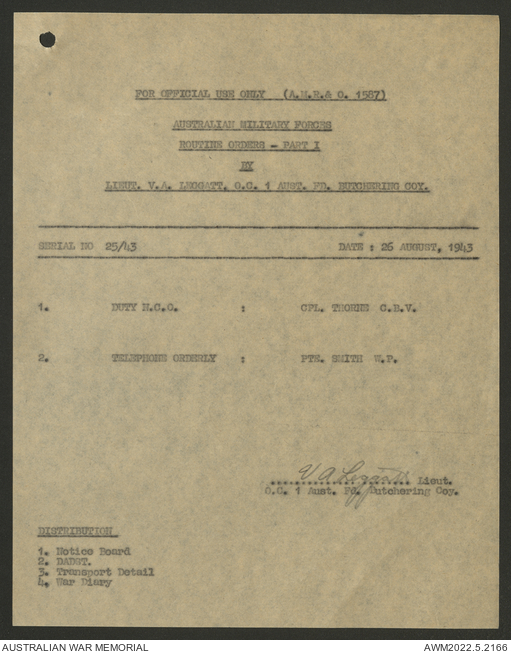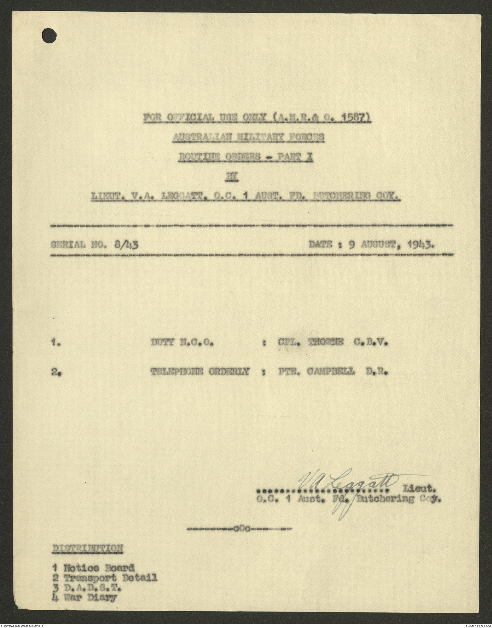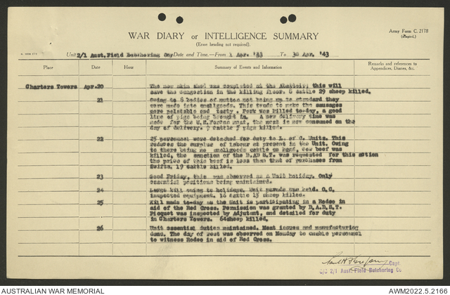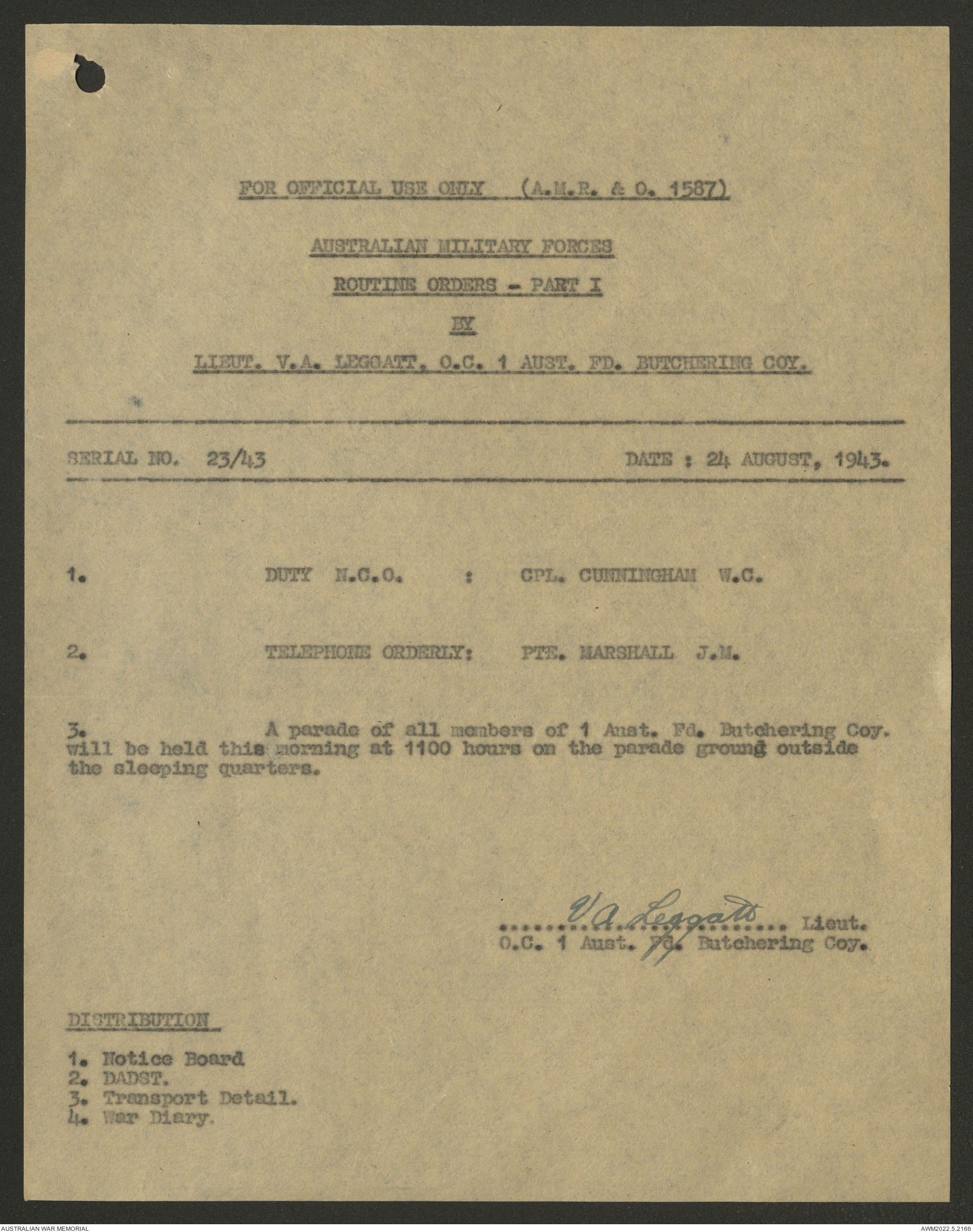 AWM52 10/28/1/1 - [Unit War Diaries, 1939-45 War] 1 Australian Field Butchering Company, March 1942 - August 1943