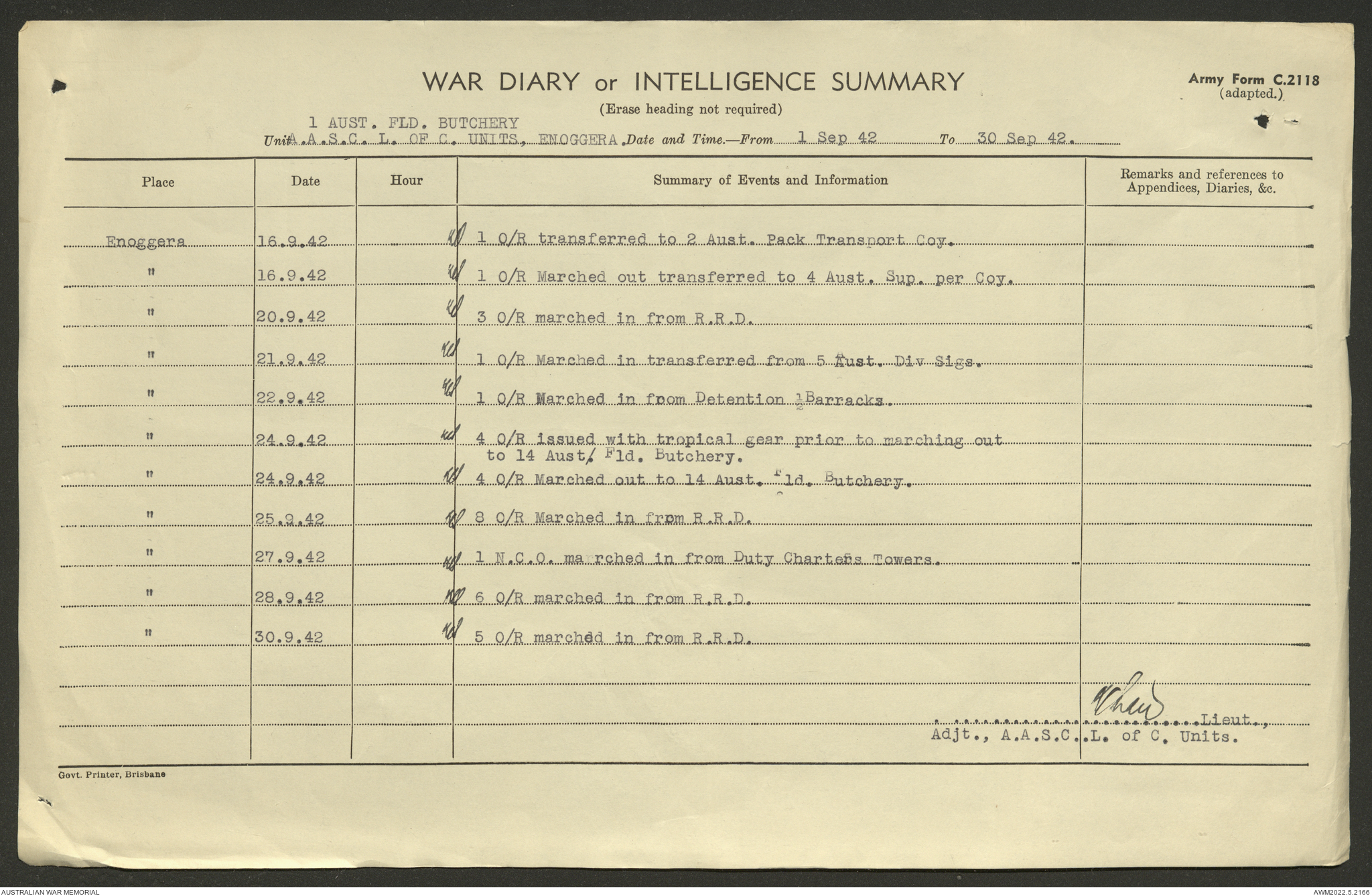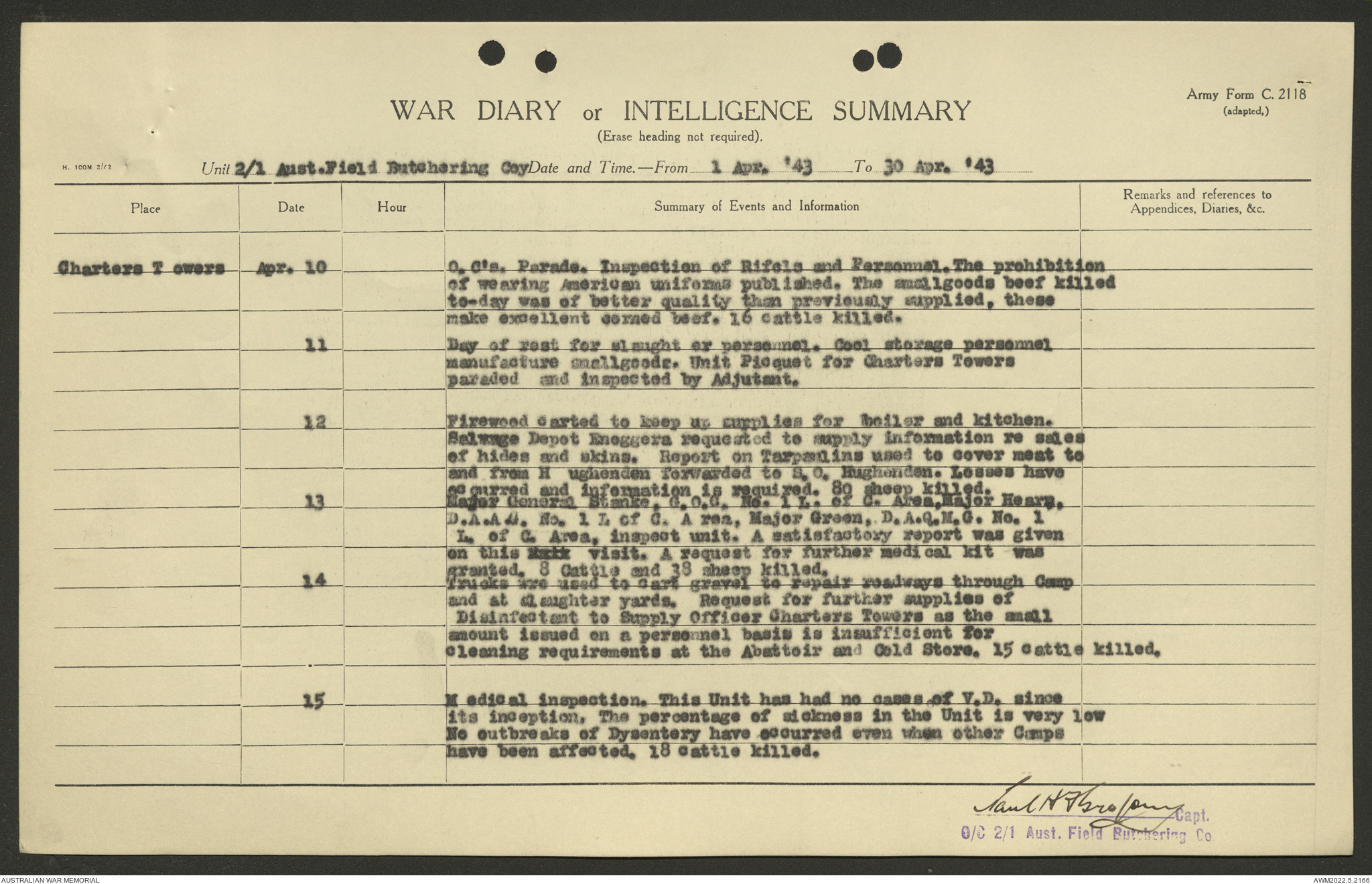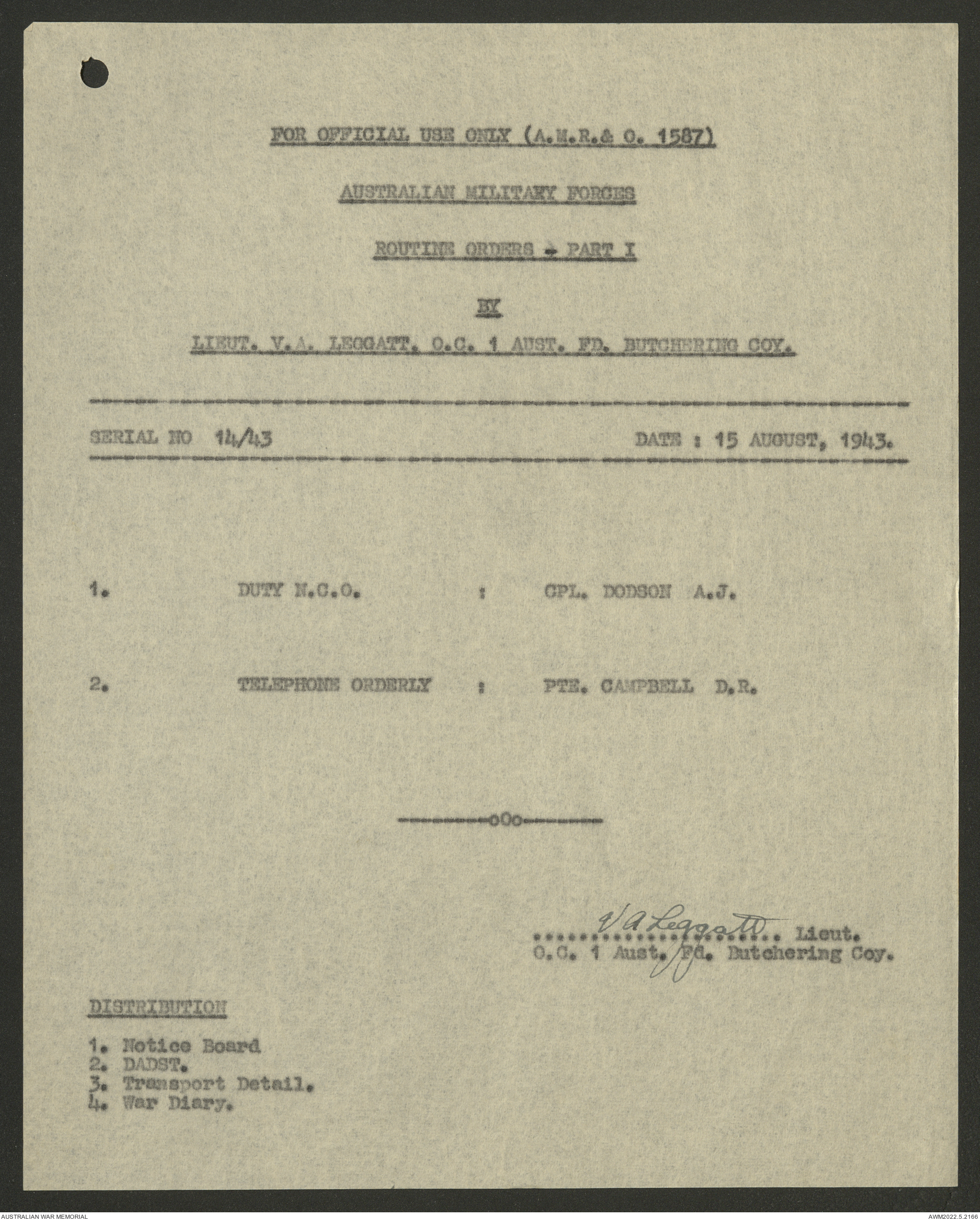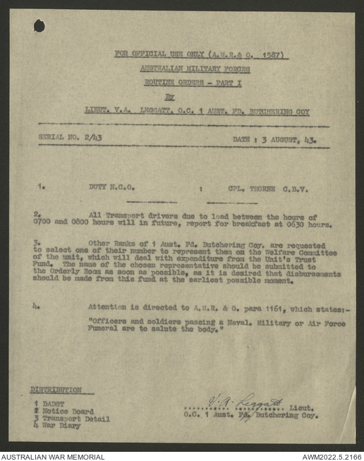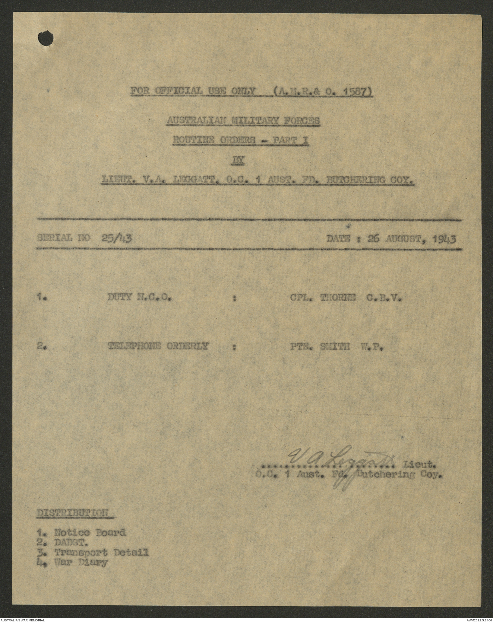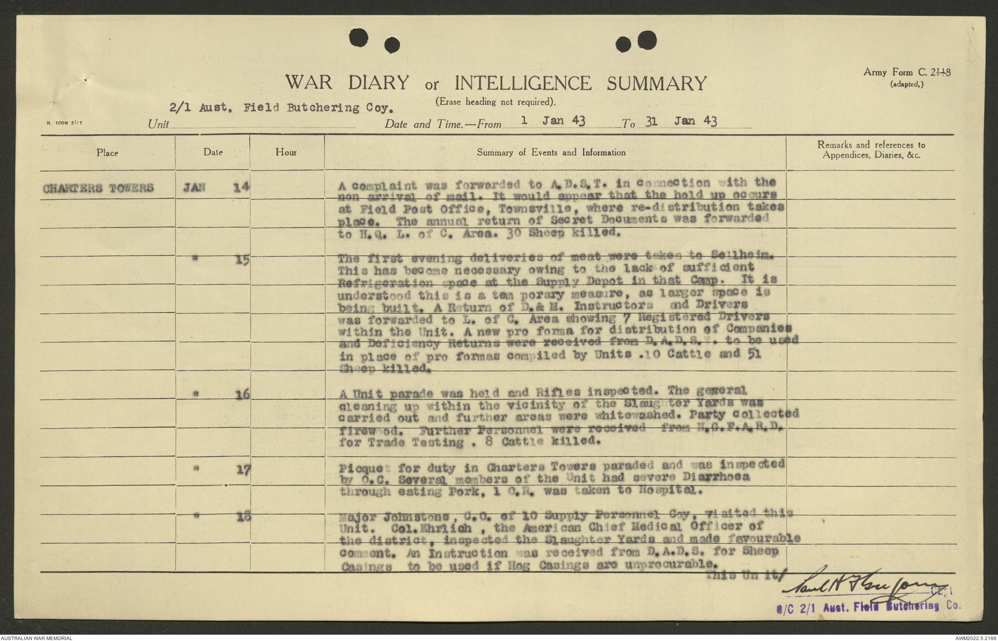 AWM52 10/28/1/1 - [Unit War Diaries, 1939-45 War] 1 Australian Field Butchering Company, March 1942 - August 1943